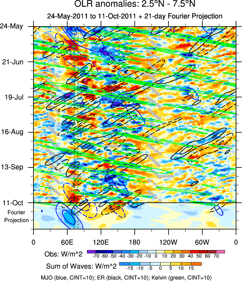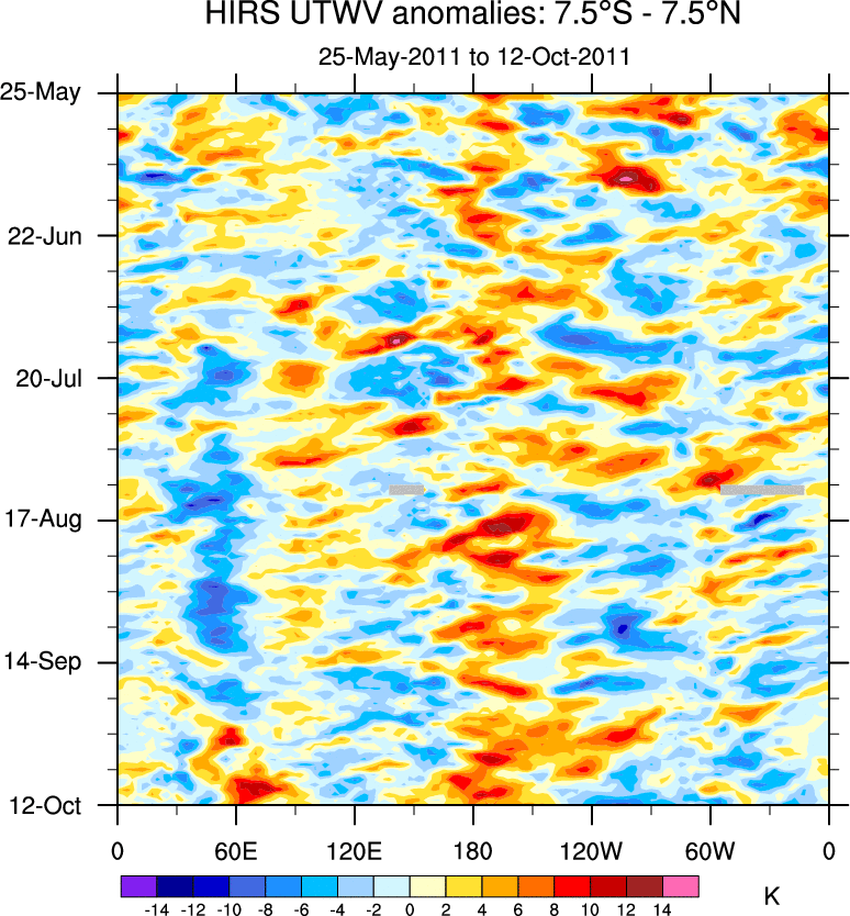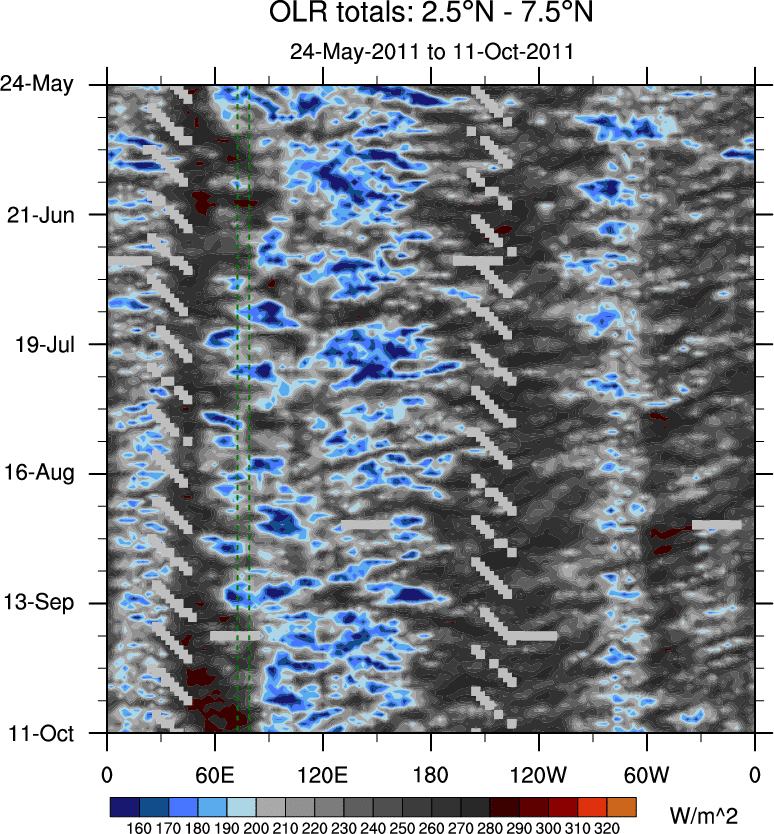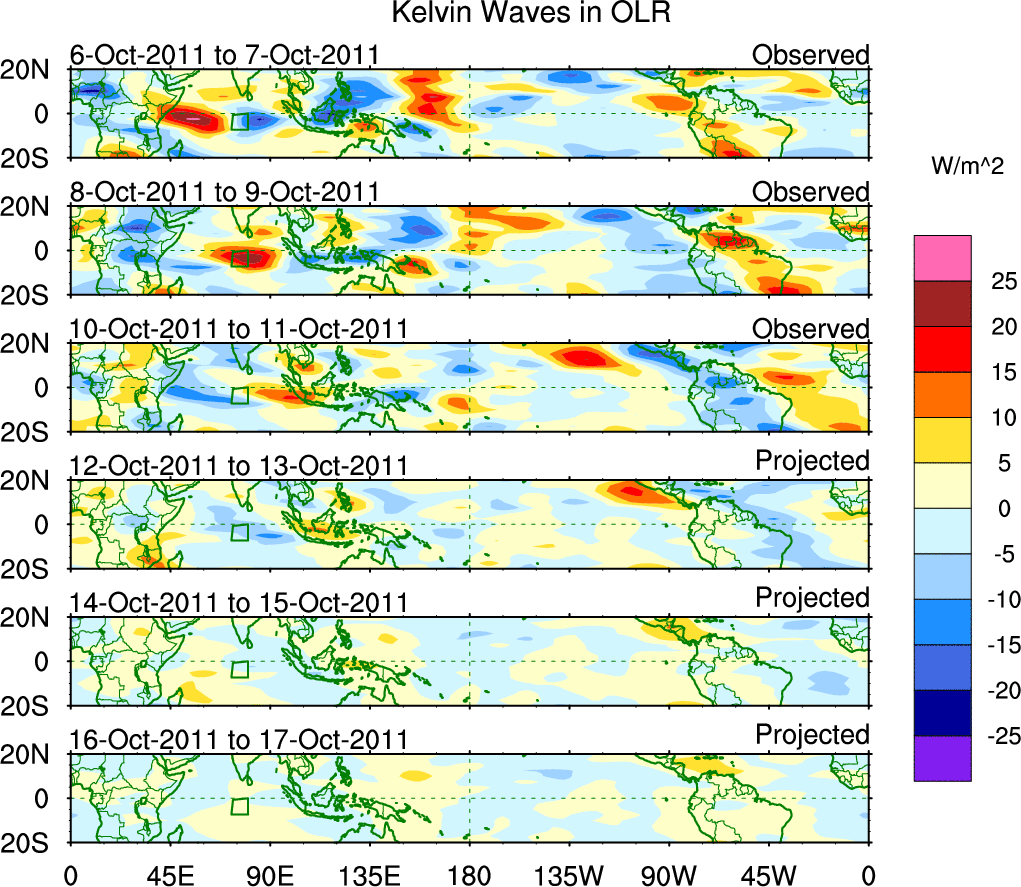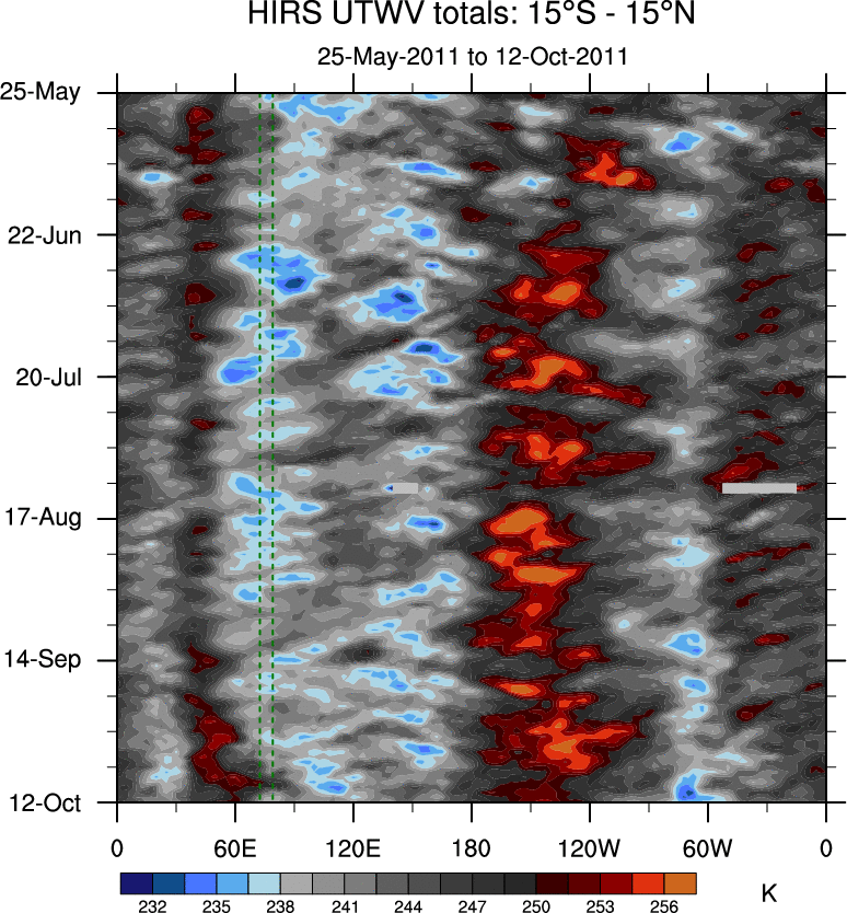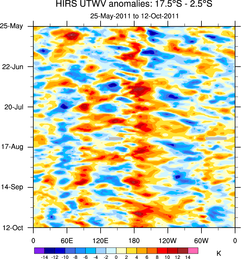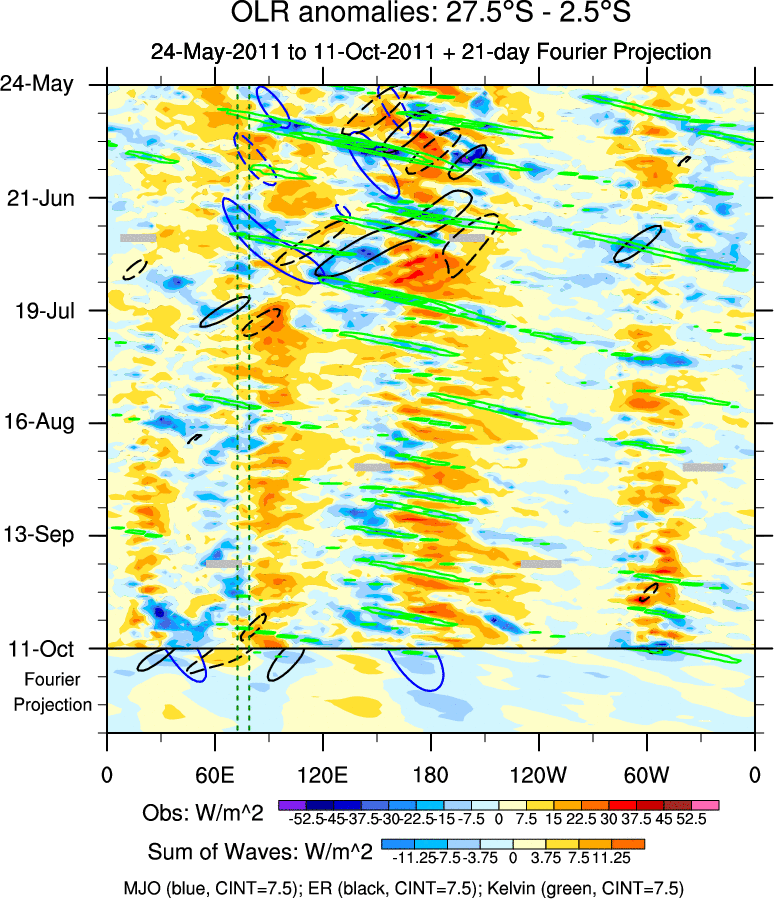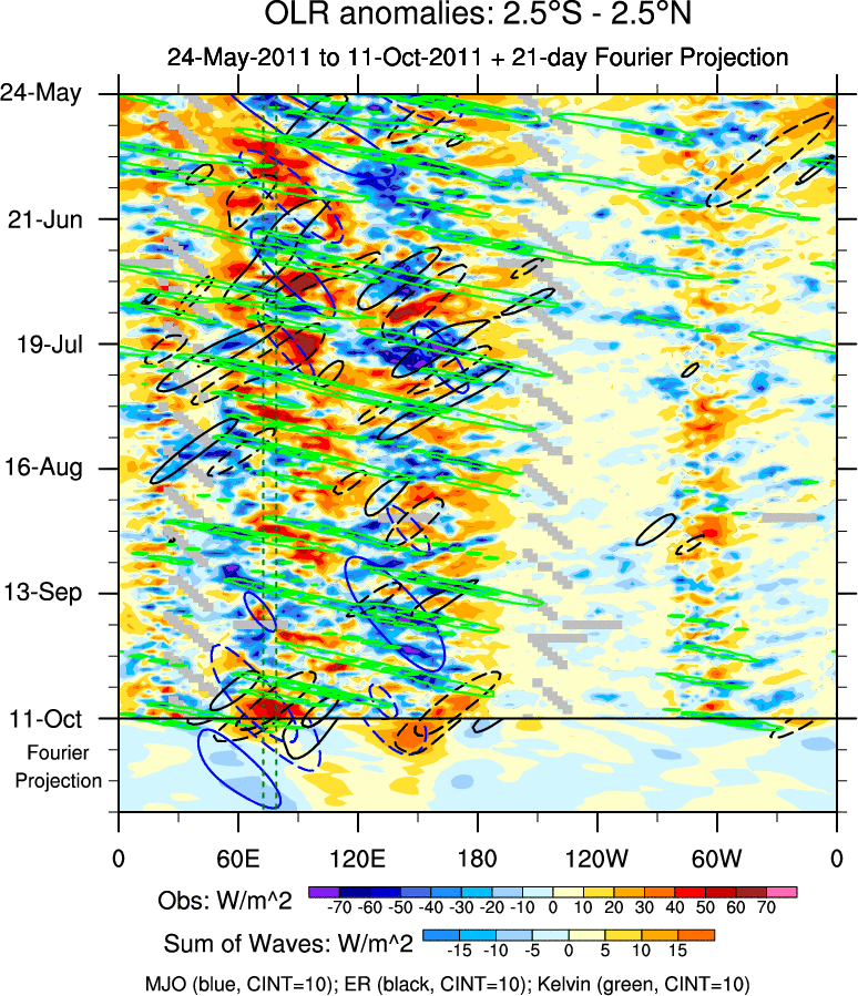 To identify tropical waves in near real-time, the OLR and UTWV data are filtered following Wheeler & Weickmann (2001 MWR). The daily anomalies are calculated using the first 3 harmonics of the seasonal cycle for 1979–2009. Missing values are then filled using linear interpolation in space and time. The most recent 365 days of anomalies are padded with 659 days of zeroes, and the result is filtered for each wave type.