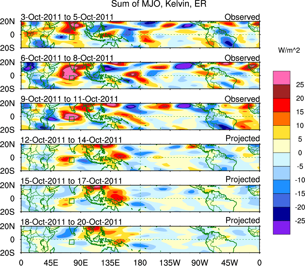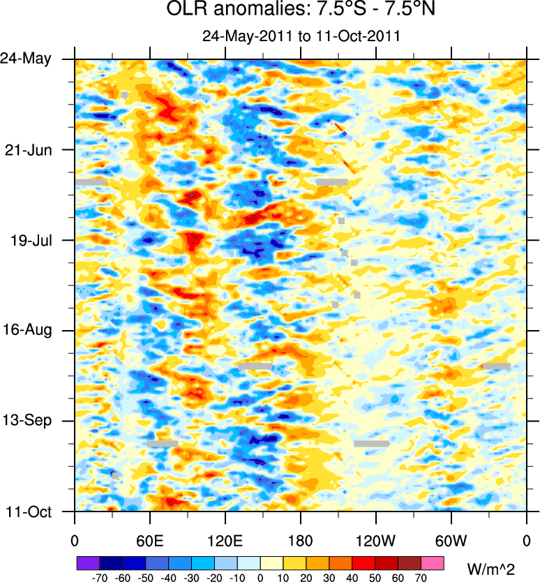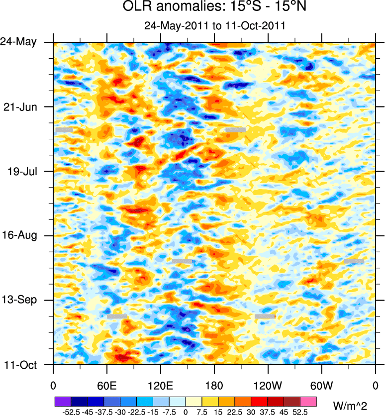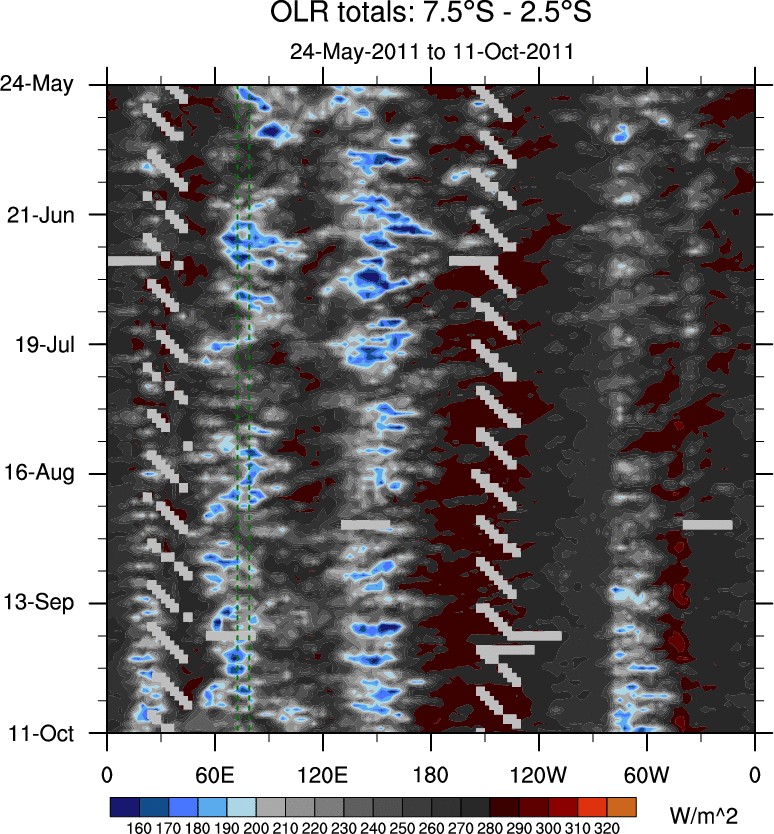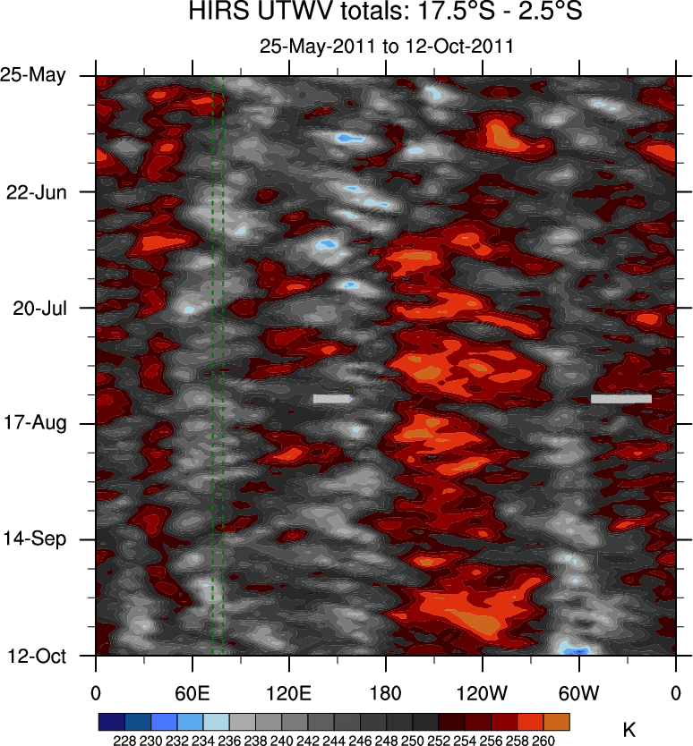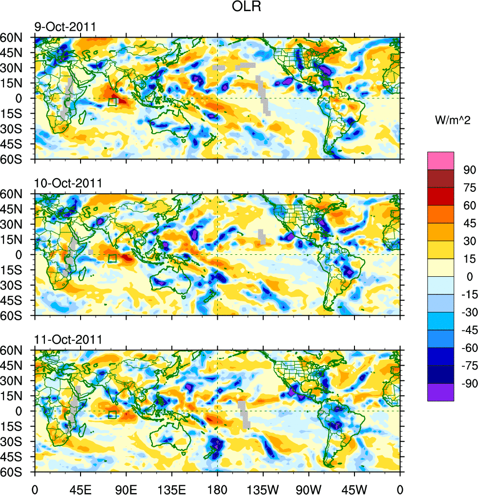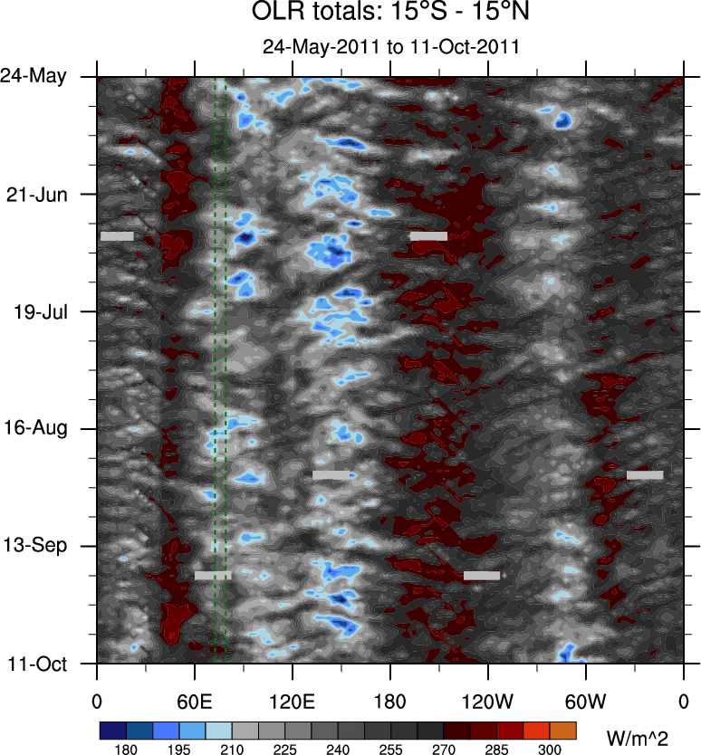 To identify tropical waves in near real-time, the OLR and UTWV data are filtered following Wheeler & Weickmann (2001 MWR). The daily anomalies are calculated using the first 3 harmonics of the seasonal cycle for 1979–2009. Missing values are then filled using linear interpolation in space and time. The most recent 365 days of anomalies are padded with 659 days of zeroes, and the result is filtered for each wave type.