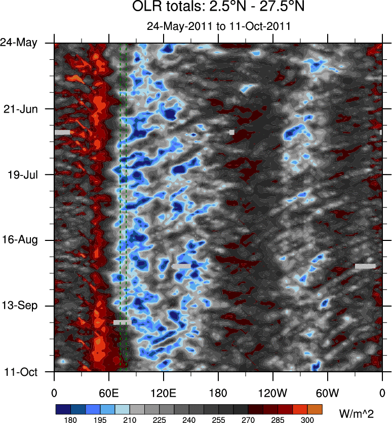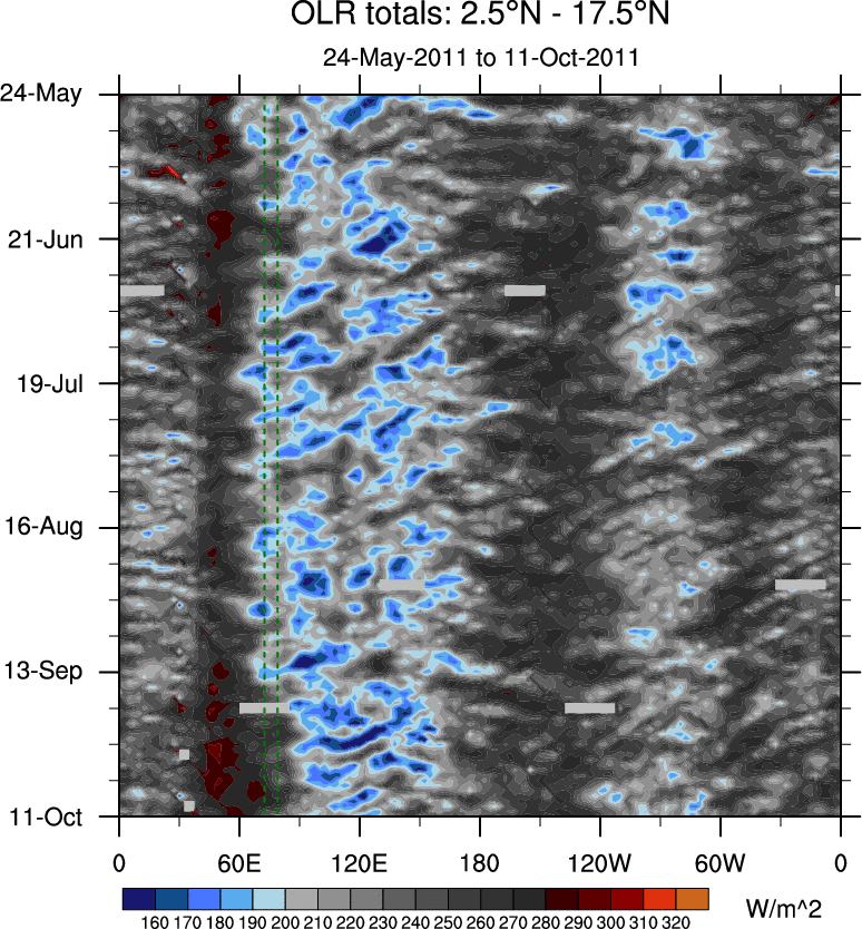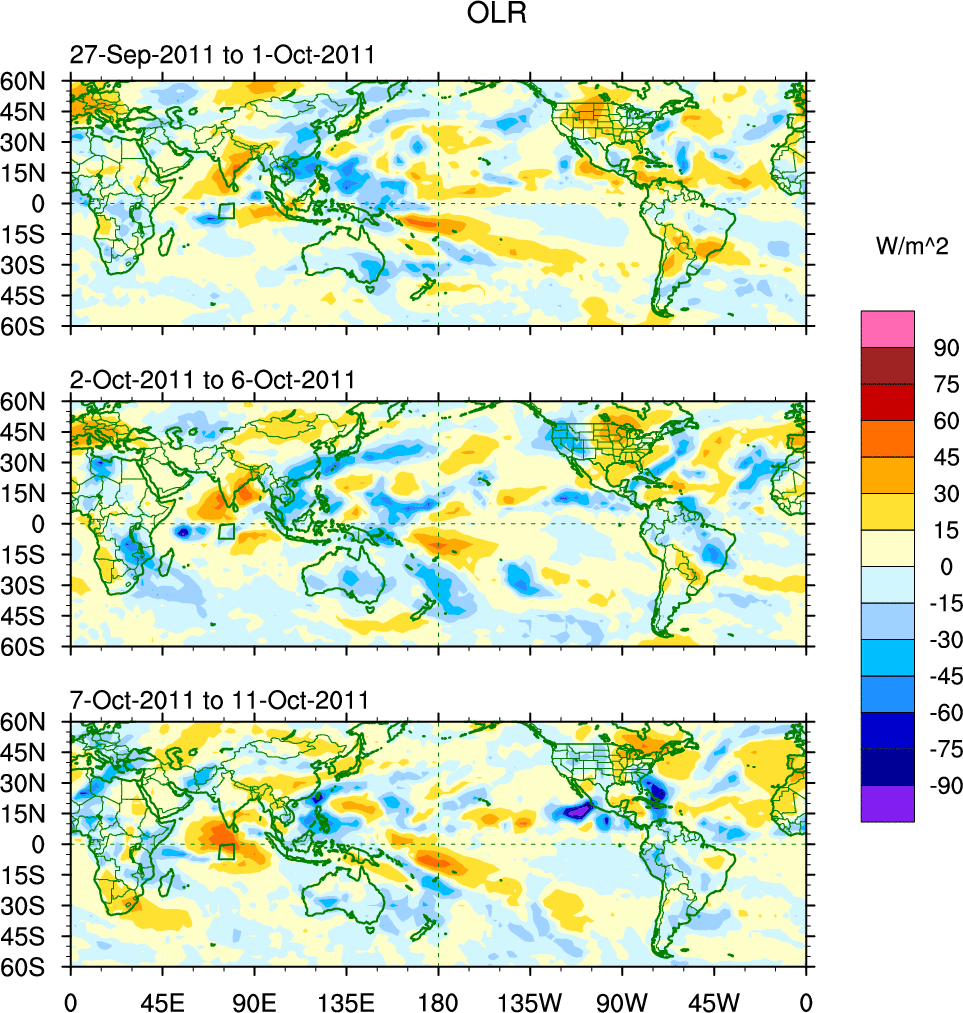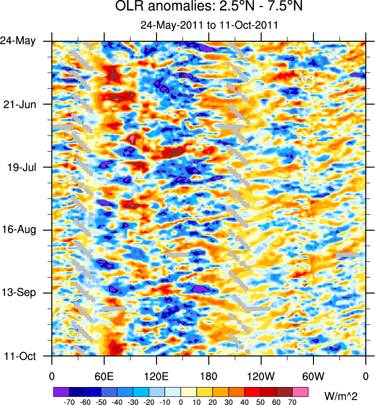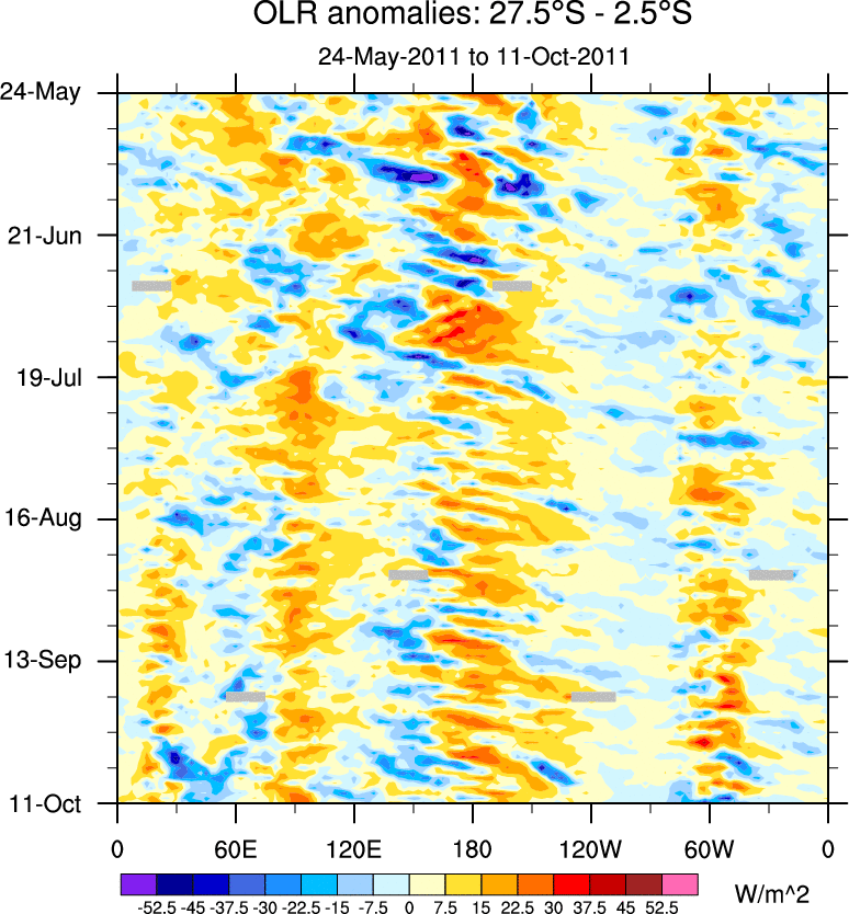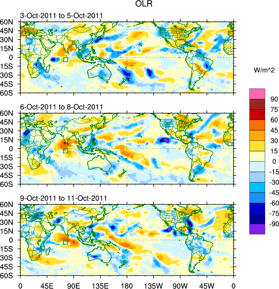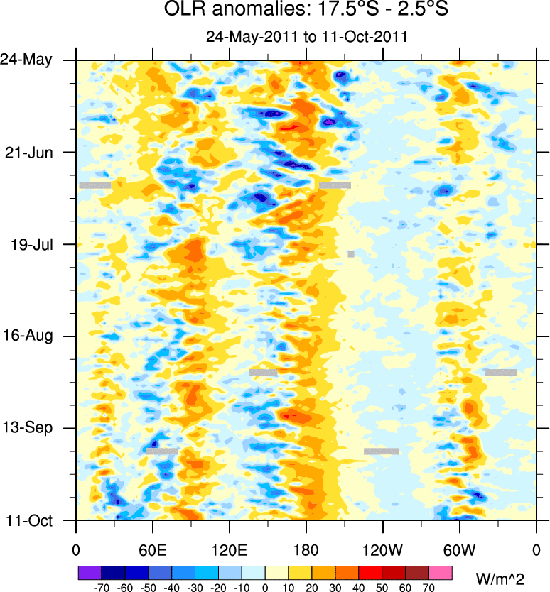 To identify tropical waves in near real-time, the OLR and UTWV data are filtered following Wheeler & Weickmann (2001 MWR). The daily anomalies are calculated using the first 3 harmonics of the seasonal cycle for 1979–2009. Missing values are then filled using linear interpolation in space and time. The most recent 365 days of anomalies are padded with 659 days of zeroes, and the result is filtered for each wave type.