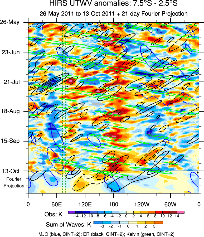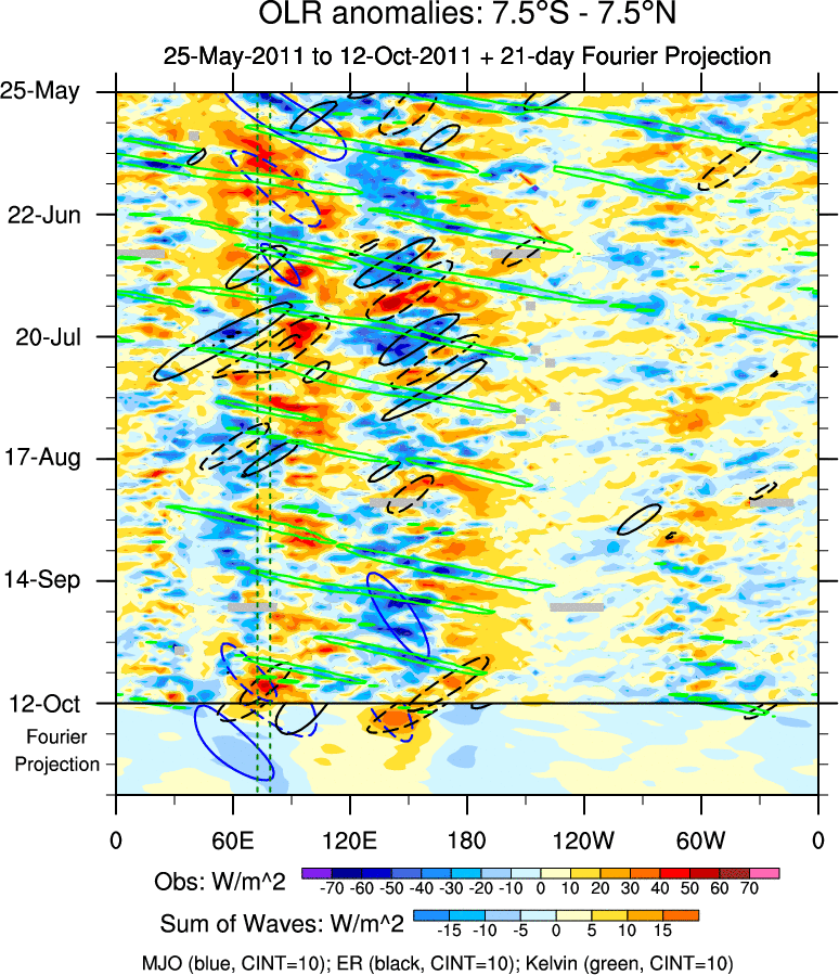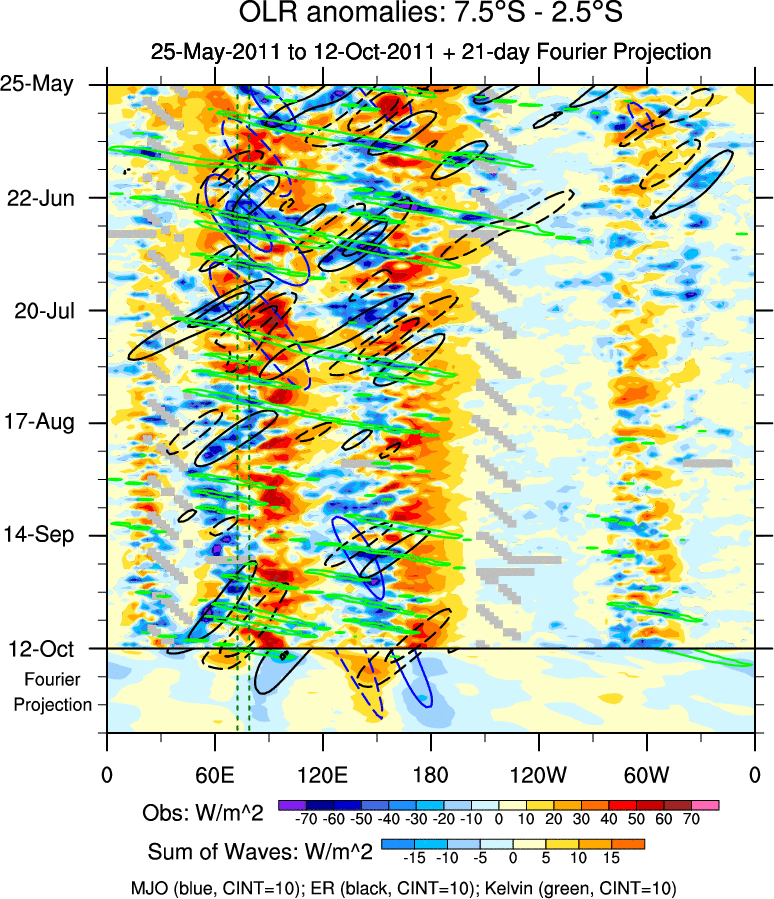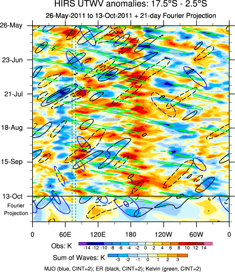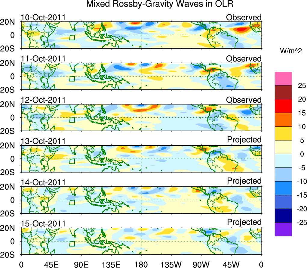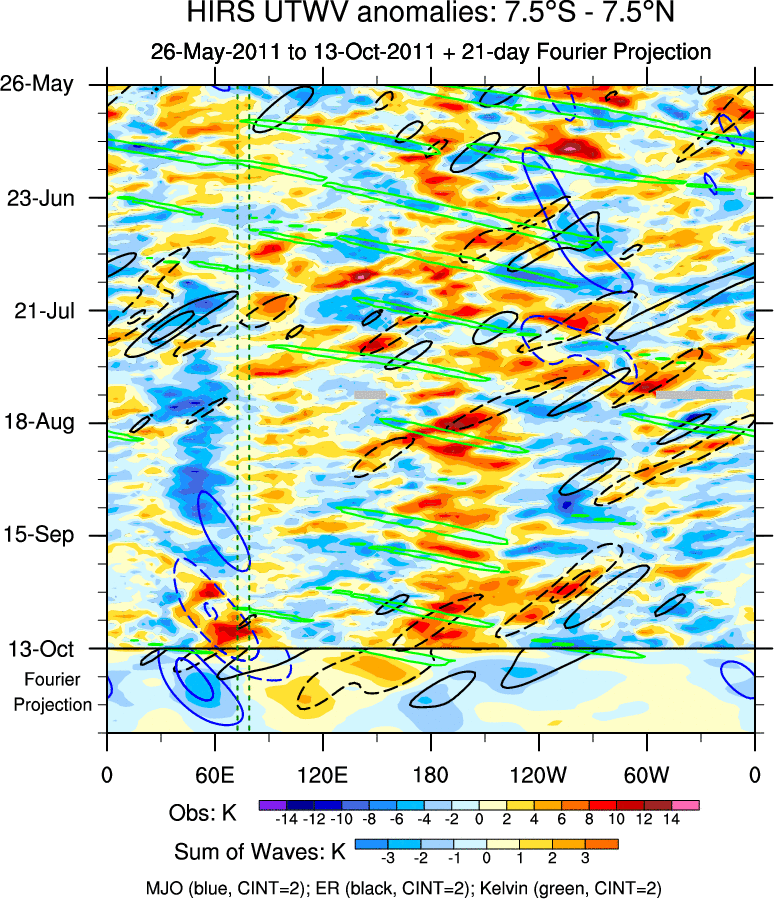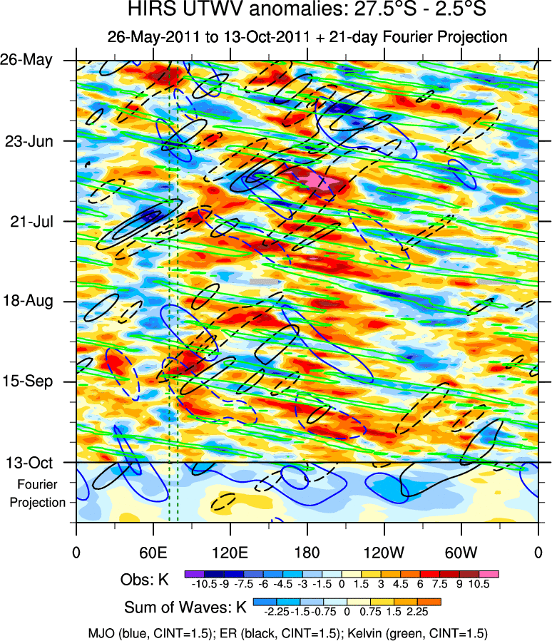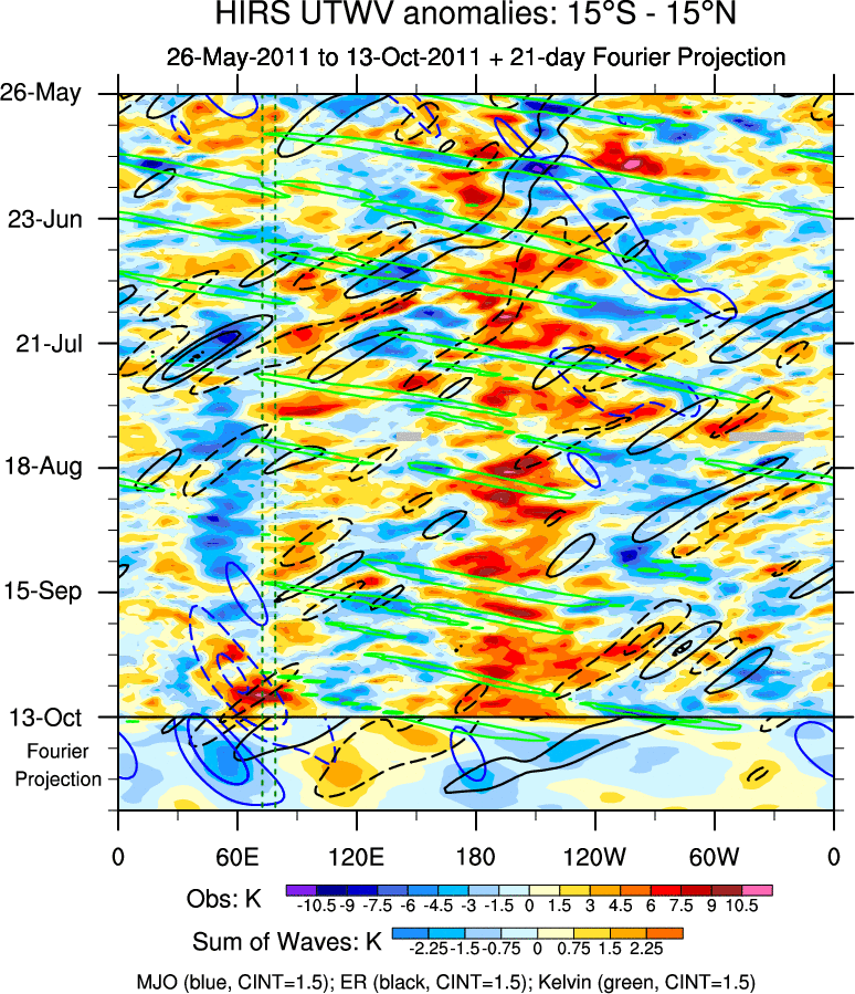 To identify tropical waves in near real-time, the OLR and UTWV data are filtered following Wheeler & Weickmann (2001 MWR). The daily anomalies are calculated using the first 3 harmonics of the seasonal cycle for 1979–2009. Missing values are then filled using linear interpolation in space and time. The most recent 365 days of anomalies are padded with 659 days of zeroes, and the result is filtered for each wave type.