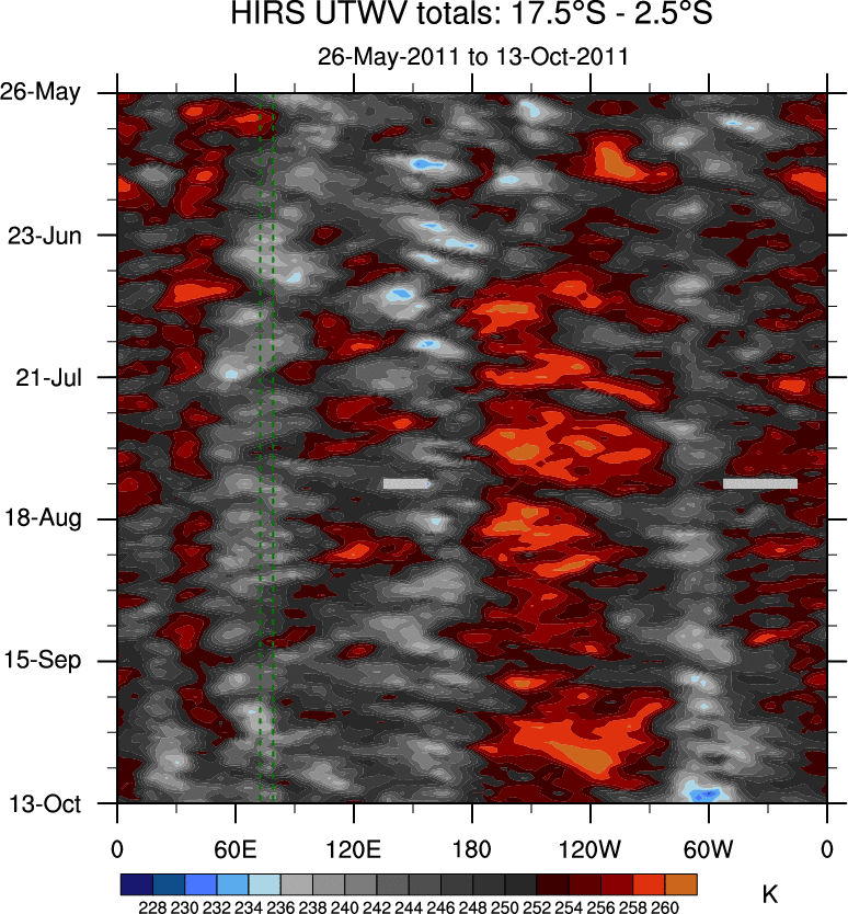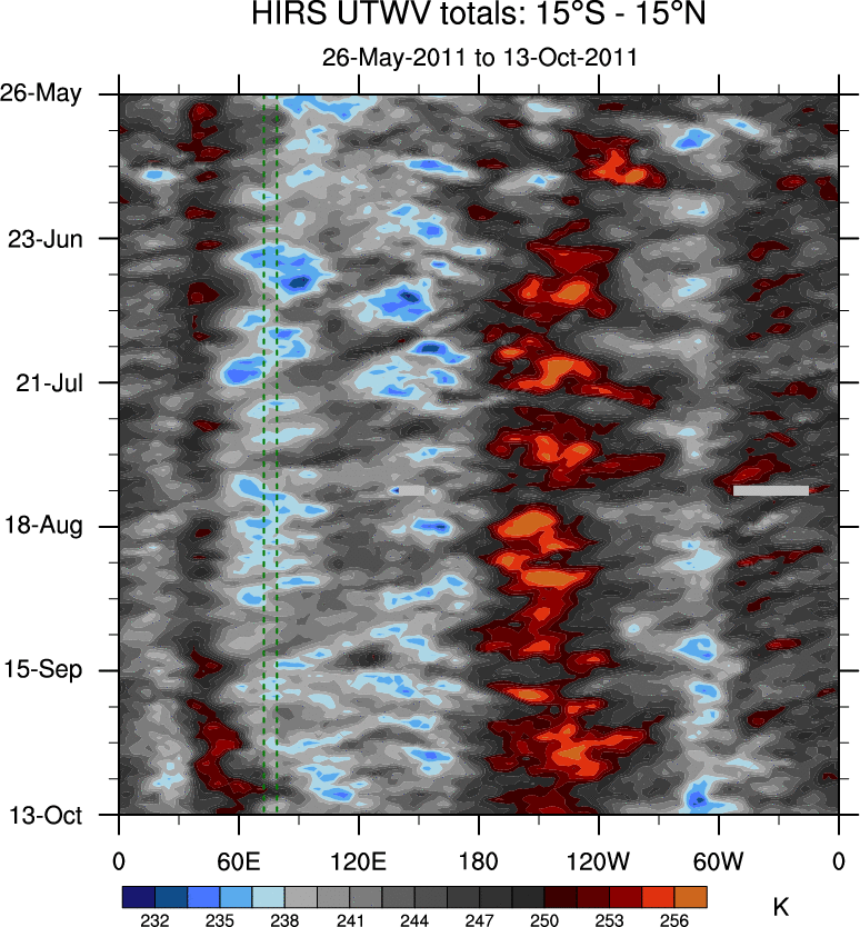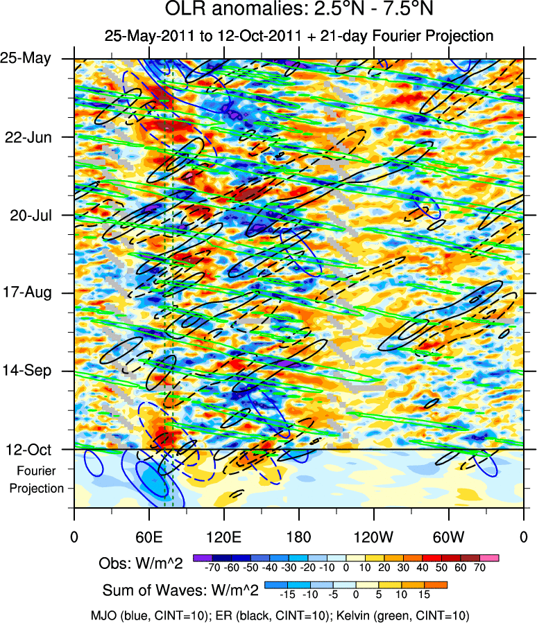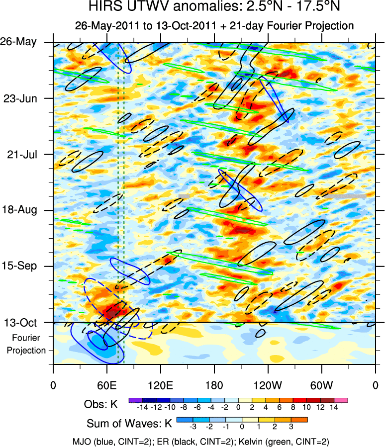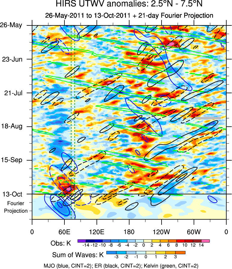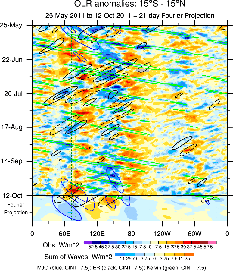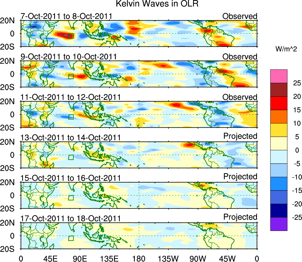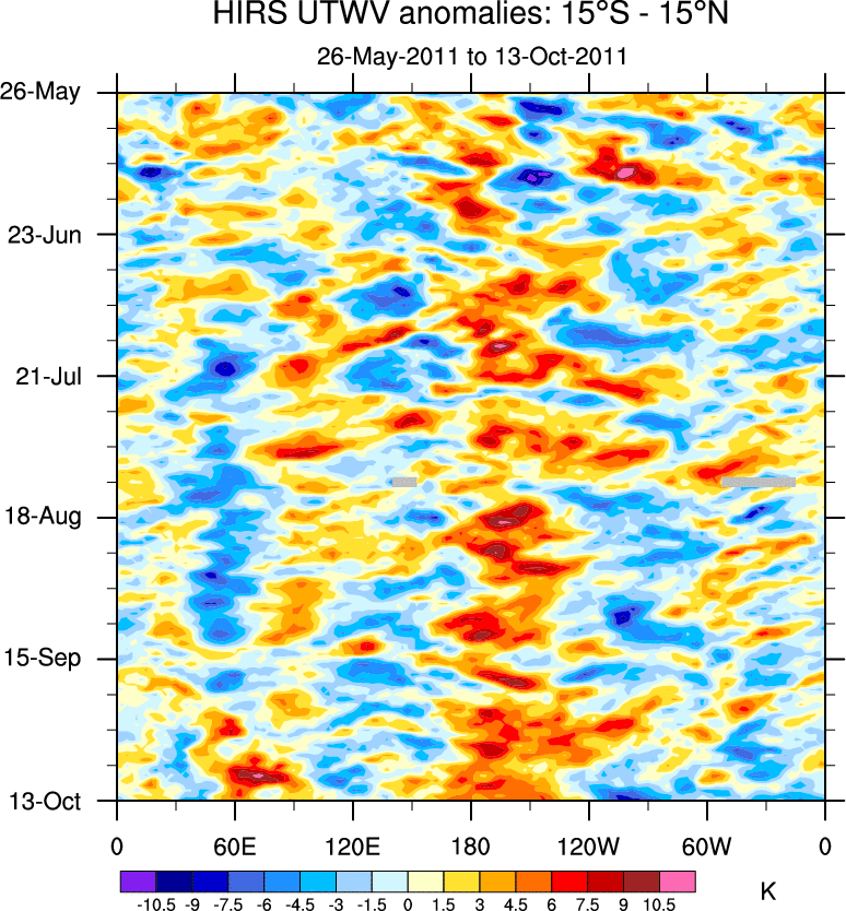 To identify tropical waves in near real-time, the OLR and UTWV data are filtered following Wheeler & Weickmann (2001 MWR). The daily anomalies are calculated using the first 3 harmonics of the seasonal cycle for 1979–2009. Missing values are then filled using linear interpolation in space and time. The most recent 365 days of anomalies are padded with 659 days of zeroes, and the result is filtered for each wave type.