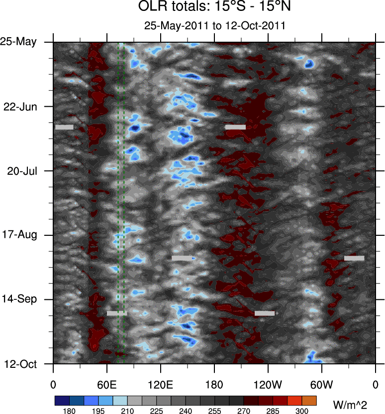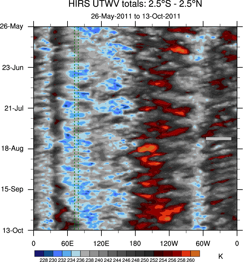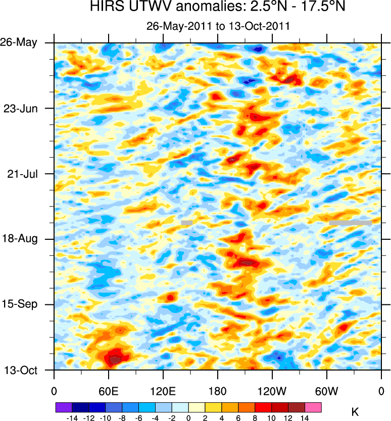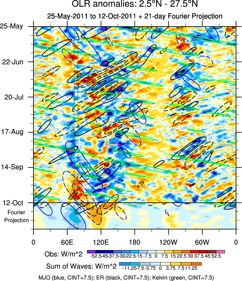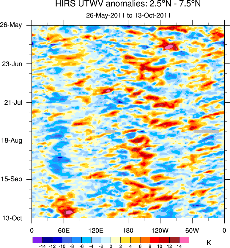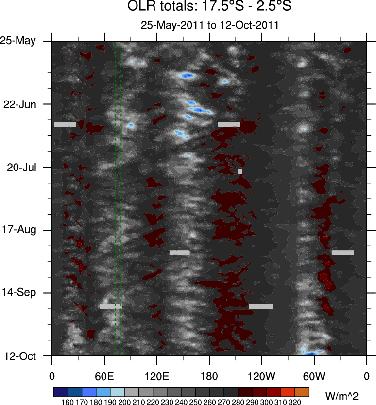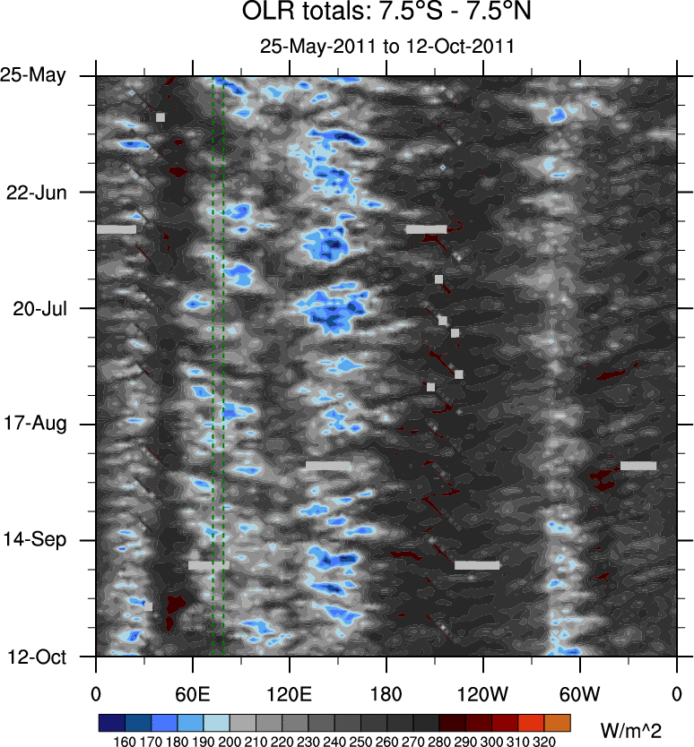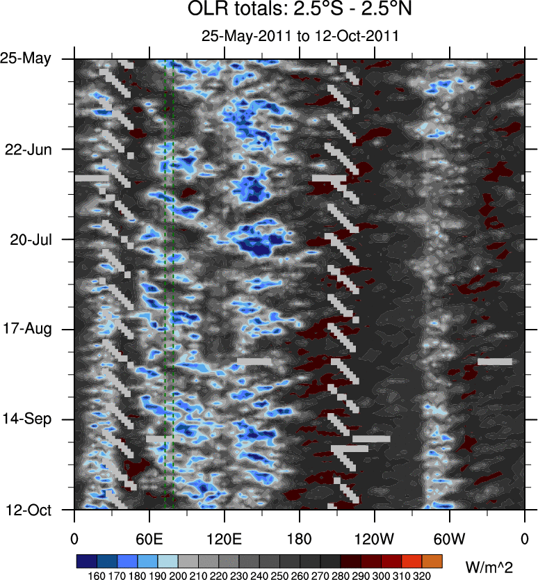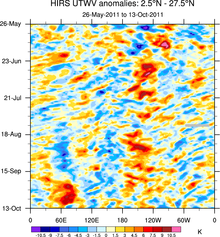 To identify tropical waves in near real-time, the OLR and UTWV data are filtered following Wheeler & Weickmann (2001 MWR). The daily anomalies are calculated using the first 3 harmonics of the seasonal cycle for 1979–2009. Missing values are then filled using linear interpolation in space and time. The most recent 365 days of anomalies are padded with 659 days of zeroes, and the result is filtered for each wave type.