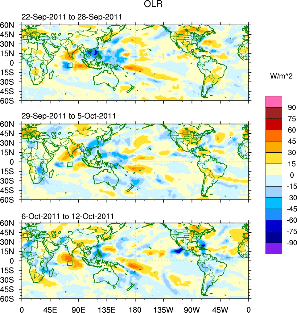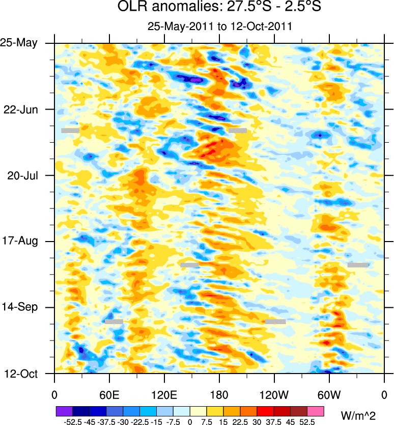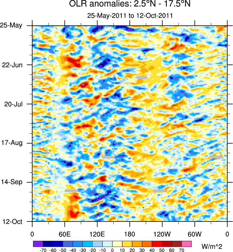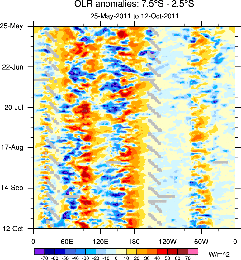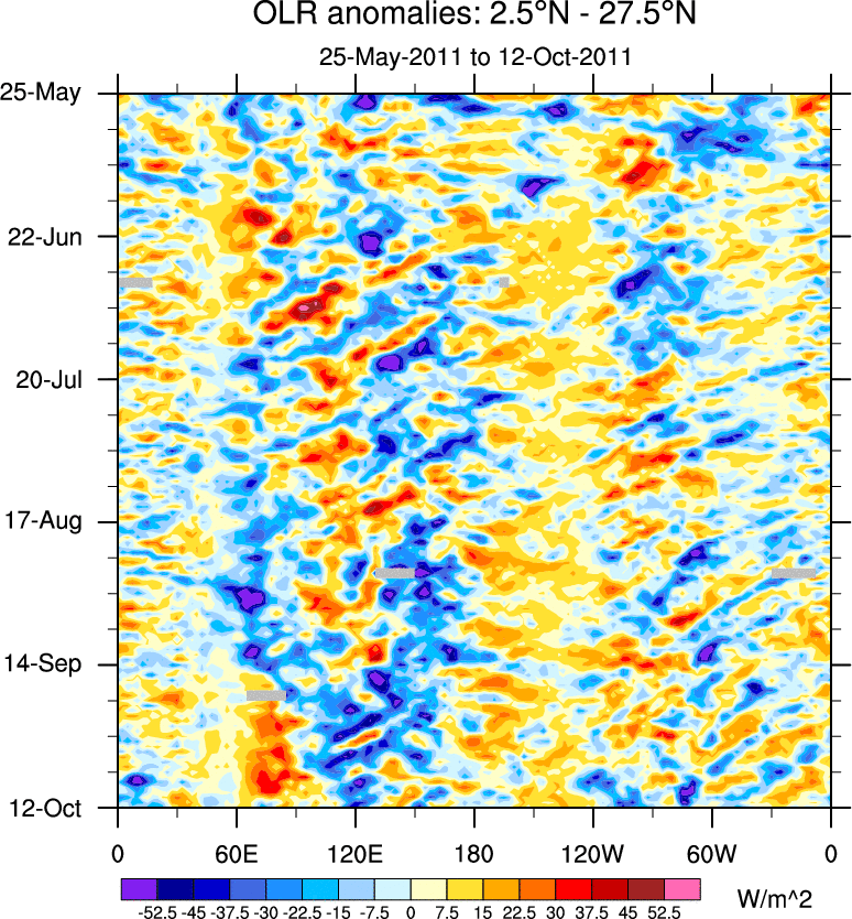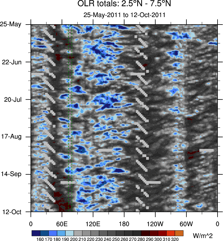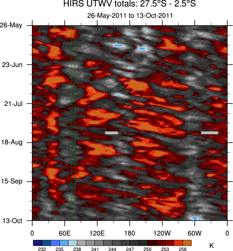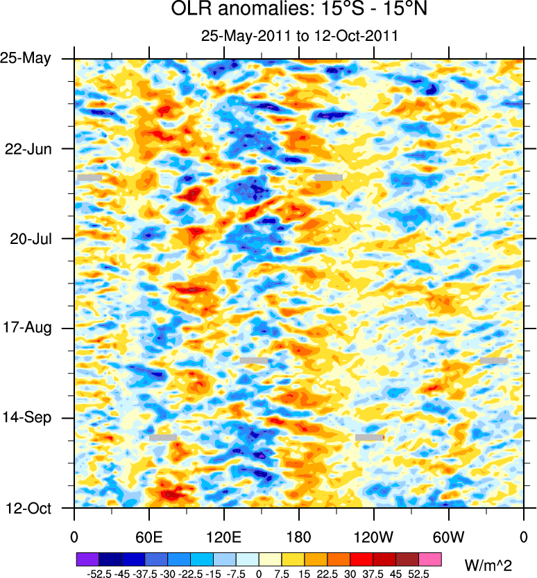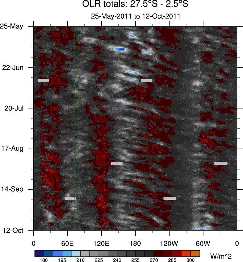 To identify tropical waves in near real-time, the OLR and UTWV data are filtered following Wheeler & Weickmann (2001 MWR). The daily anomalies are calculated using the first 3 harmonics of the seasonal cycle for 1979–2009. Missing values are then filled using linear interpolation in space and time. The most recent 365 days of anomalies are padded with 659 days of zeroes, and the result is filtered for each wave type.