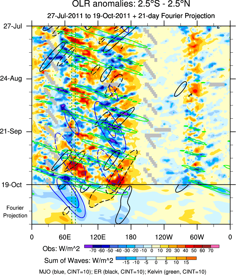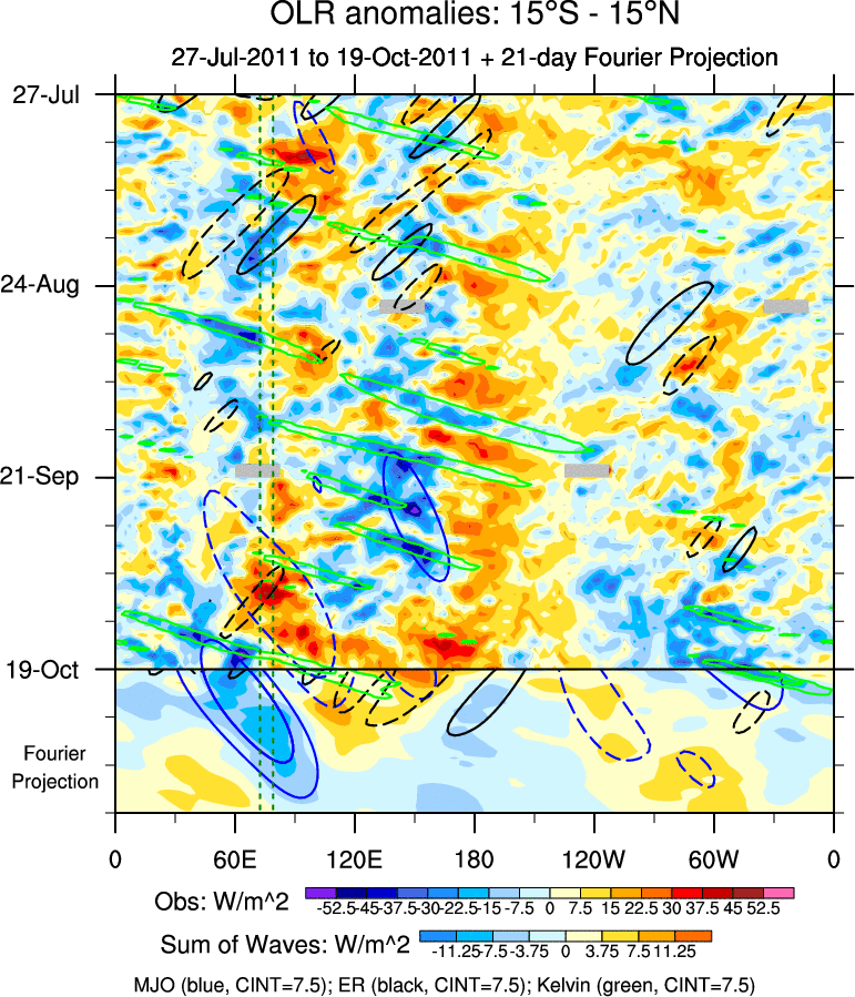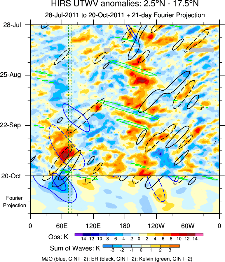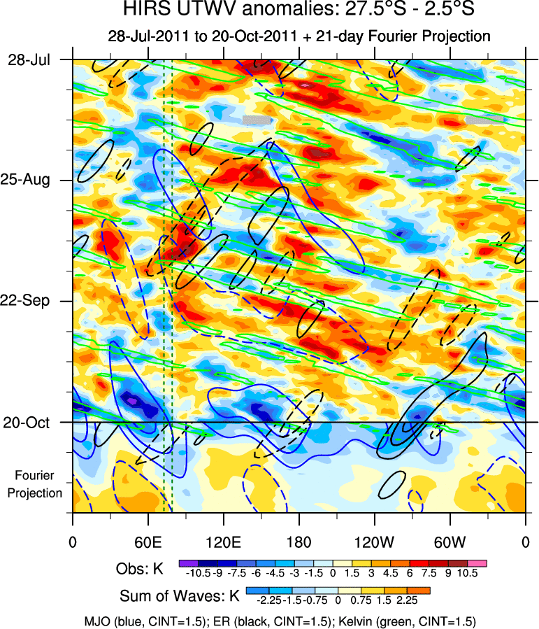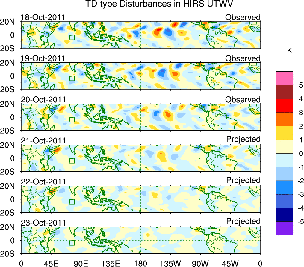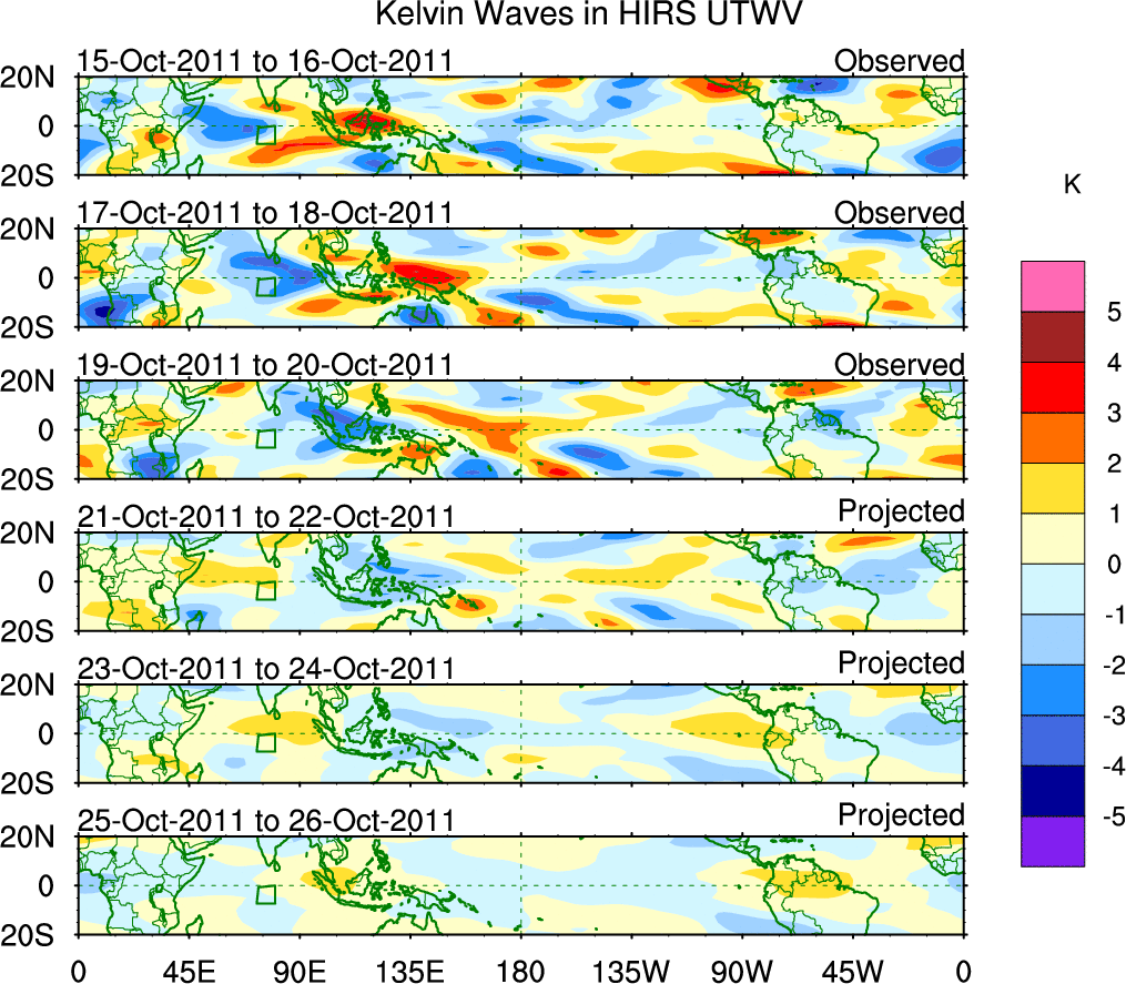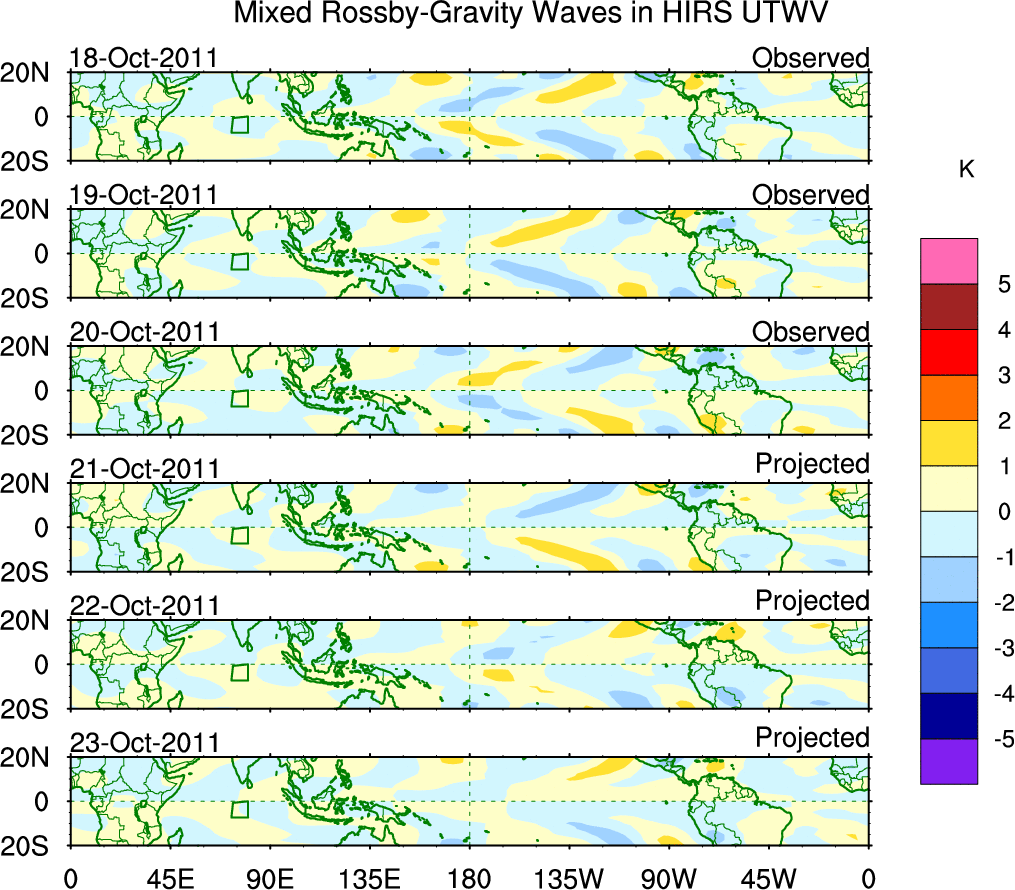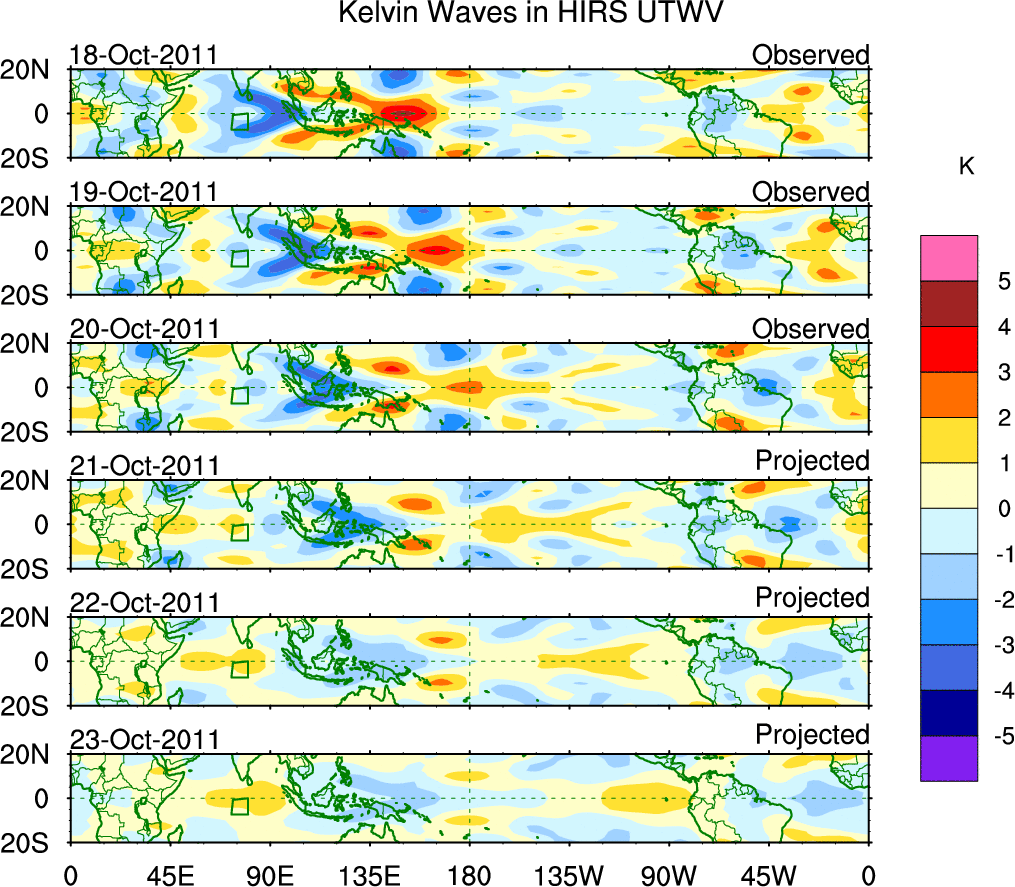 To identify tropical waves in near real-time, the OLR and UTWV data are filtered following Wheeler & Weickmann (2001 MWR). The daily anomalies are calculated using the first 3 harmonics of the seasonal cycle for 1979–2009. Missing values are then filled using linear interpolation in space and time. The most recent 365 days of anomalies are padded with 659 days of zeroes, and the result is filtered for each wave type.