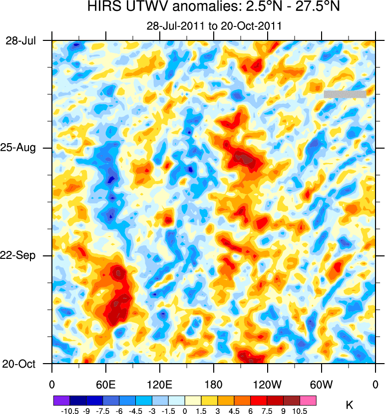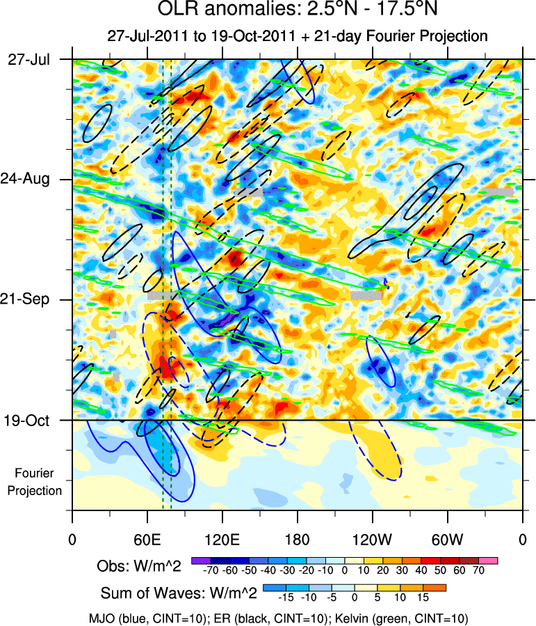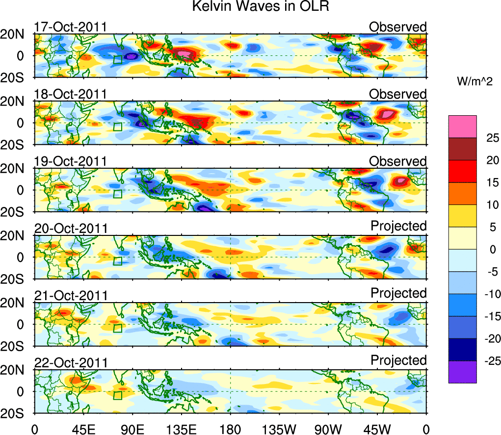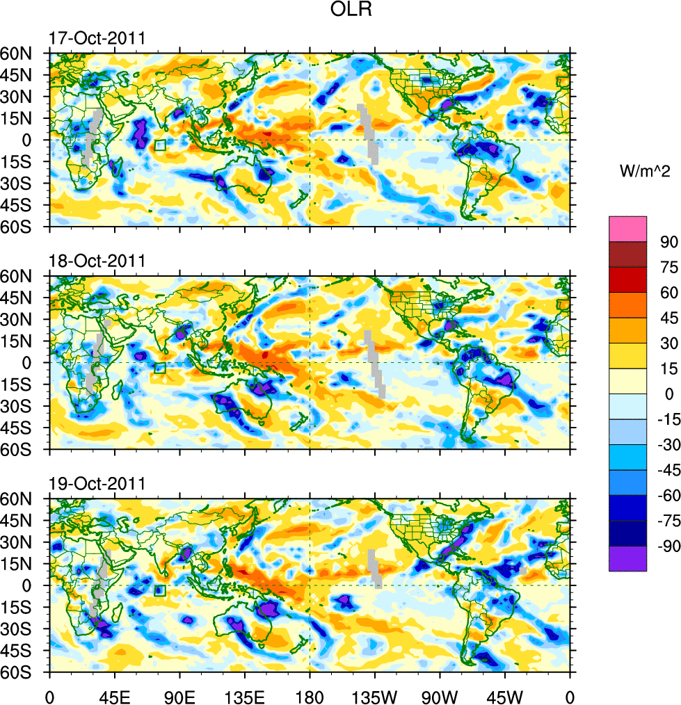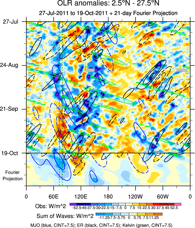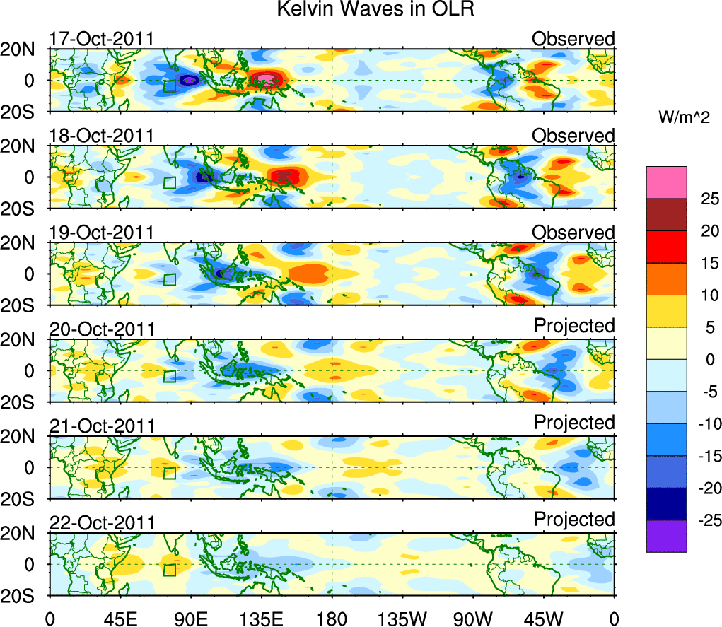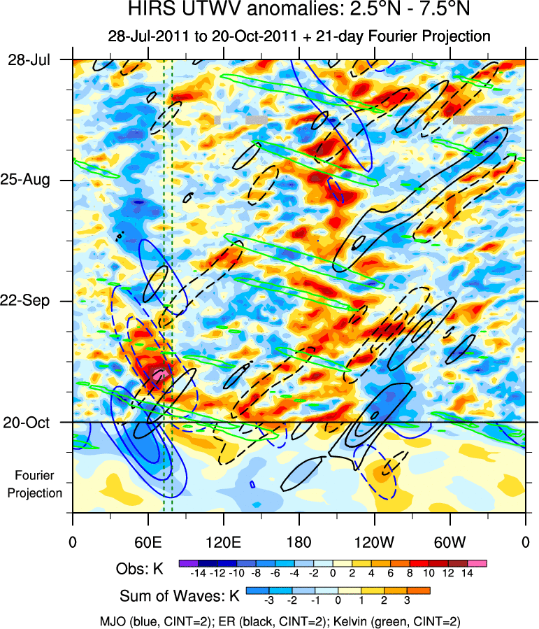 To identify tropical waves in near real-time, the OLR and UTWV data are filtered following Wheeler & Weickmann (2001 MWR). The daily anomalies are calculated using the first 3 harmonics of the seasonal cycle for 1979–2009. Missing values are then filled using linear interpolation in space and time. The most recent 365 days of anomalies are padded with 659 days of zeroes, and the result is filtered for each wave type.