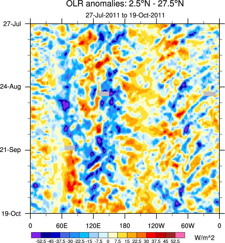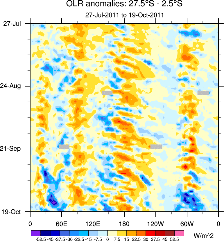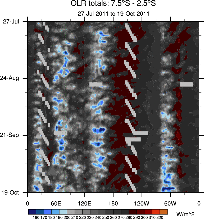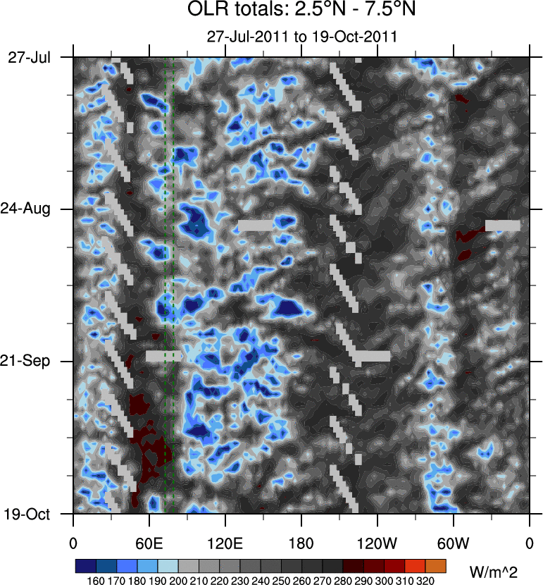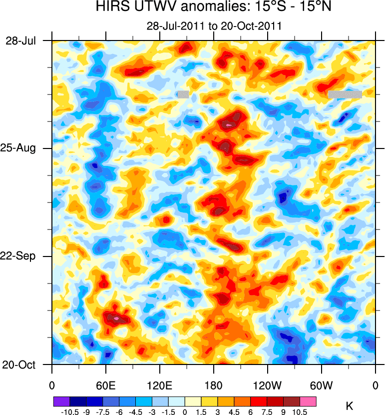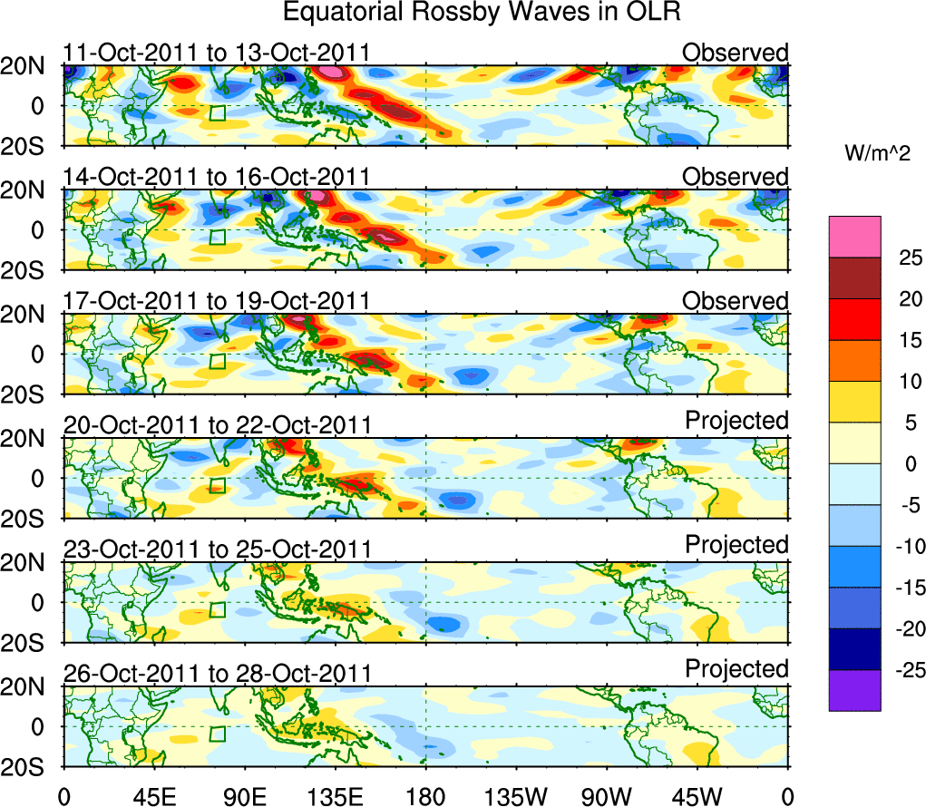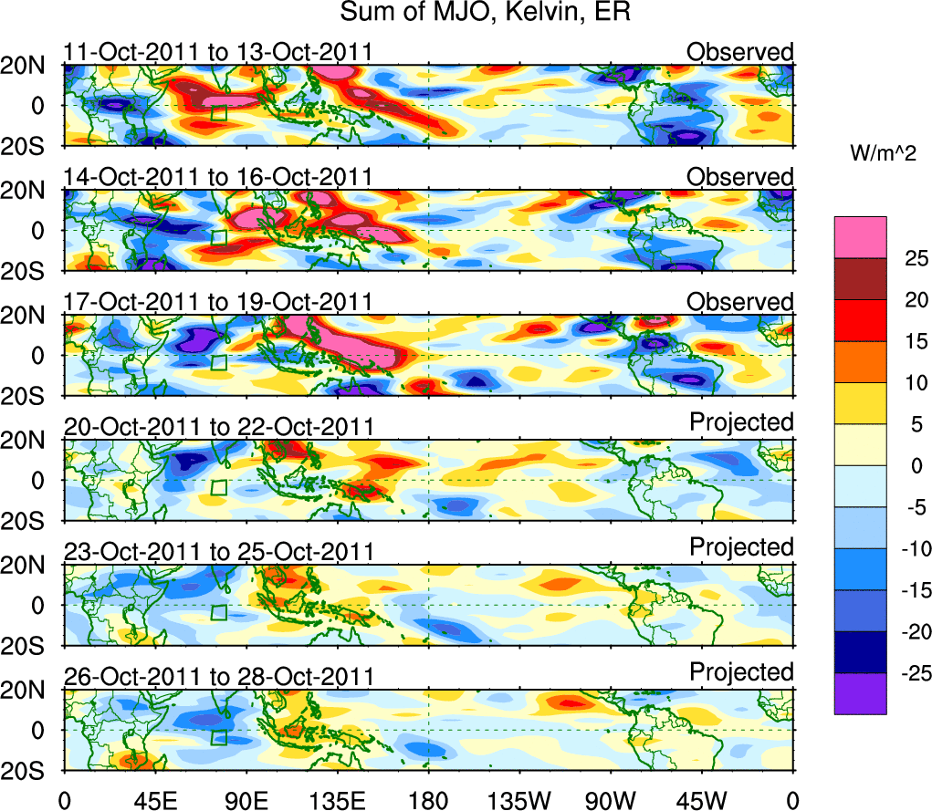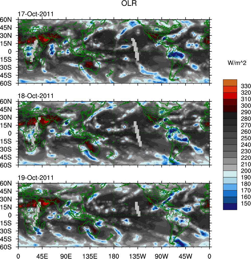 To identify tropical waves in near real-time, the OLR and UTWV data are filtered following Wheeler & Weickmann (2001 MWR). The daily anomalies are calculated using the first 3 harmonics of the seasonal cycle for 1979–2009. Missing values are then filled using linear interpolation in space and time. The most recent 365 days of anomalies are padded with 659 days of zeroes, and the result is filtered for each wave type.