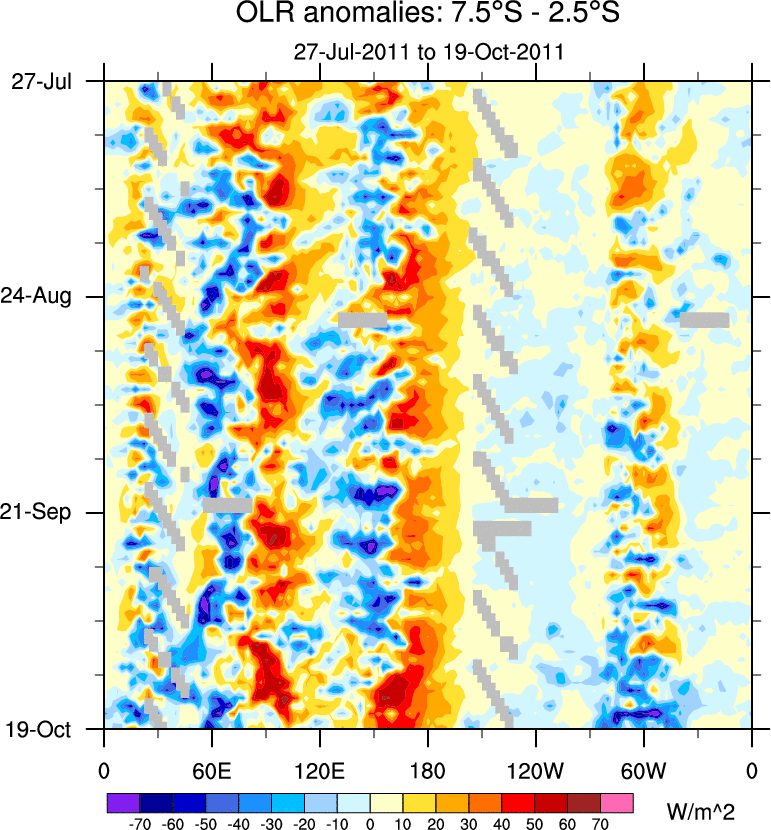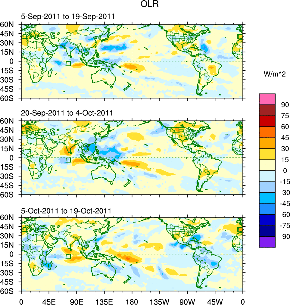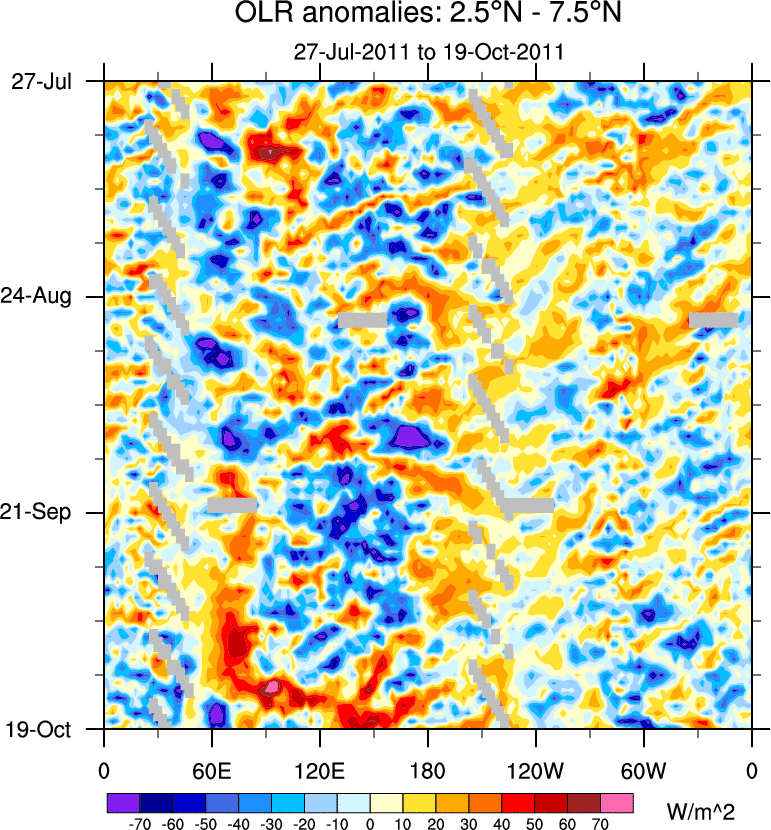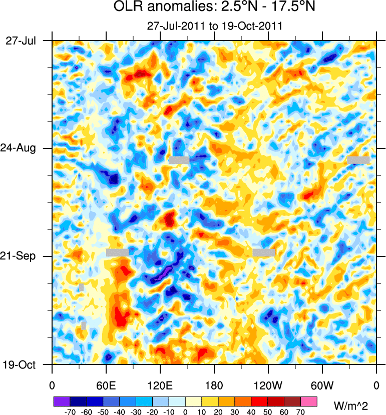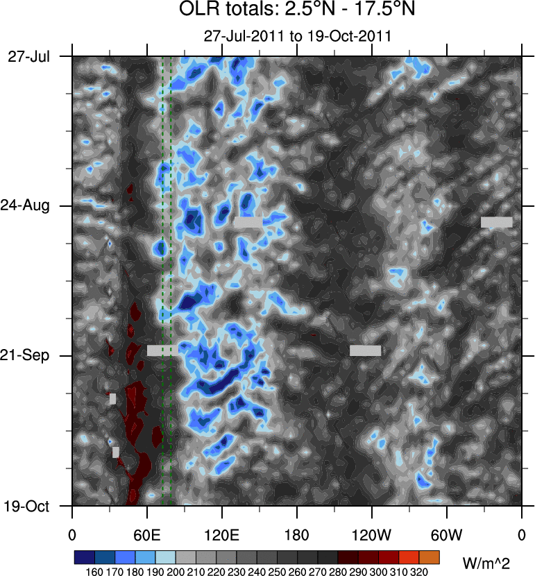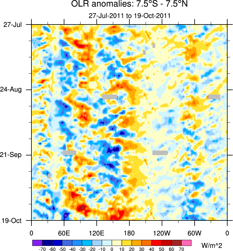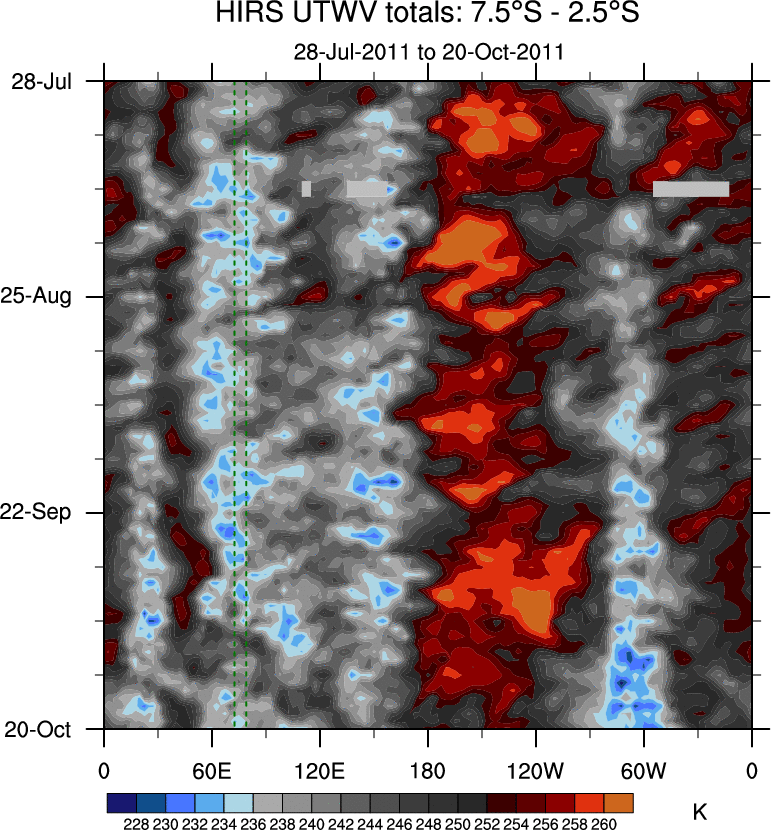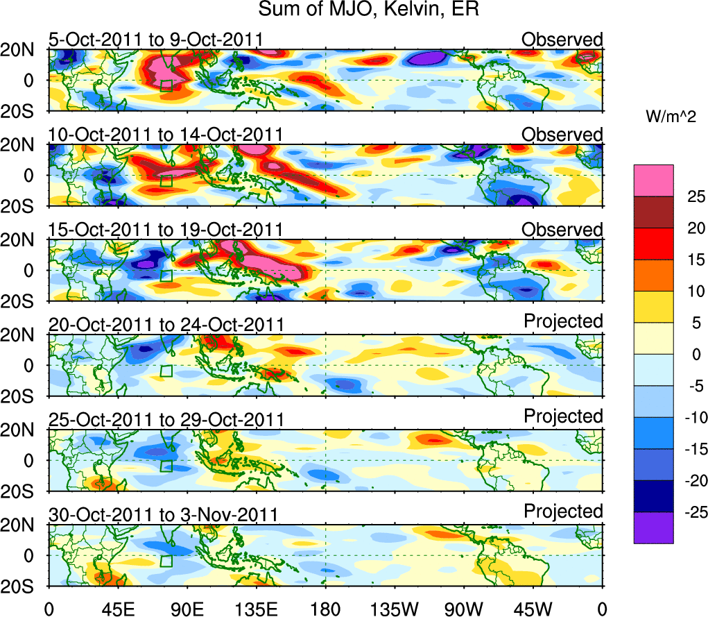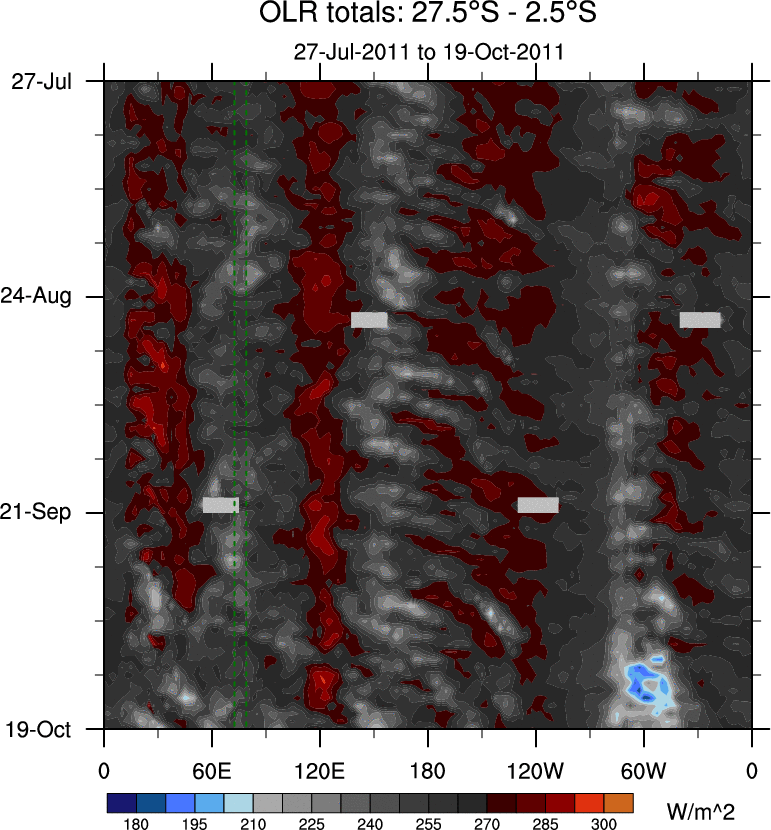 To identify tropical waves in near real-time, the OLR and UTWV data are filtered following Wheeler & Weickmann (2001 MWR). The daily anomalies are calculated using the first 3 harmonics of the seasonal cycle for 1979–2009. Missing values are then filled using linear interpolation in space and time. The most recent 365 days of anomalies are padded with 659 days of zeroes, and the result is filtered for each wave type.