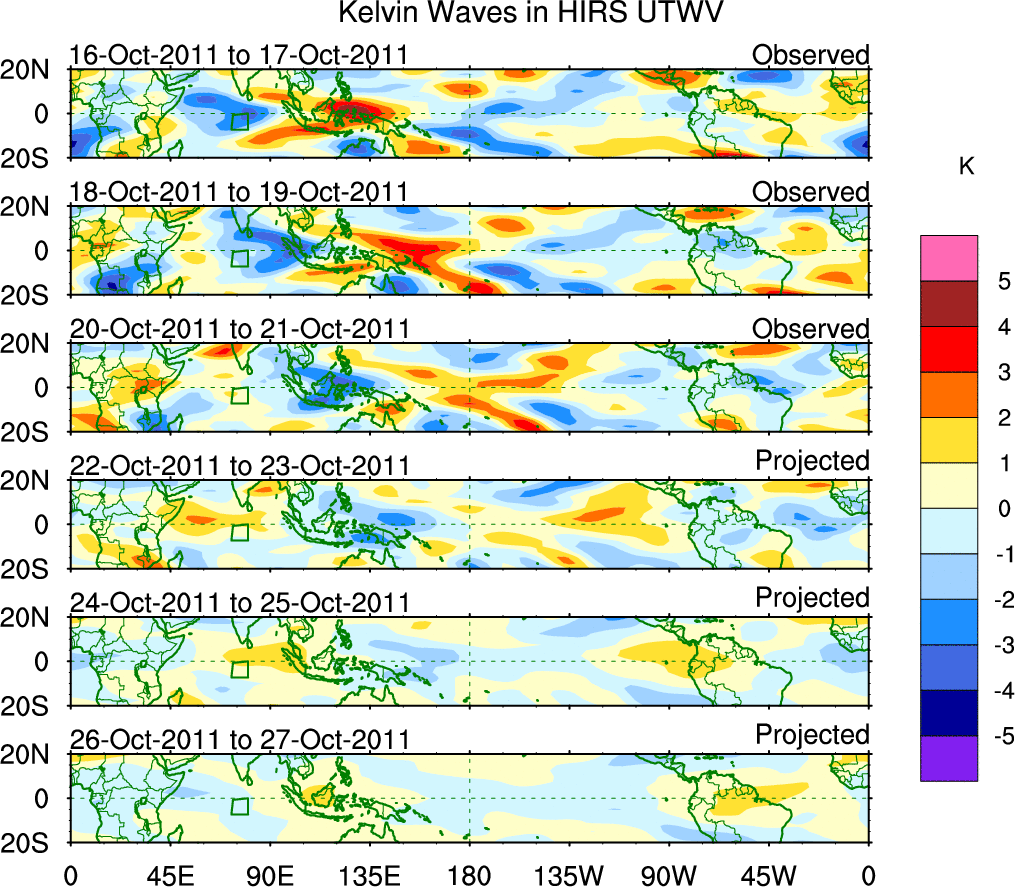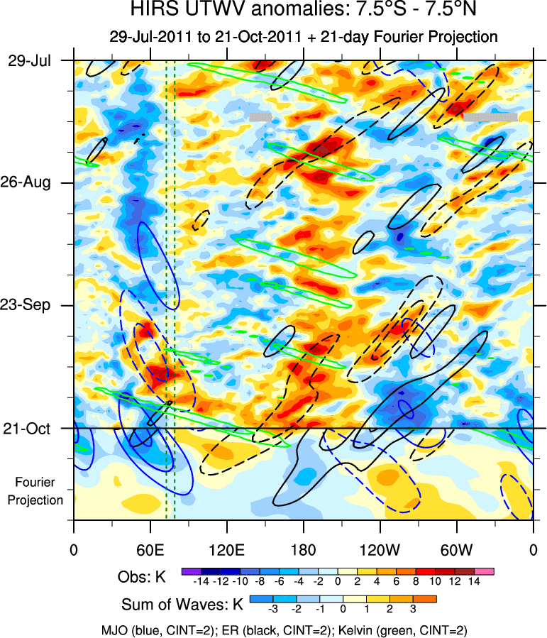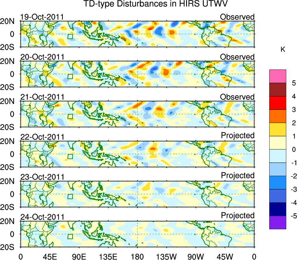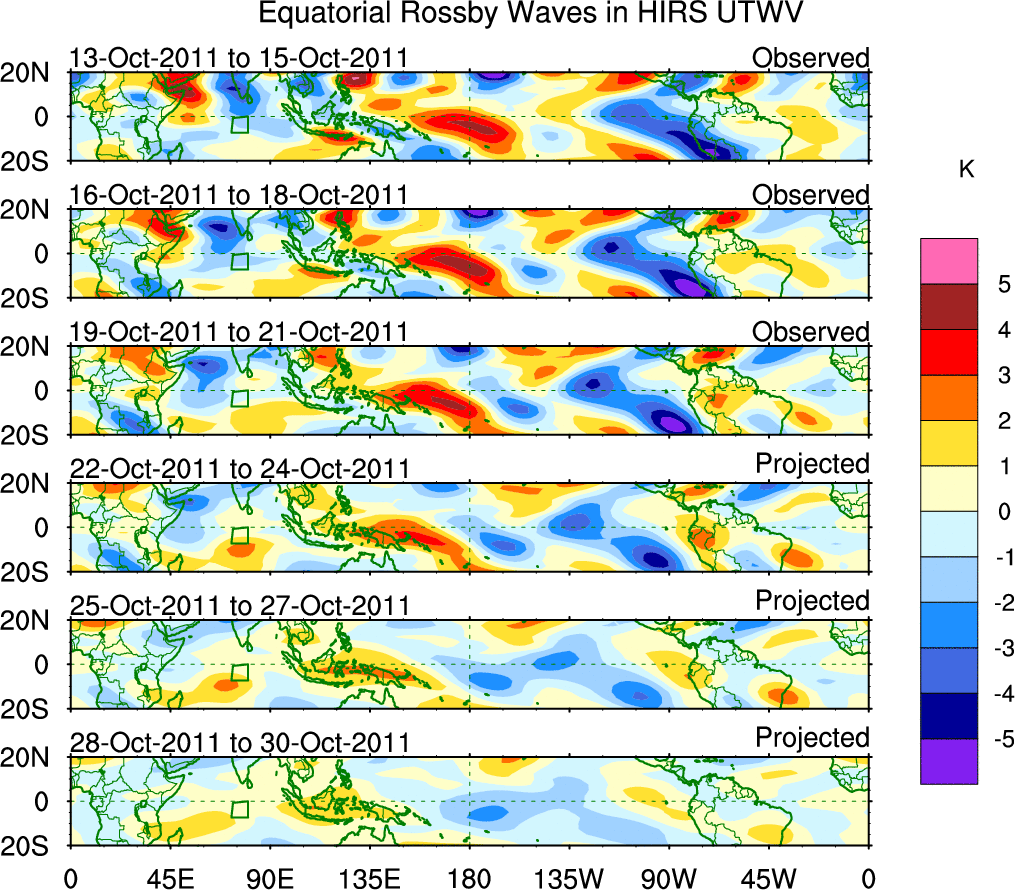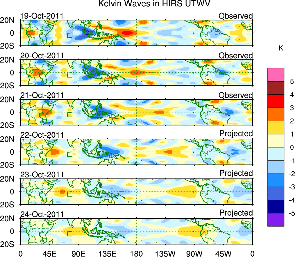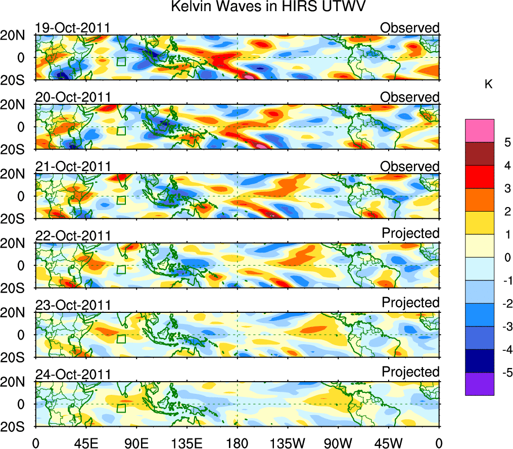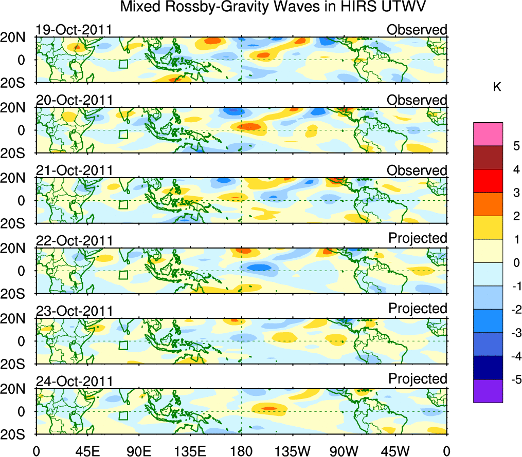 To identify tropical waves in near real-time, the OLR and UTWV data are filtered following Wheeler & Weickmann (2001 MWR). The daily anomalies are calculated using the first 3 harmonics of the seasonal cycle for 1979–2009. Missing values are then filled using linear interpolation in space and time. The most recent 365 days of anomalies are padded with 659 days of zeroes, and the result is filtered for each wave type.