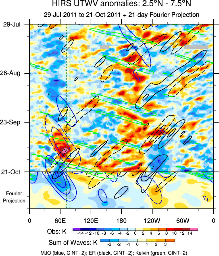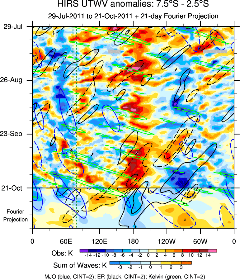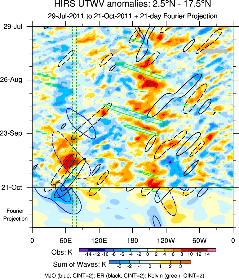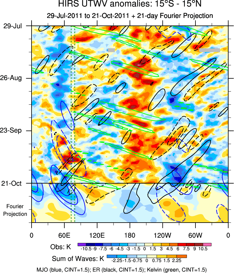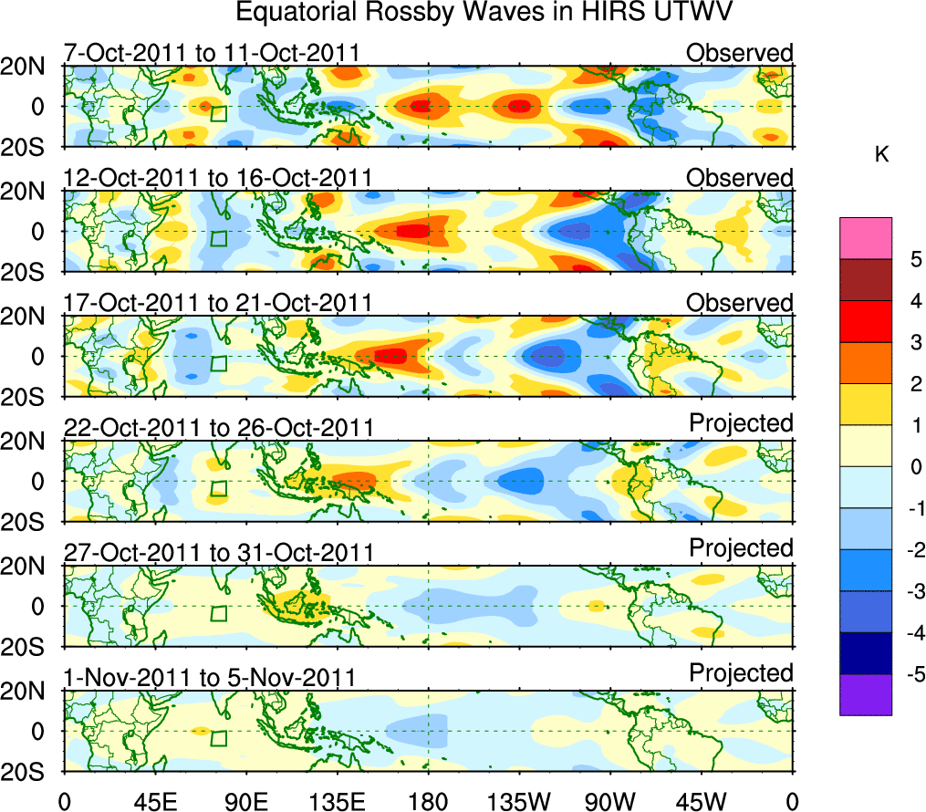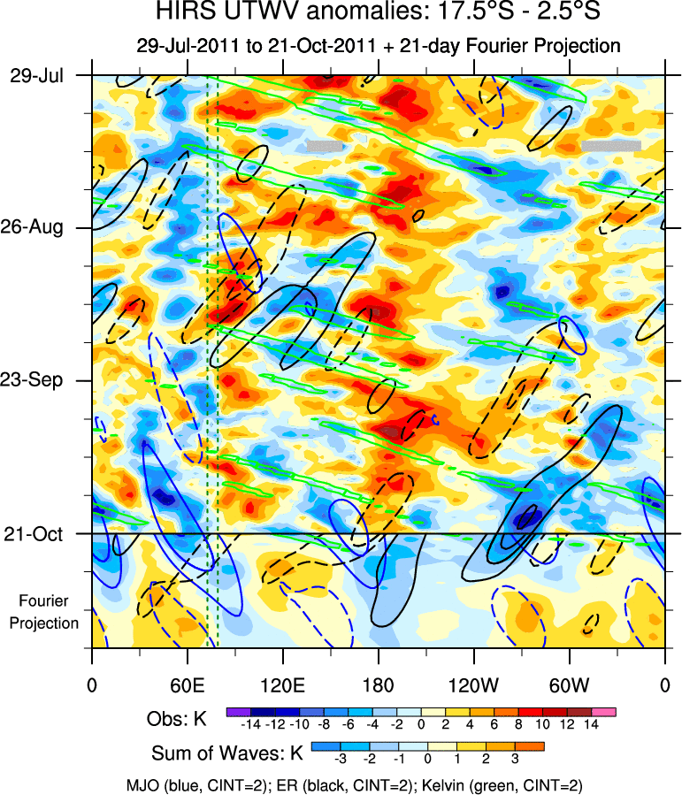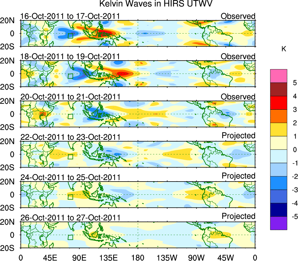 To identify tropical waves in near real-time, the OLR and UTWV data are filtered following Wheeler & Weickmann (2001 MWR). The daily anomalies are calculated using the first 3 harmonics of the seasonal cycle for 1979–2009. Missing values are then filled using linear interpolation in space and time. The most recent 365 days of anomalies are padded with 659 days of zeroes, and the result is filtered for each wave type.