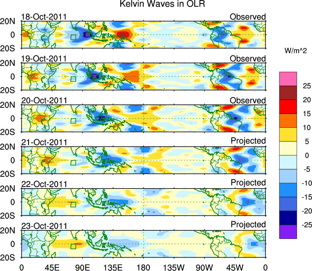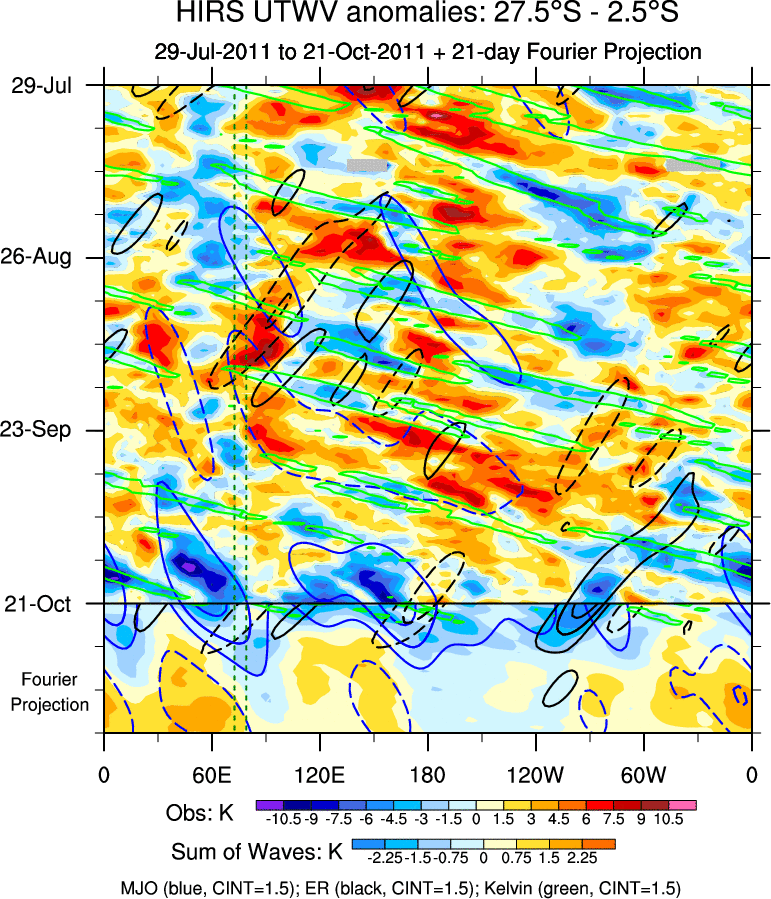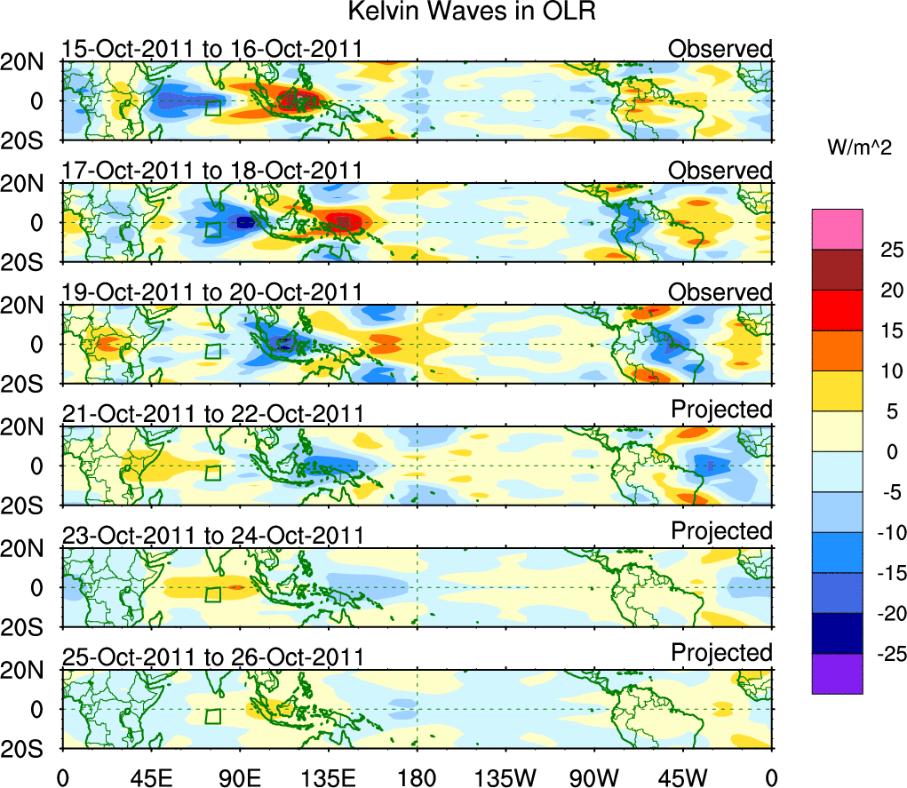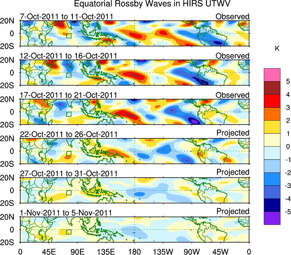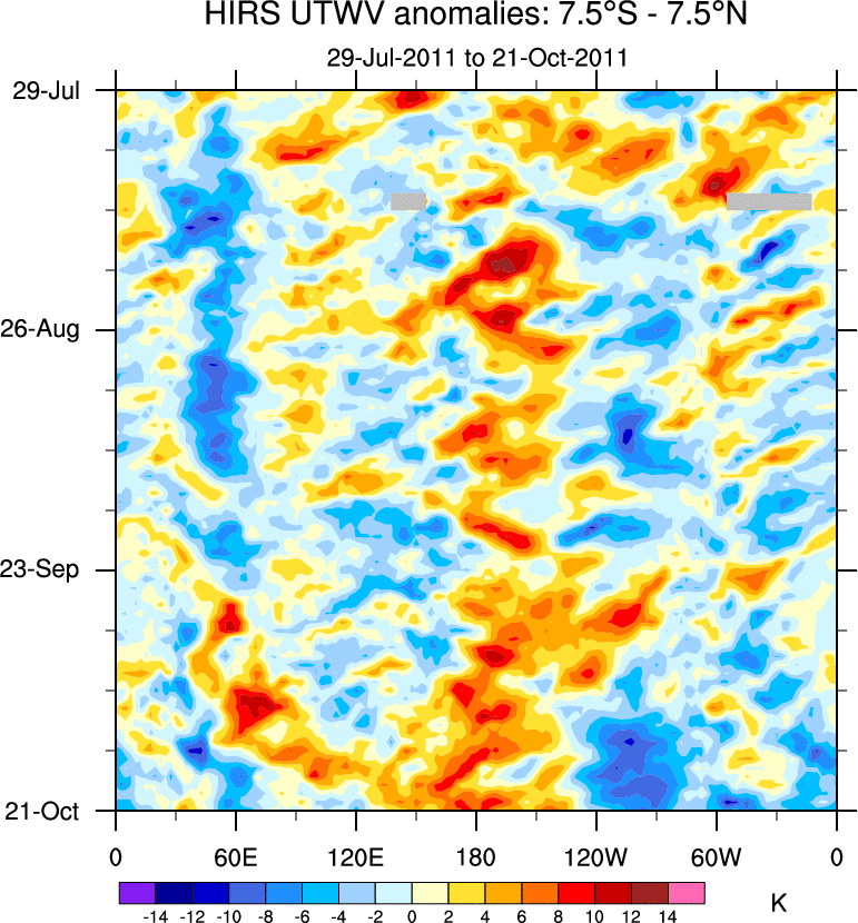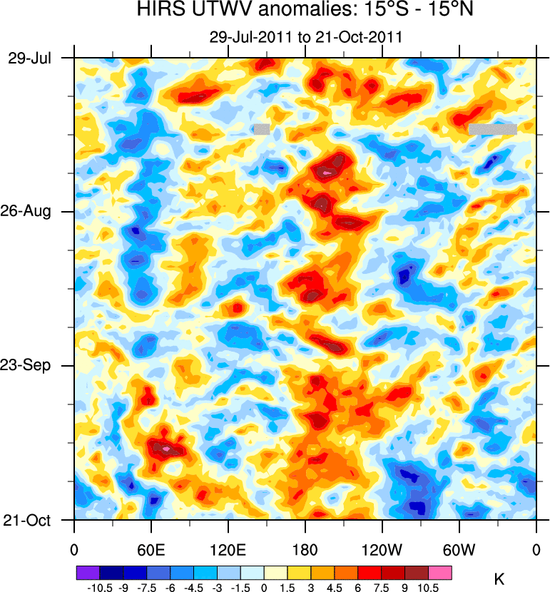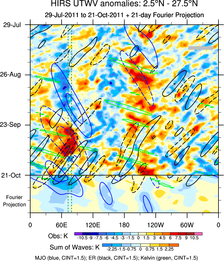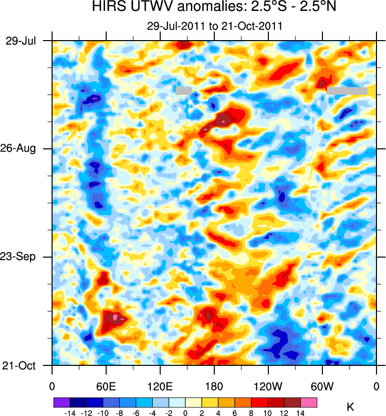 To identify tropical waves in near real-time, the OLR and UTWV data are filtered following Wheeler & Weickmann (2001 MWR). The daily anomalies are calculated using the first 3 harmonics of the seasonal cycle for 1979–2009. Missing values are then filled using linear interpolation in space and time. The most recent 365 days of anomalies are padded with 659 days of zeroes, and the result is filtered for each wave type.