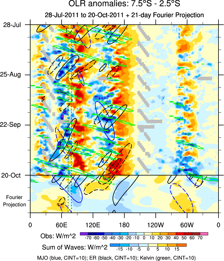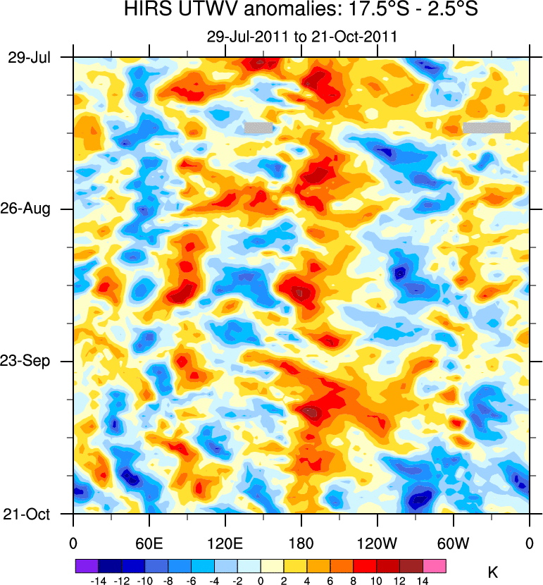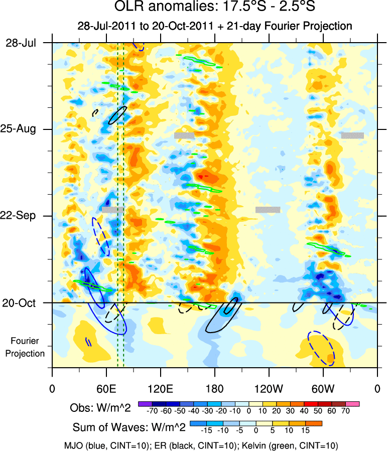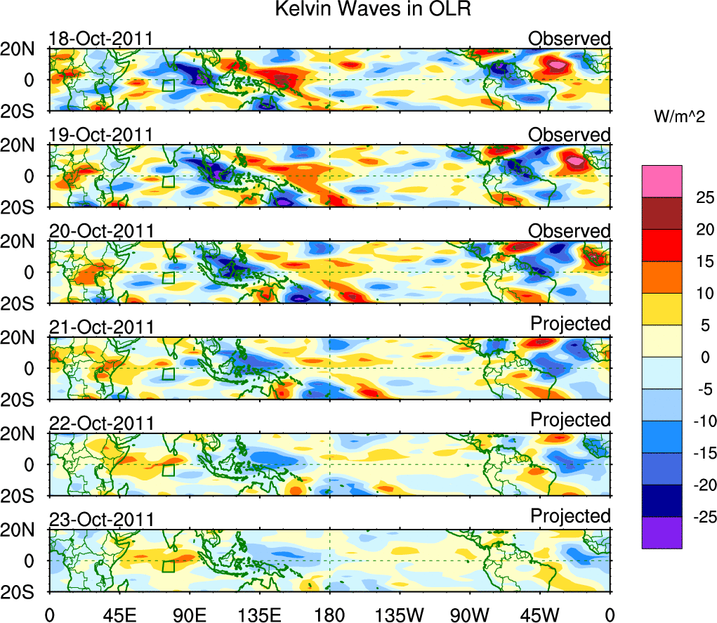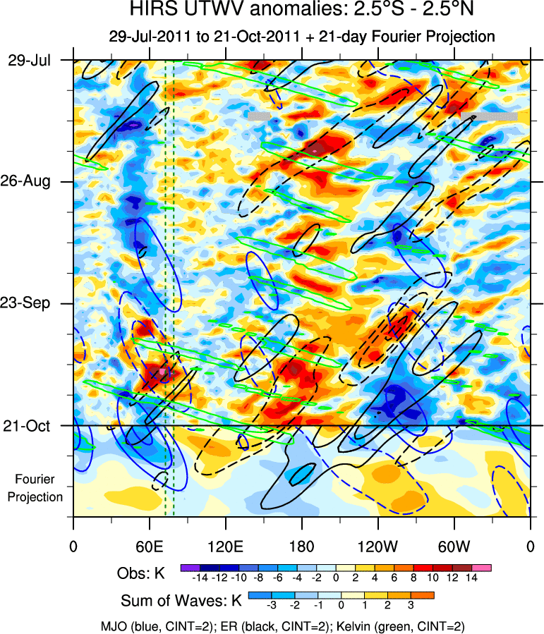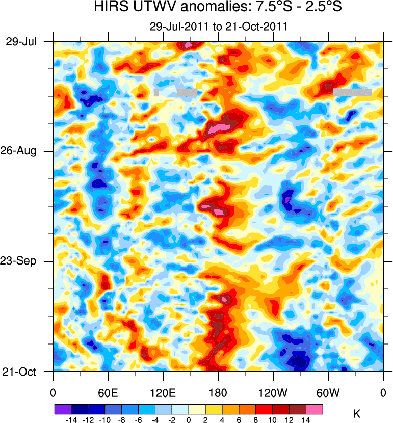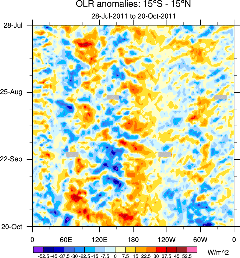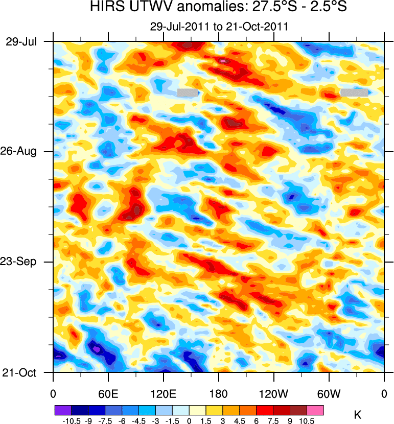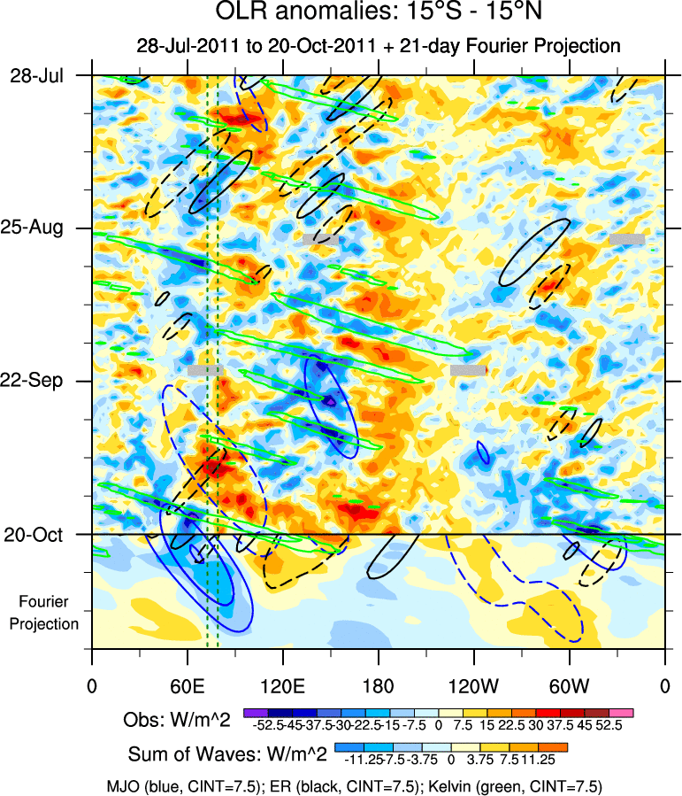 To identify tropical waves in near real-time, the OLR and UTWV data are filtered following Wheeler & Weickmann (2001 MWR). The daily anomalies are calculated using the first 3 harmonics of the seasonal cycle for 1979–2009. Missing values are then filled using linear interpolation in space and time. The most recent 365 days of anomalies are padded with 659 days of zeroes, and the result is filtered for each wave type.