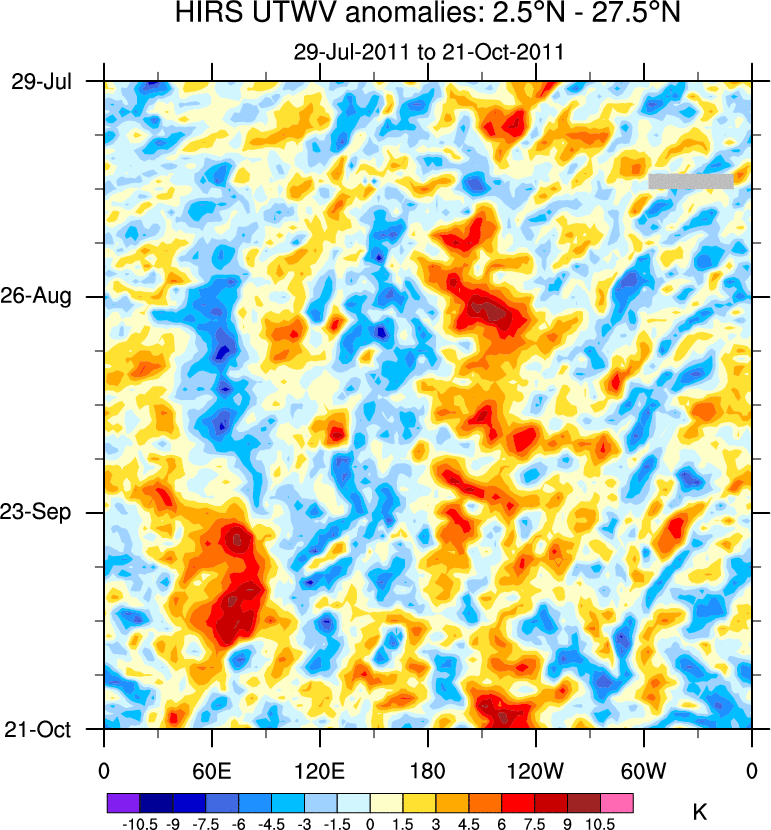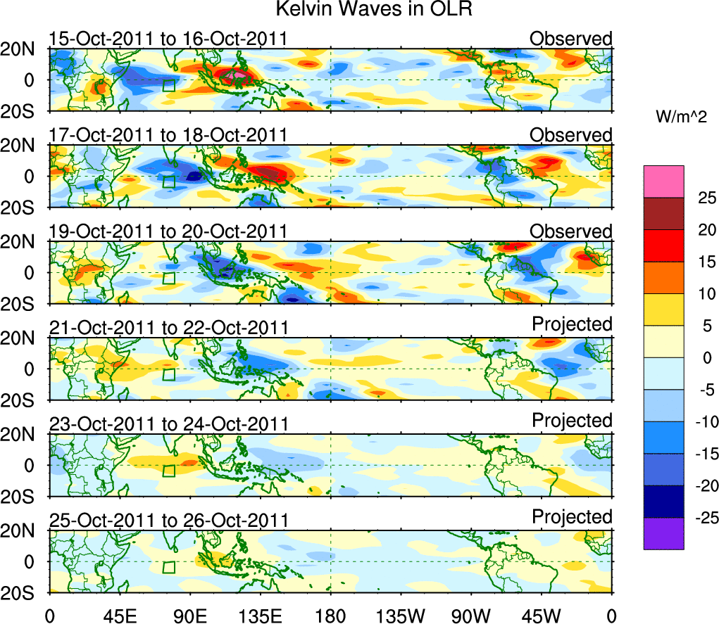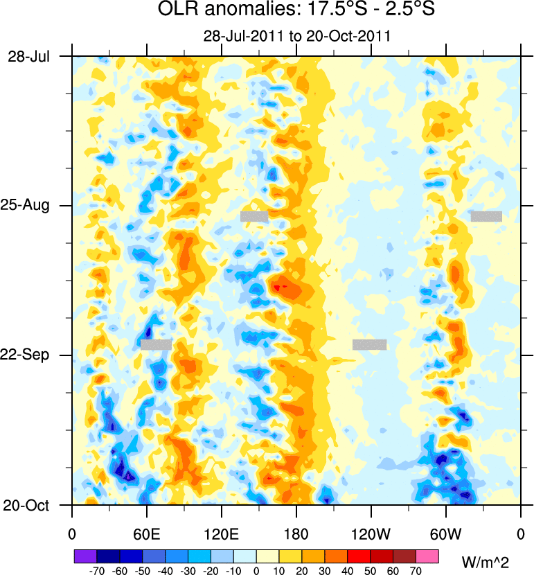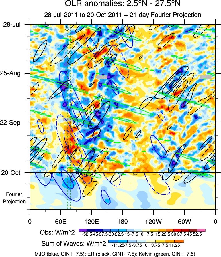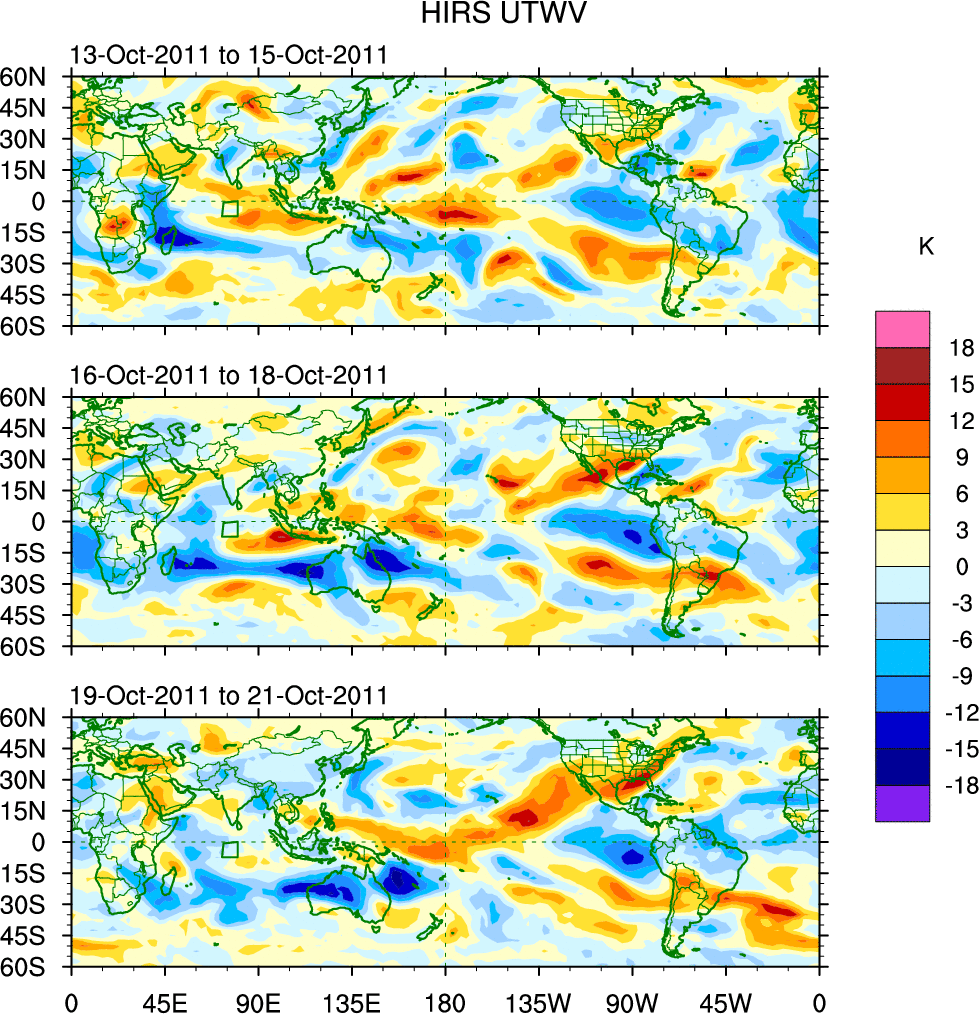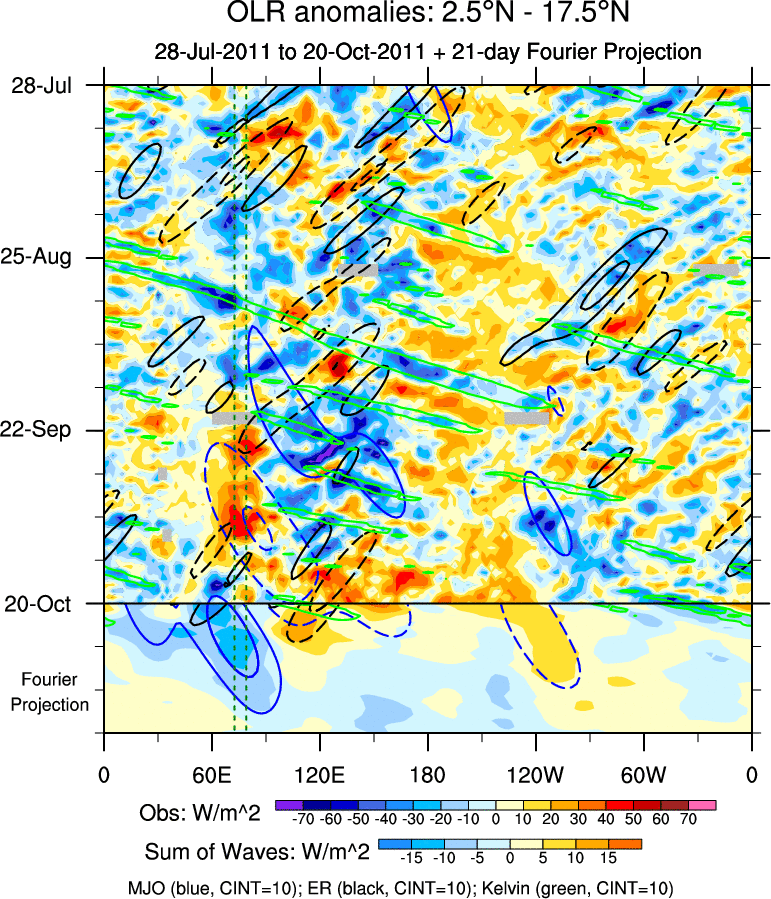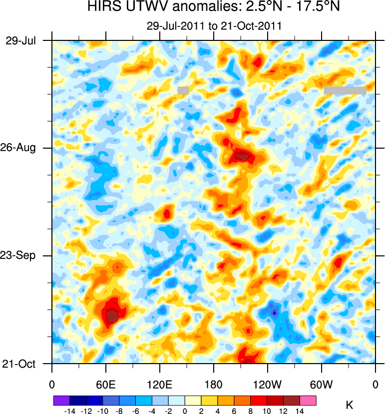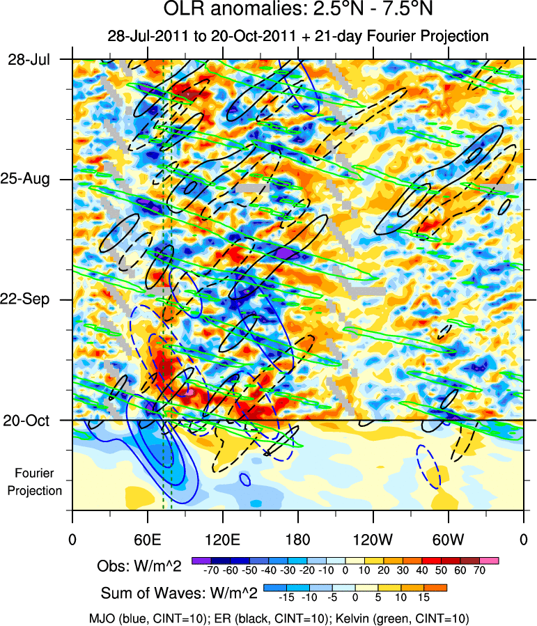 To identify tropical waves in near real-time, the OLR and UTWV data are filtered following Wheeler & Weickmann (2001 MWR). The daily anomalies are calculated using the first 3 harmonics of the seasonal cycle for 1979–2009. Missing values are then filled using linear interpolation in space and time. The most recent 365 days of anomalies are padded with 659 days of zeroes, and the result is filtered for each wave type.