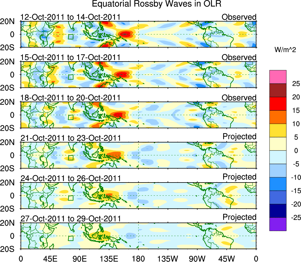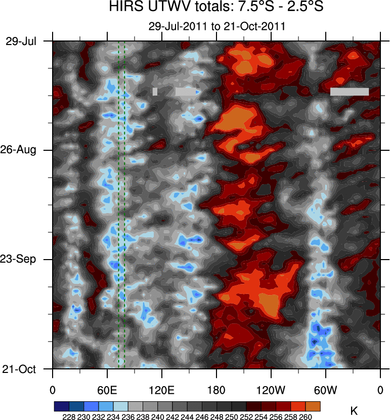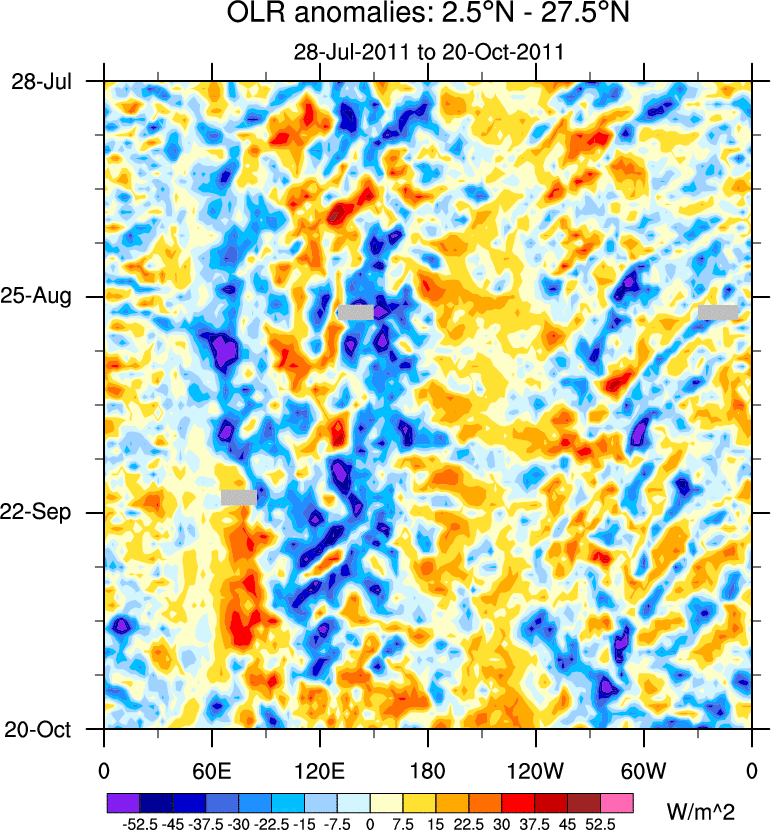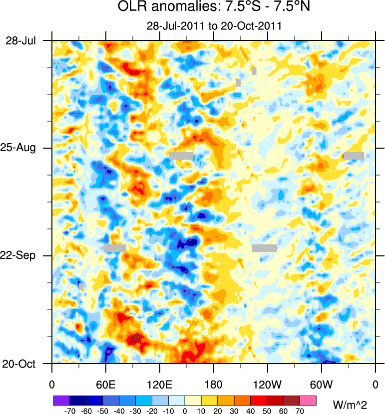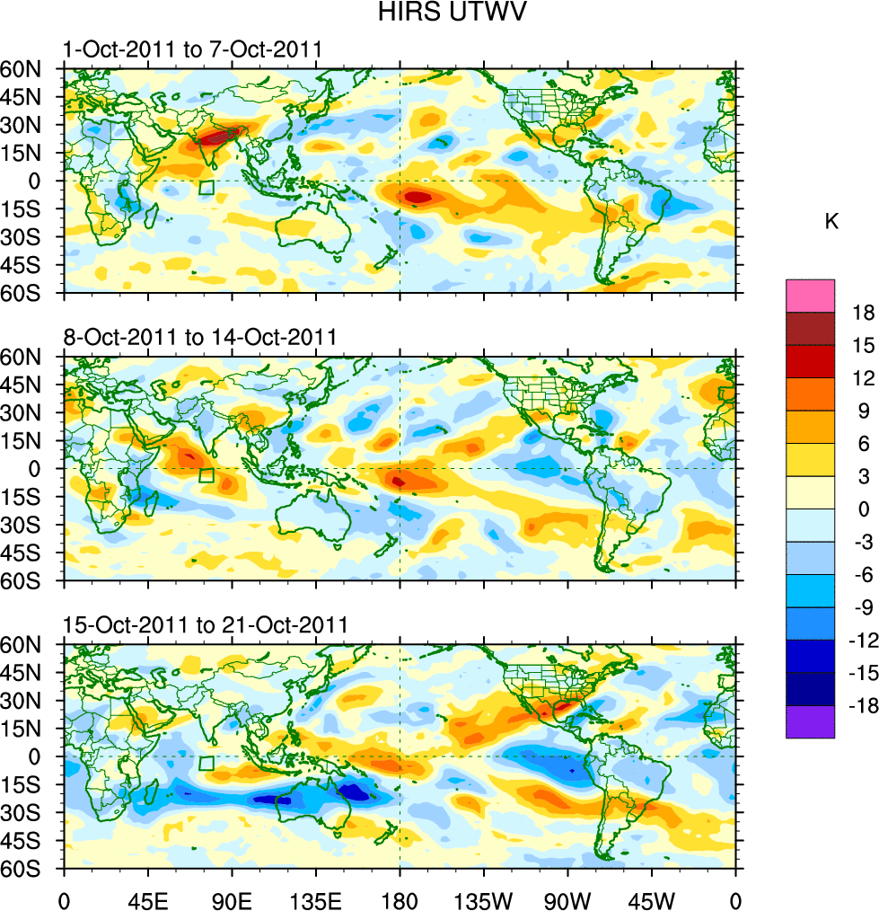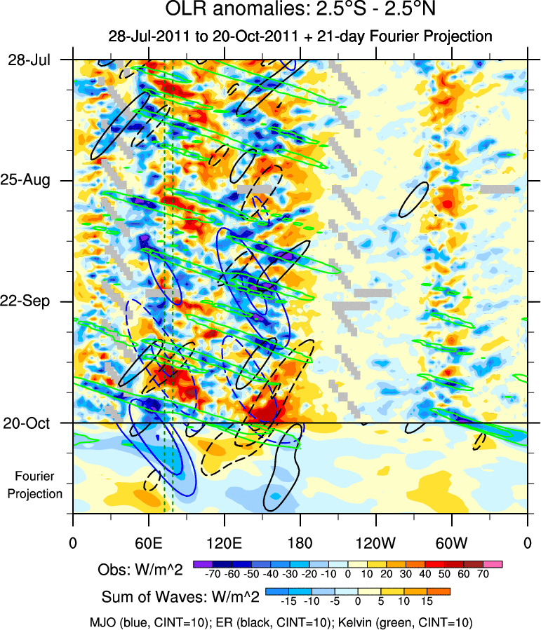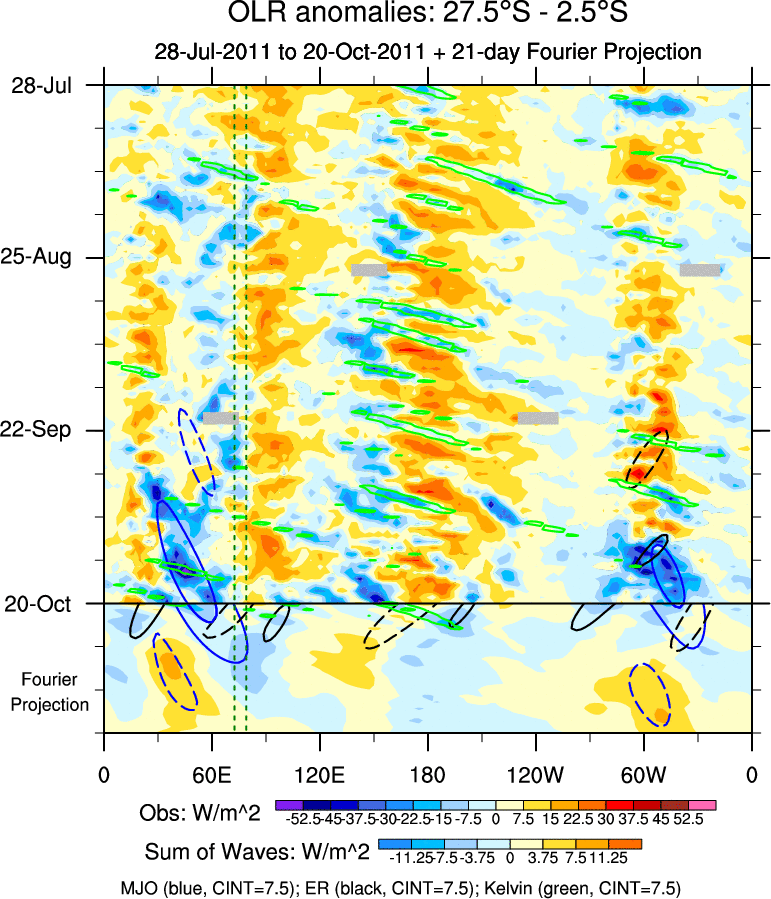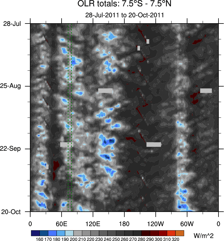 To identify tropical waves in near real-time, the OLR and UTWV data are filtered following Wheeler & Weickmann (2001 MWR). The daily anomalies are calculated using the first 3 harmonics of the seasonal cycle for 1979–2009. Missing values are then filled using linear interpolation in space and time. The most recent 365 days of anomalies are padded with 659 days of zeroes, and the result is filtered for each wave type.