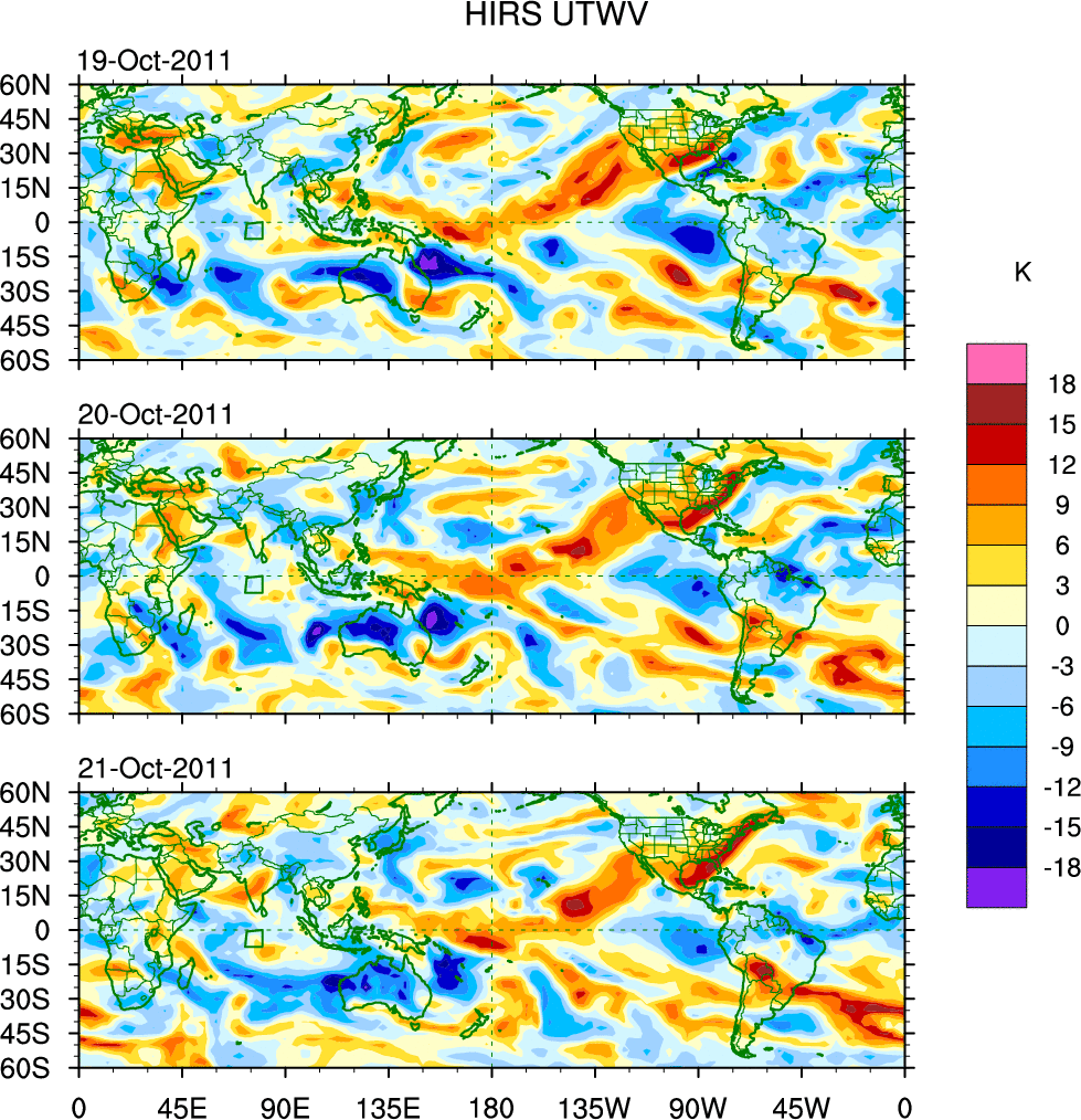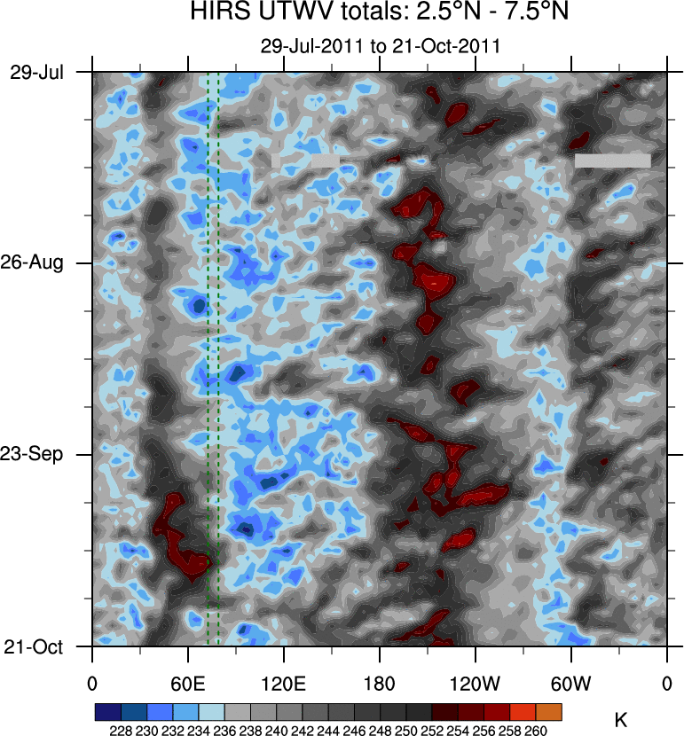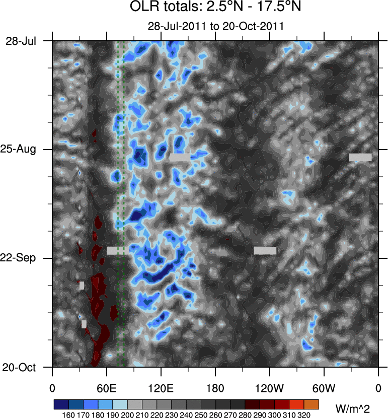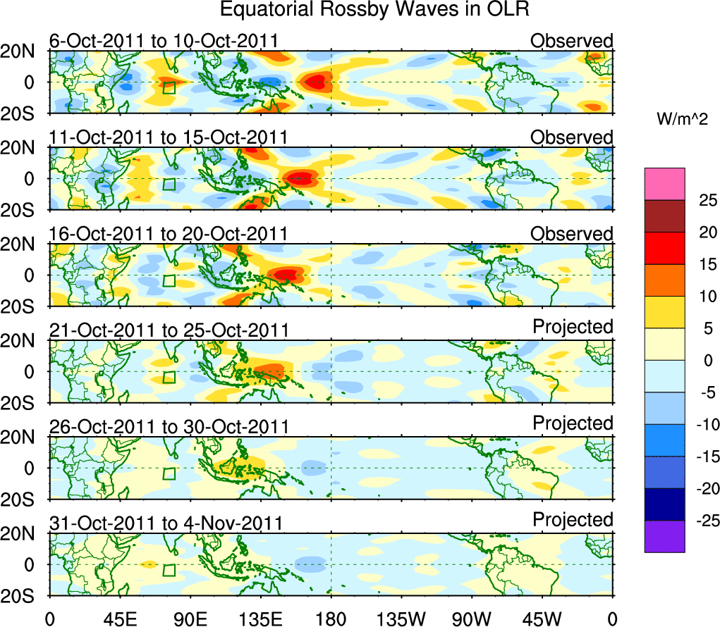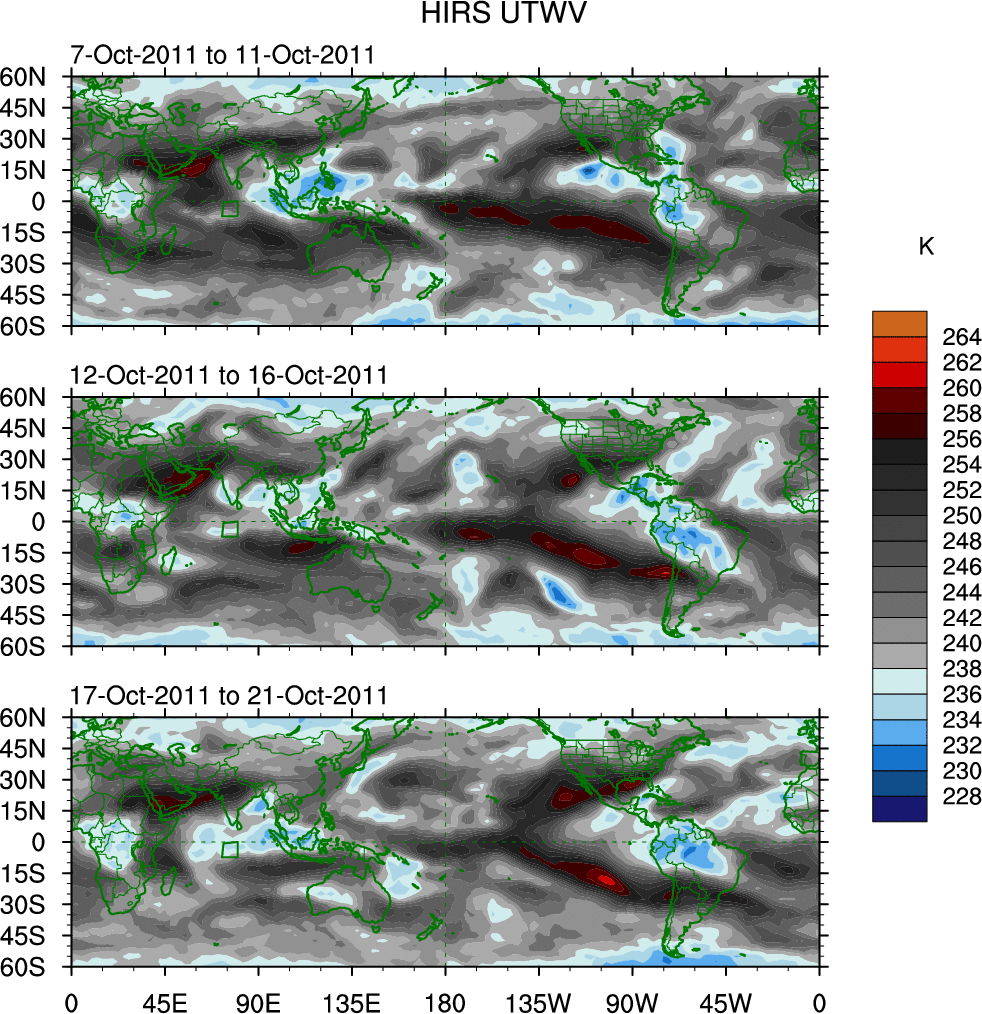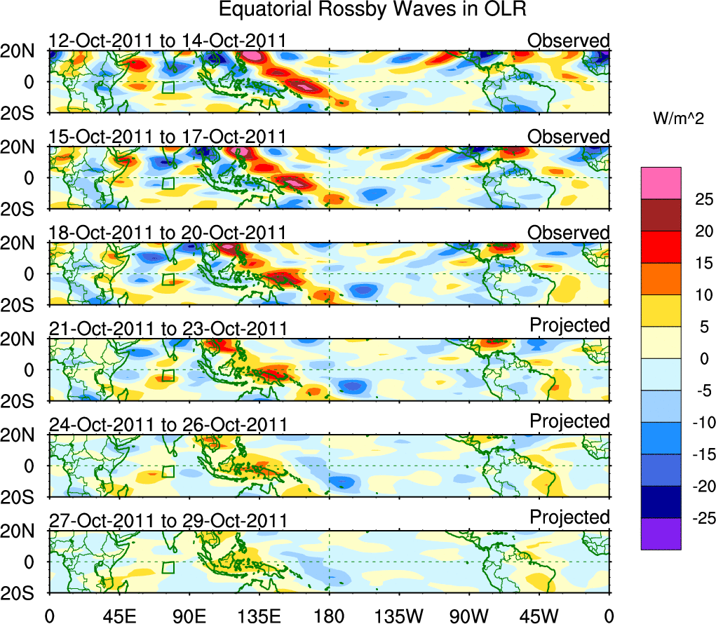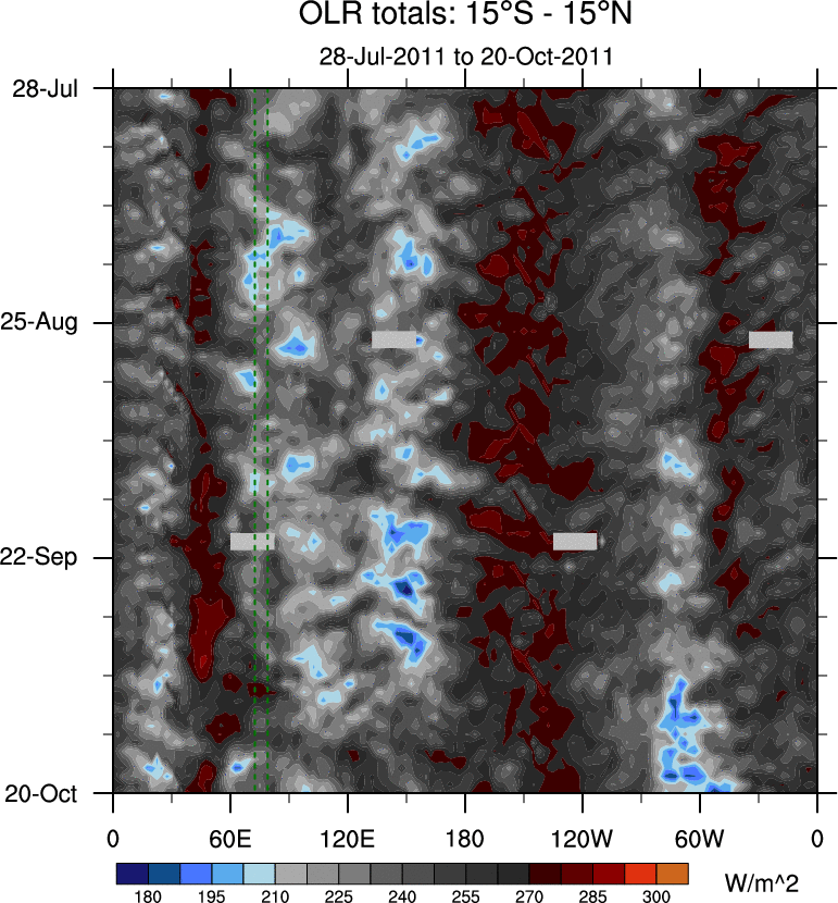 To identify tropical waves in near real-time, the OLR and UTWV data are filtered following Wheeler & Weickmann (2001 MWR). The daily anomalies are calculated using the first 3 harmonics of the seasonal cycle for 1979–2009. Missing values are then filled using linear interpolation in space and time. The most recent 365 days of anomalies are padded with 659 days of zeroes, and the result is filtered for each wave type.