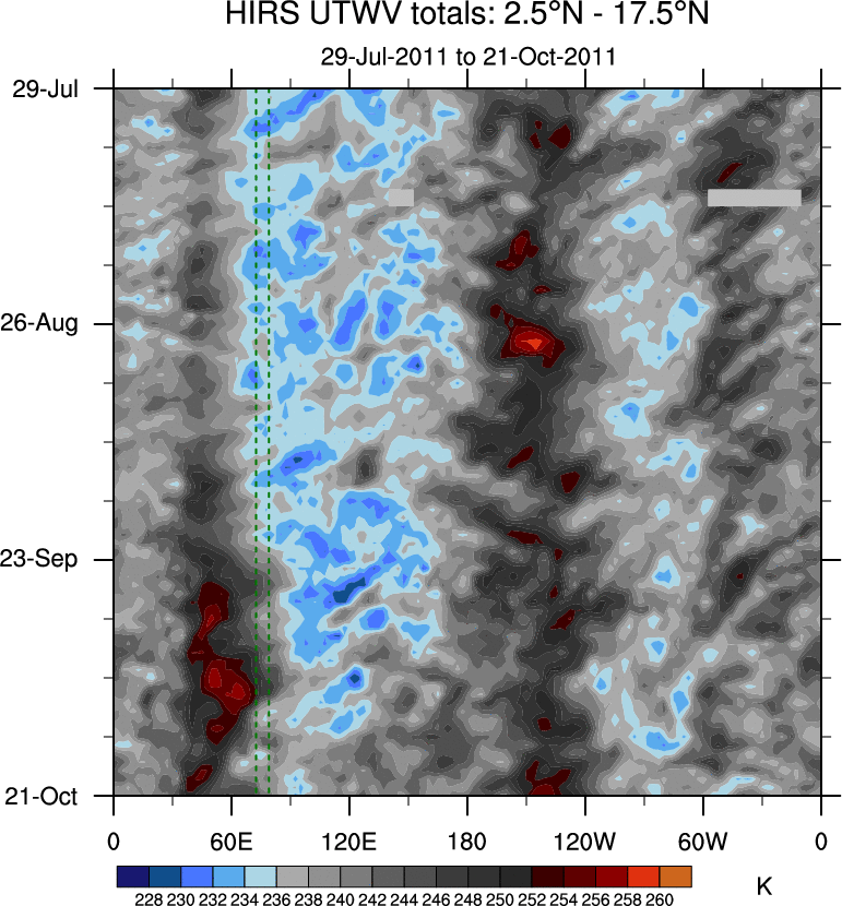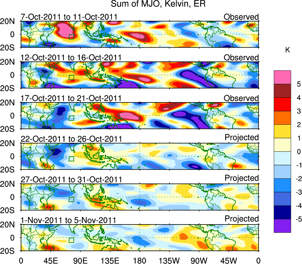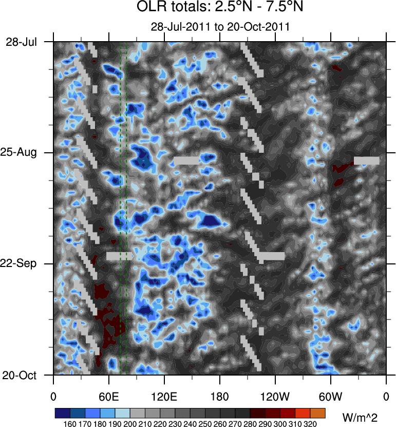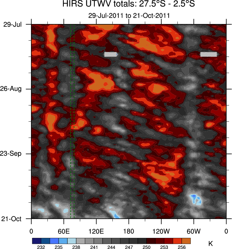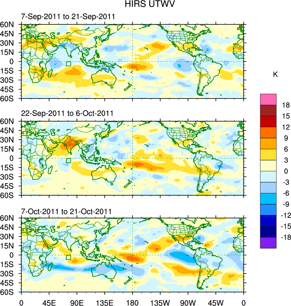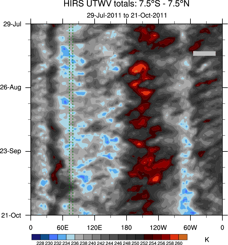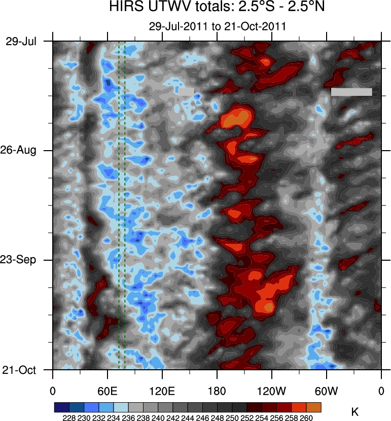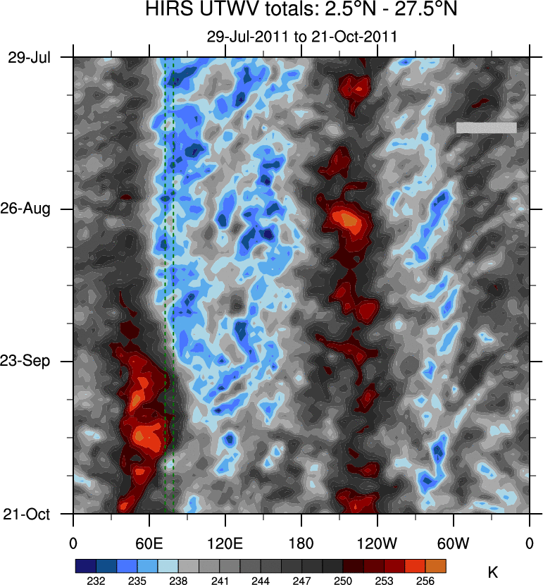 To identify tropical waves in near real-time, the OLR and UTWV data are filtered following Wheeler & Weickmann (2001 MWR). The daily anomalies are calculated using the first 3 harmonics of the seasonal cycle for 1979–2009. Missing values are then filled using linear interpolation in space and time. The most recent 365 days of anomalies are padded with 659 days of zeroes, and the result is filtered for each wave type.