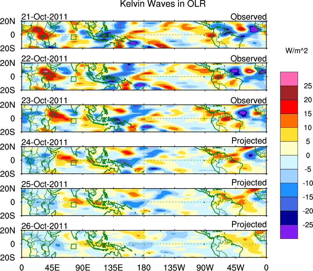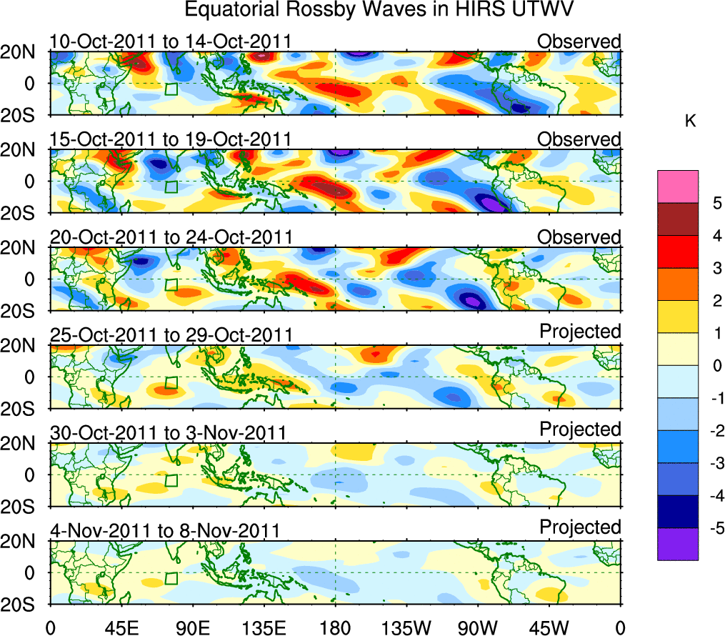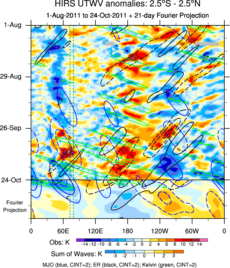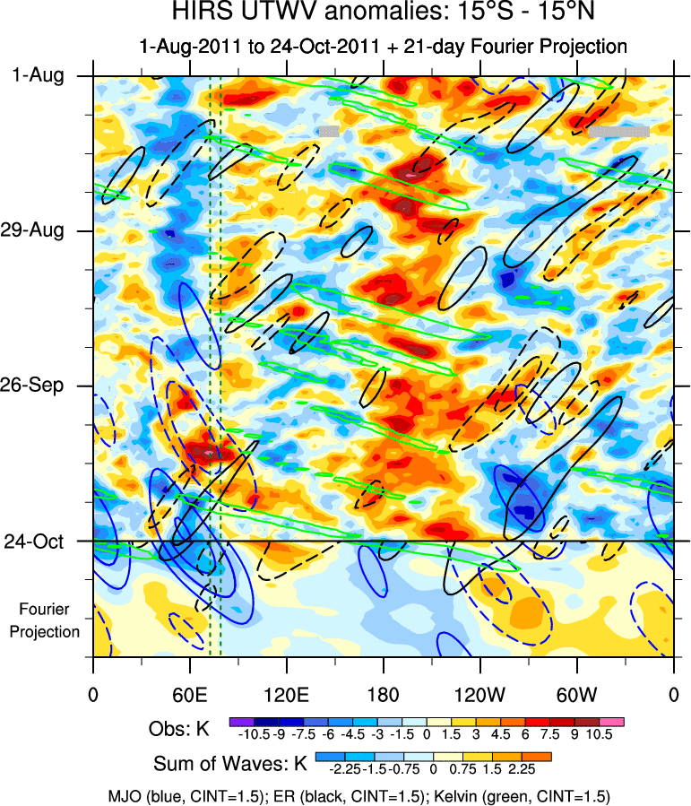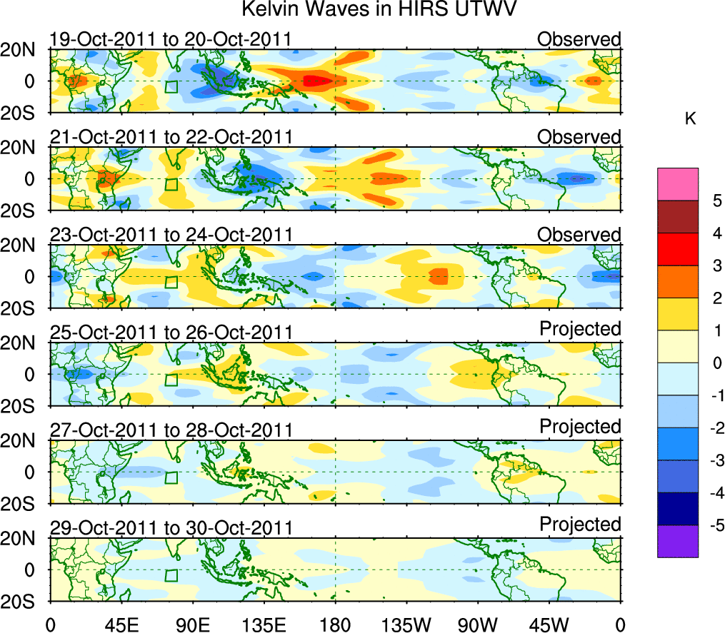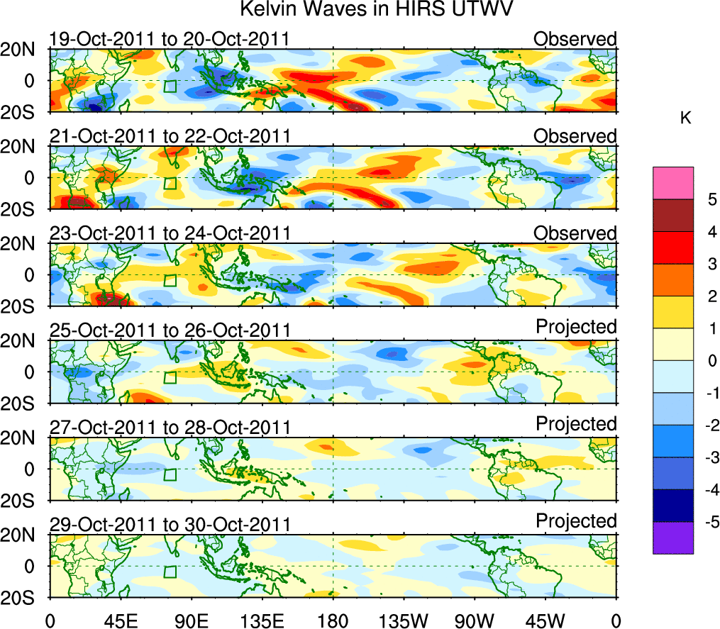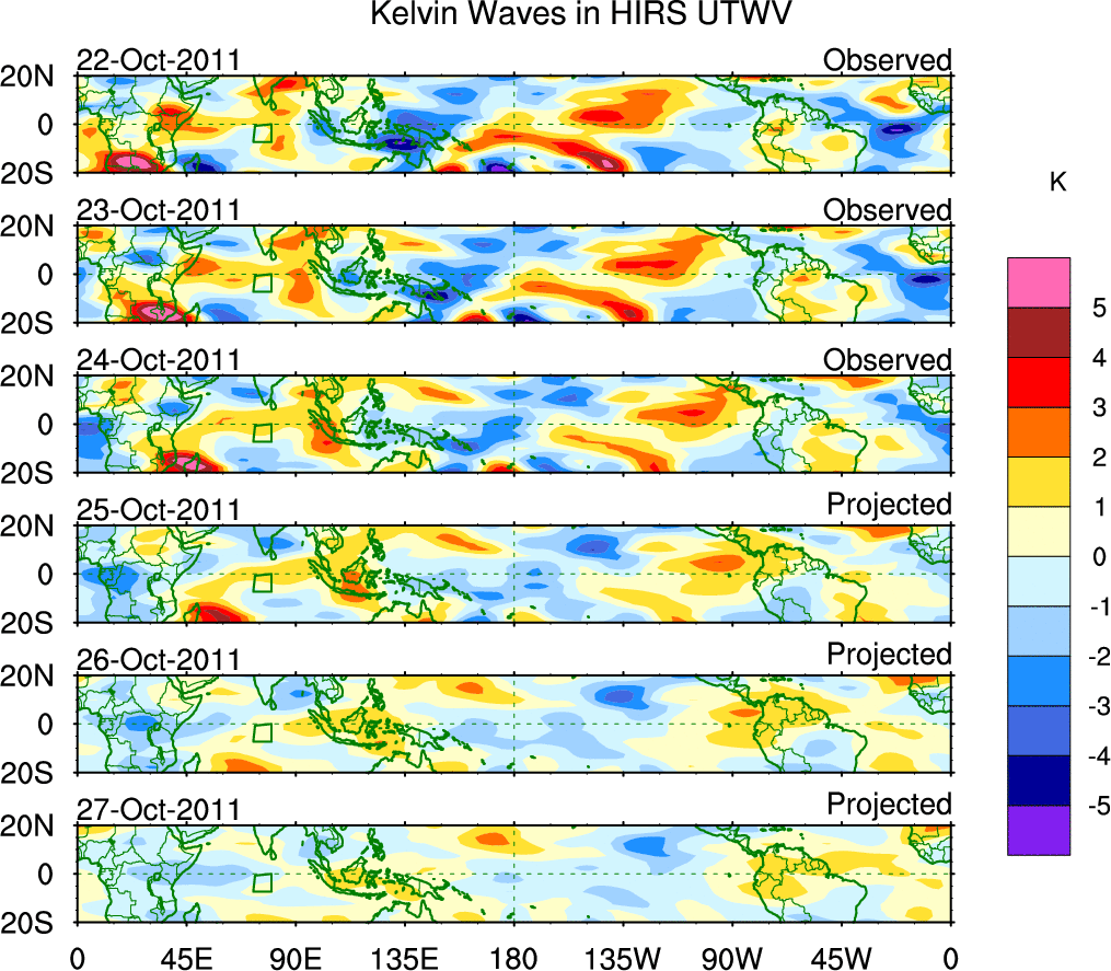 To identify tropical waves in near real-time, the OLR and UTWV data are filtered following Wheeler & Weickmann (2001 MWR). The daily anomalies are calculated using the first 3 harmonics of the seasonal cycle for 1979–2009. Missing values are then filled using linear interpolation in space and time. The most recent 365 days of anomalies are padded with 659 days of zeroes, and the result is filtered for each wave type.
