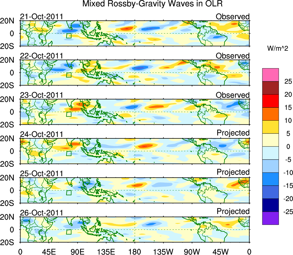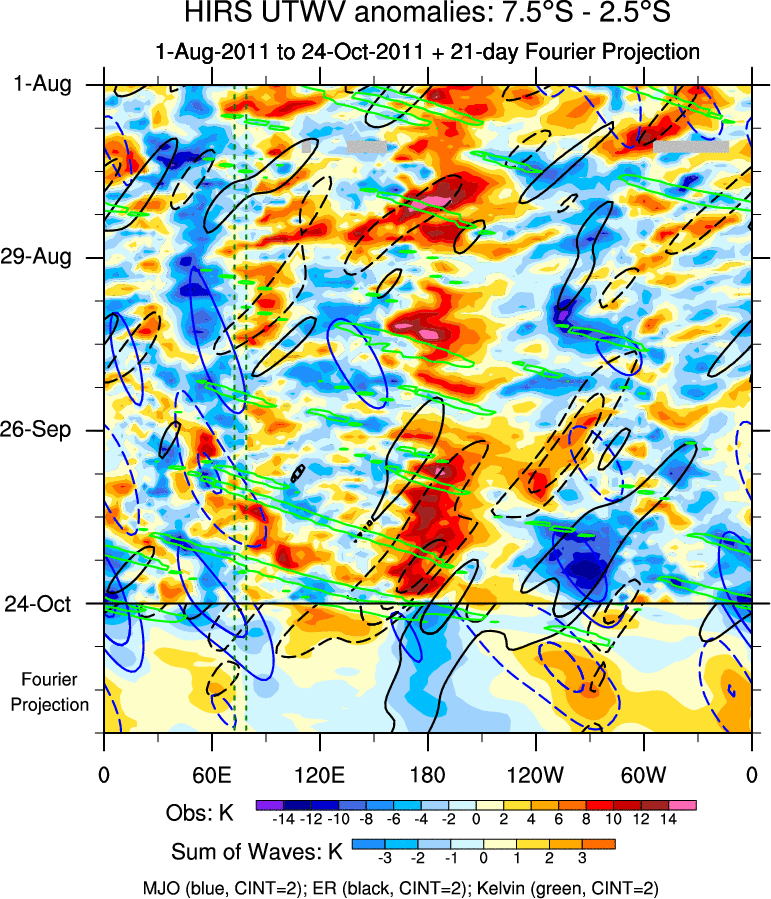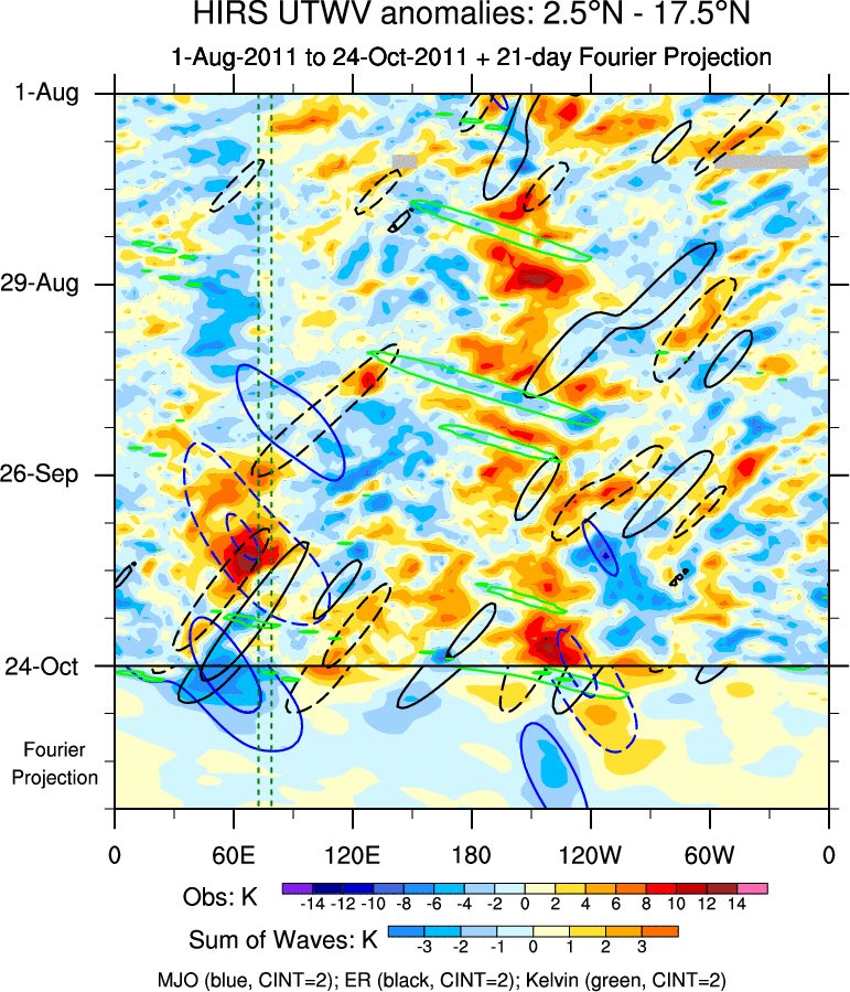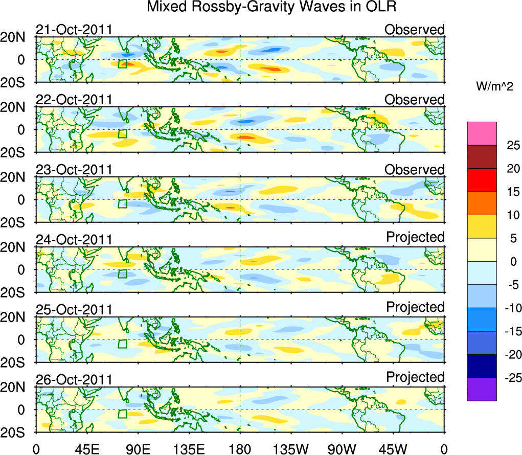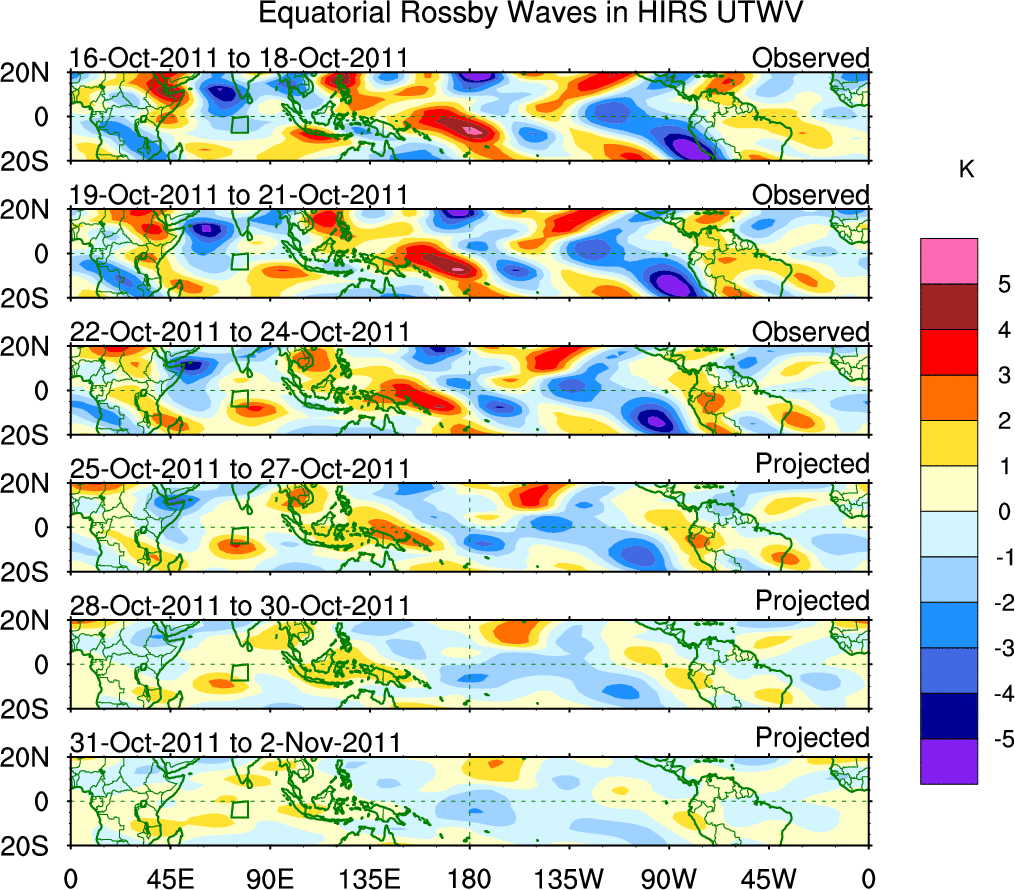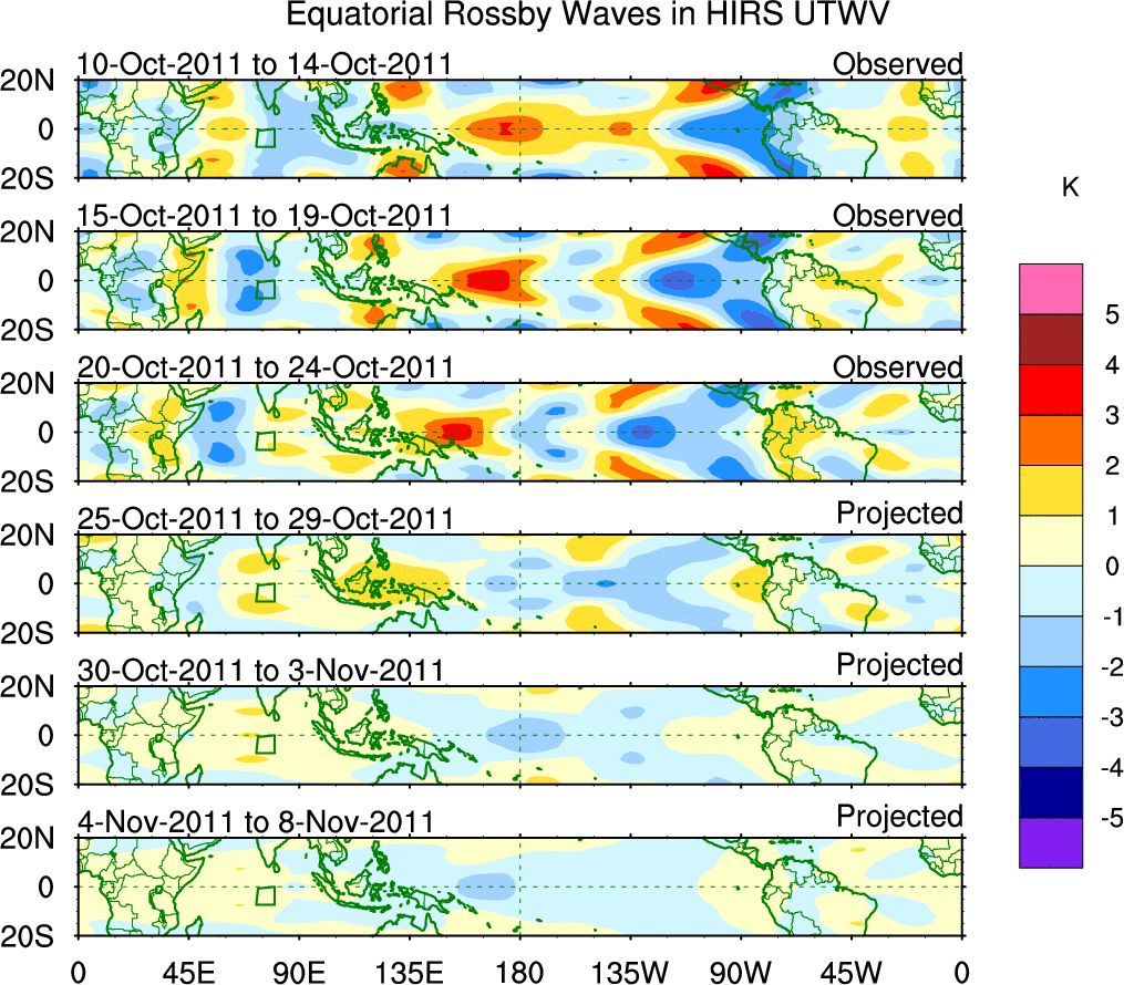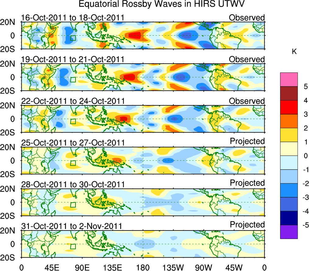 To identify tropical waves in near real-time, the OLR and UTWV data are filtered following Wheeler & Weickmann (2001 MWR). The daily anomalies are calculated using the first 3 harmonics of the seasonal cycle for 1979–2009. Missing values are then filled using linear interpolation in space and time. The most recent 365 days of anomalies are padded with 659 days of zeroes, and the result is filtered for each wave type.