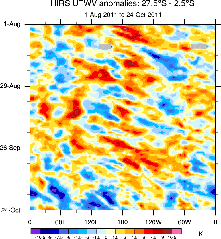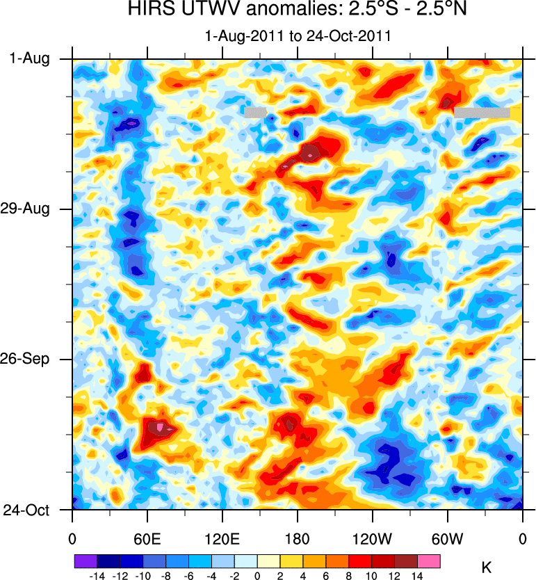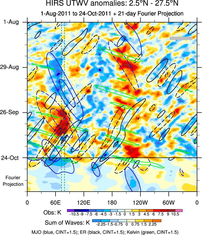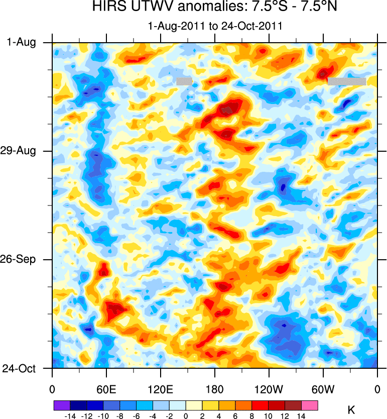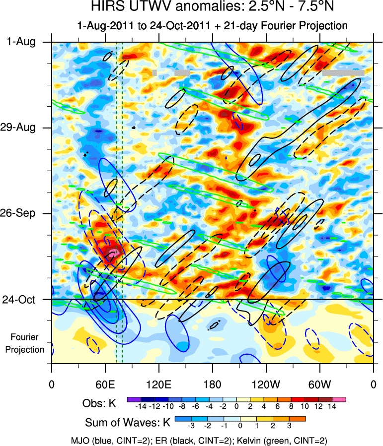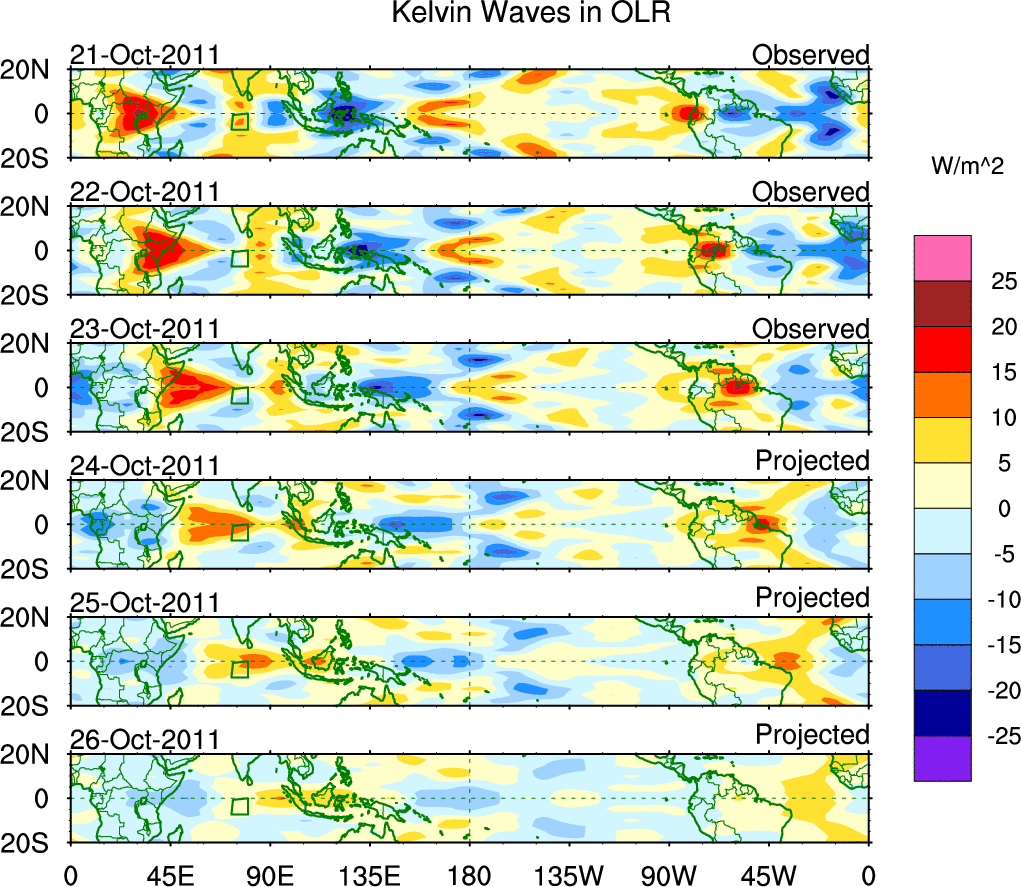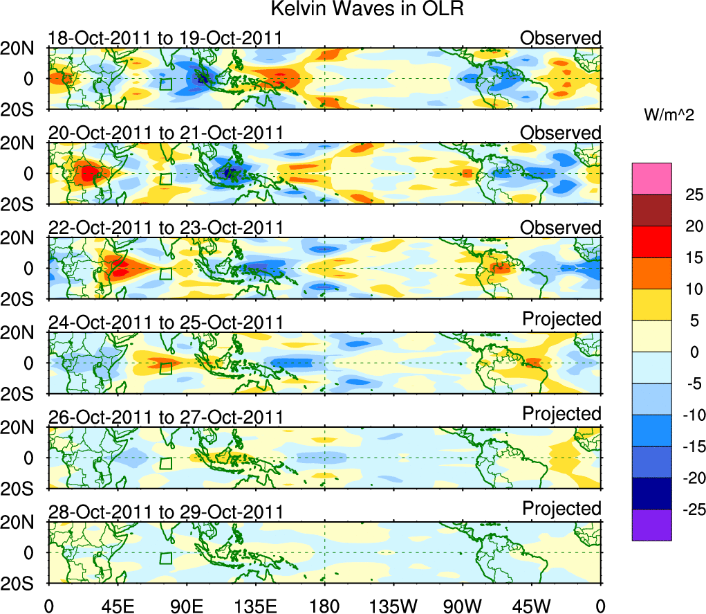 To identify tropical waves in near real-time, the OLR and UTWV data are filtered following Wheeler & Weickmann (2001 MWR). The daily anomalies are calculated using the first 3 harmonics of the seasonal cycle for 1979–2009. Missing values are then filled using linear interpolation in space and time. The most recent 365 days of anomalies are padded with 659 days of zeroes, and the result is filtered for each wave type.