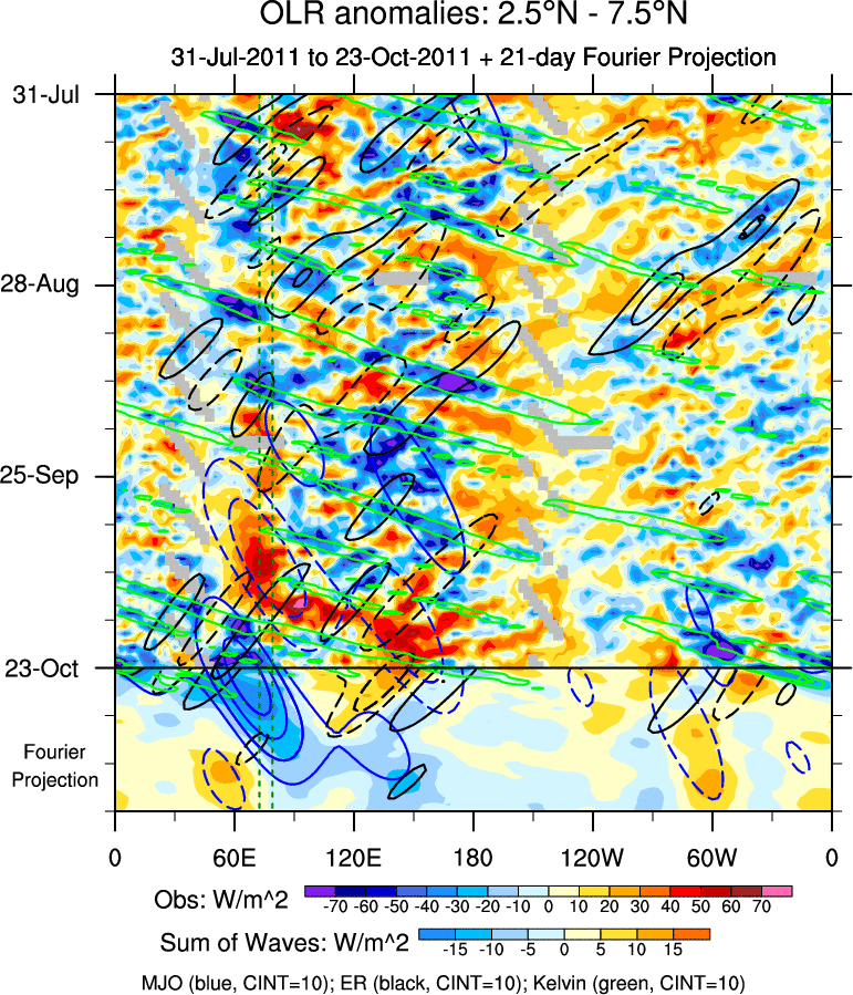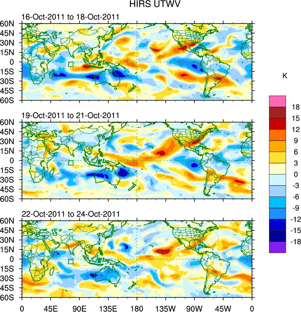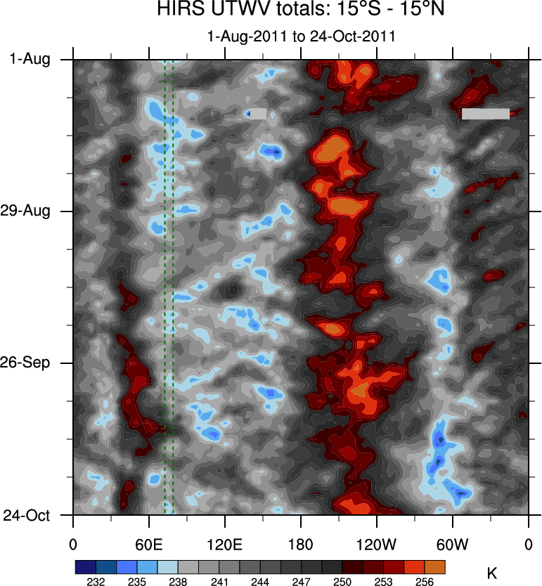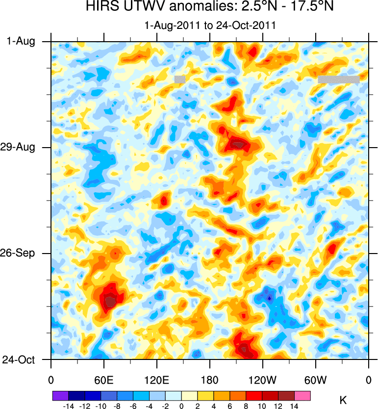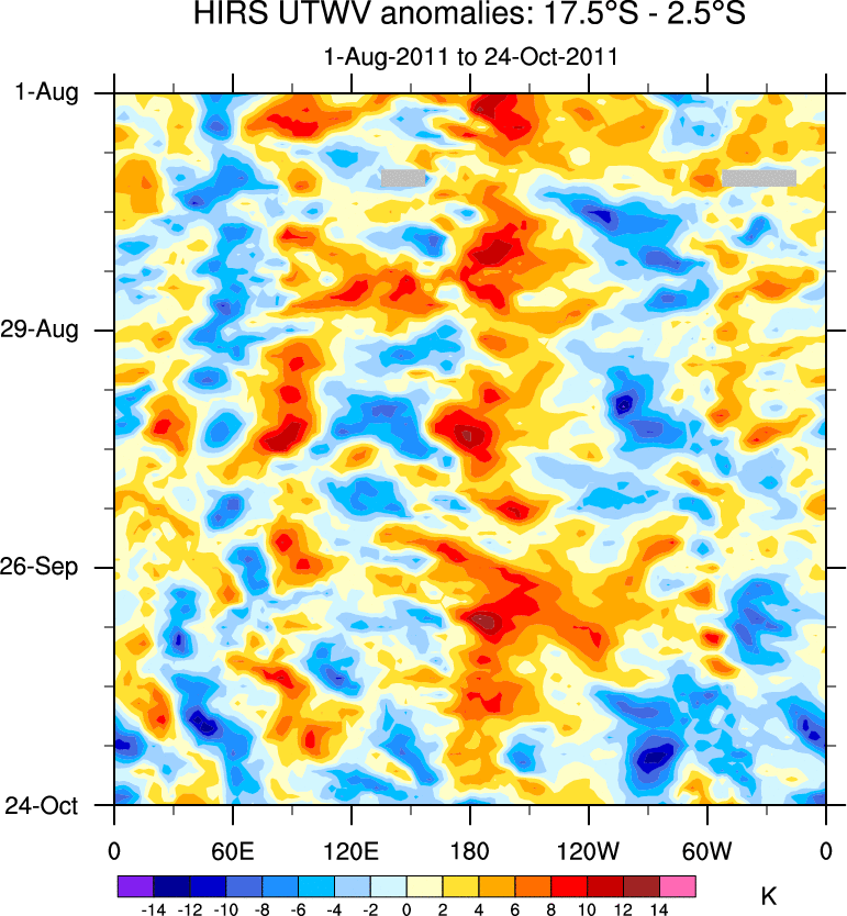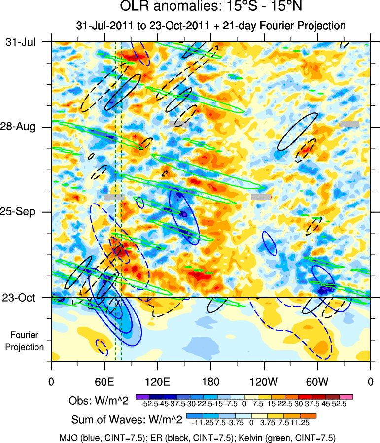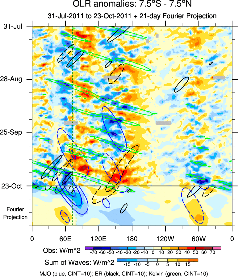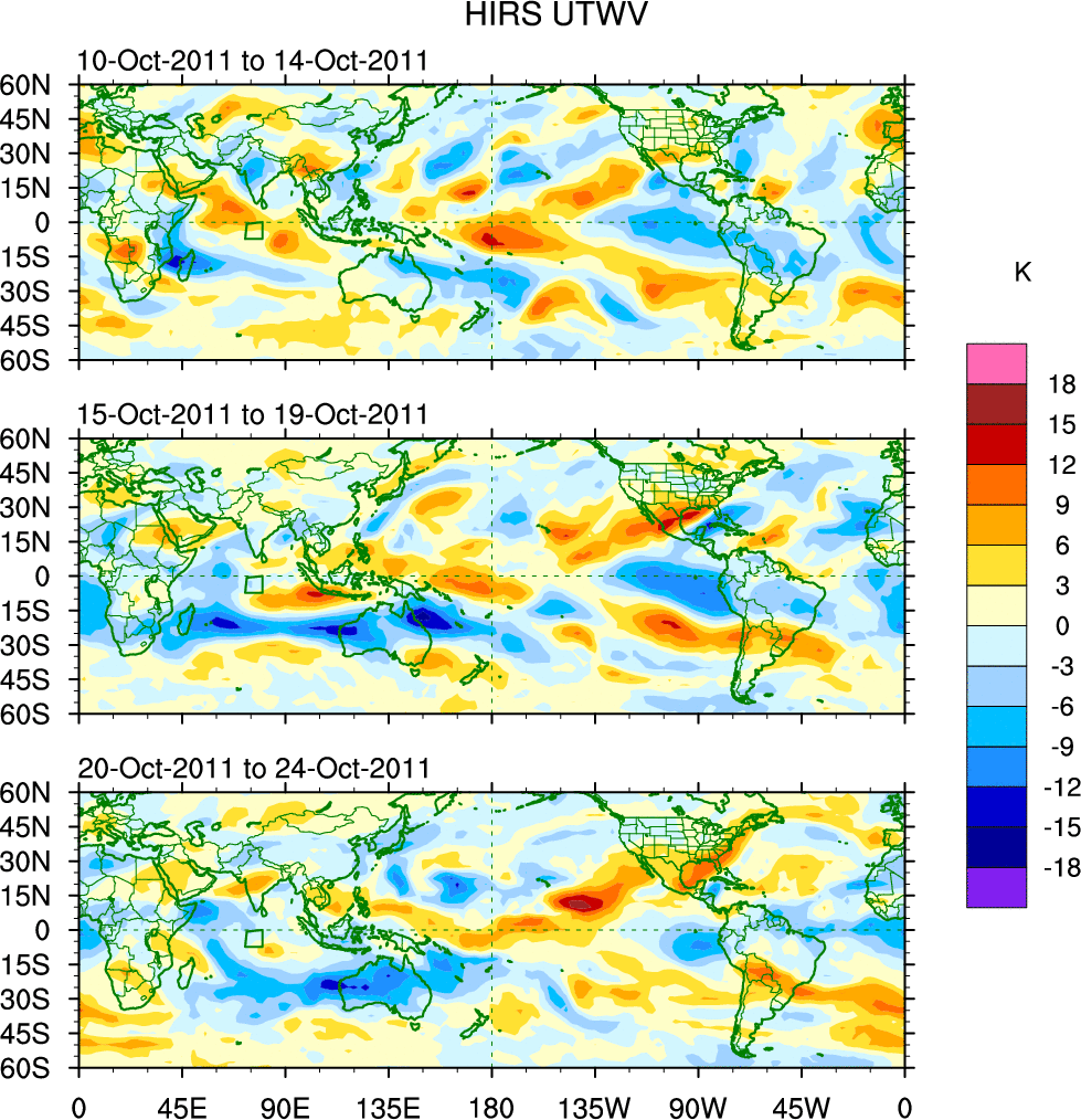 To identify tropical waves in near real-time, the OLR and UTWV data are filtered following Wheeler & Weickmann (2001 MWR). The daily anomalies are calculated using the first 3 harmonics of the seasonal cycle for 1979–2009. Missing values are then filled using linear interpolation in space and time. The most recent 365 days of anomalies are padded with 659 days of zeroes, and the result is filtered for each wave type.