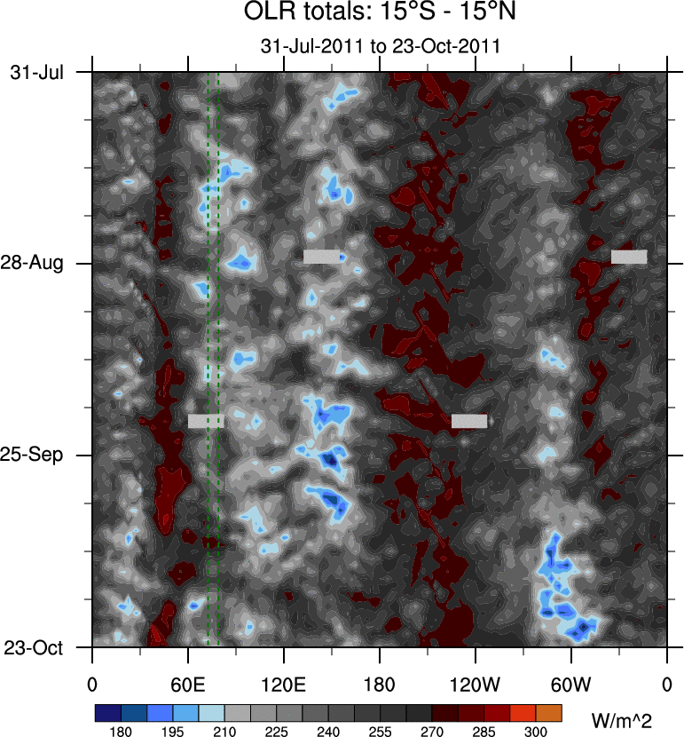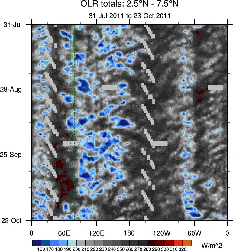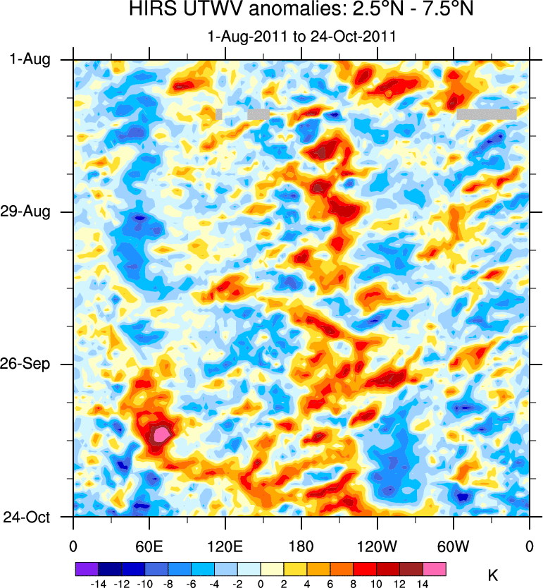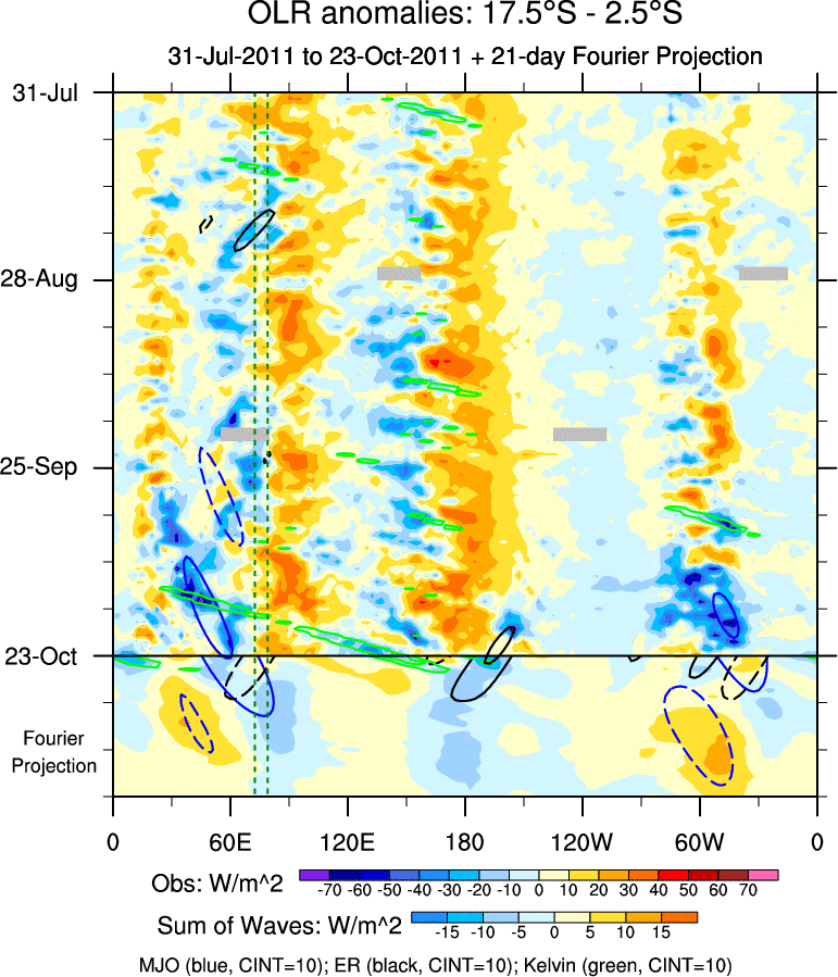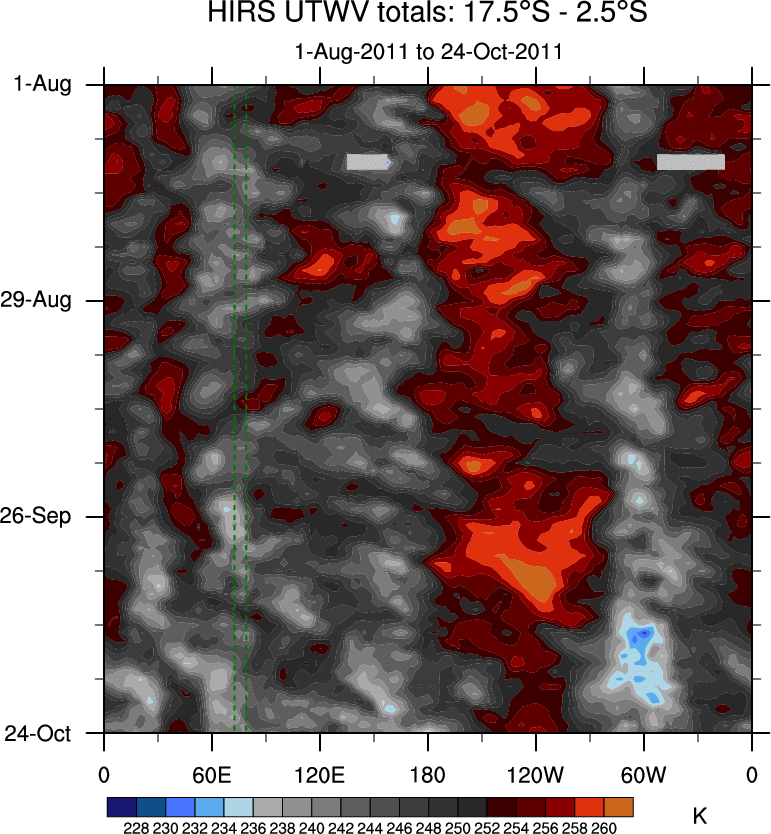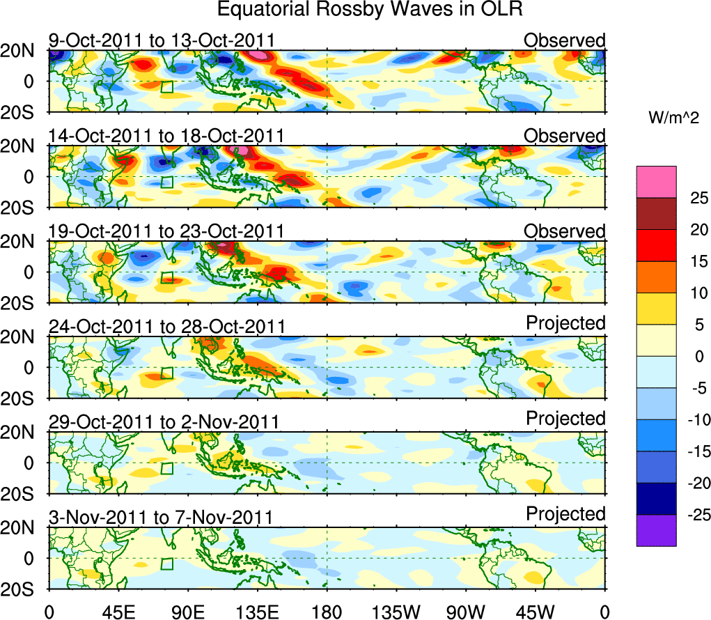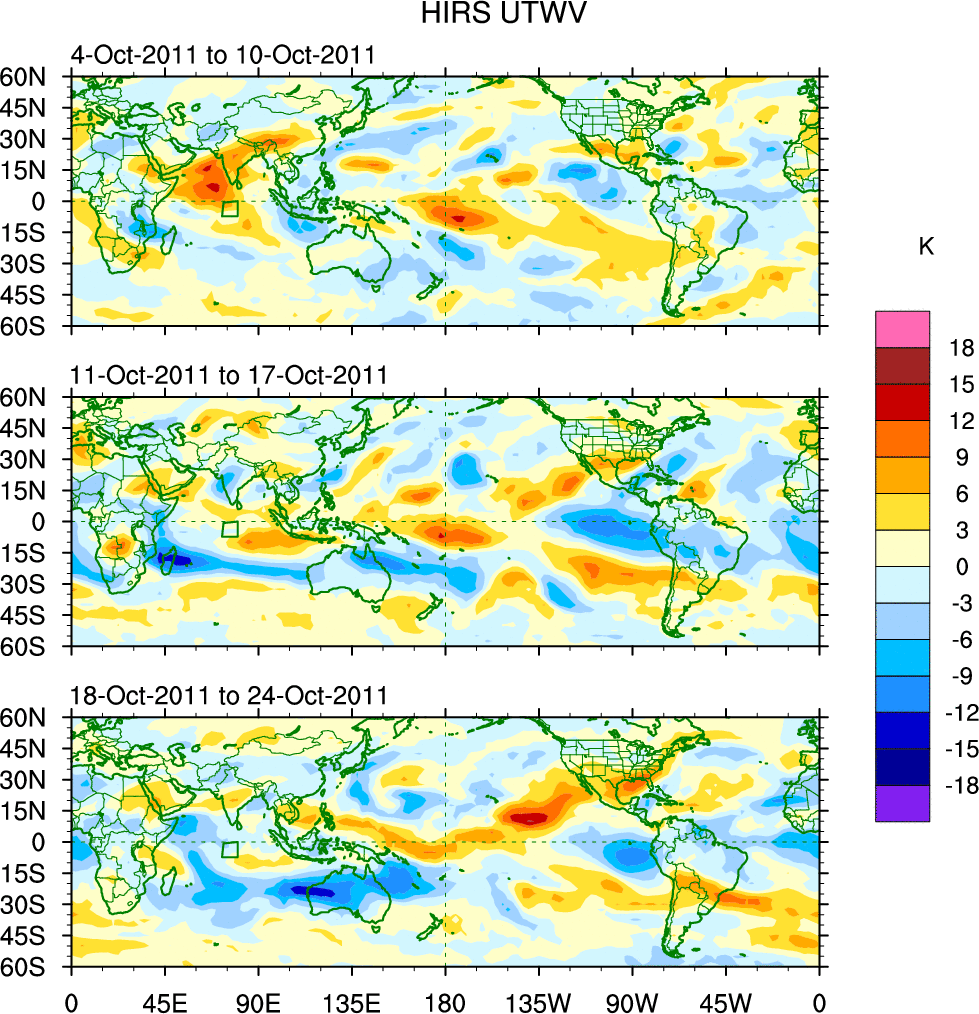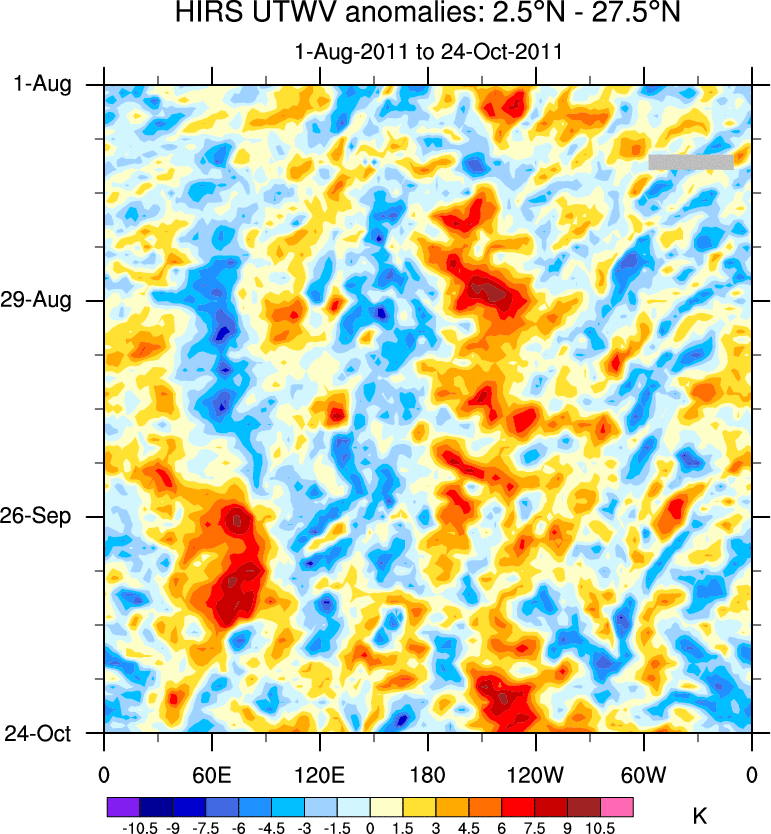 To identify tropical waves in near real-time, the OLR and UTWV data are filtered following Wheeler & Weickmann (2001 MWR). The daily anomalies are calculated using the first 3 harmonics of the seasonal cycle for 1979–2009. Missing values are then filled using linear interpolation in space and time. The most recent 365 days of anomalies are padded with 659 days of zeroes, and the result is filtered for each wave type.