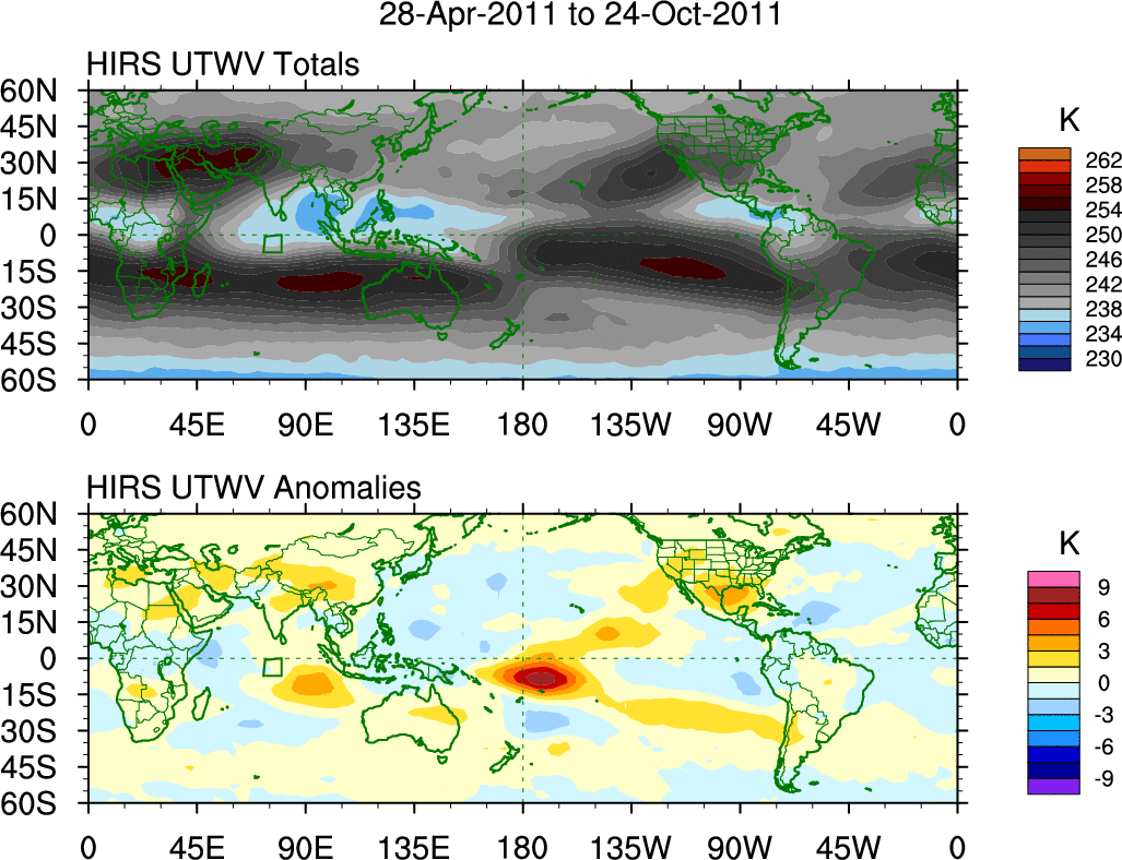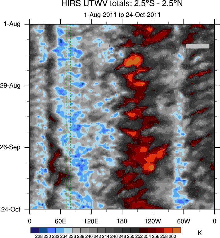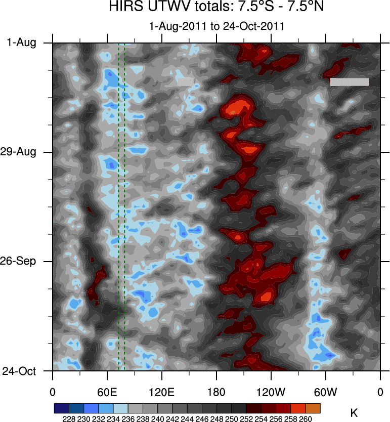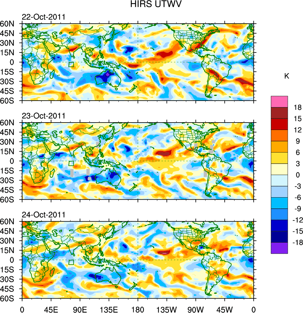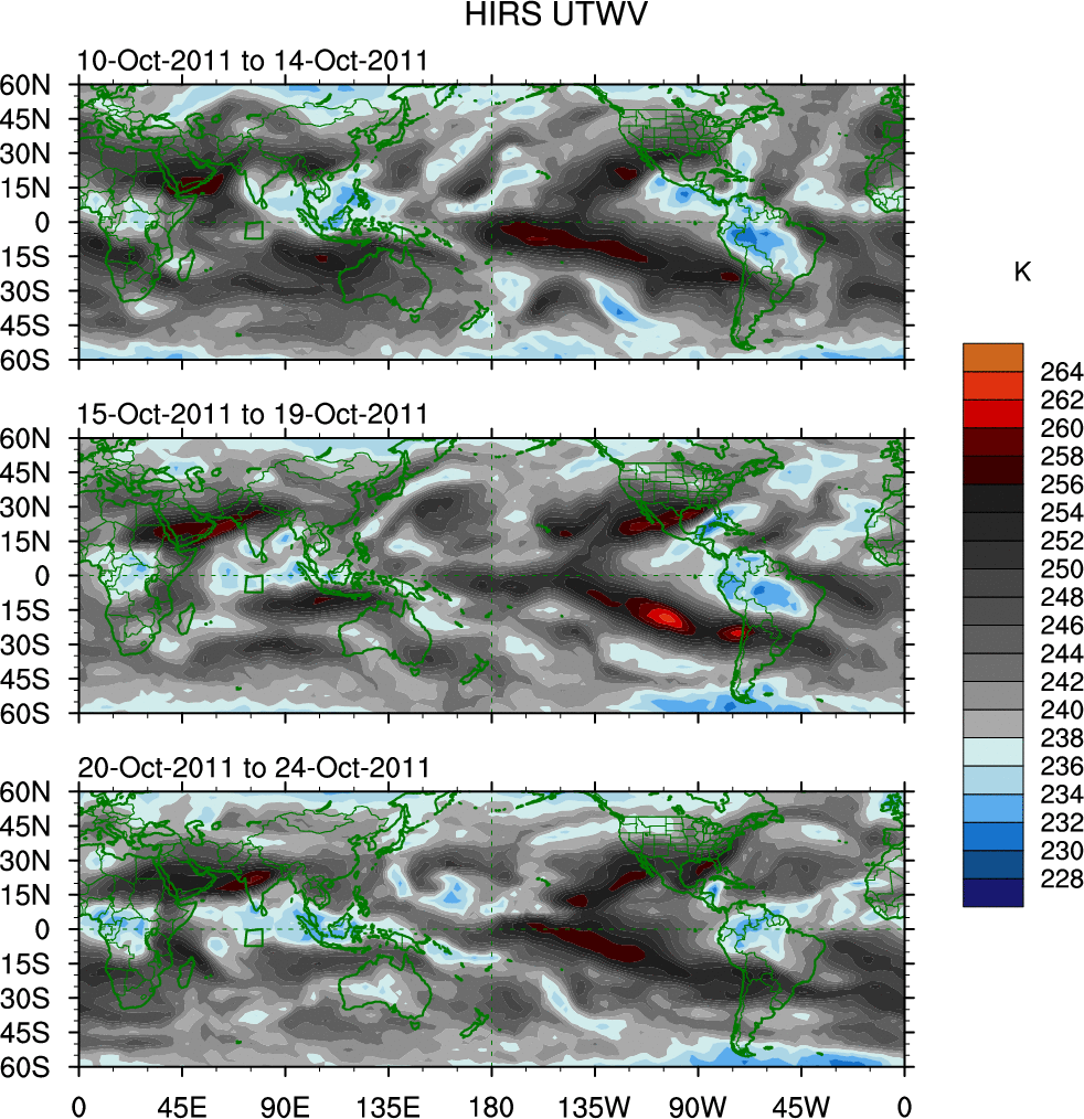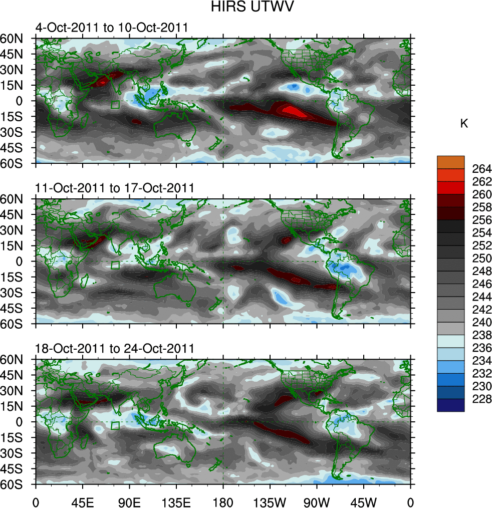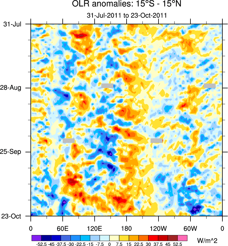 To identify tropical waves in near real-time, the OLR and UTWV data are filtered following Wheeler & Weickmann (2001 MWR). The daily anomalies are calculated using the first 3 harmonics of the seasonal cycle for 1979–2009. Missing values are then filled using linear interpolation in space and time. The most recent 365 days of anomalies are padded with 659 days of zeroes, and the result is filtered for each wave type.