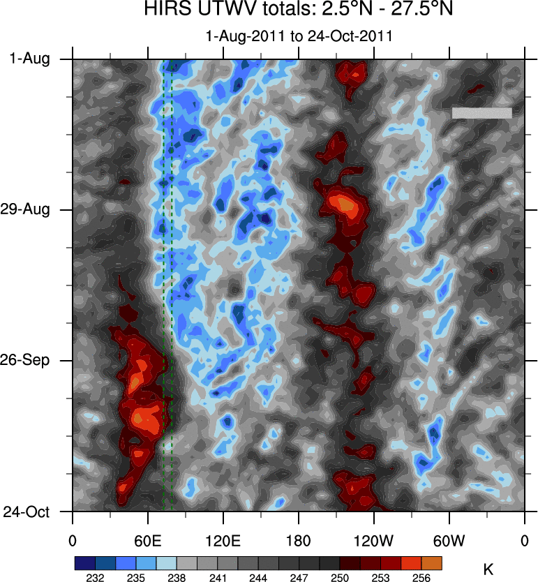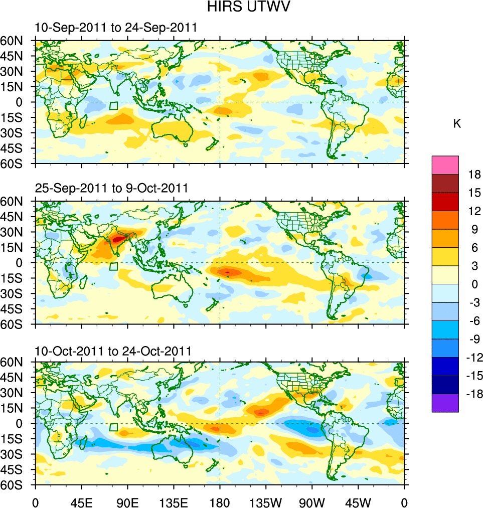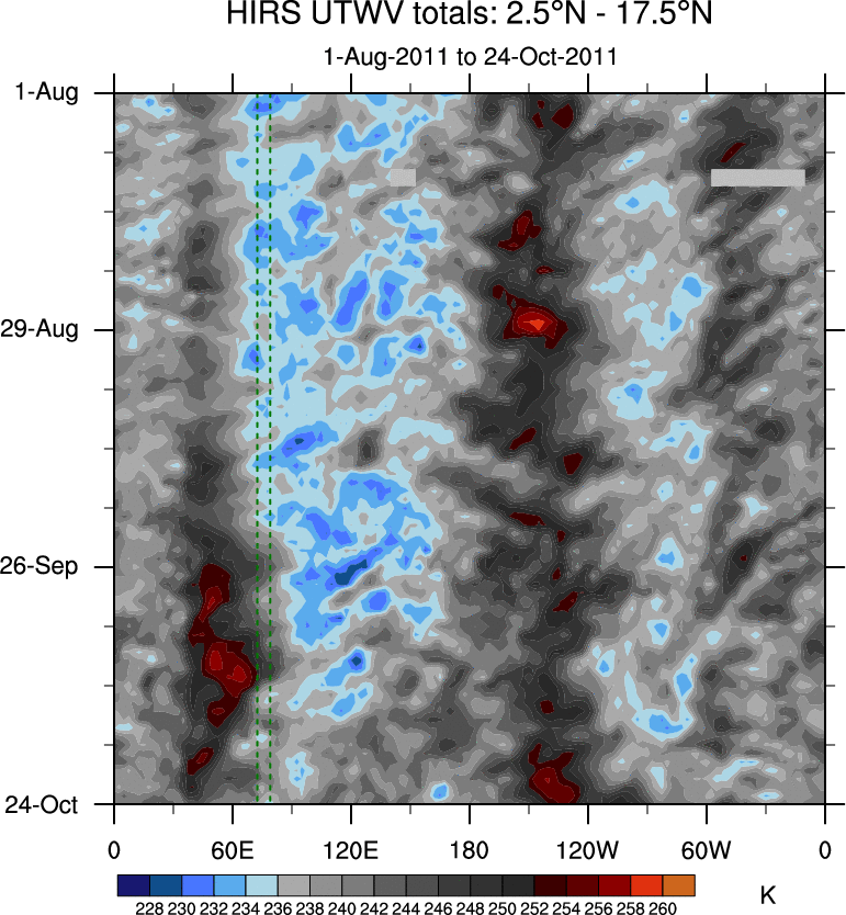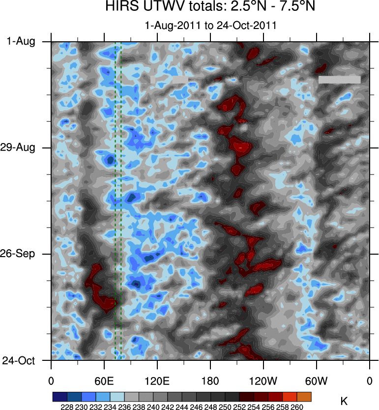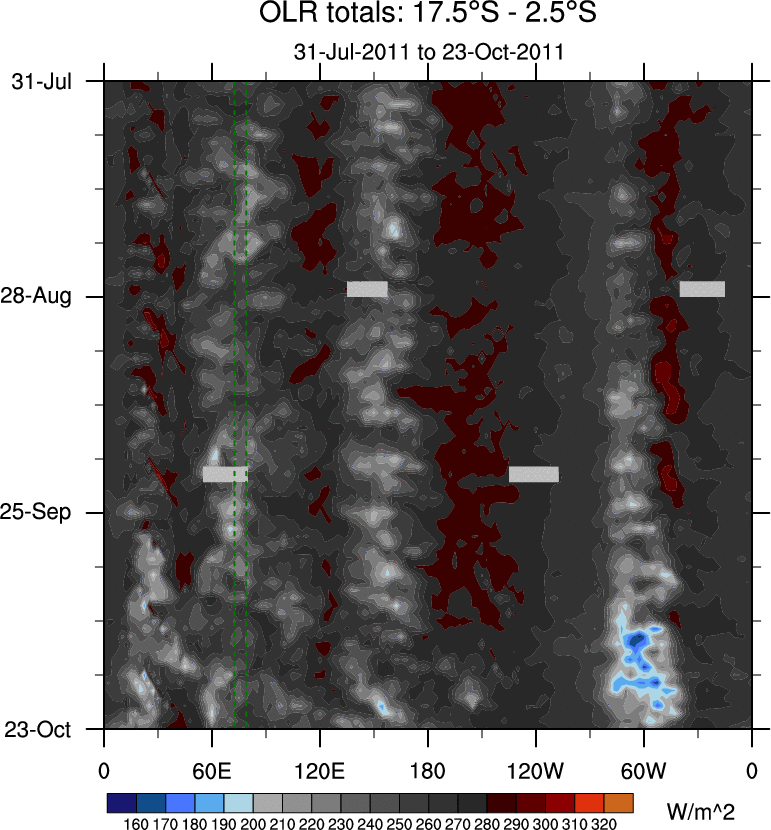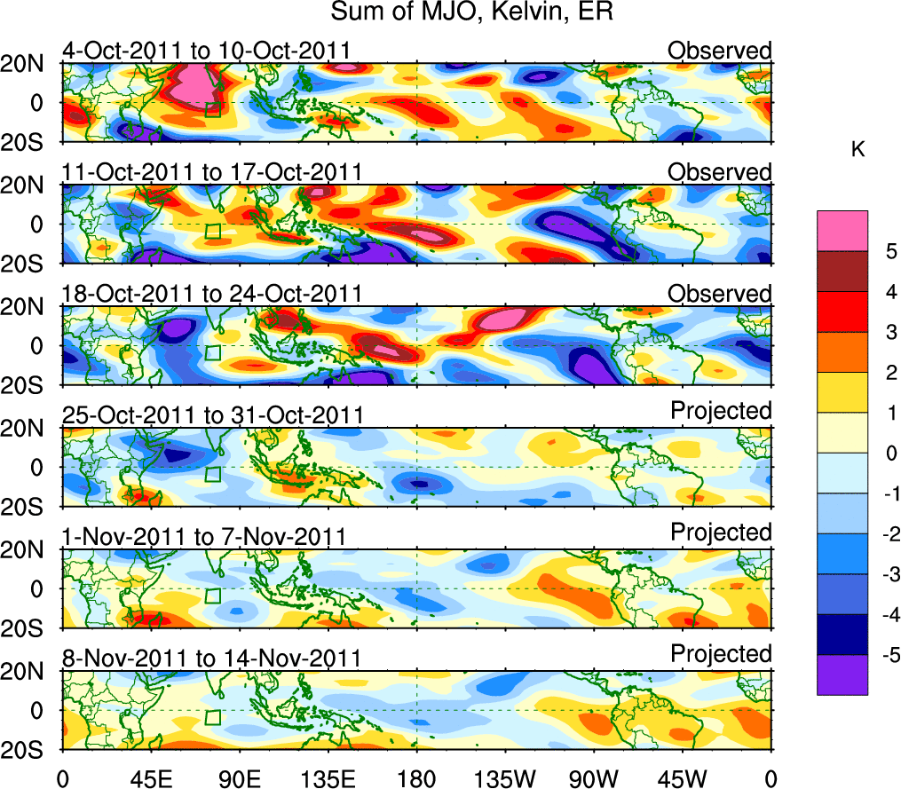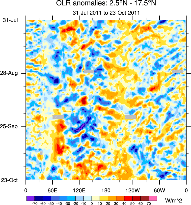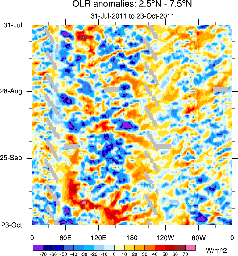 To identify tropical waves in near real-time, the OLR and UTWV data are filtered following Wheeler & Weickmann (2001 MWR). The daily anomalies are calculated using the first 3 harmonics of the seasonal cycle for 1979–2009. Missing values are then filled using linear interpolation in space and time. The most recent 365 days of anomalies are padded with 659 days of zeroes, and the result is filtered for each wave type.