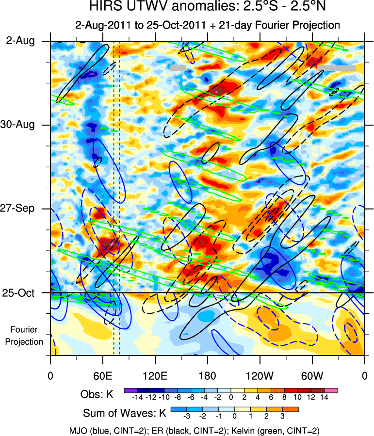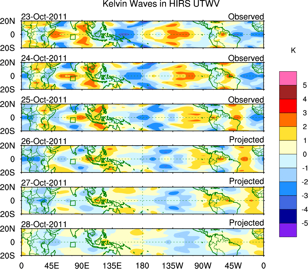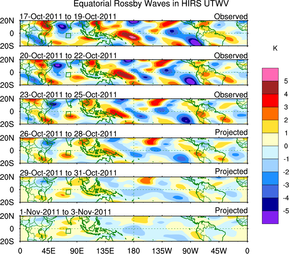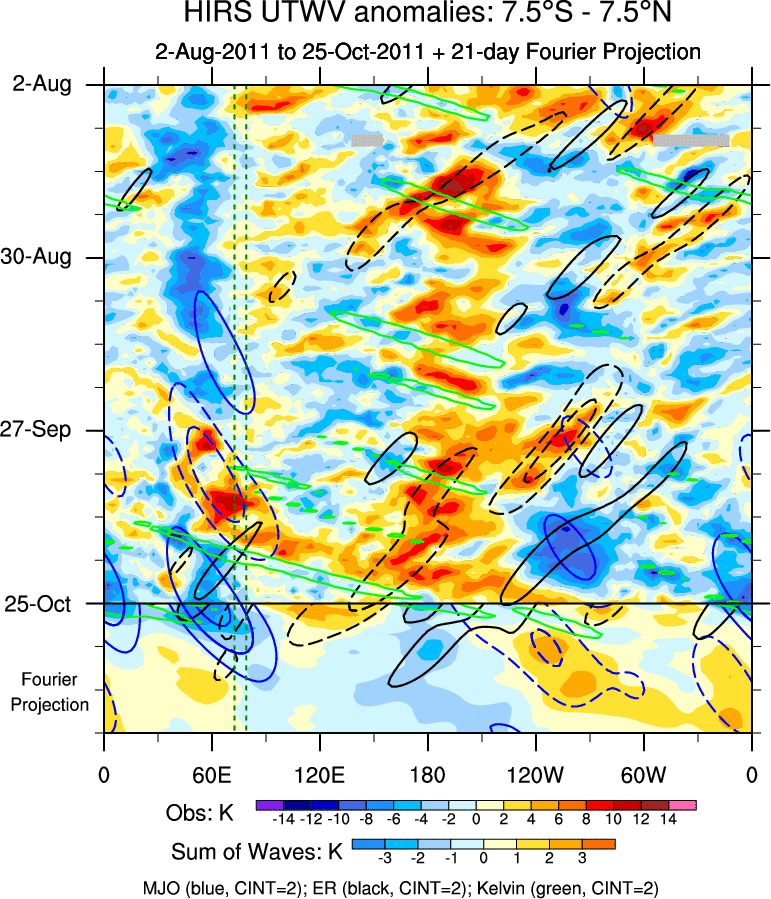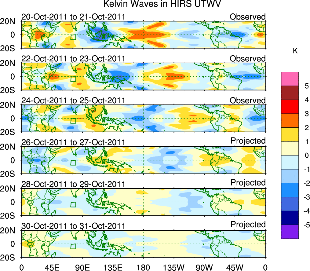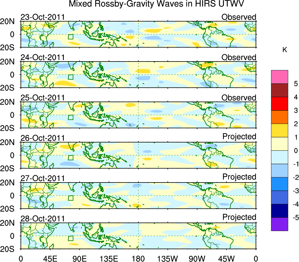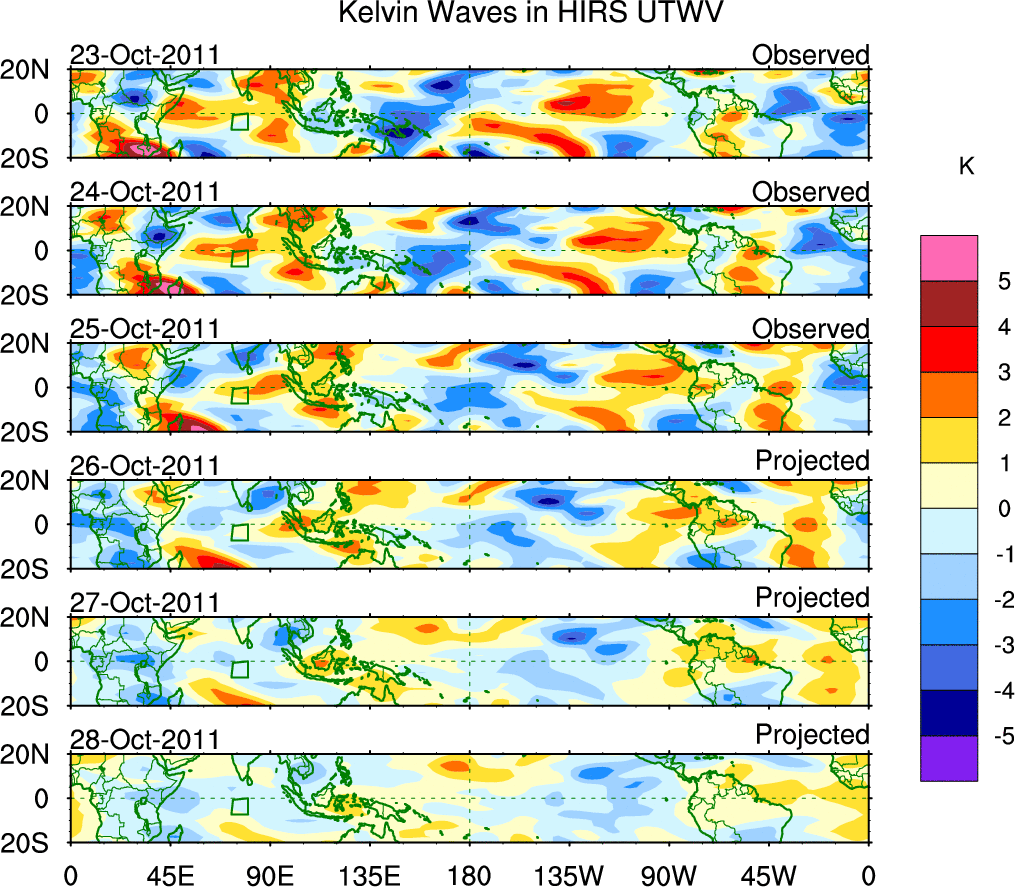 To identify tropical waves in near real-time, the OLR and UTWV data are filtered following Wheeler & Weickmann (2001 MWR). The daily anomalies are calculated using the first 3 harmonics of the seasonal cycle for 1979–2009. Missing values are then filled using linear interpolation in space and time. The most recent 365 days of anomalies are padded with 659 days of zeroes, and the result is filtered for each wave type.