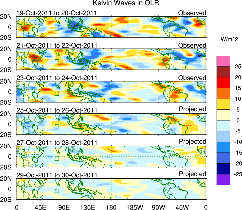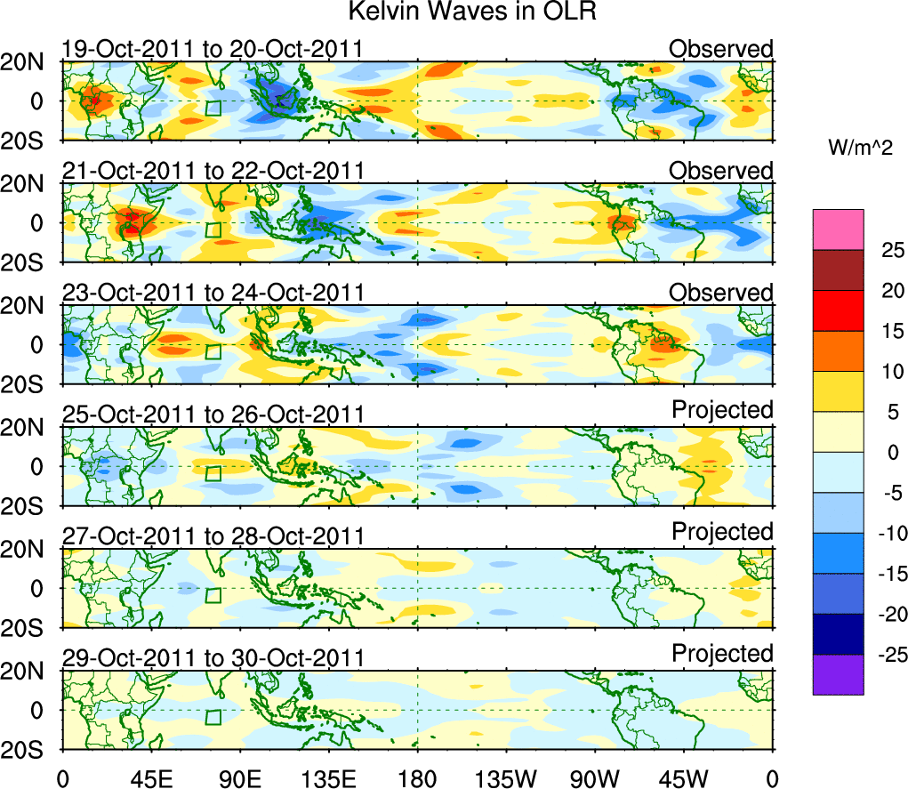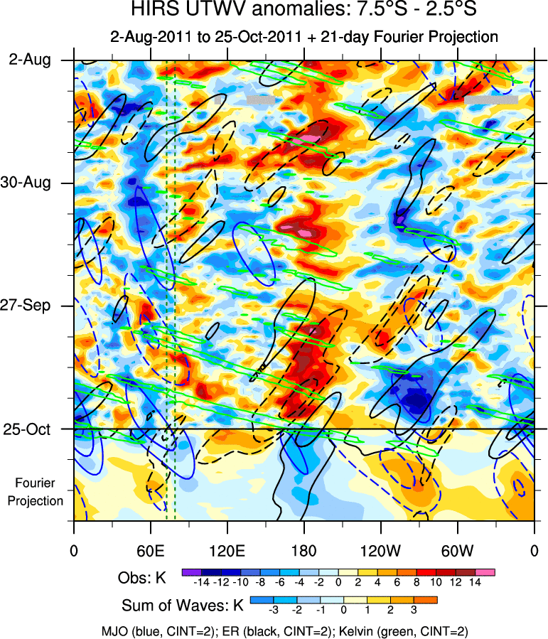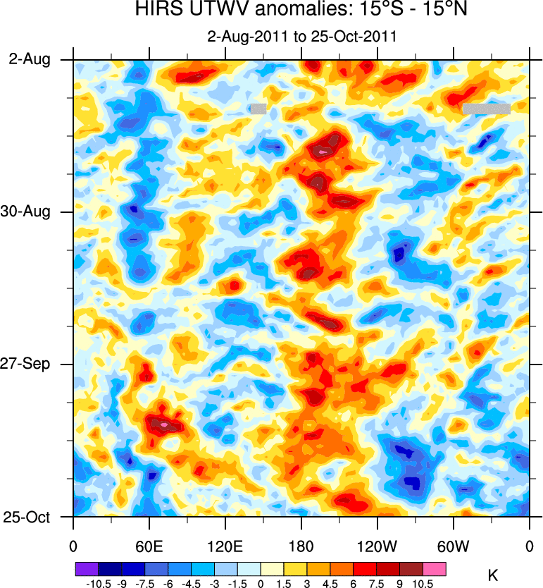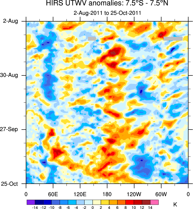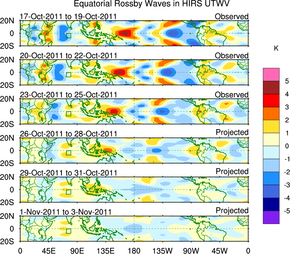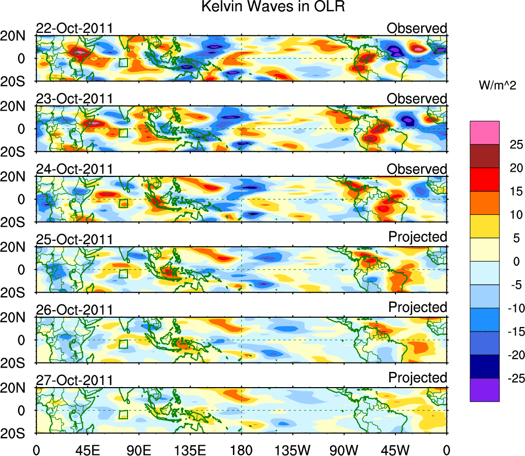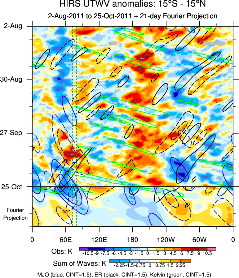 To identify tropical waves in near real-time, the OLR and UTWV data are filtered following Wheeler & Weickmann (2001 MWR). The daily anomalies are calculated using the first 3 harmonics of the seasonal cycle for 1979–2009. Missing values are then filled using linear interpolation in space and time. The most recent 365 days of anomalies are padded with 659 days of zeroes, and the result is filtered for each wave type.