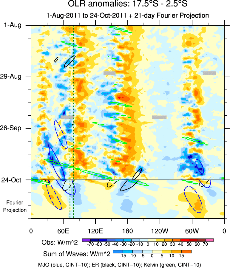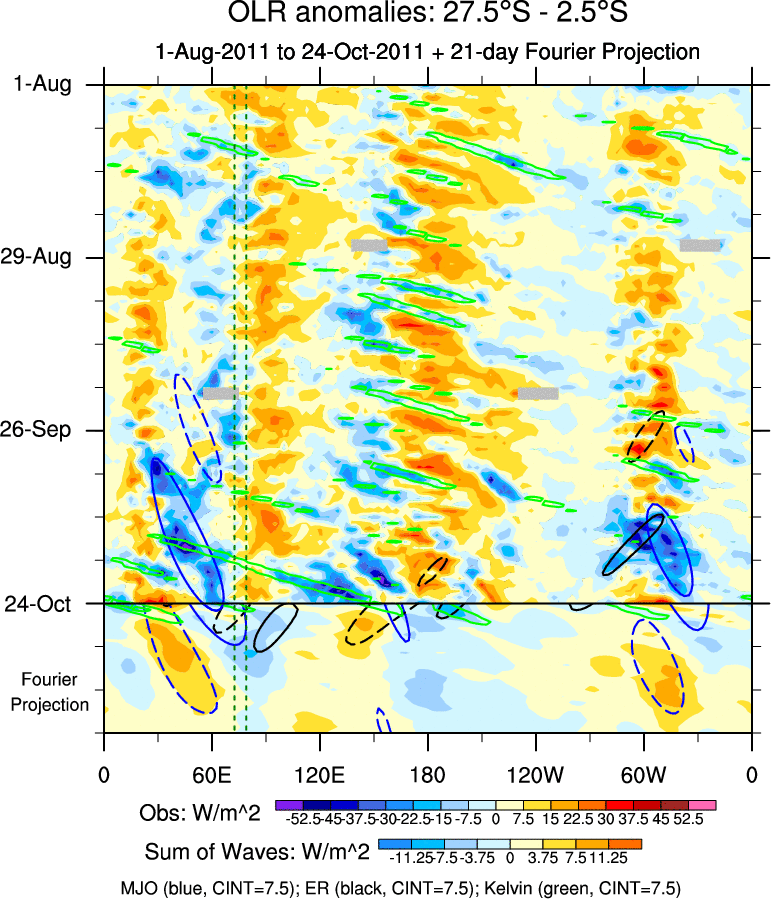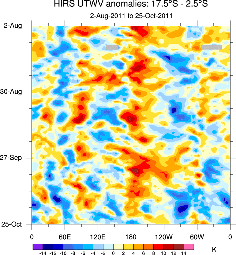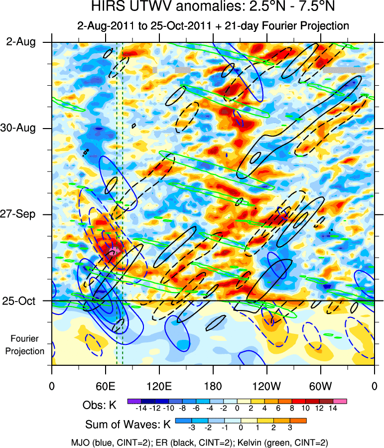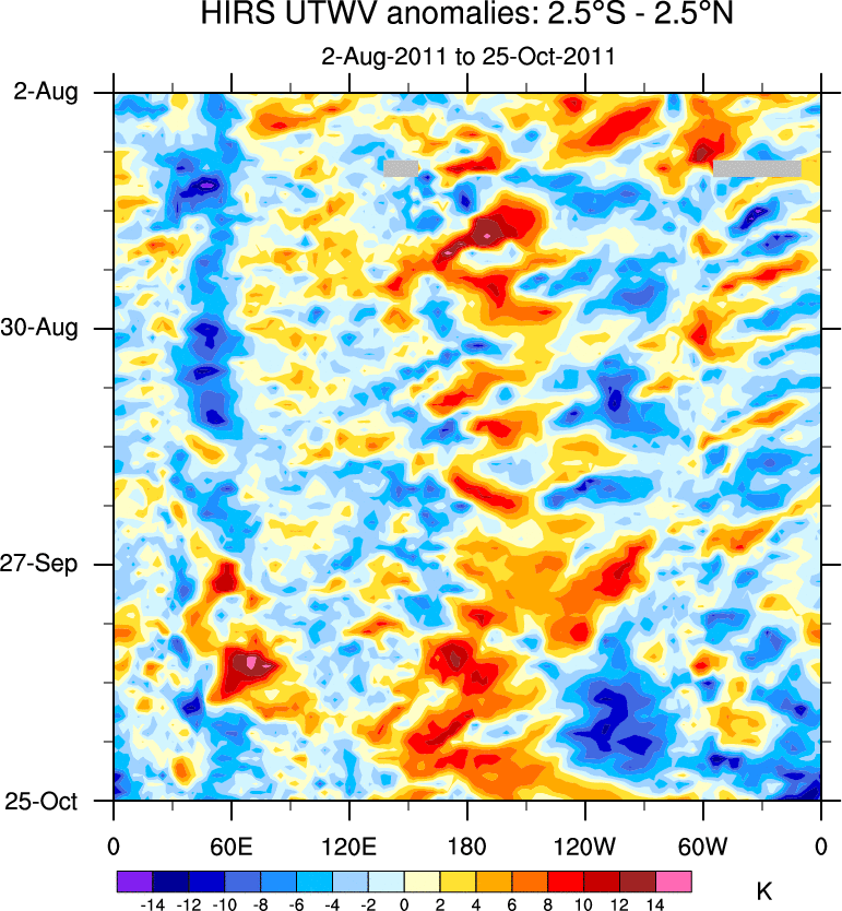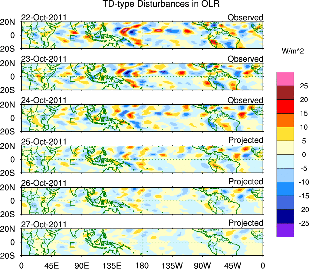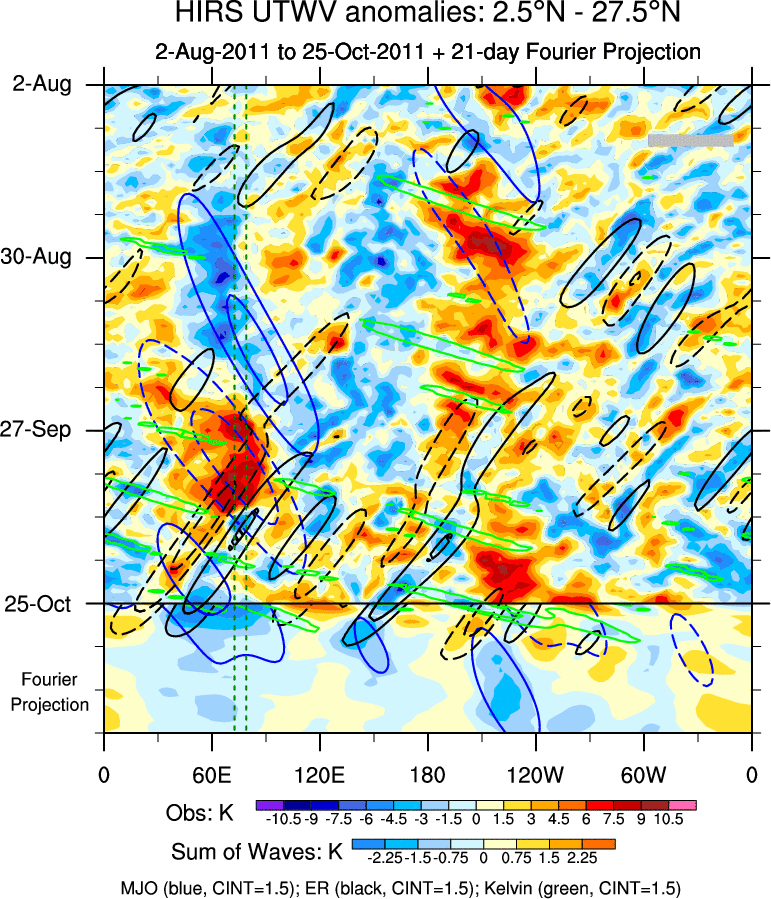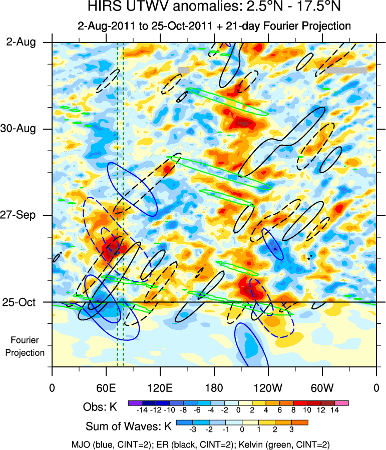 To identify tropical waves in near real-time, the OLR and UTWV data are filtered following Wheeler & Weickmann (2001 MWR). The daily anomalies are calculated using the first 3 harmonics of the seasonal cycle for 1979–2009. Missing values are then filled using linear interpolation in space and time. The most recent 365 days of anomalies are padded with 659 days of zeroes, and the result is filtered for each wave type.