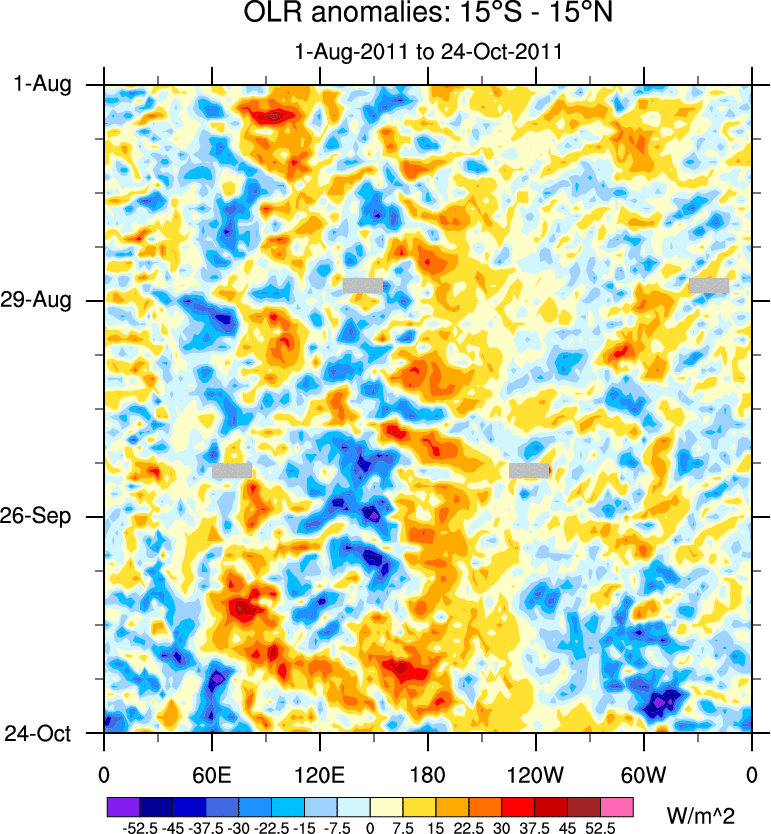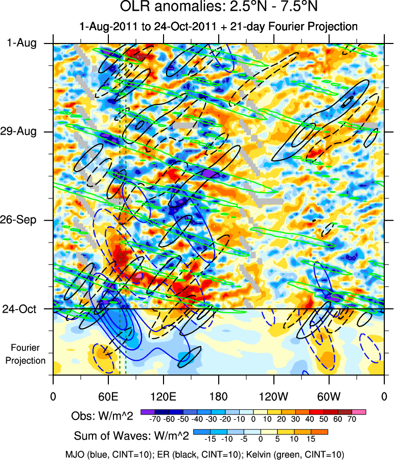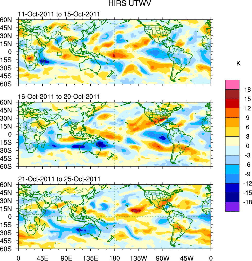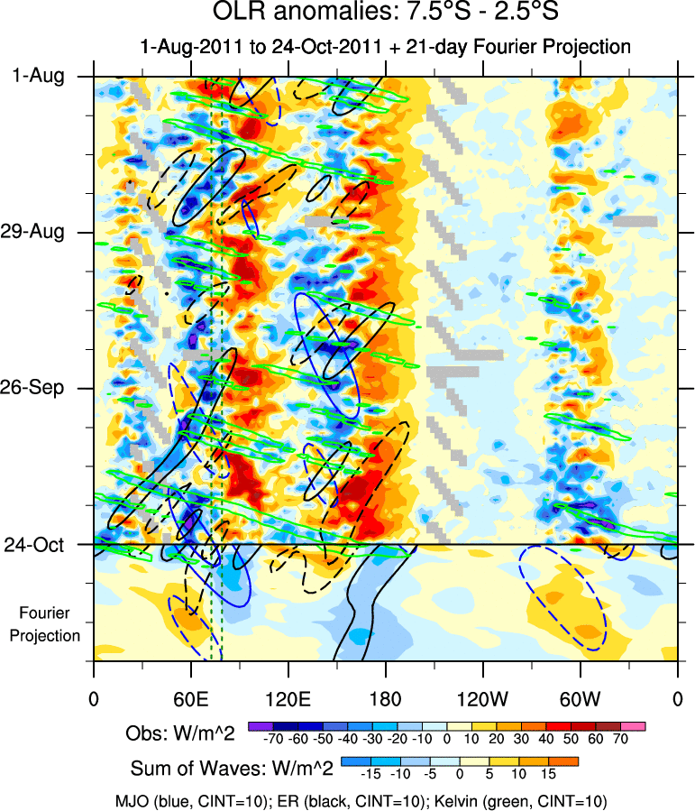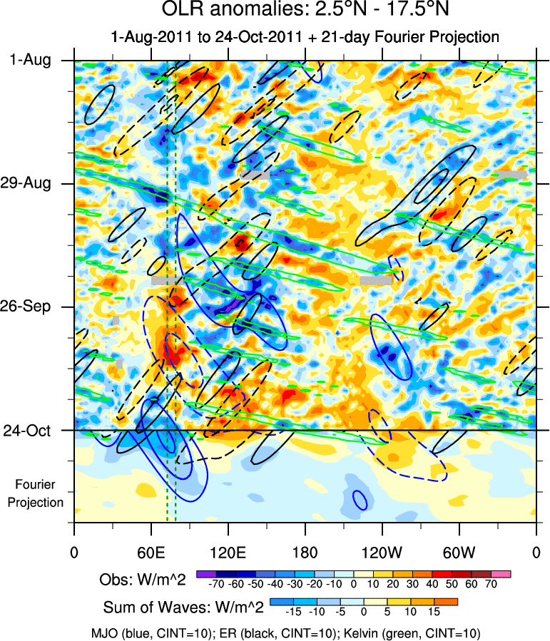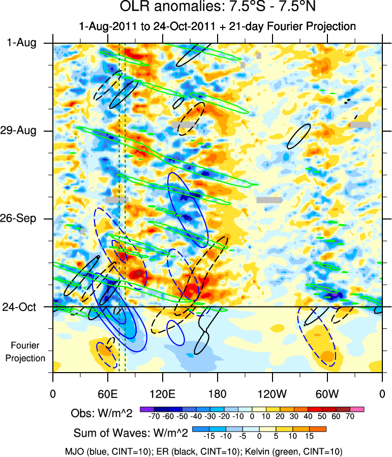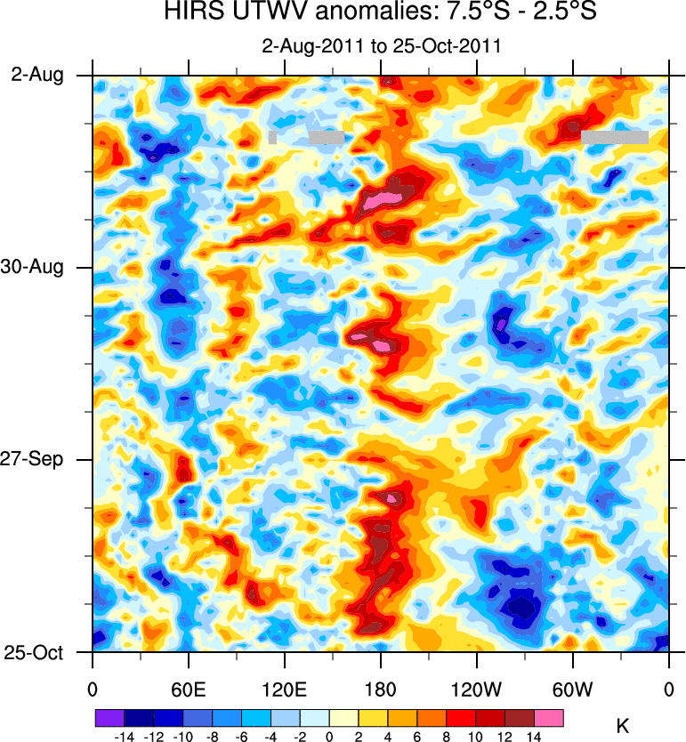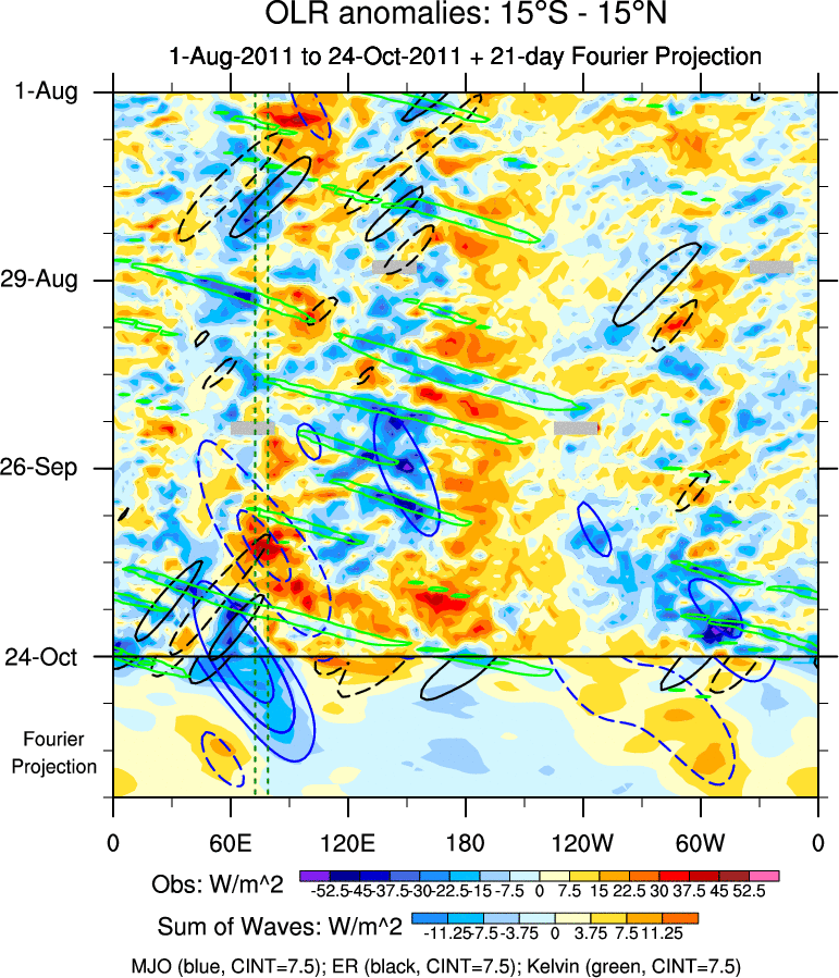 To identify tropical waves in near real-time, the OLR and UTWV data are filtered following Wheeler & Weickmann (2001 MWR). The daily anomalies are calculated using the first 3 harmonics of the seasonal cycle for 1979–2009. Missing values are then filled using linear interpolation in space and time. The most recent 365 days of anomalies are padded with 659 days of zeroes, and the result is filtered for each wave type.
