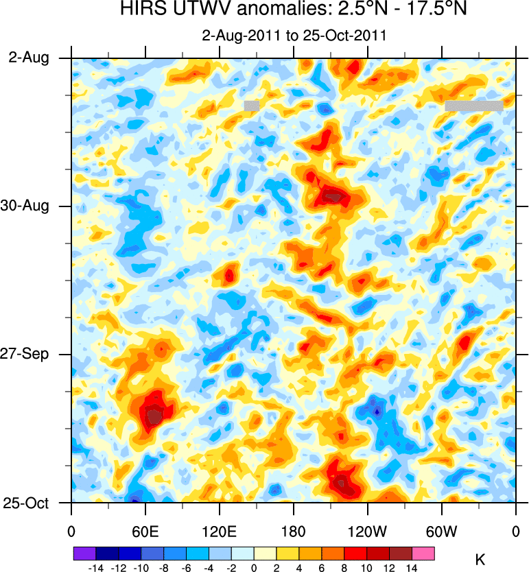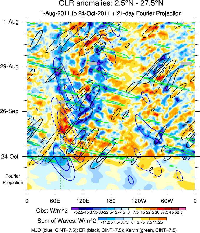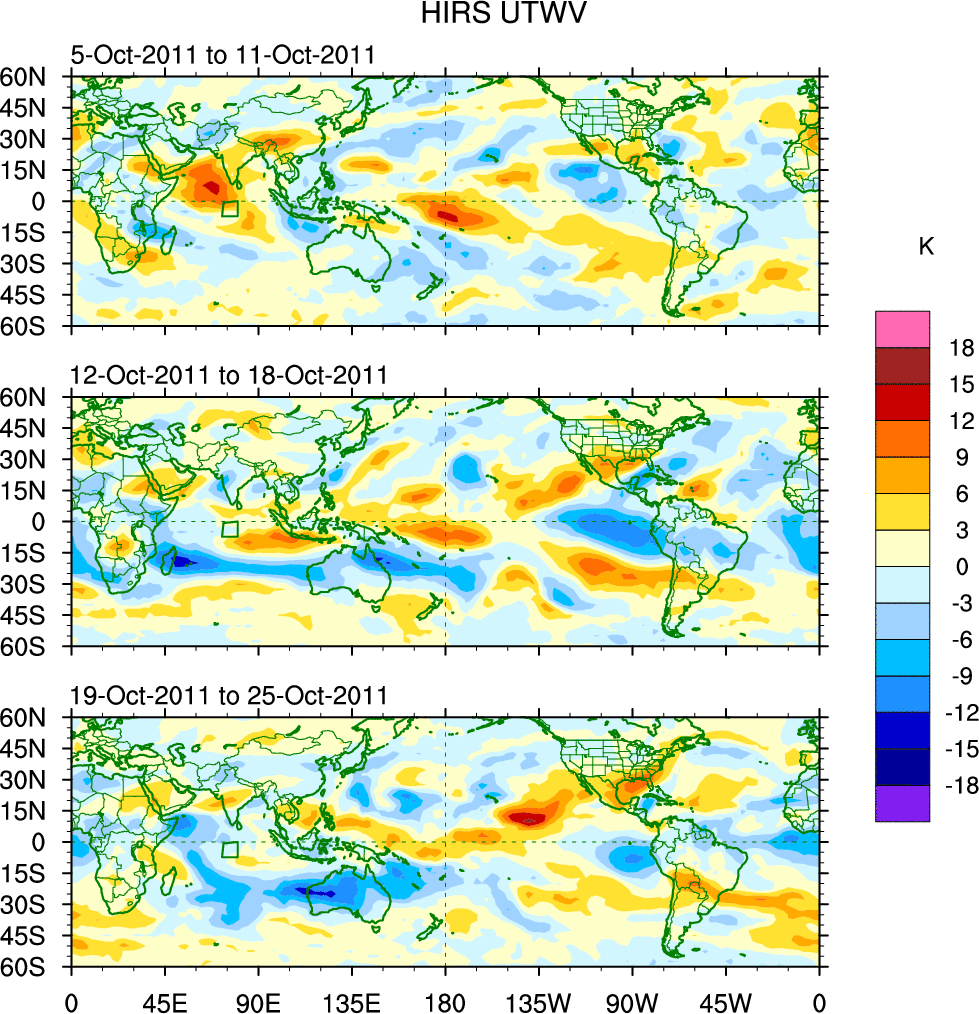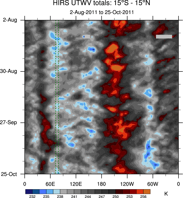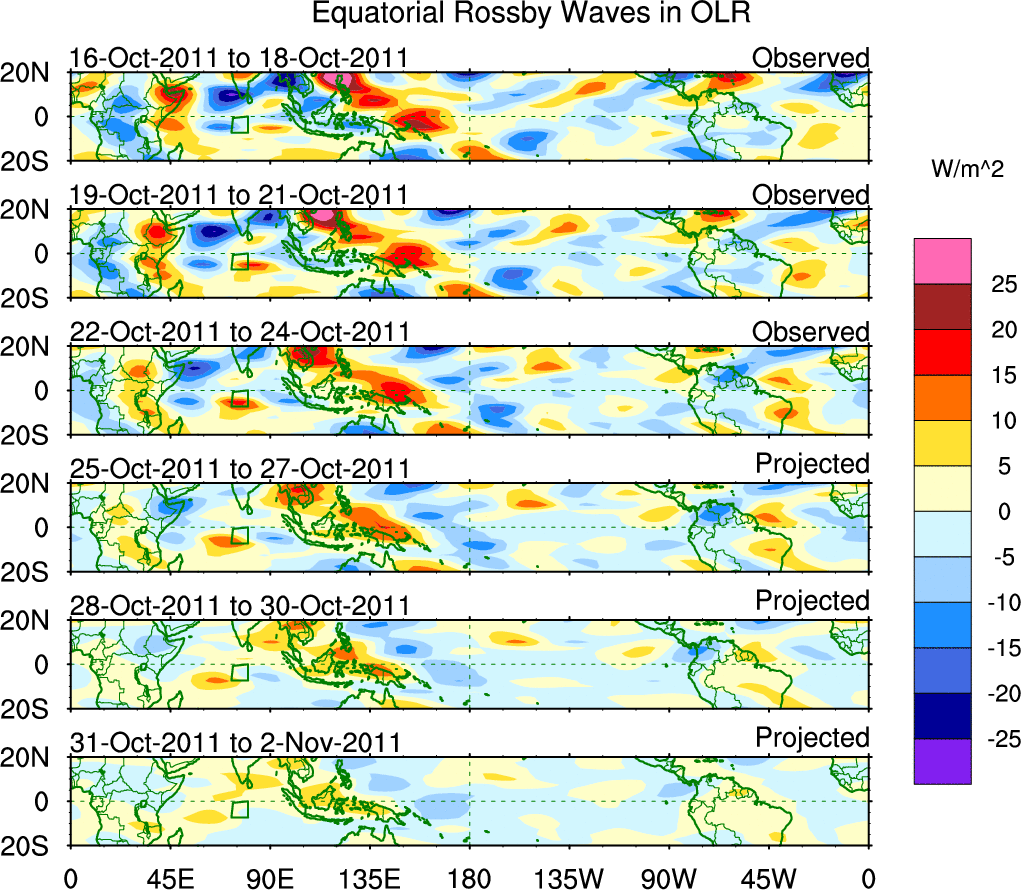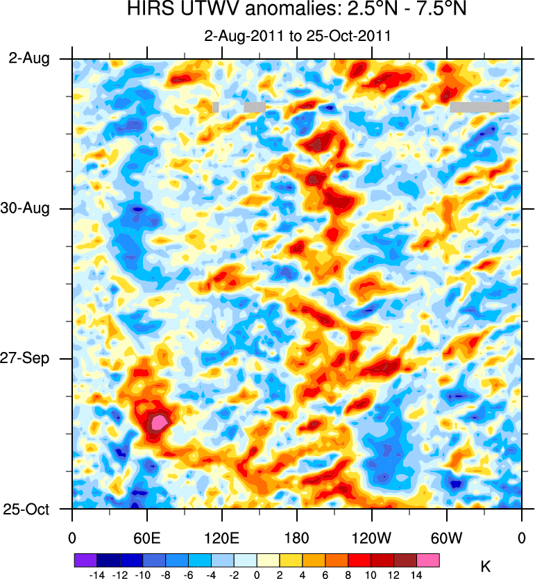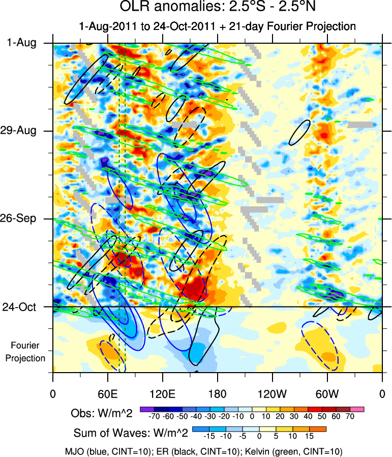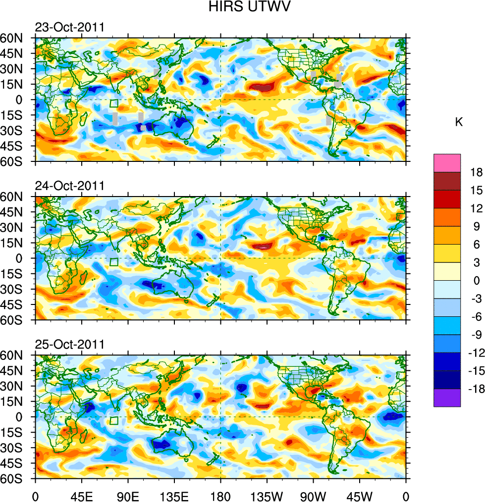 To identify tropical waves in near real-time, the OLR and UTWV data are filtered following Wheeler & Weickmann (2001 MWR). The daily anomalies are calculated using the first 3 harmonics of the seasonal cycle for 1979–2009. Missing values are then filled using linear interpolation in space and time. The most recent 365 days of anomalies are padded with 659 days of zeroes, and the result is filtered for each wave type.