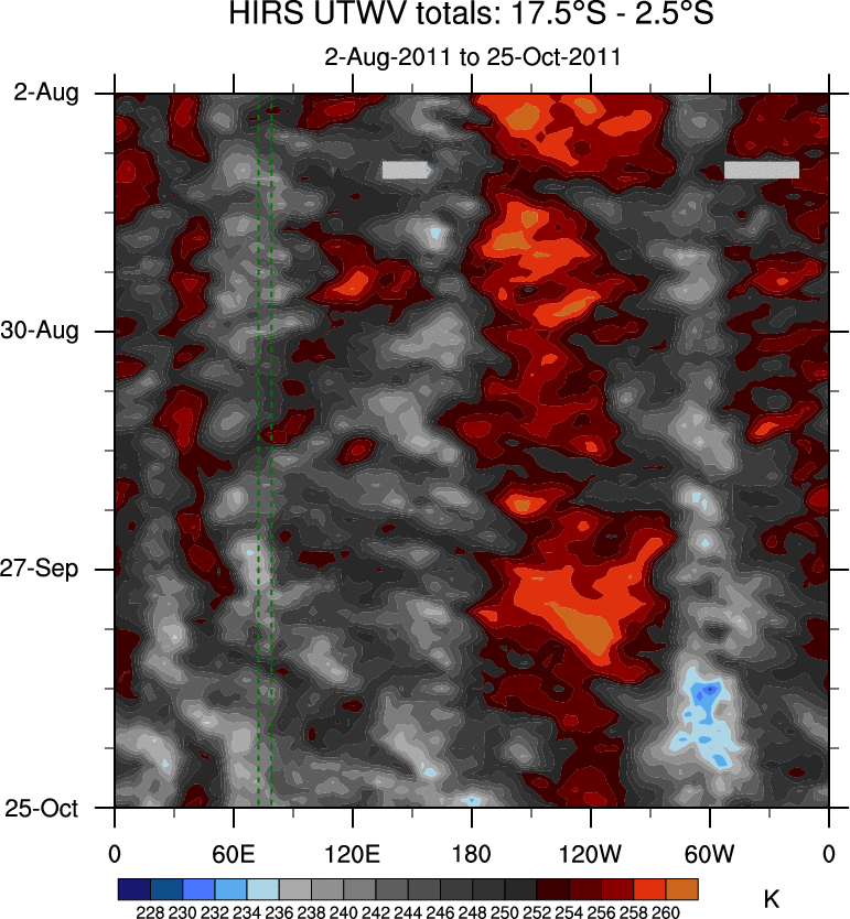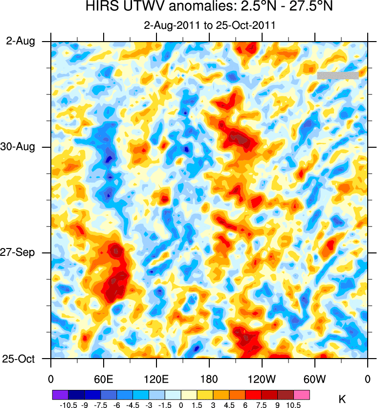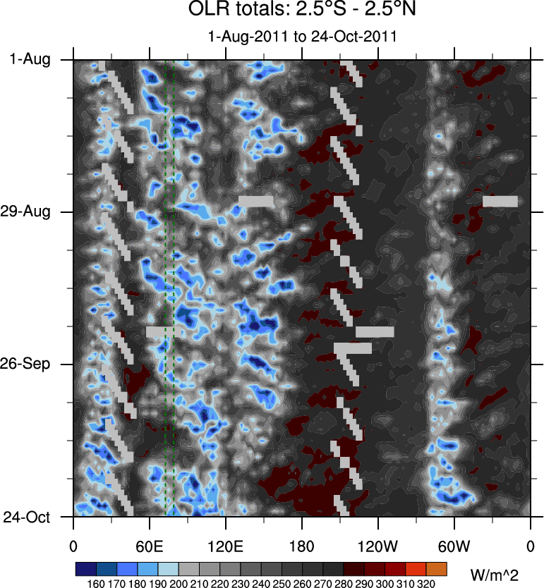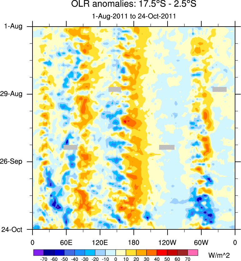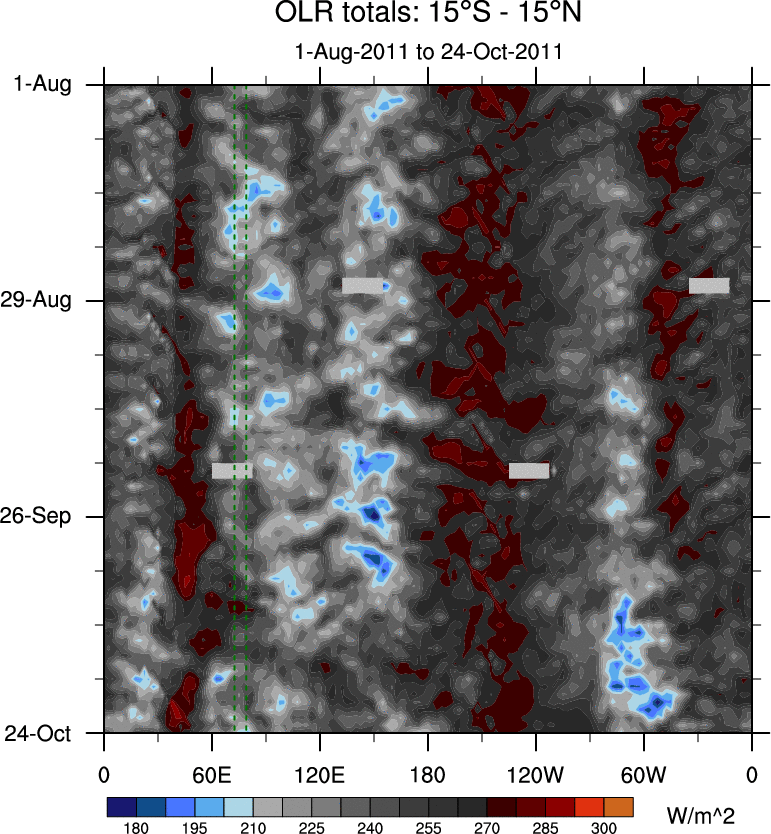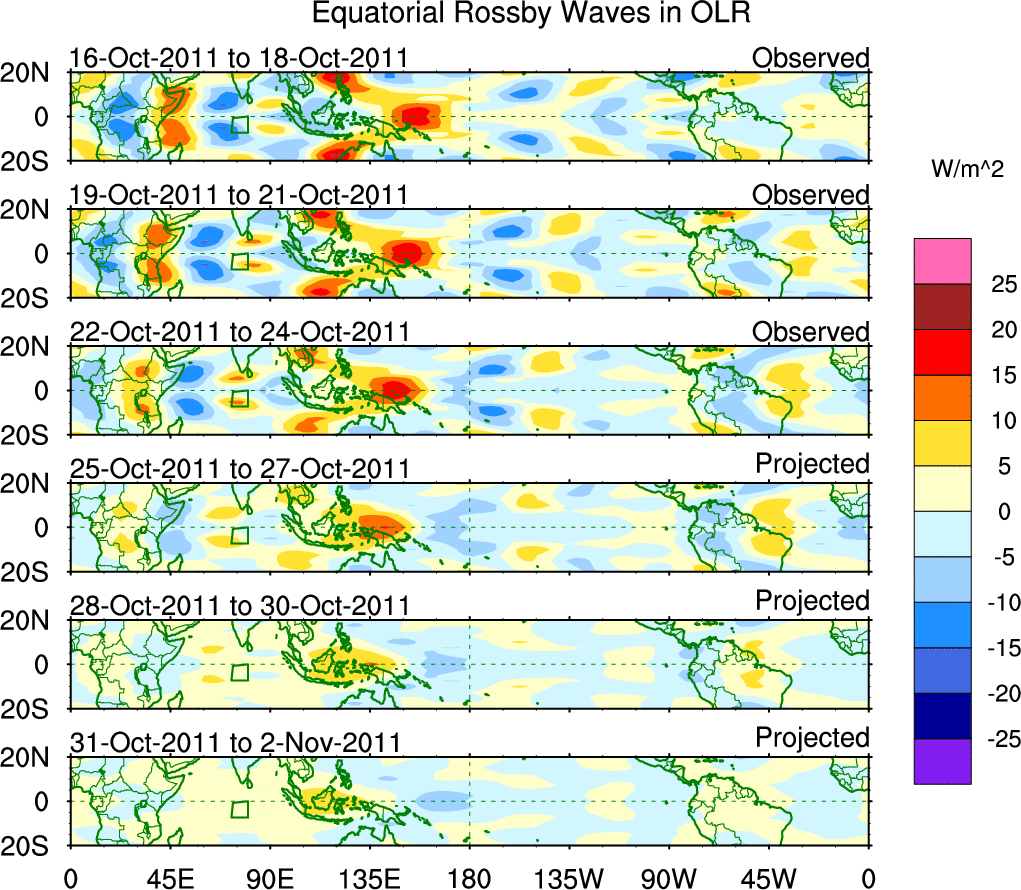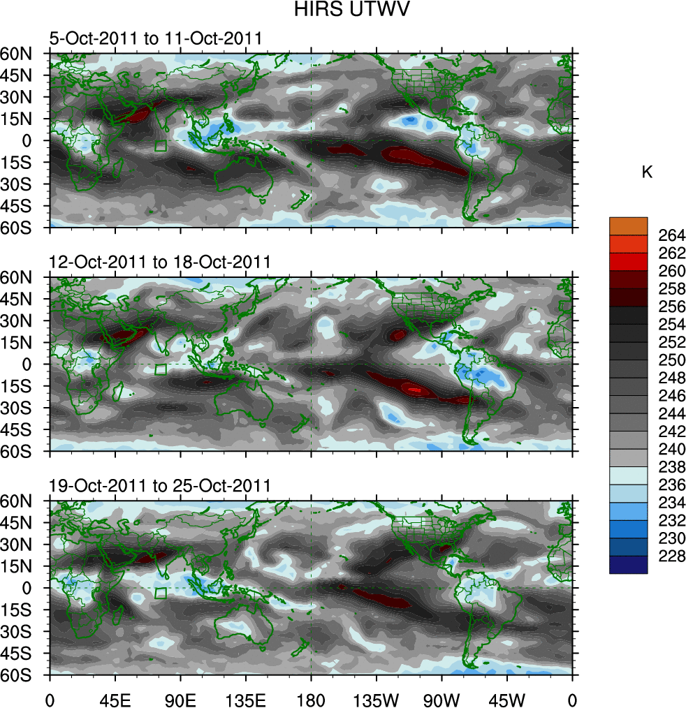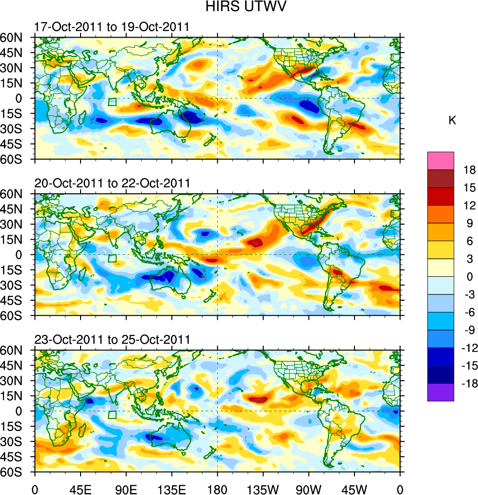 To identify tropical waves in near real-time, the OLR and UTWV data are filtered following Wheeler & Weickmann (2001 MWR). The daily anomalies are calculated using the first 3 harmonics of the seasonal cycle for 1979–2009. Missing values are then filled using linear interpolation in space and time. The most recent 365 days of anomalies are padded with 659 days of zeroes, and the result is filtered for each wave type.