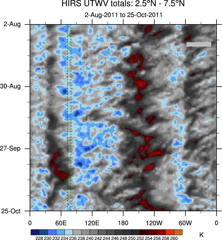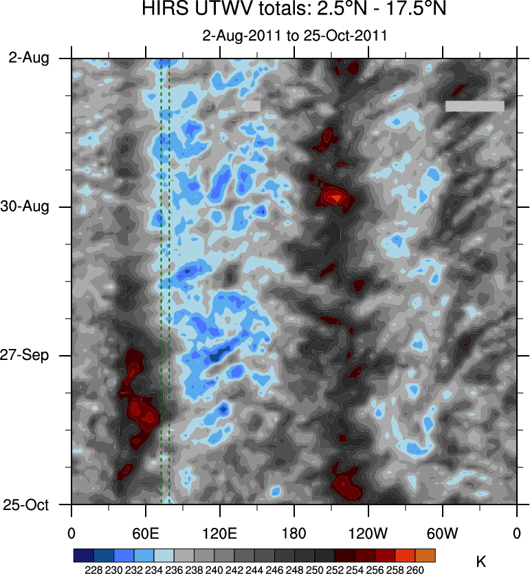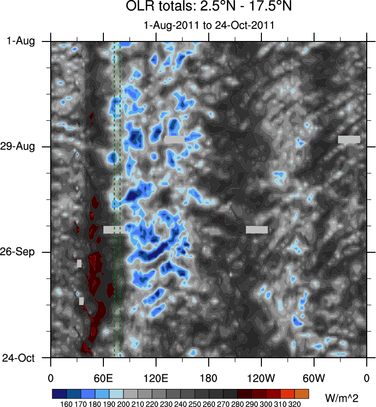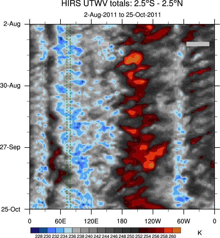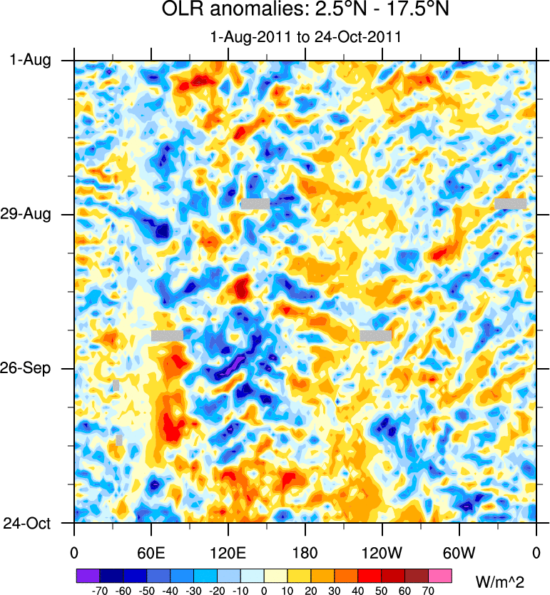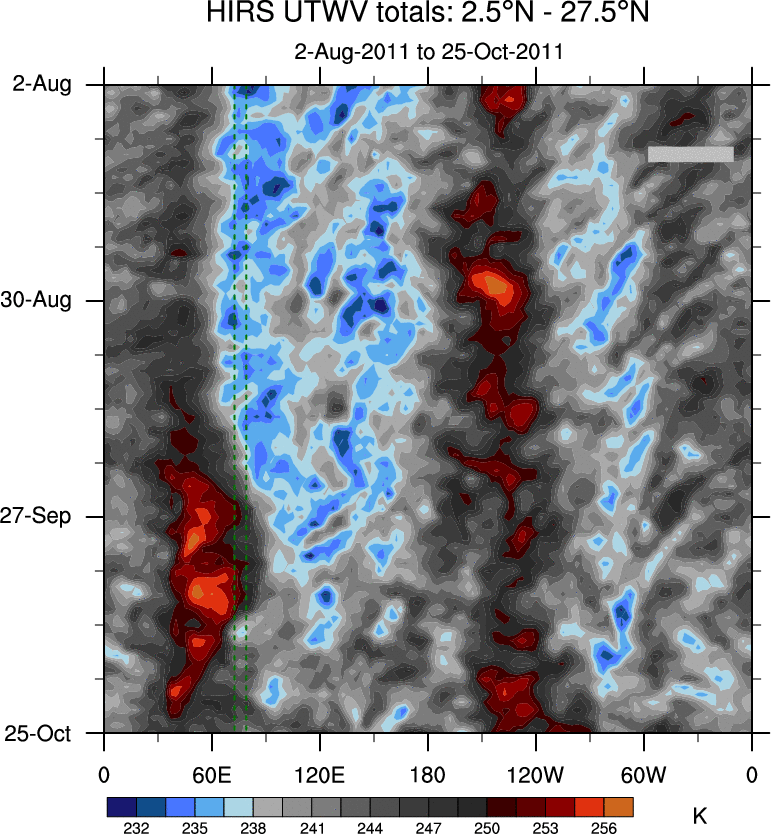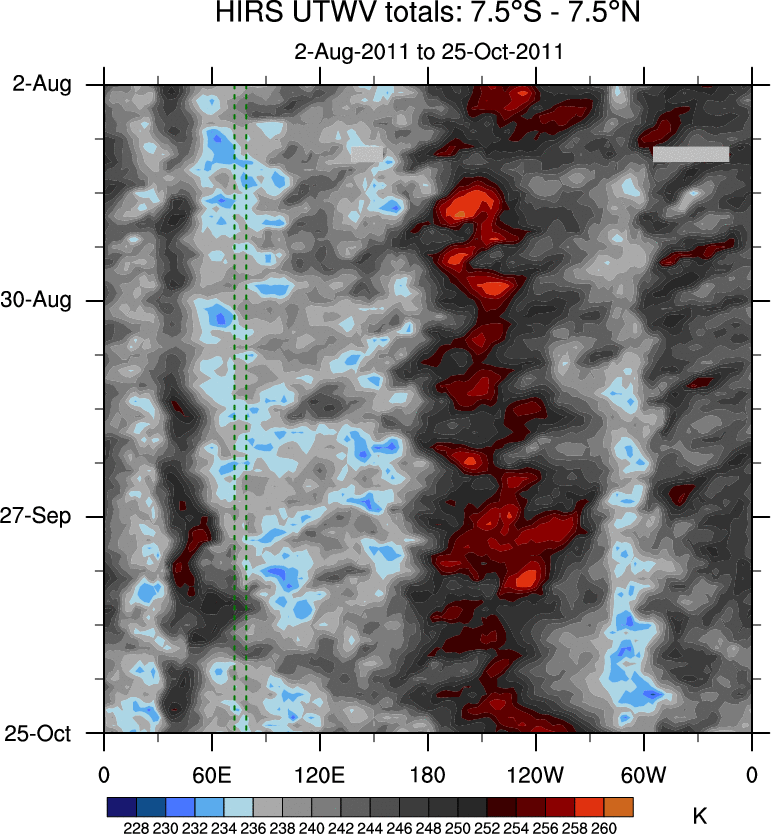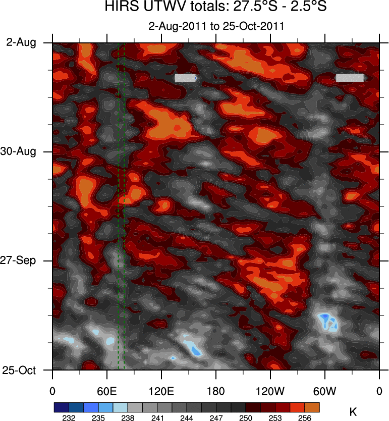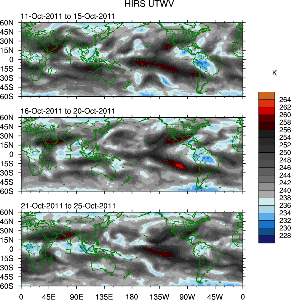 To identify tropical waves in near real-time, the OLR and UTWV data are filtered following Wheeler & Weickmann (2001 MWR). The daily anomalies are calculated using the first 3 harmonics of the seasonal cycle for 1979–2009. Missing values are then filled using linear interpolation in space and time. The most recent 365 days of anomalies are padded with 659 days of zeroes, and the result is filtered for each wave type.