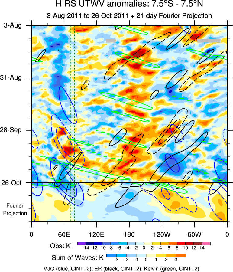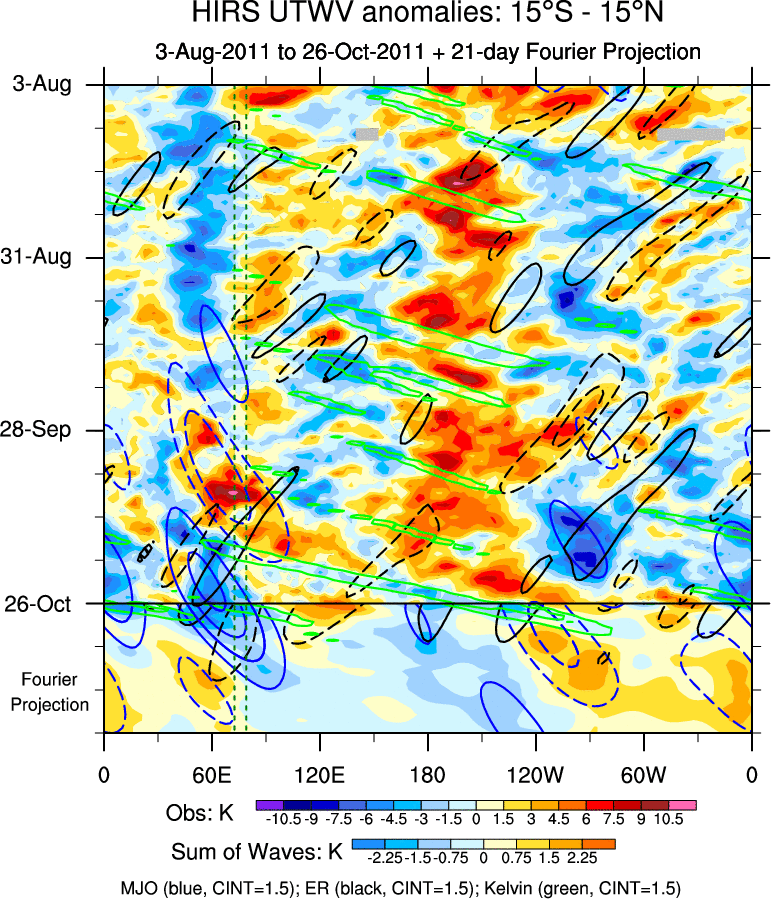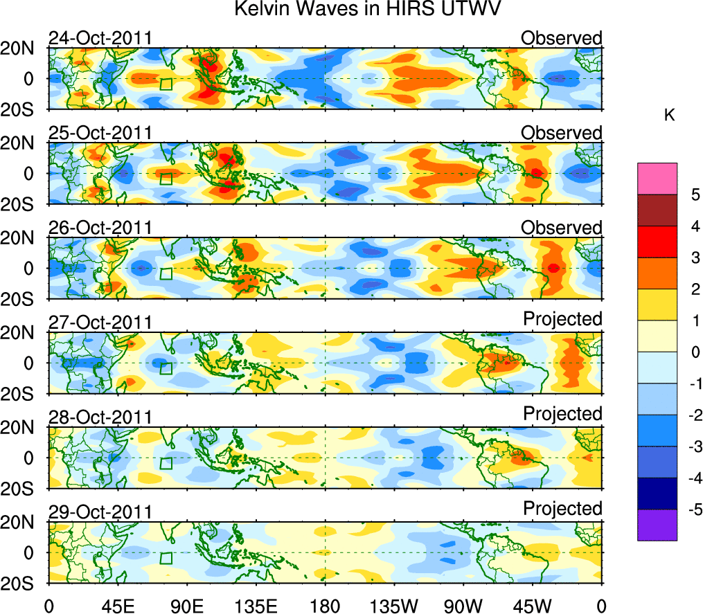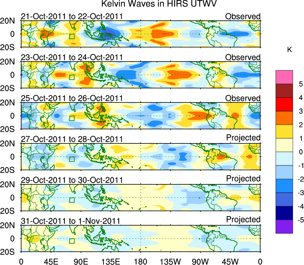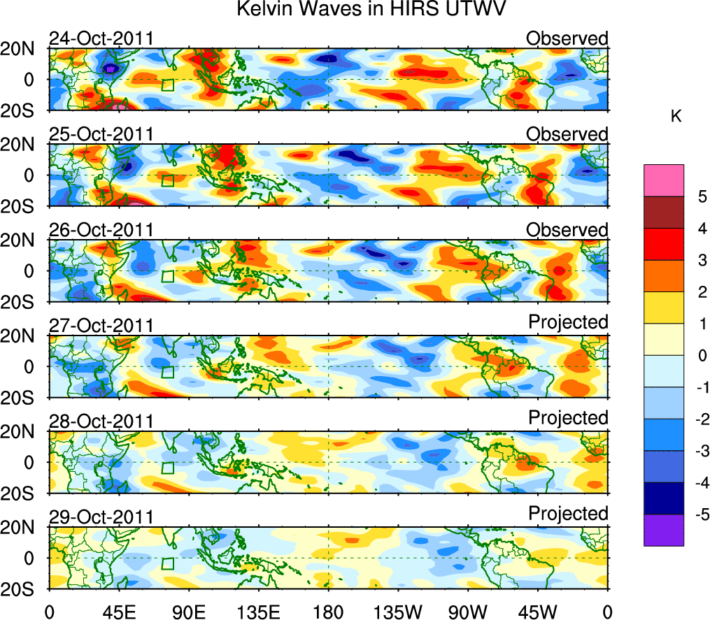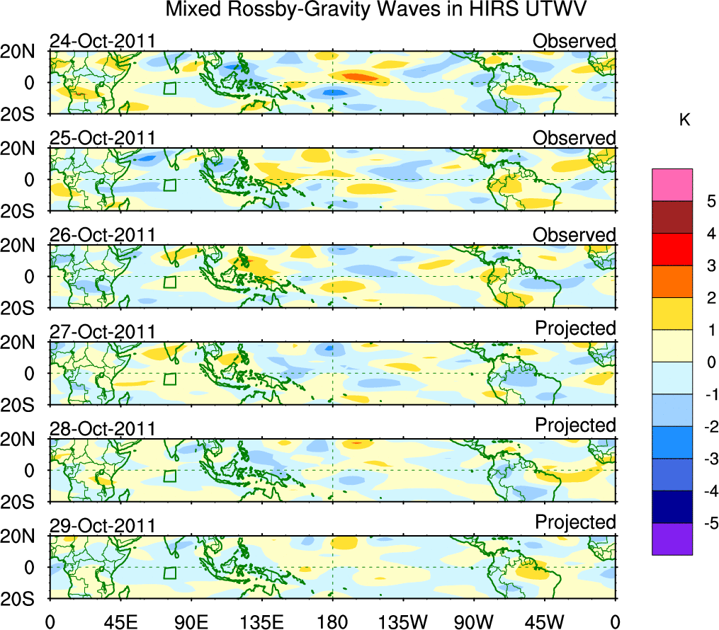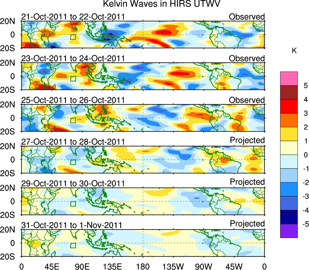 To identify tropical waves in near real-time, the OLR and UTWV data are filtered following Wheeler & Weickmann (2001 MWR). The daily anomalies are calculated using the first 3 harmonics of the seasonal cycle for 1979–2009. Missing values are then filled using linear interpolation in space and time. The most recent 365 days of anomalies are padded with 659 days of zeroes, and the result is filtered for each wave type.