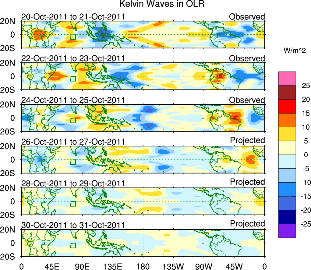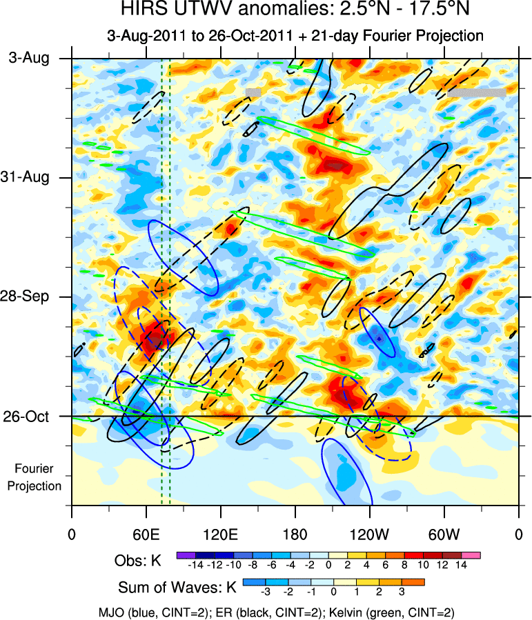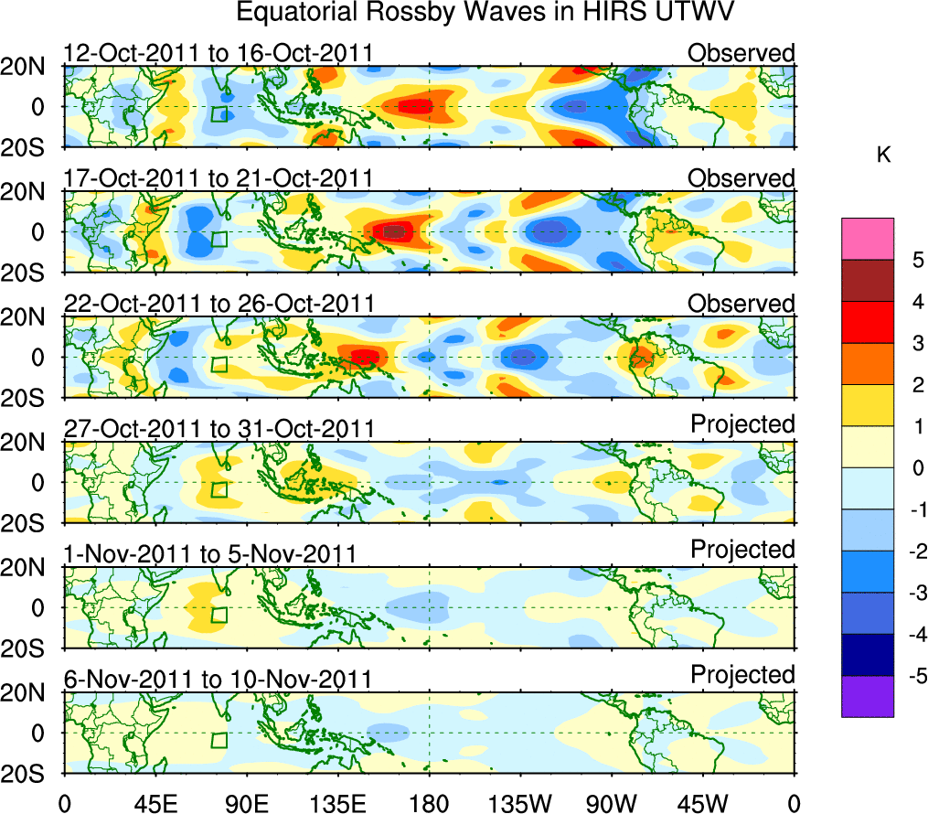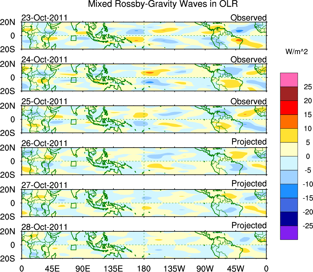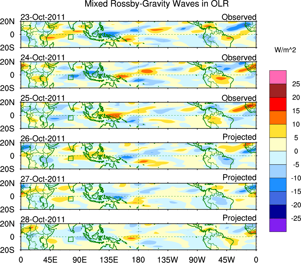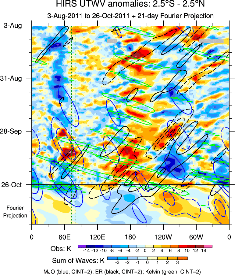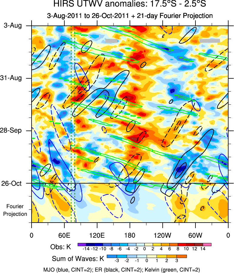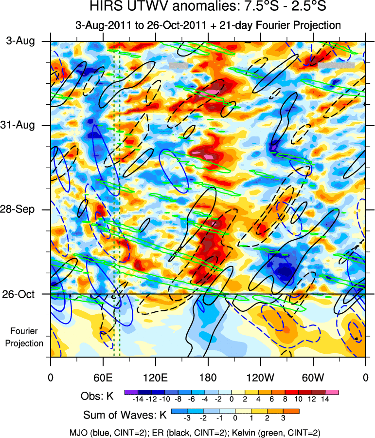 To identify tropical waves in near real-time, the OLR and UTWV data are filtered following Wheeler & Weickmann (2001 MWR). The daily anomalies are calculated using the first 3 harmonics of the seasonal cycle for 1979–2009. Missing values are then filled using linear interpolation in space and time. The most recent 365 days of anomalies are padded with 659 days of zeroes, and the result is filtered for each wave type.