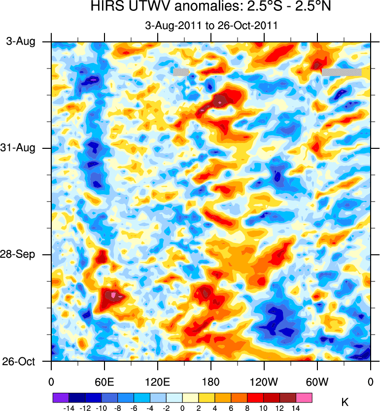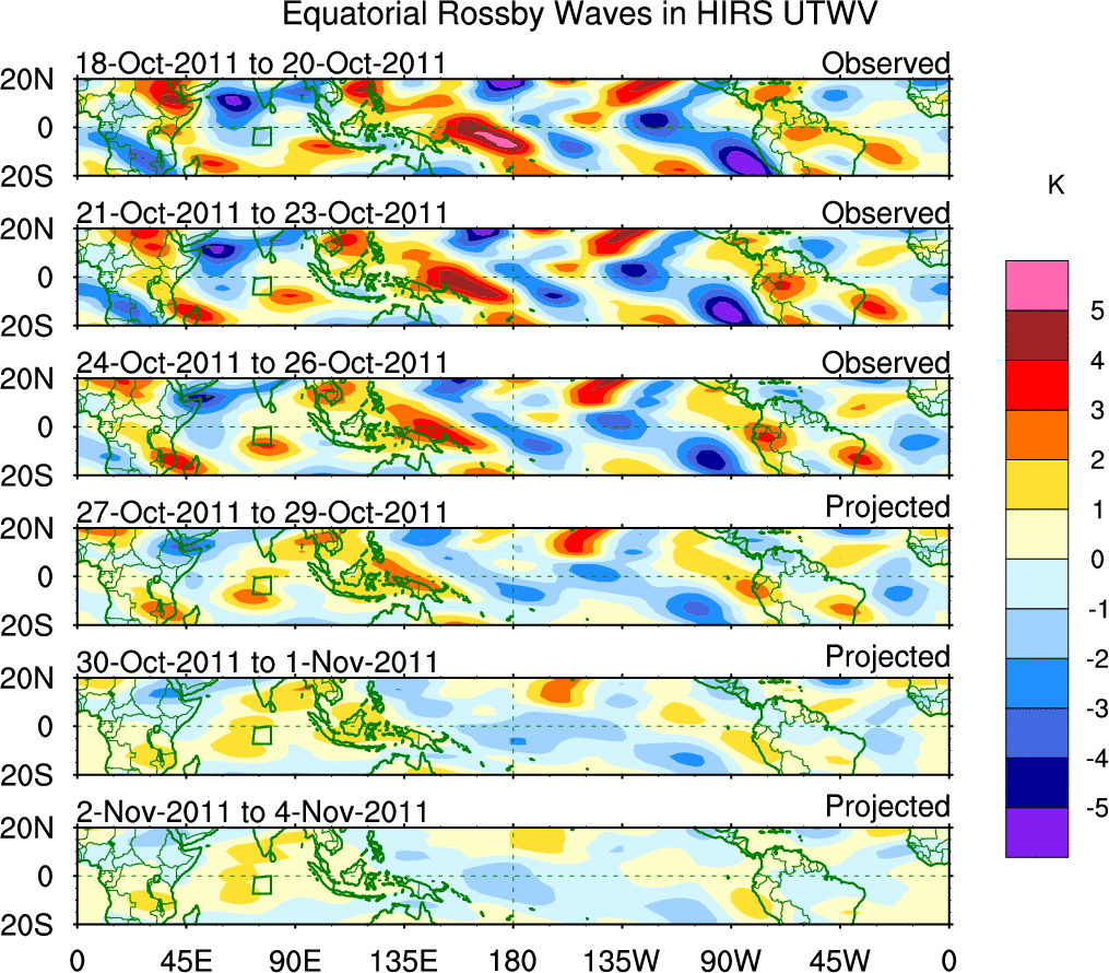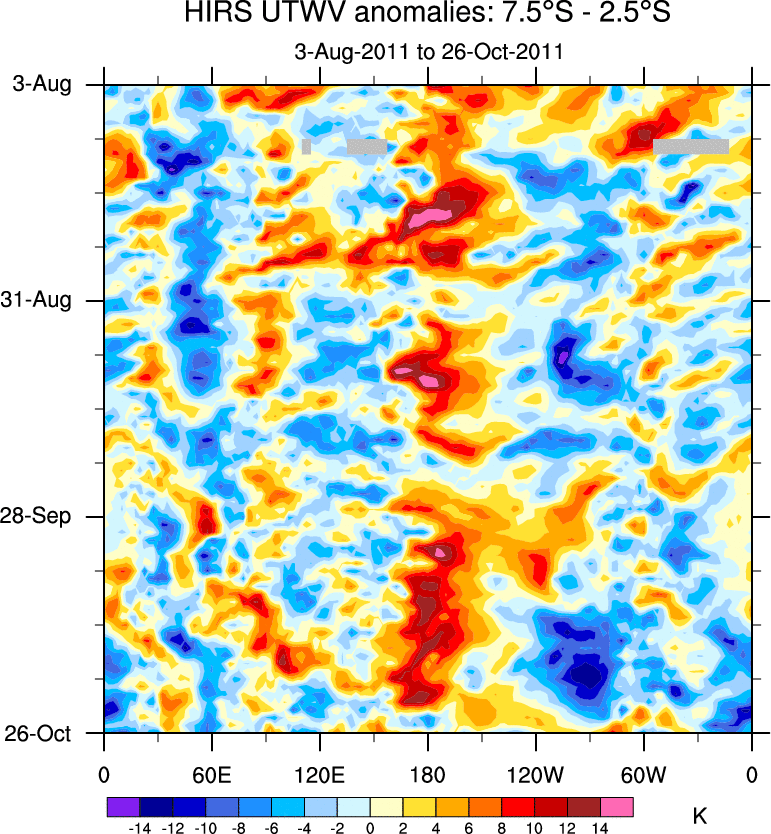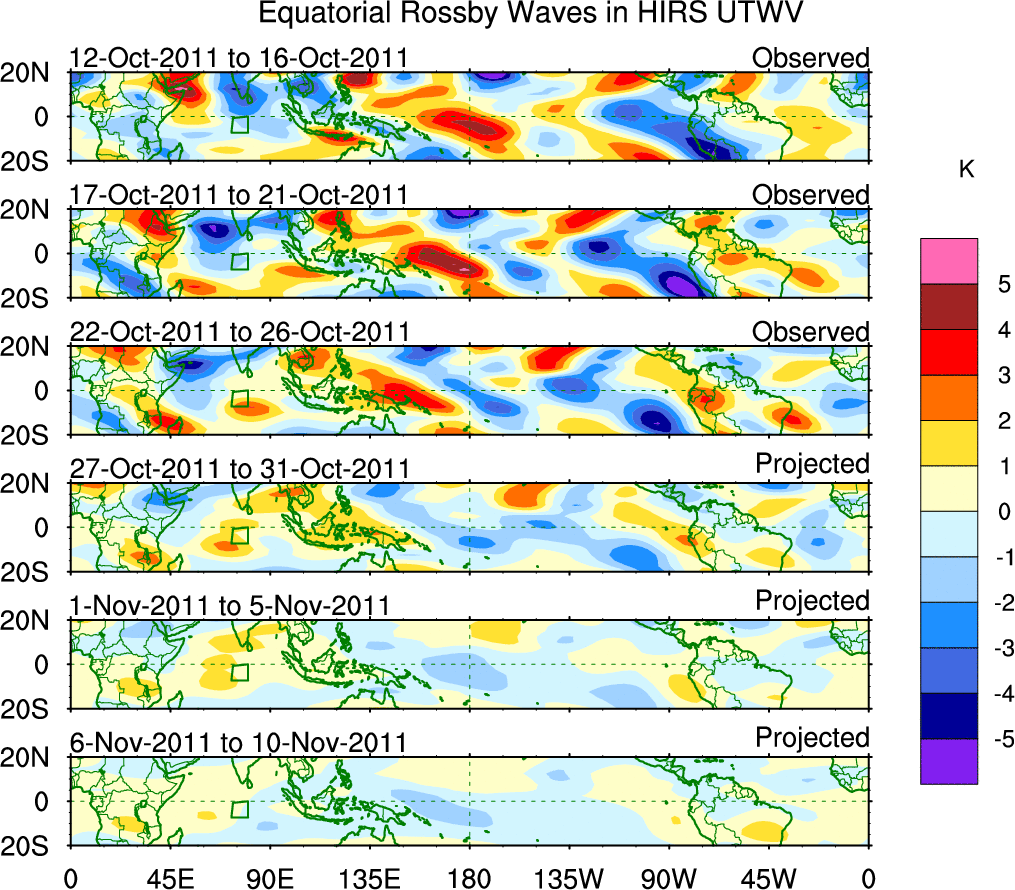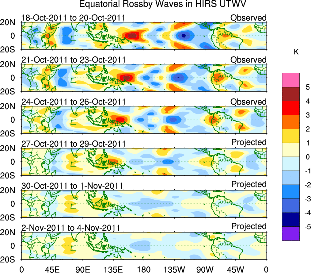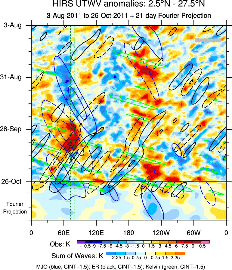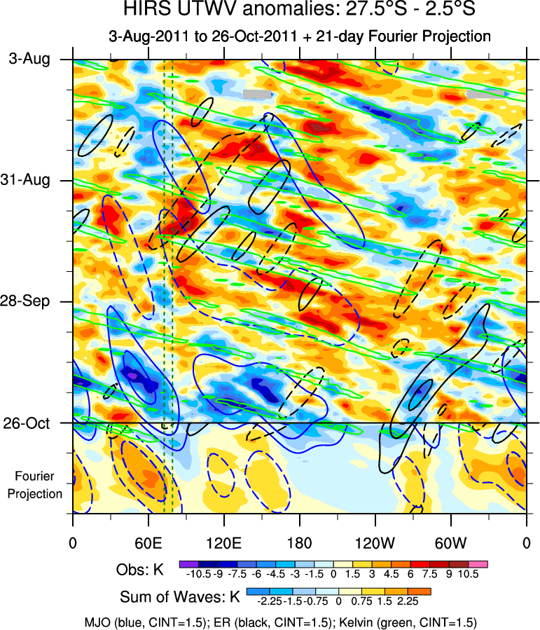 To identify tropical waves in near real-time, the OLR and UTWV data are filtered following Wheeler & Weickmann (2001 MWR). The daily anomalies are calculated using the first 3 harmonics of the seasonal cycle for 1979–2009. Missing values are then filled using linear interpolation in space and time. The most recent 365 days of anomalies are padded with 659 days of zeroes, and the result is filtered for each wave type.