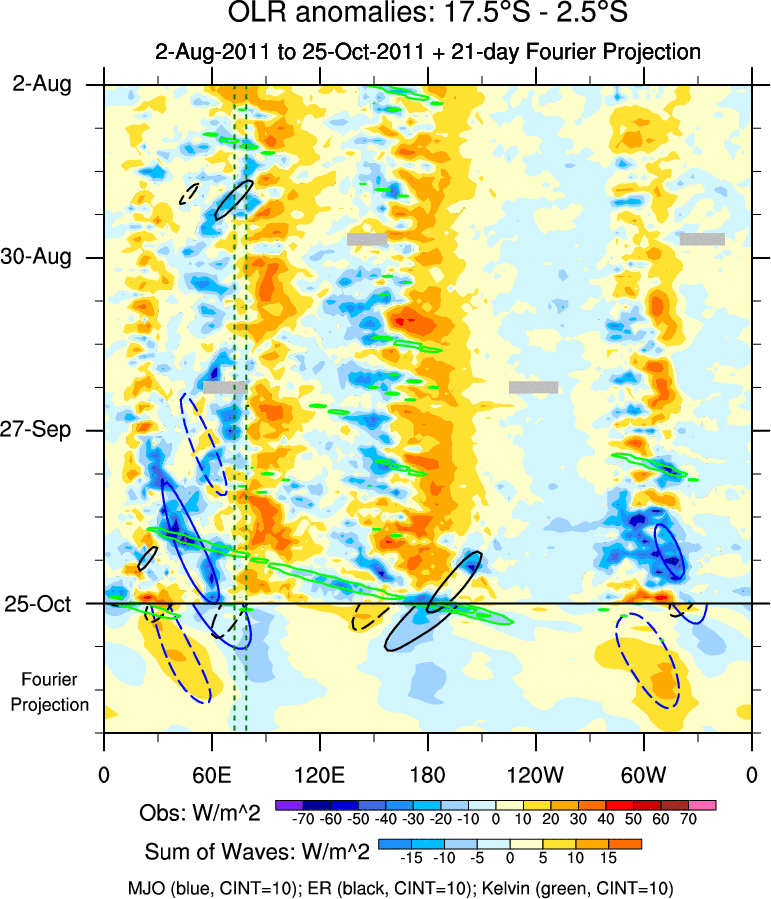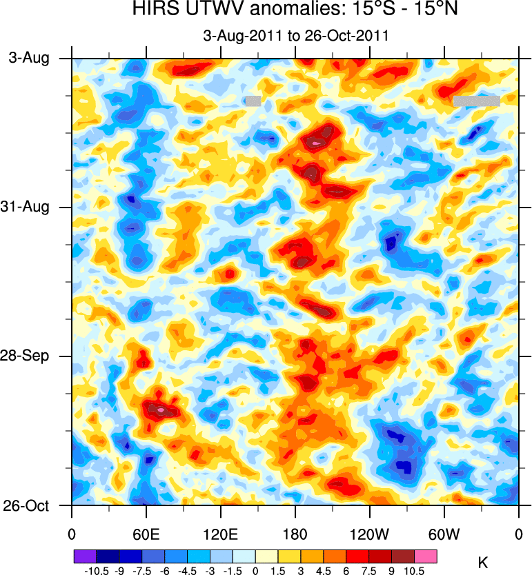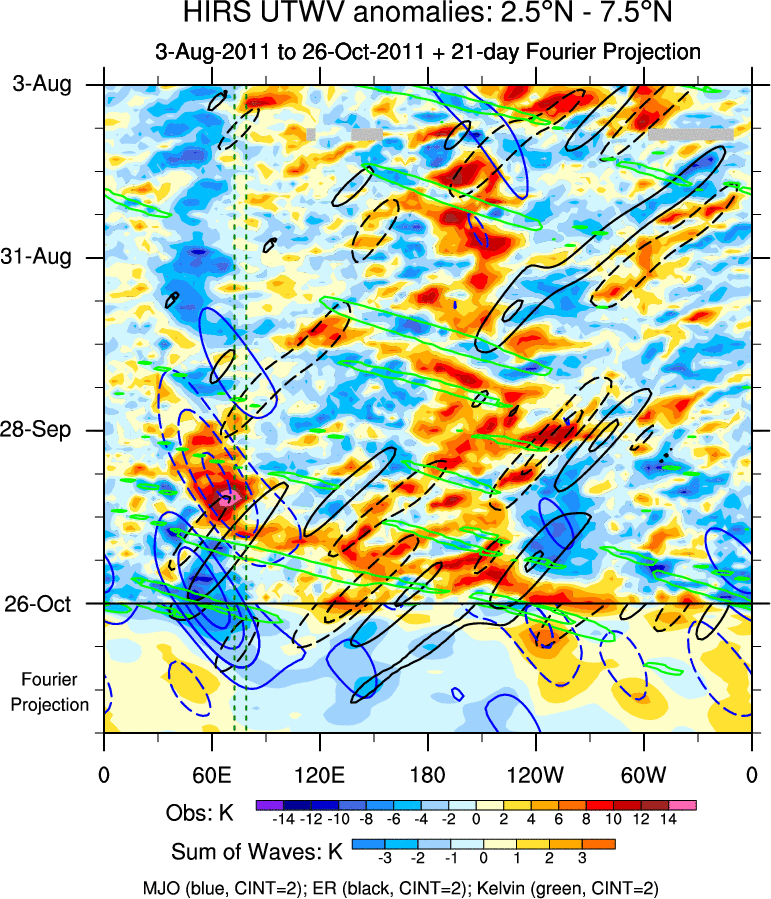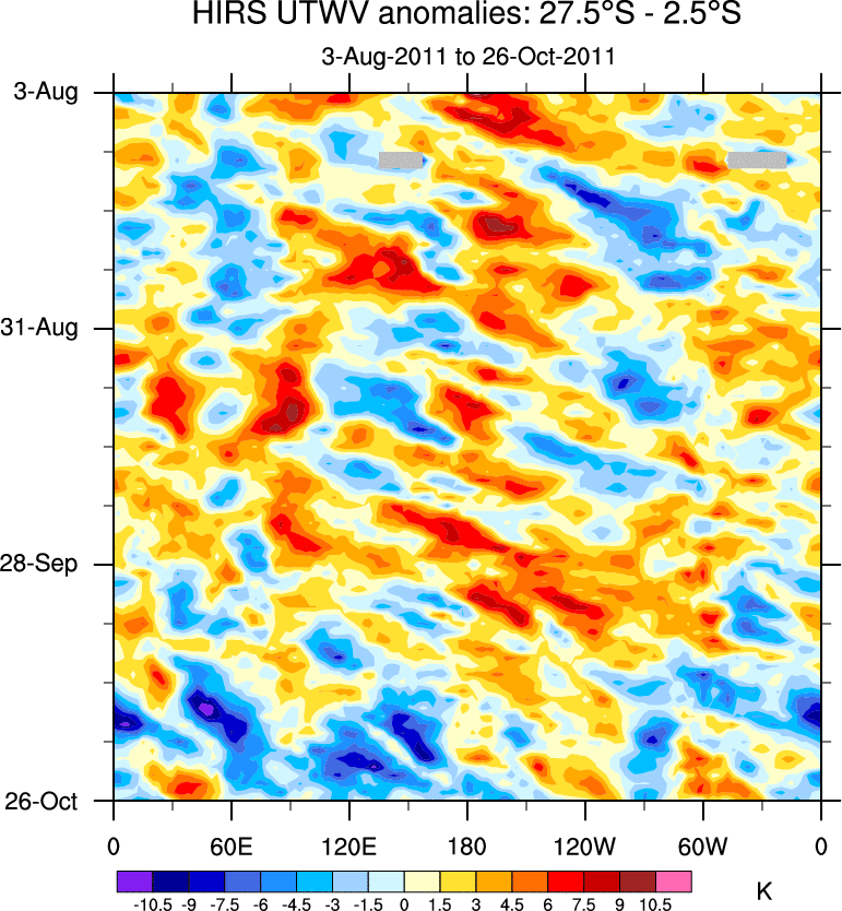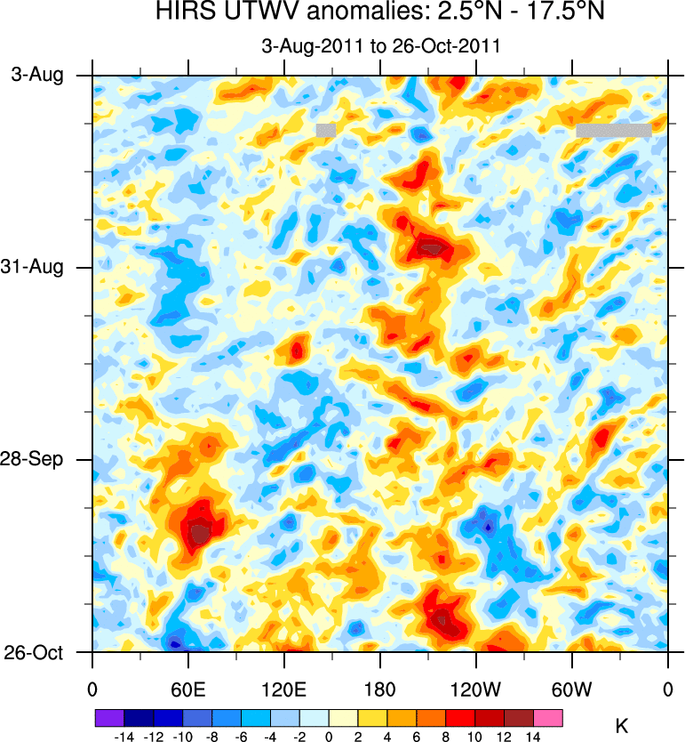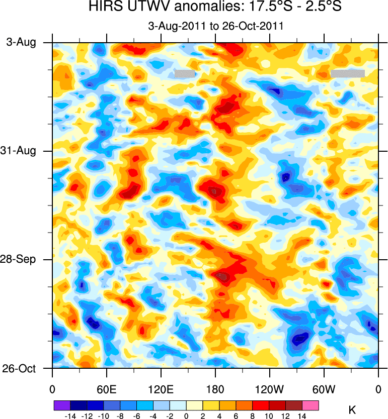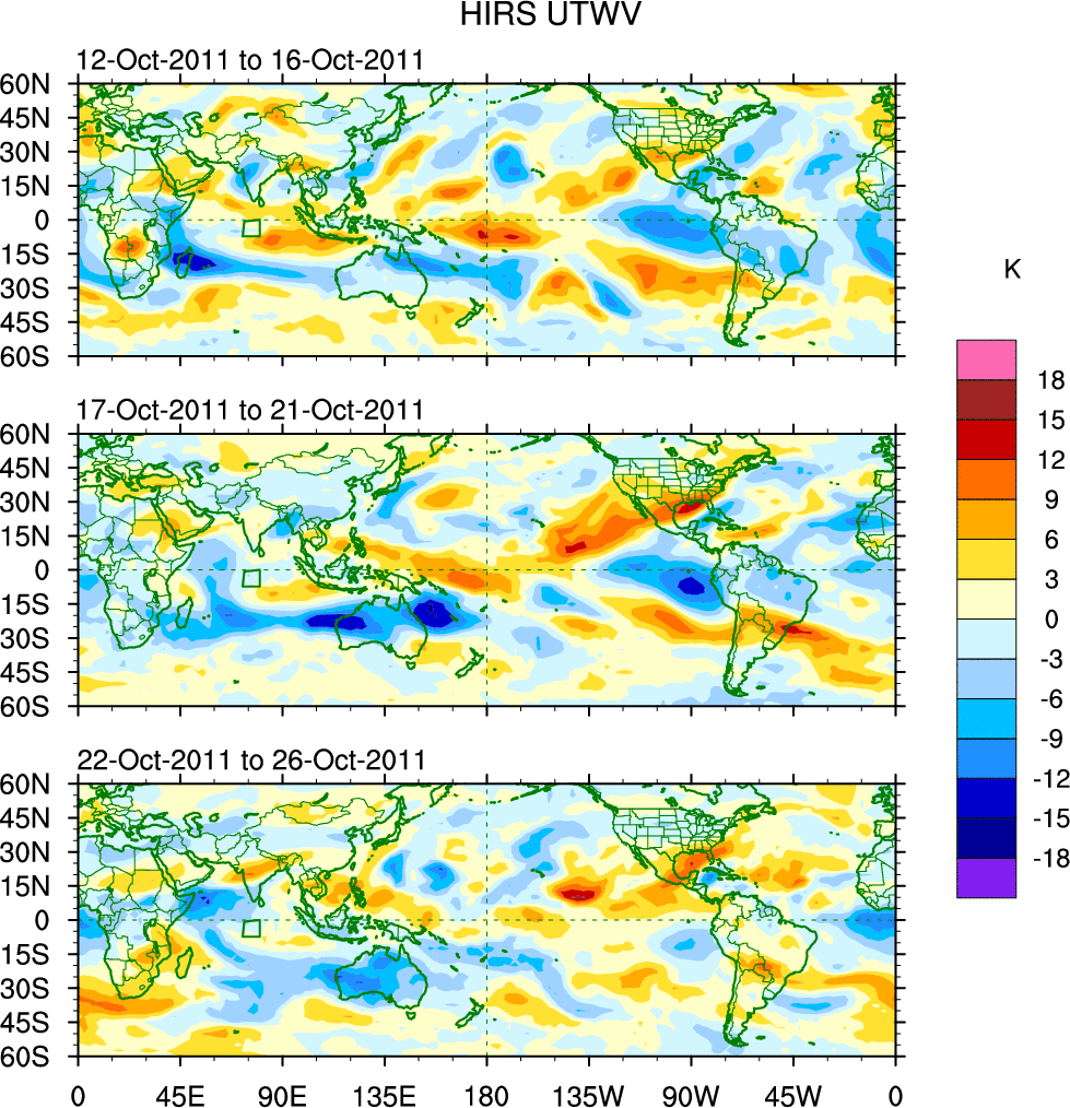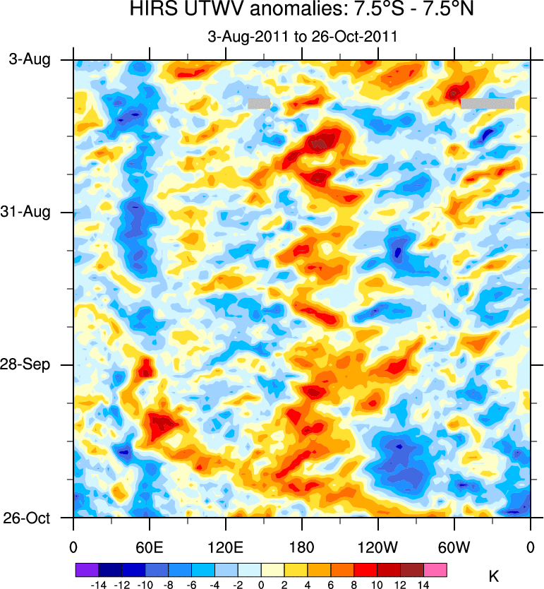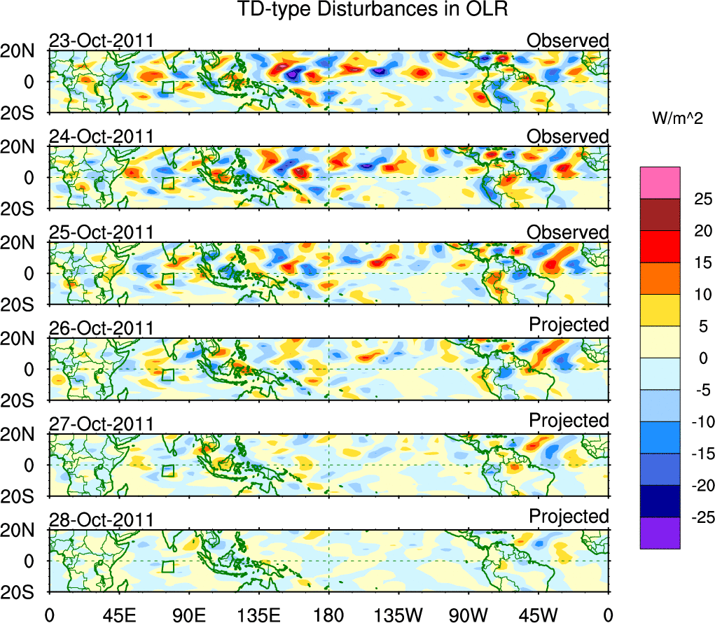 To identify tropical waves in near real-time, the OLR and UTWV data are filtered following Wheeler & Weickmann (2001 MWR). The daily anomalies are calculated using the first 3 harmonics of the seasonal cycle for 1979–2009. Missing values are then filled using linear interpolation in space and time. The most recent 365 days of anomalies are padded with 659 days of zeroes, and the result is filtered for each wave type.