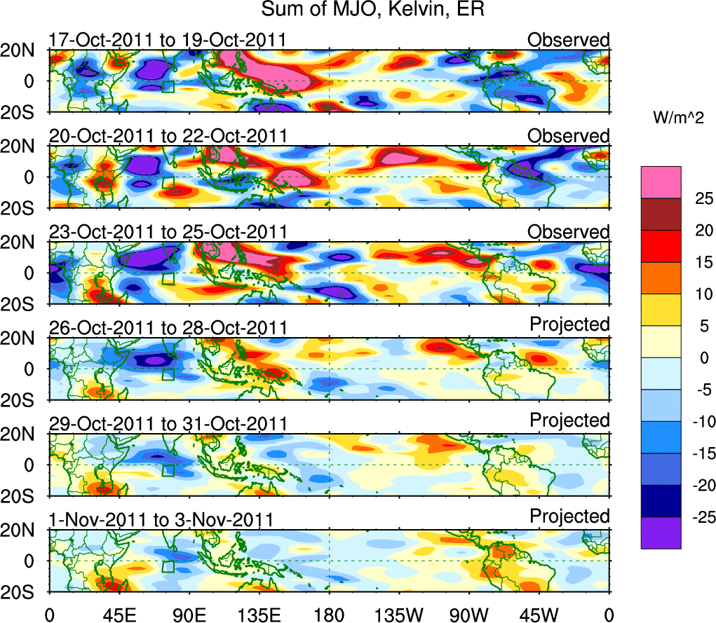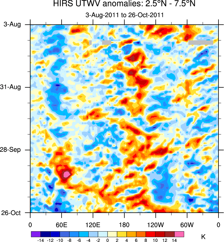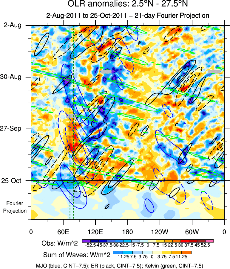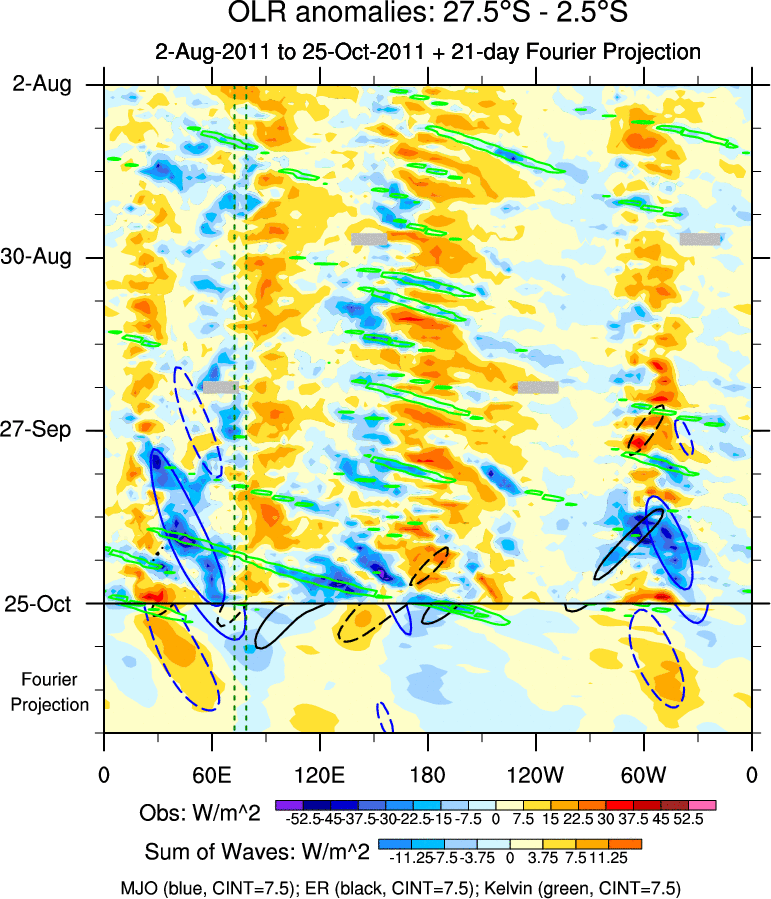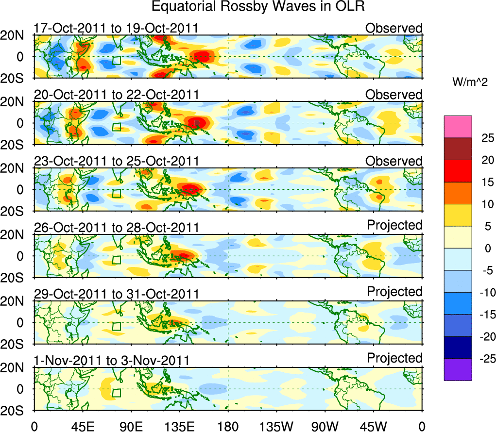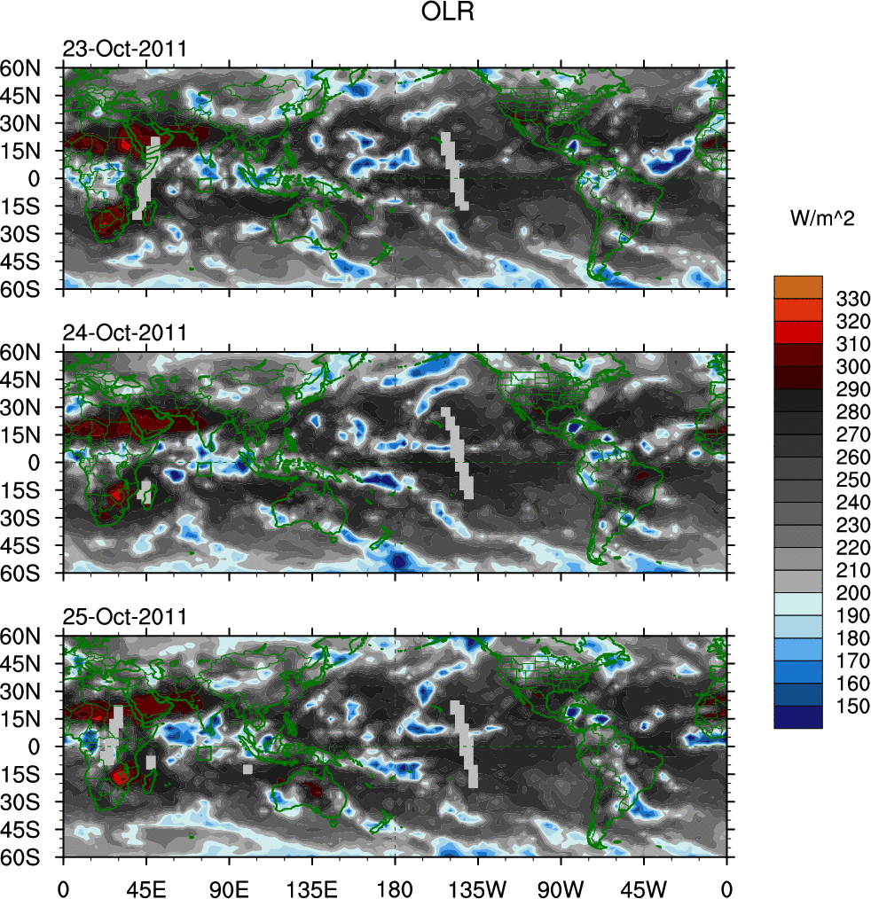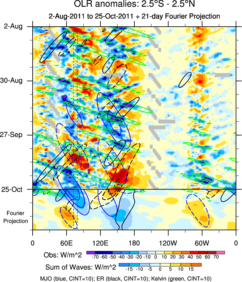 To identify tropical waves in near real-time, the OLR and UTWV data are filtered following Wheeler & Weickmann (2001 MWR). The daily anomalies are calculated using the first 3 harmonics of the seasonal cycle for 1979–2009. Missing values are then filled using linear interpolation in space and time. The most recent 365 days of anomalies are padded with 659 days of zeroes, and the result is filtered for each wave type.