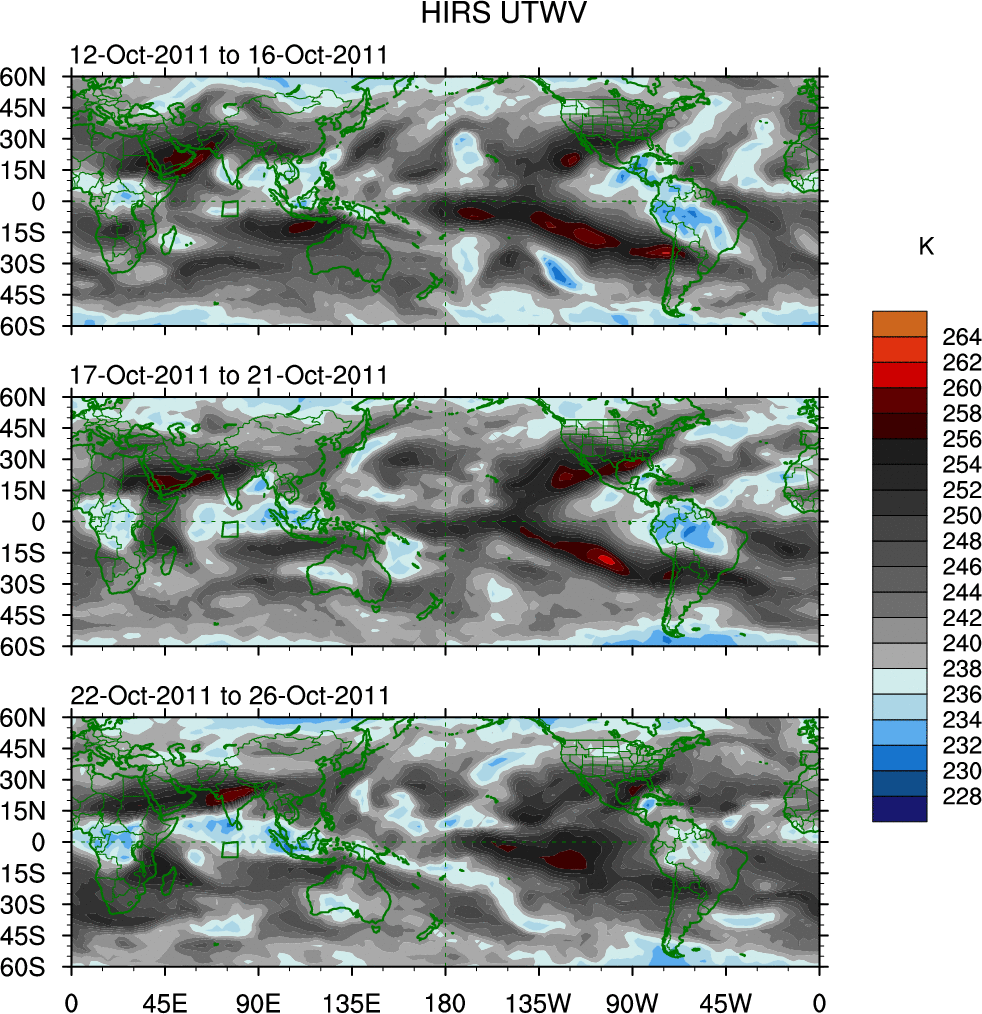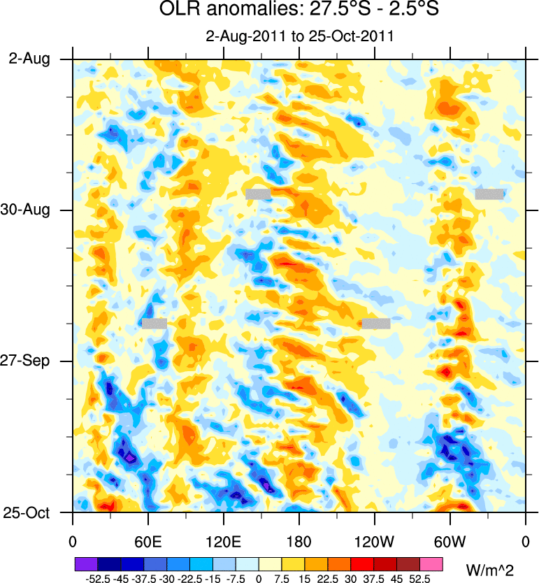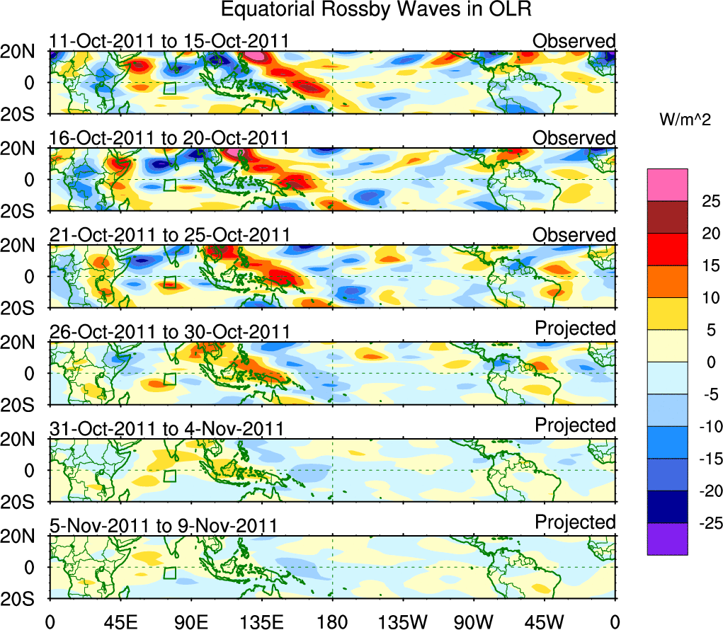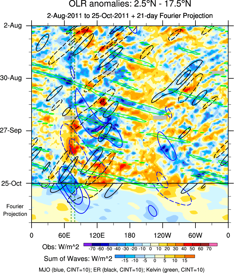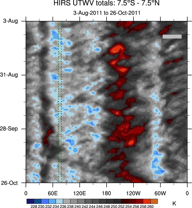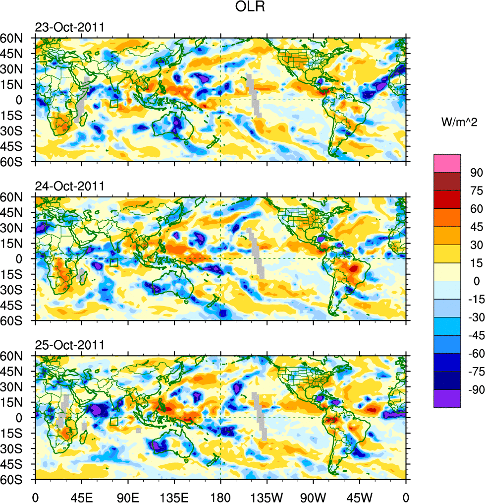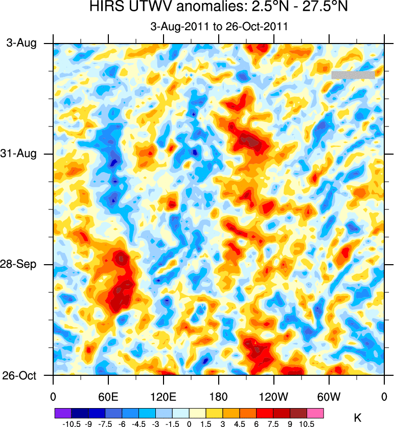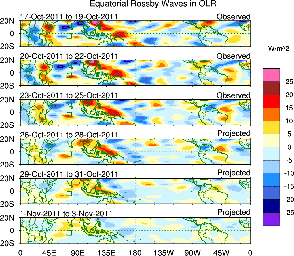 To identify tropical waves in near real-time, the OLR and UTWV data are filtered following Wheeler & Weickmann (2001 MWR). The daily anomalies are calculated using the first 3 harmonics of the seasonal cycle for 1979–2009. Missing values are then filled using linear interpolation in space and time. The most recent 365 days of anomalies are padded with 659 days of zeroes, and the result is filtered for each wave type.