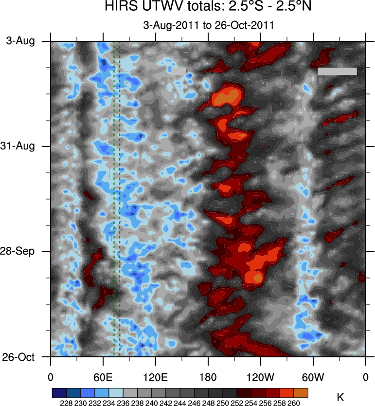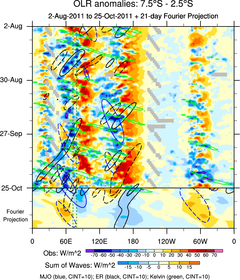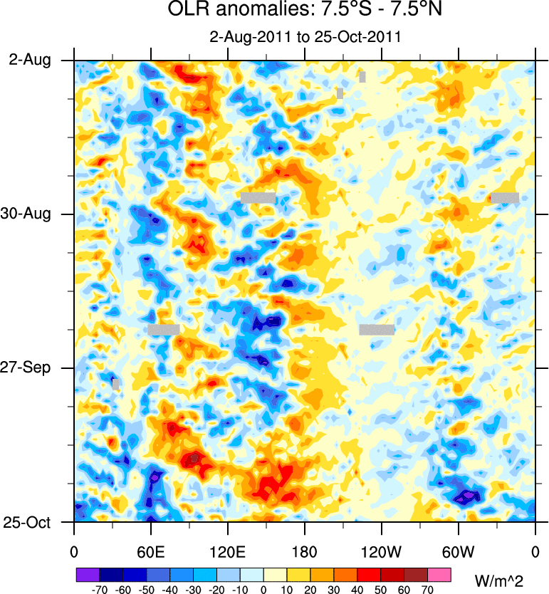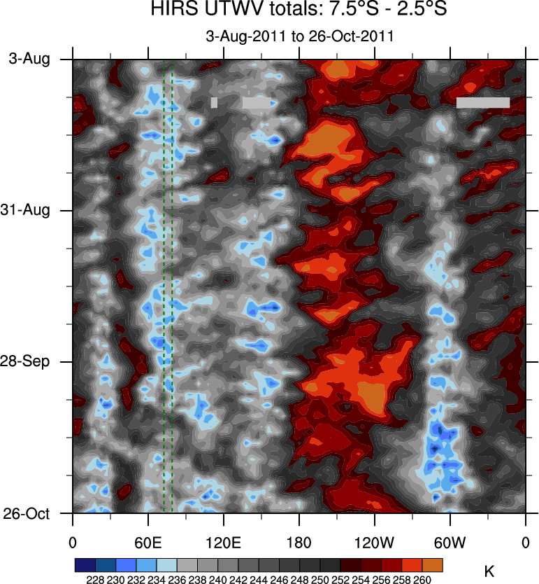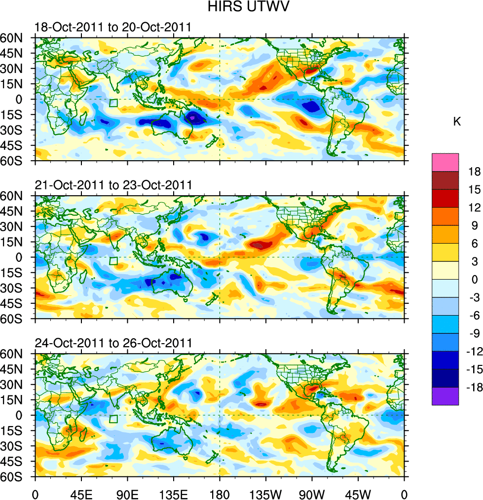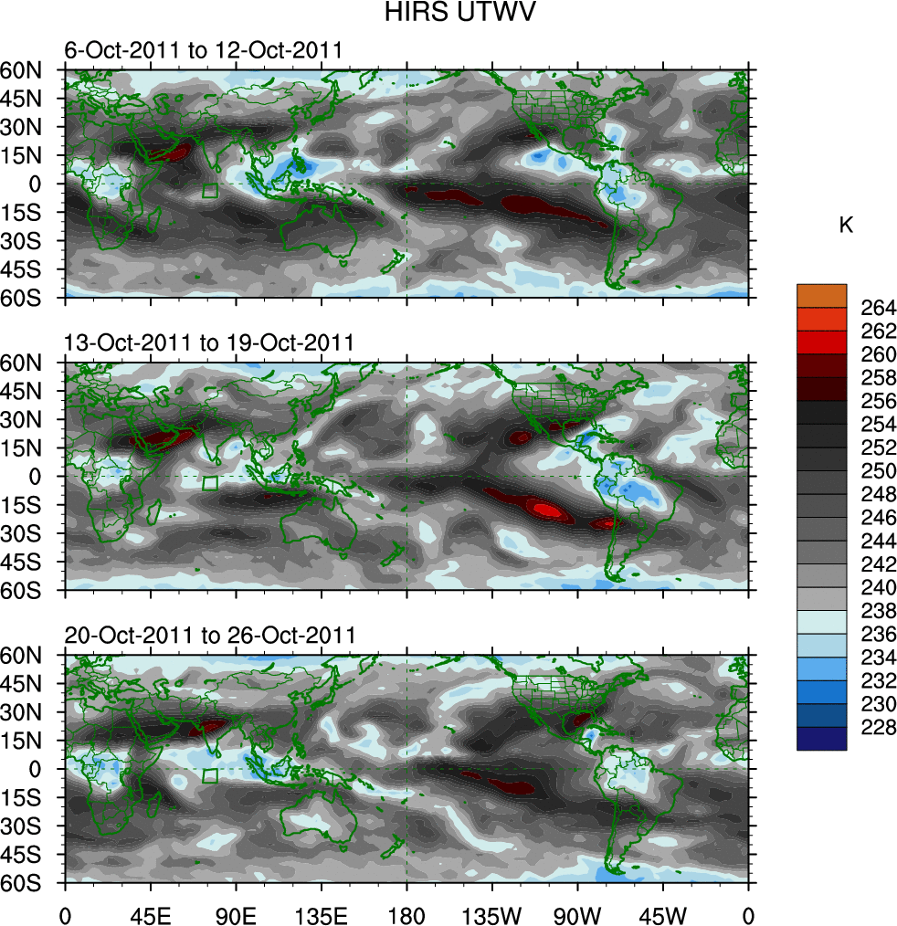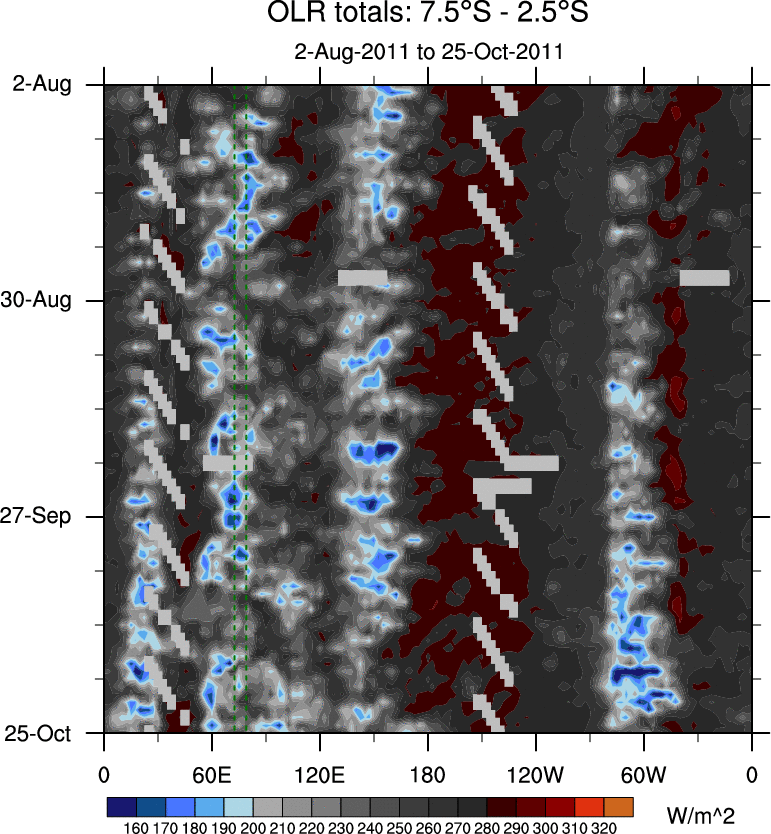 To identify tropical waves in near real-time, the OLR and UTWV data are filtered following Wheeler & Weickmann (2001 MWR). The daily anomalies are calculated using the first 3 harmonics of the seasonal cycle for 1979–2009. Missing values are then filled using linear interpolation in space and time. The most recent 365 days of anomalies are padded with 659 days of zeroes, and the result is filtered for each wave type.
