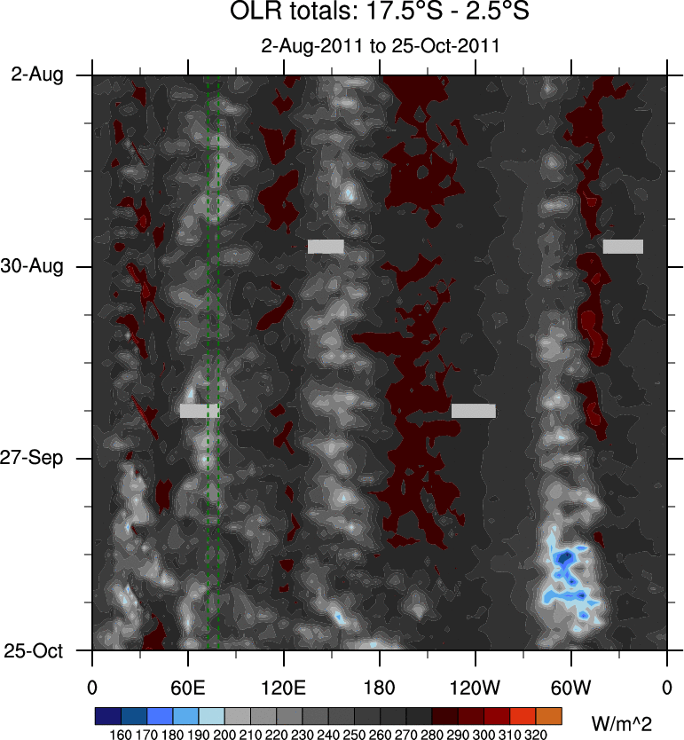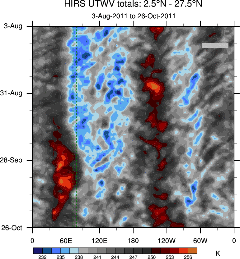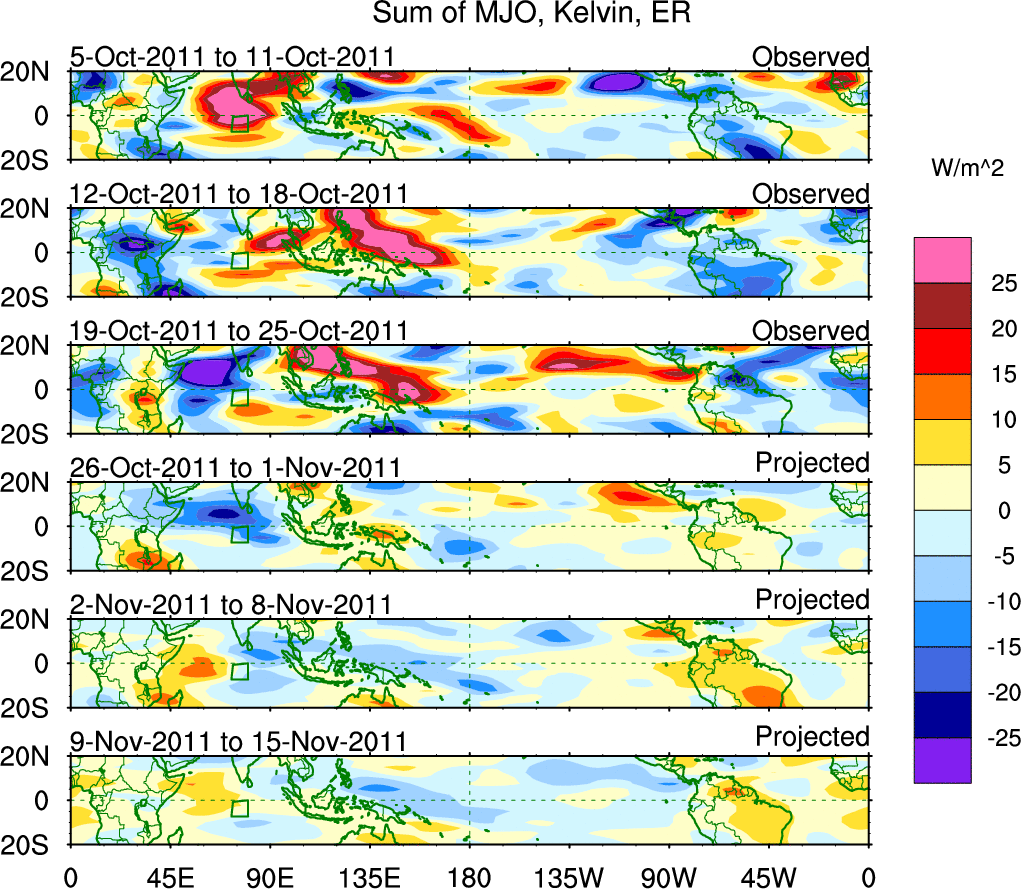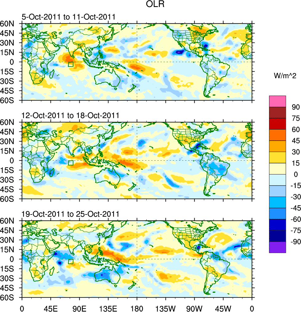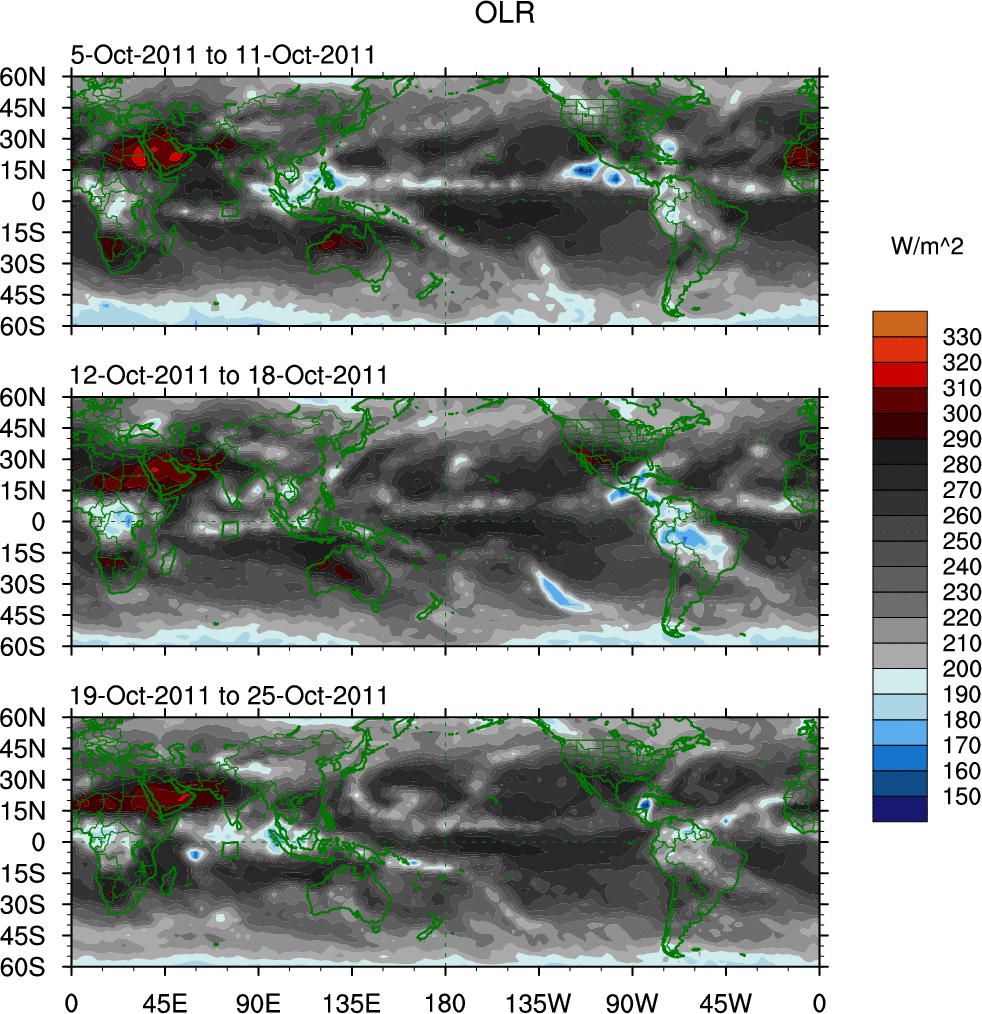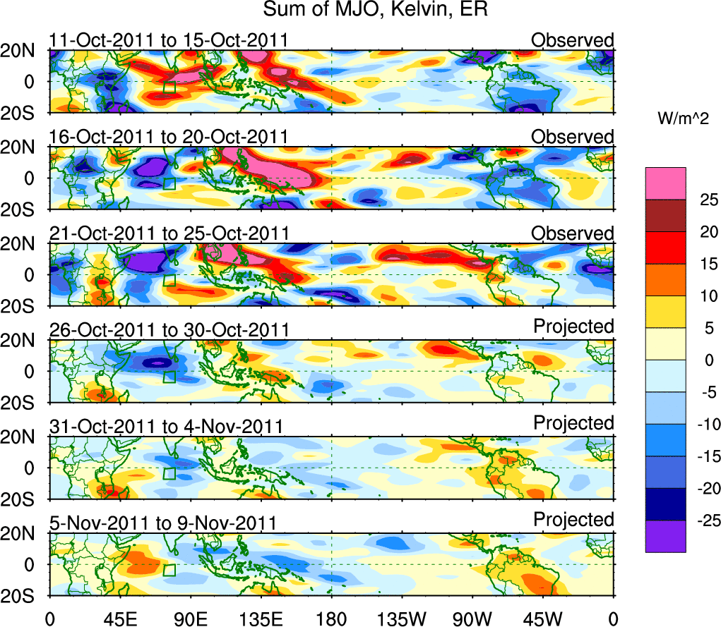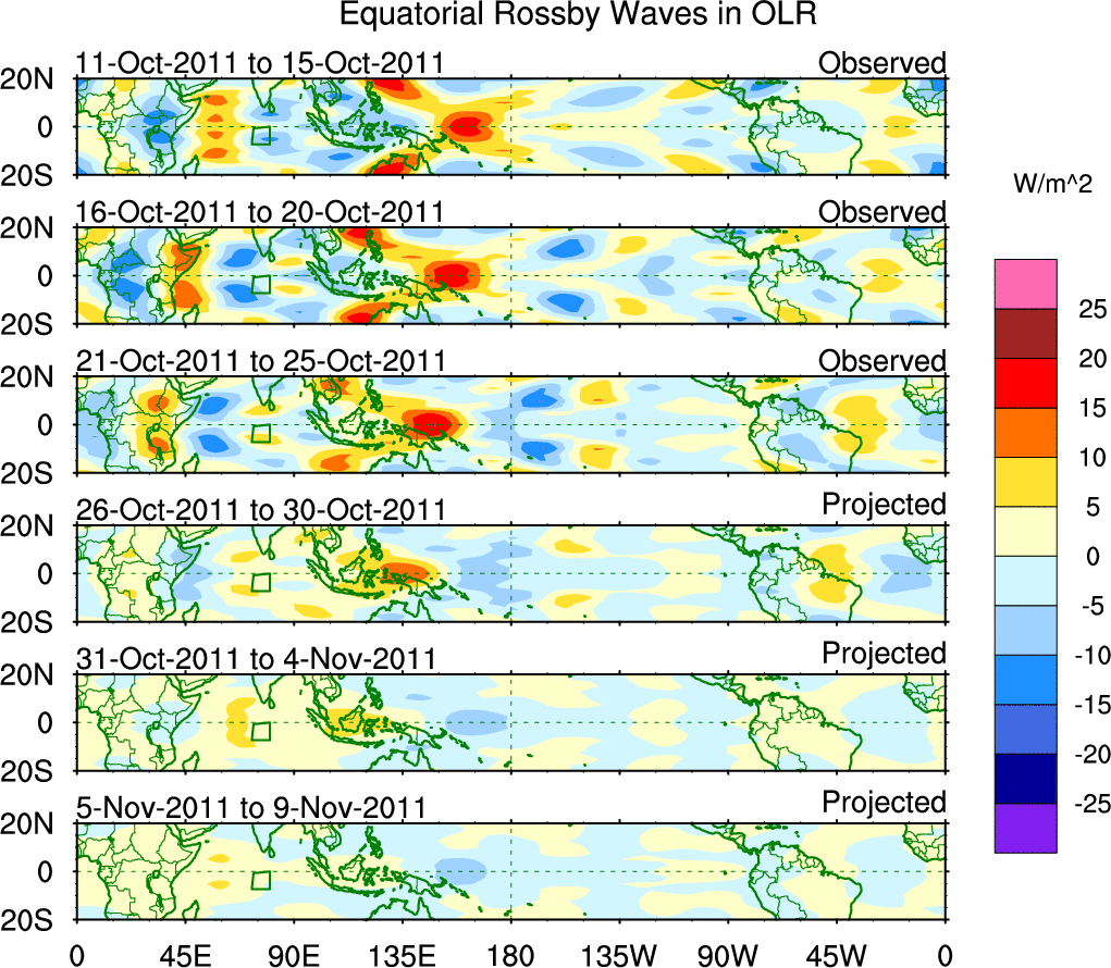 To identify tropical waves in near real-time, the OLR and UTWV data are filtered following Wheeler & Weickmann (2001 MWR). The daily anomalies are calculated using the first 3 harmonics of the seasonal cycle for 1979–2009. Missing values are then filled using linear interpolation in space and time. The most recent 365 days of anomalies are padded with 659 days of zeroes, and the result is filtered for each wave type.