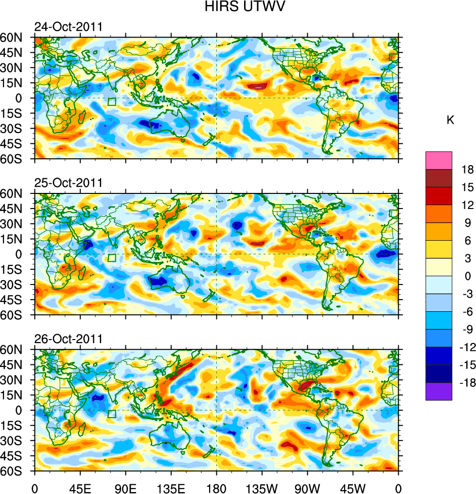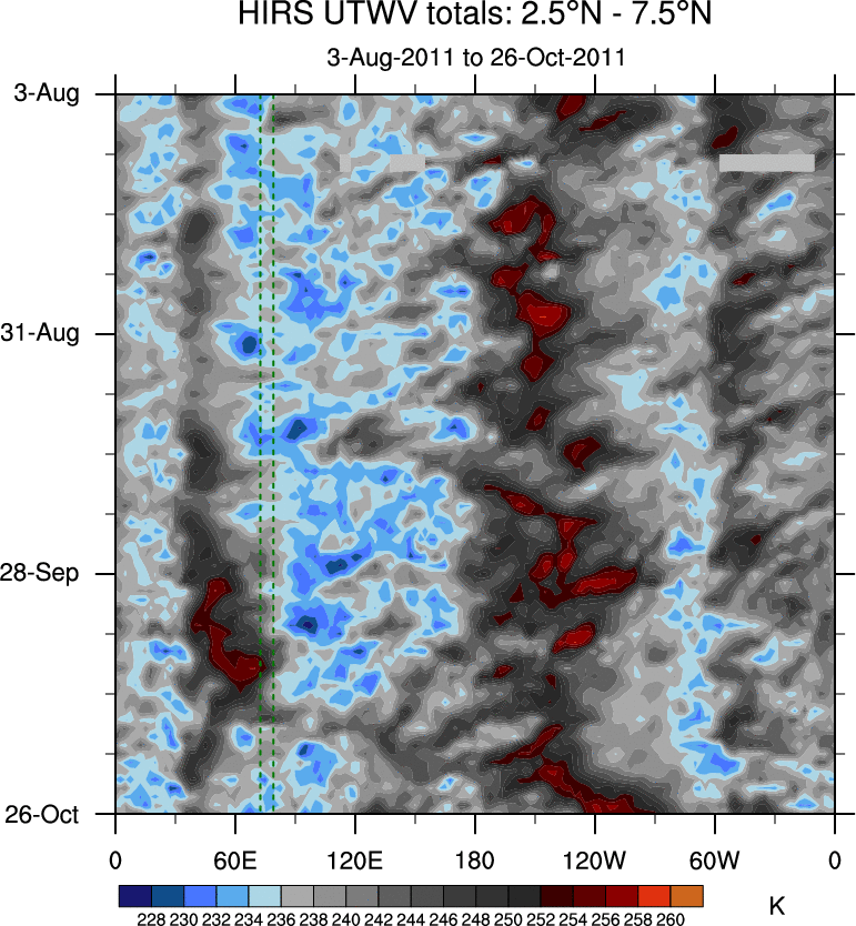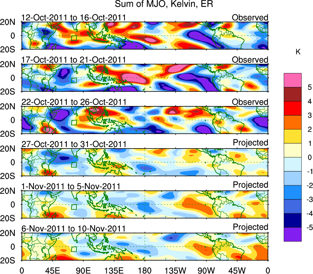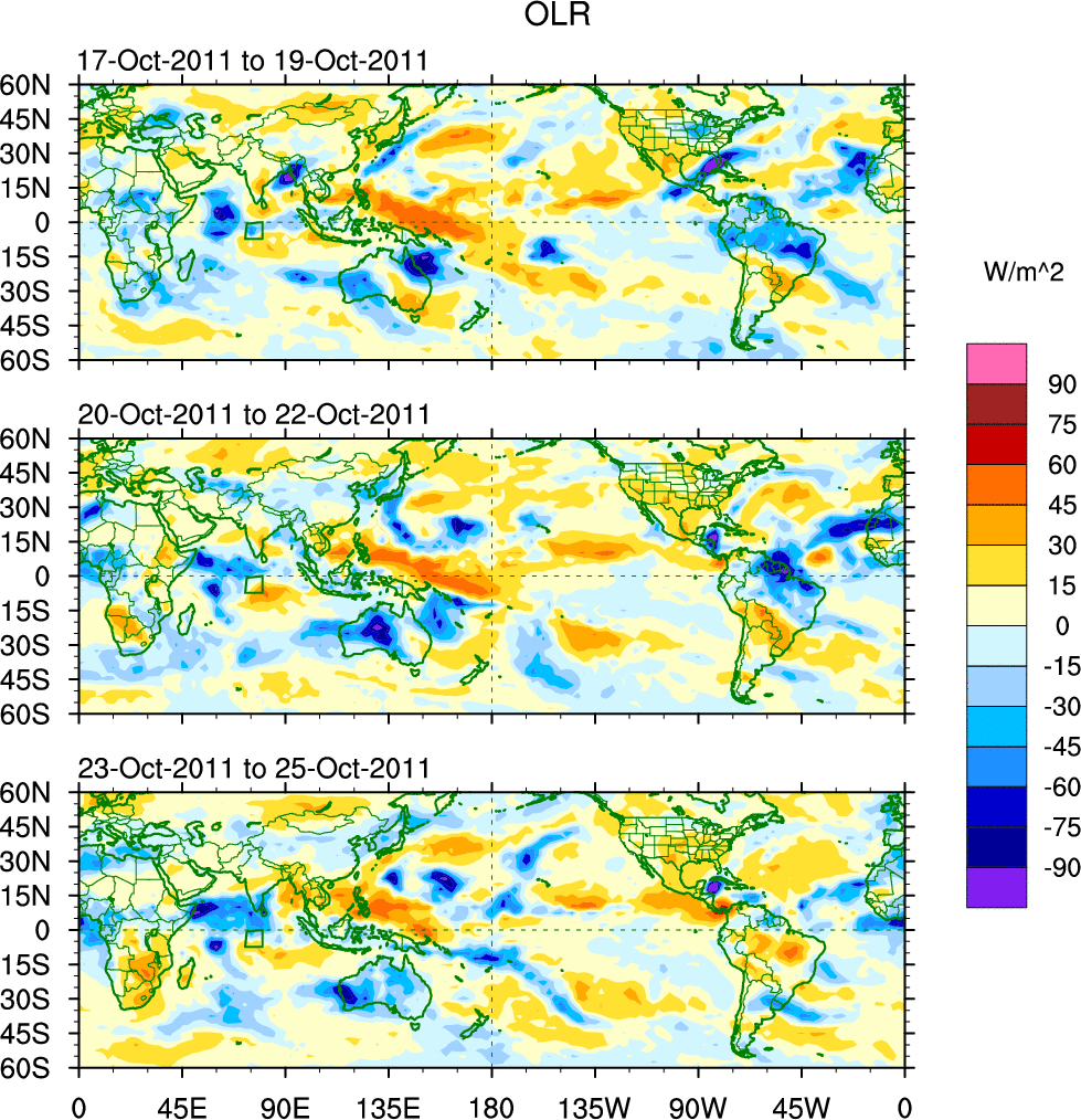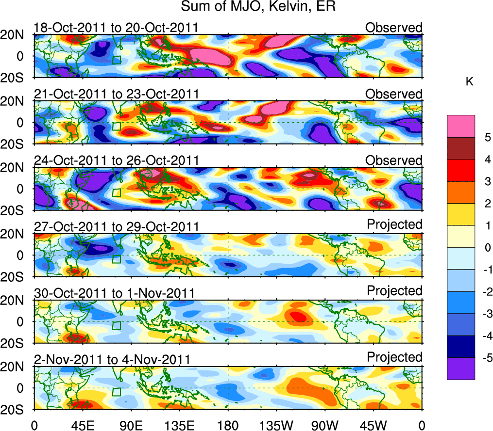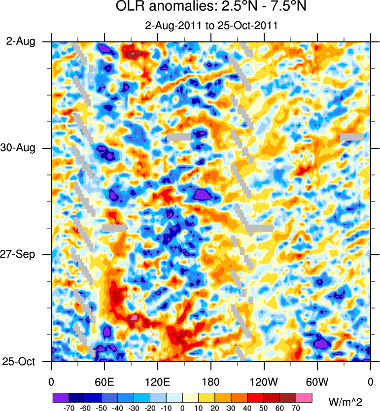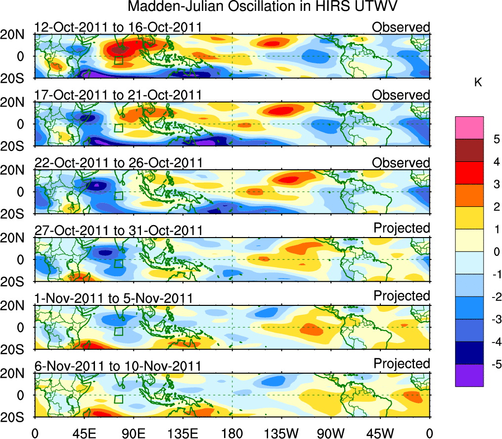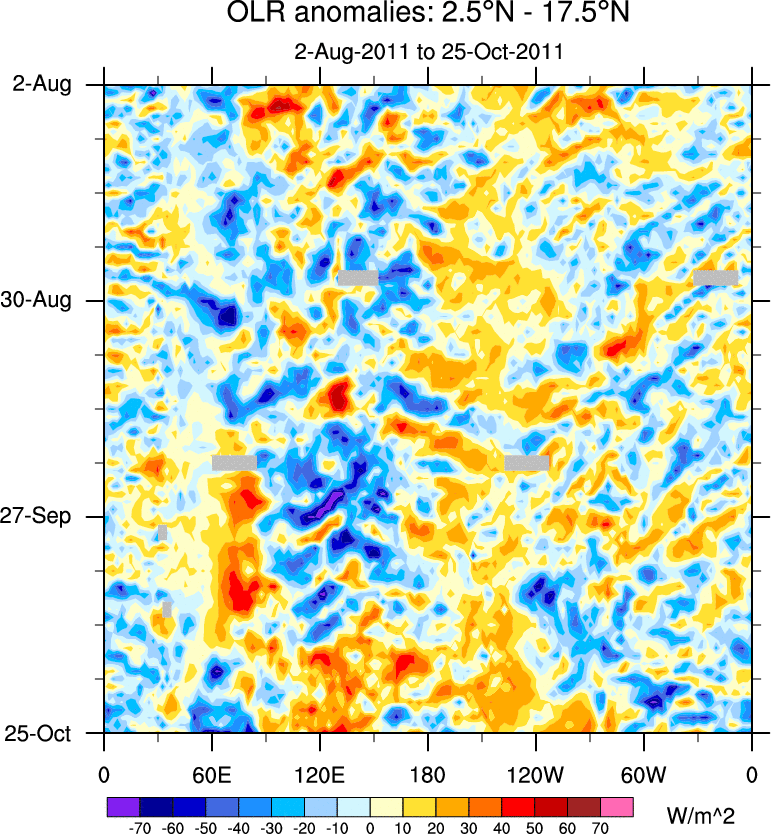 To identify tropical waves in near real-time, the OLR and UTWV data are filtered following Wheeler & Weickmann (2001 MWR). The daily anomalies are calculated using the first 3 harmonics of the seasonal cycle for 1979–2009. Missing values are then filled using linear interpolation in space and time. The most recent 365 days of anomalies are padded with 659 days of zeroes, and the result is filtered for each wave type.
