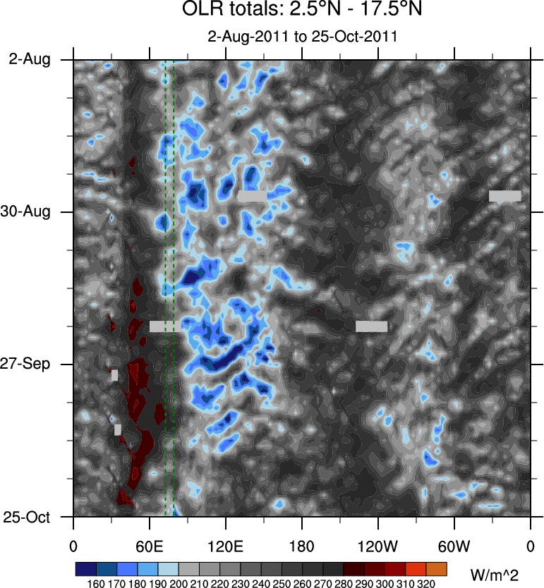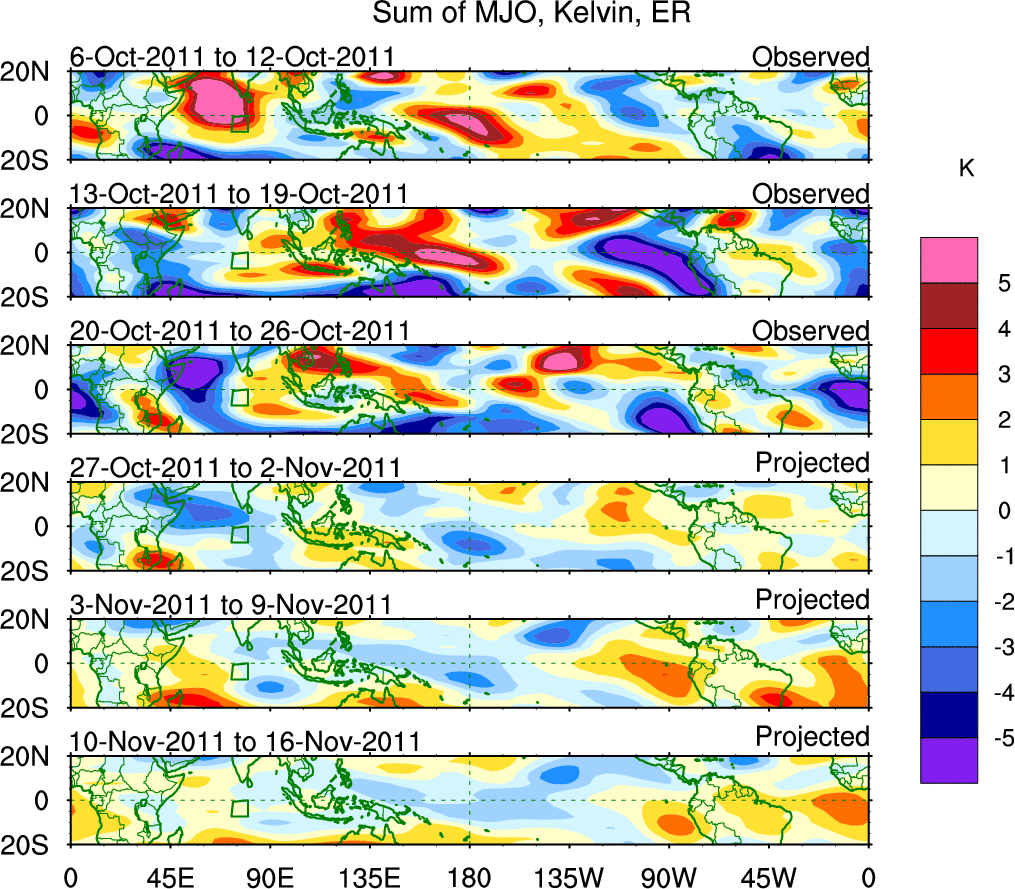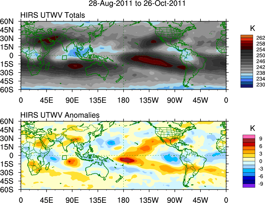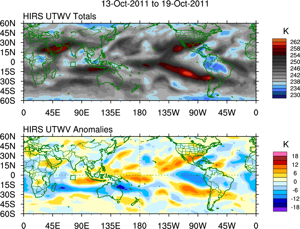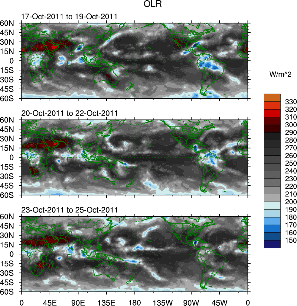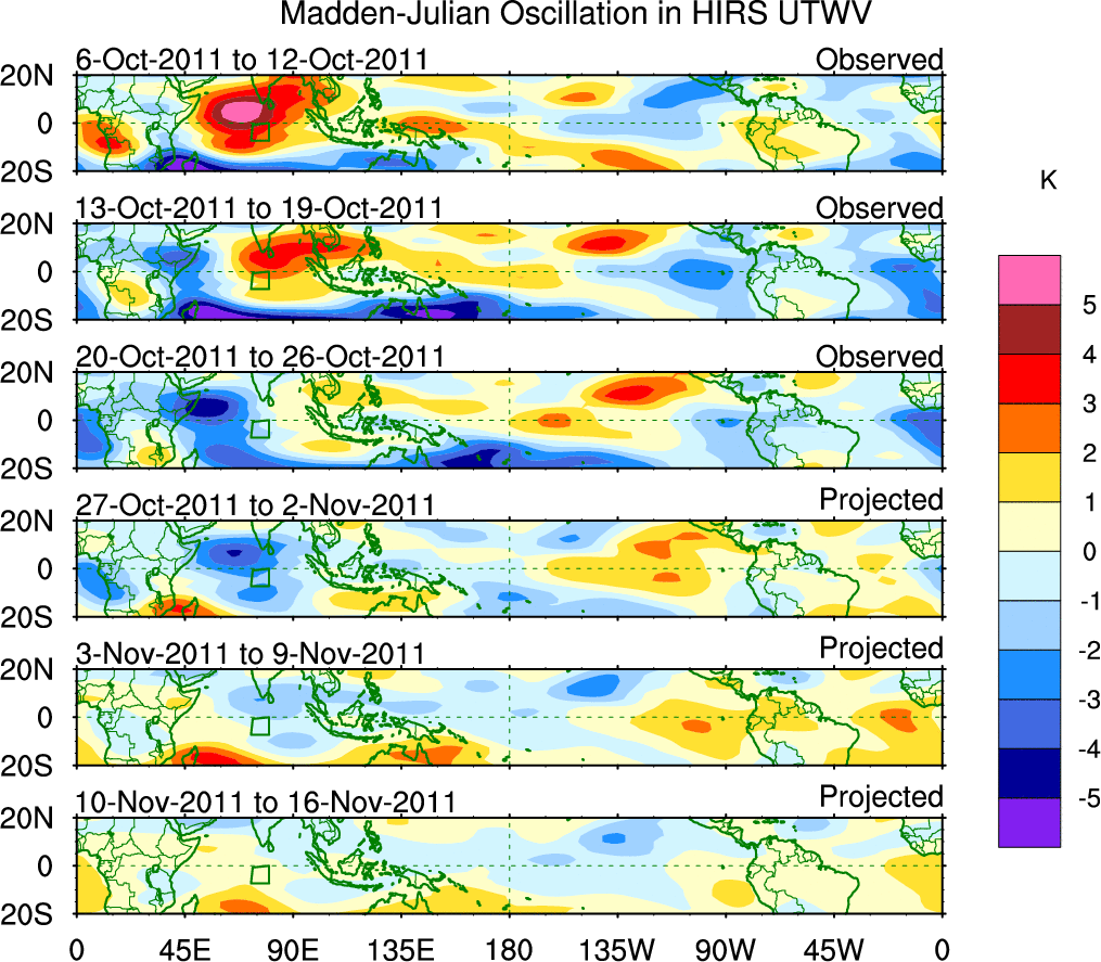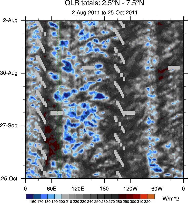To identify tropical waves in near real-time, the OLR and UTWV data are filtered following Wheeler & Weickmann (2001 MWR). The daily anomalies are calculated using the first 3 harmonics of the seasonal cycle for 1979–2009. Missing values are then filled using linear interpolation in space and time. The most recent 365 days of anomalies are padded with 659 days of zeroes, and the result is filtered for each wave type.