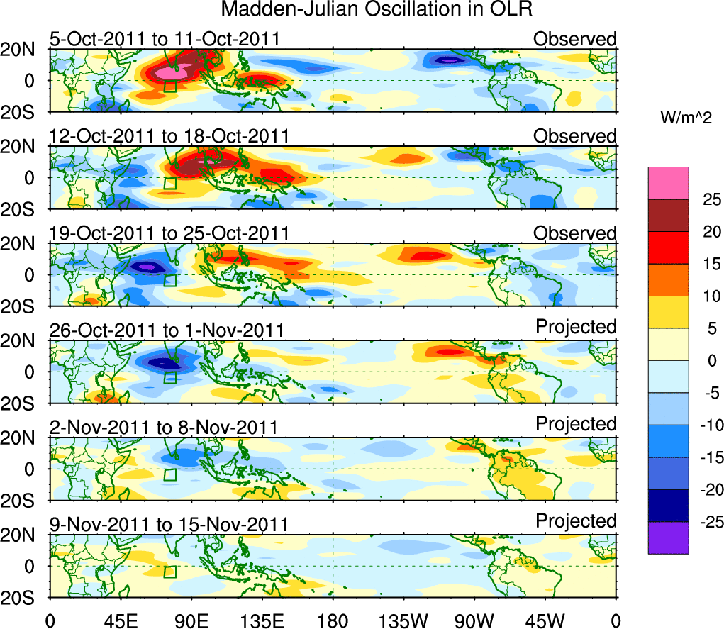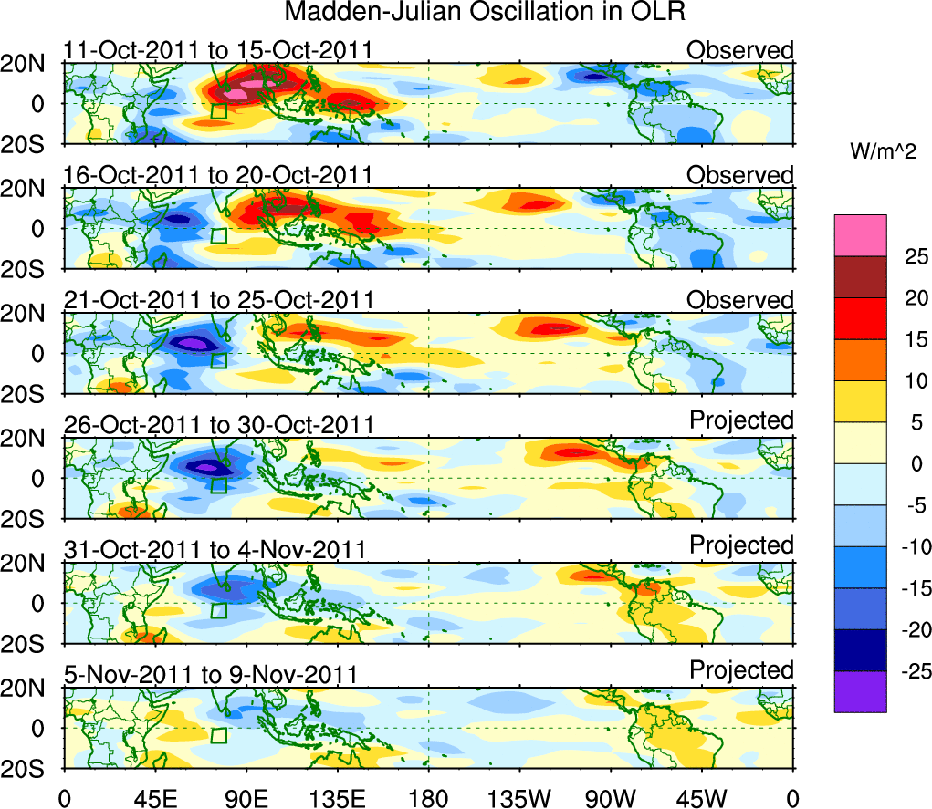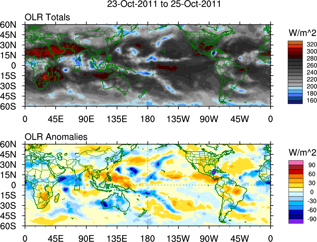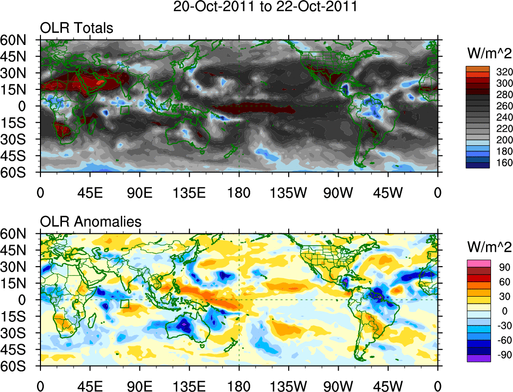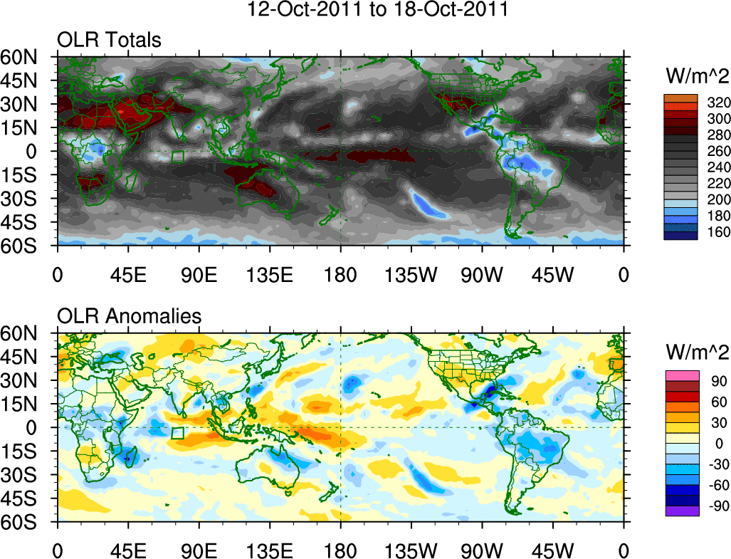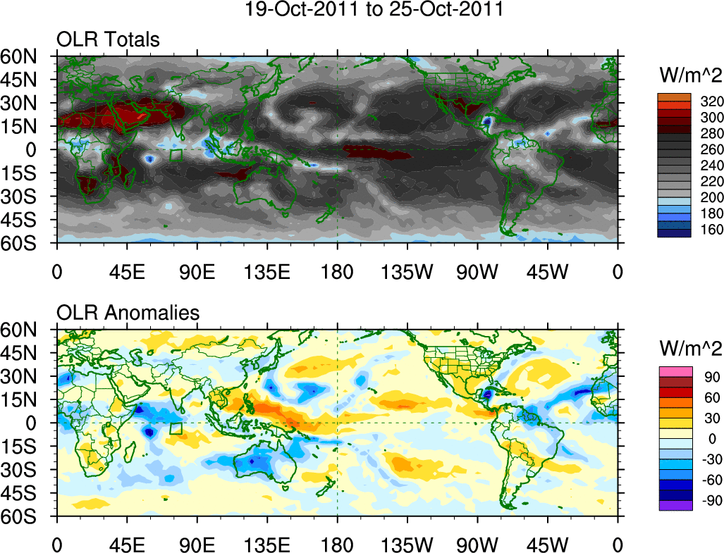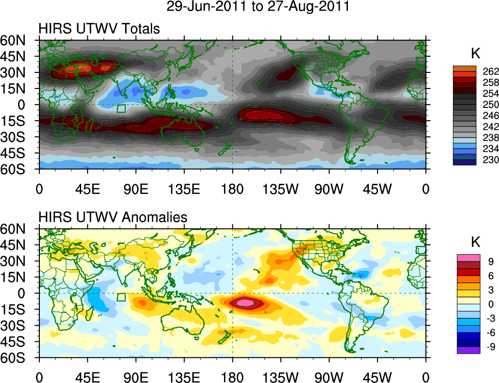 To identify tropical waves in near real-time, the OLR and UTWV data are filtered following Wheeler & Weickmann (2001 MWR). The daily anomalies are calculated using the first 3 harmonics of the seasonal cycle for 1979–2009. Missing values are then filled using linear interpolation in space and time. The most recent 365 days of anomalies are padded with 659 days of zeroes, and the result is filtered for each wave type.