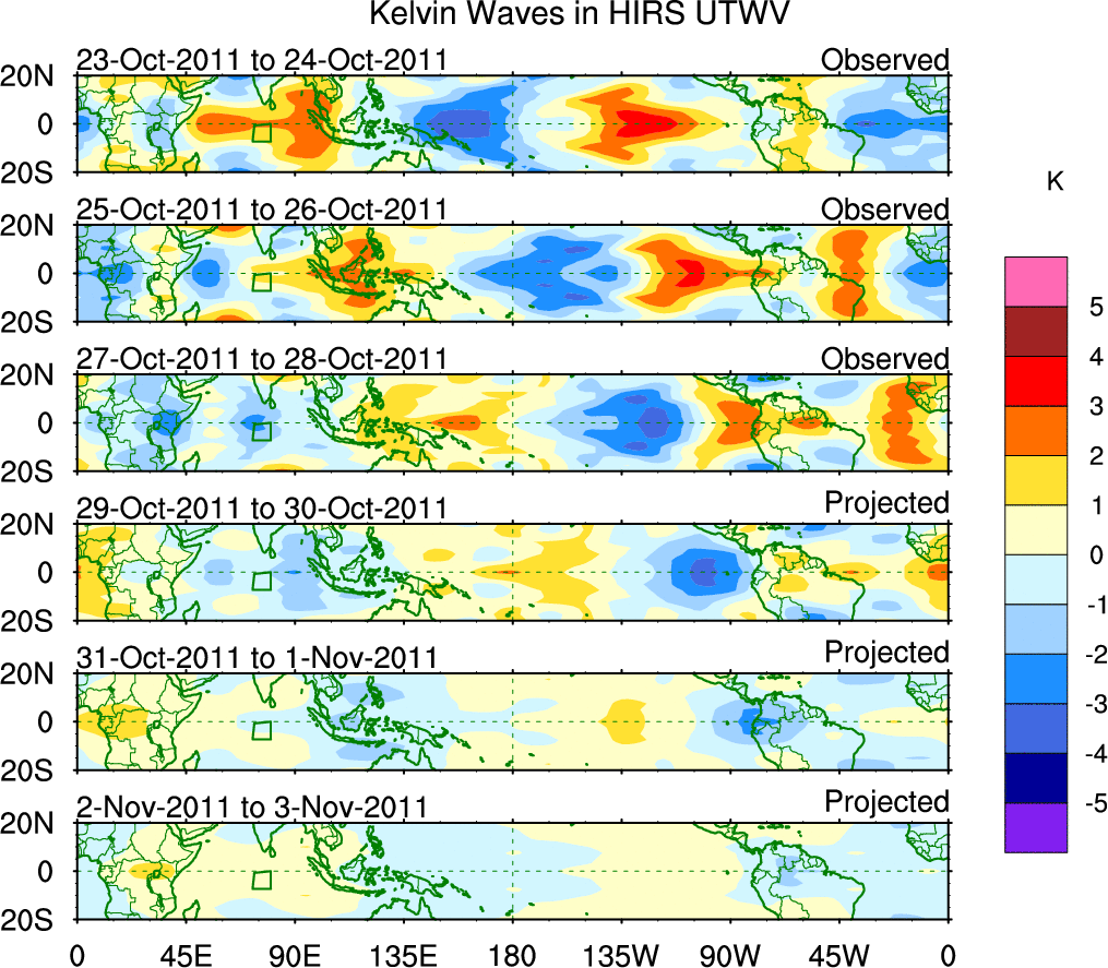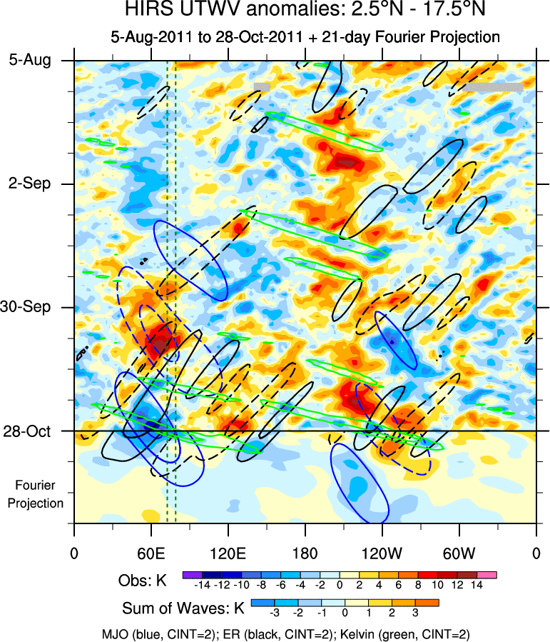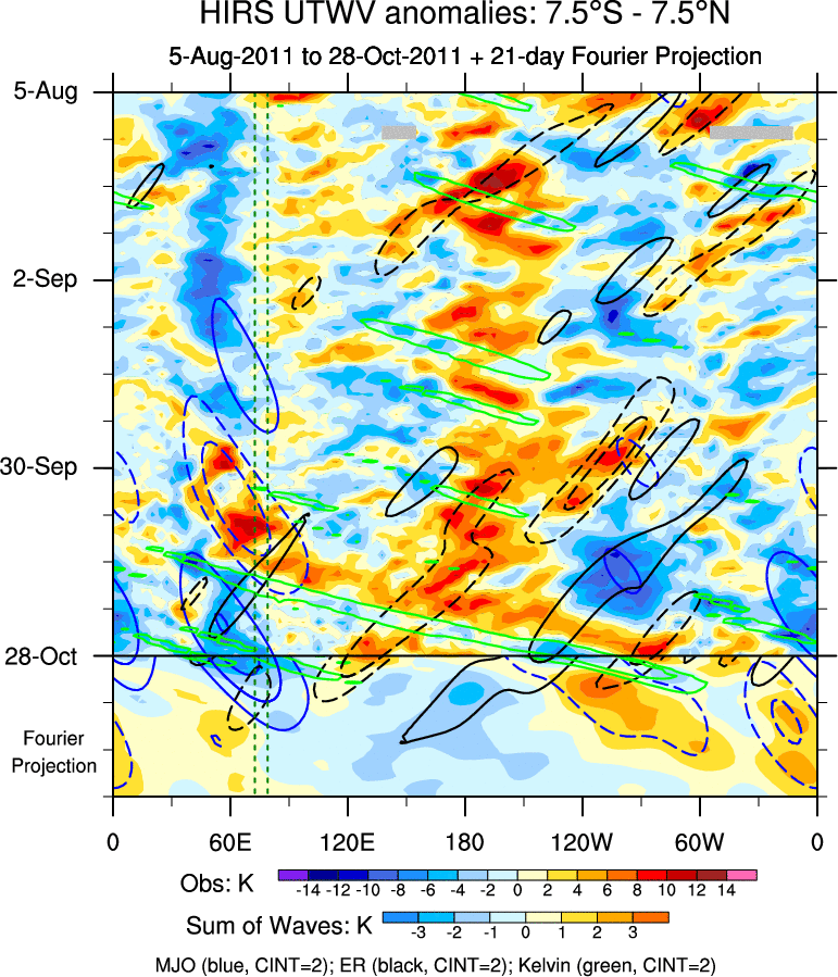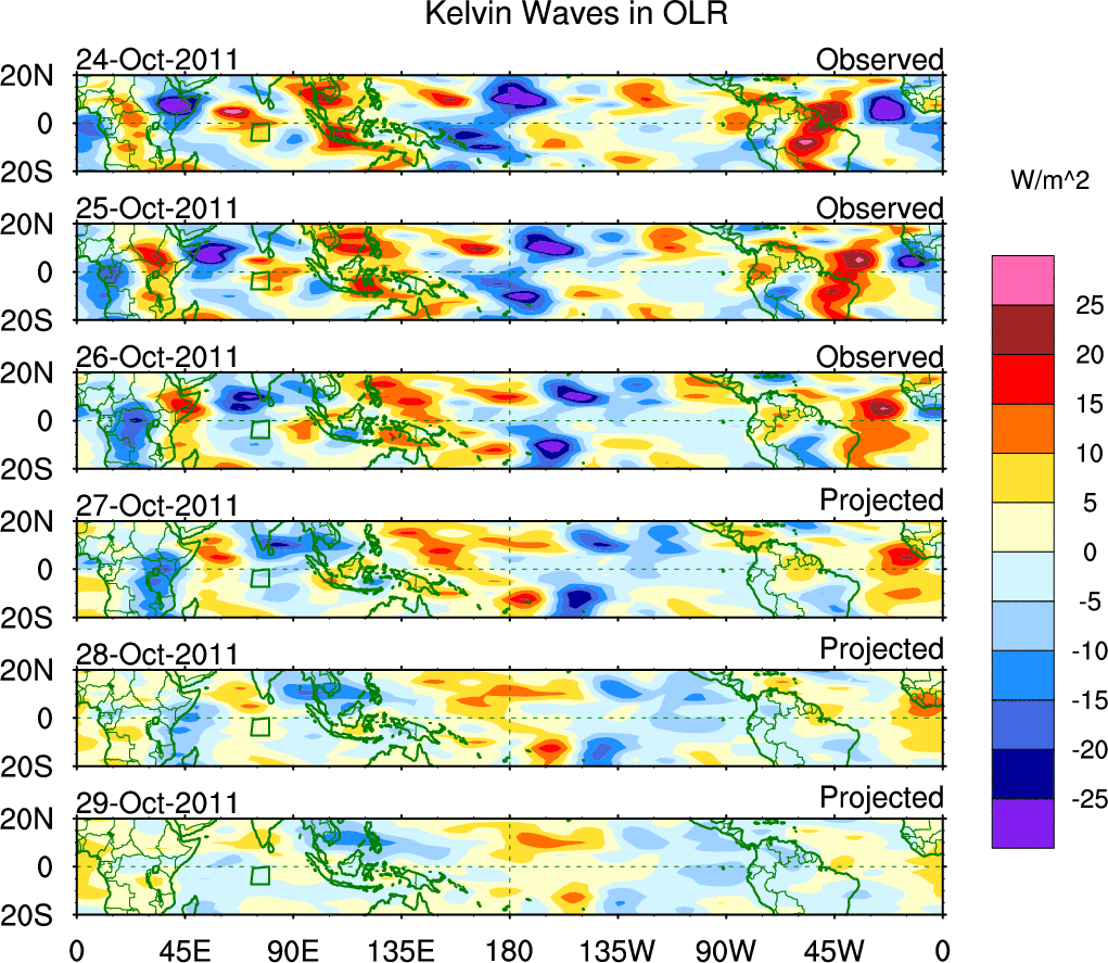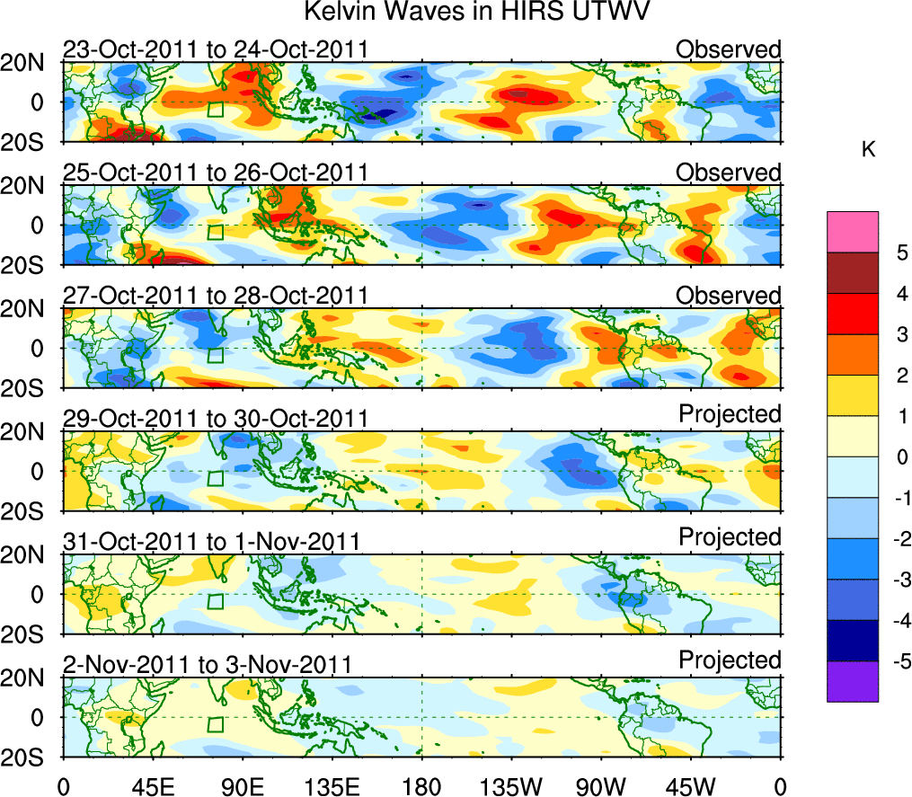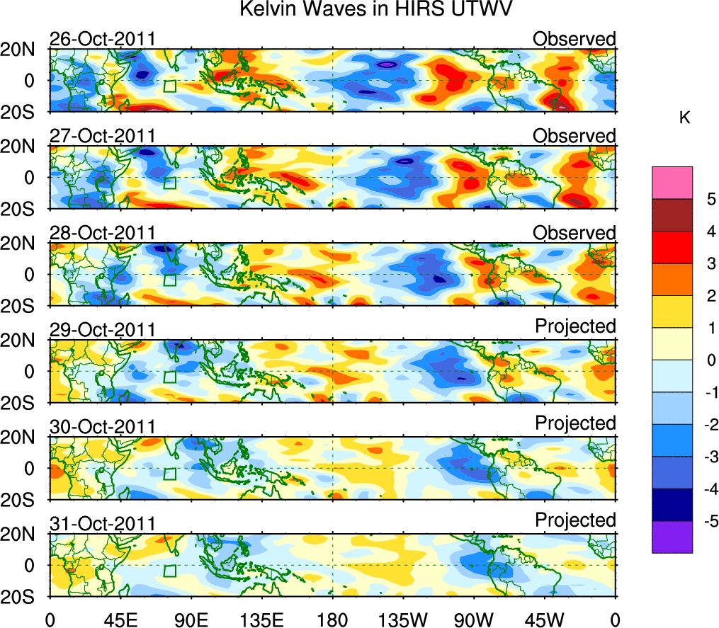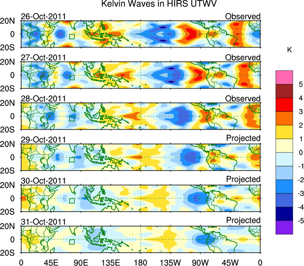 To identify tropical waves in near real-time, the OLR and UTWV data are filtered following Wheeler & Weickmann (2001 MWR). The daily anomalies are calculated using the first 3 harmonics of the seasonal cycle for 1979–2009. Missing values are then filled using linear interpolation in space and time. The most recent 365 days of anomalies are padded with 659 days of zeroes, and the result is filtered for each wave type.