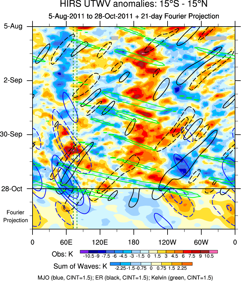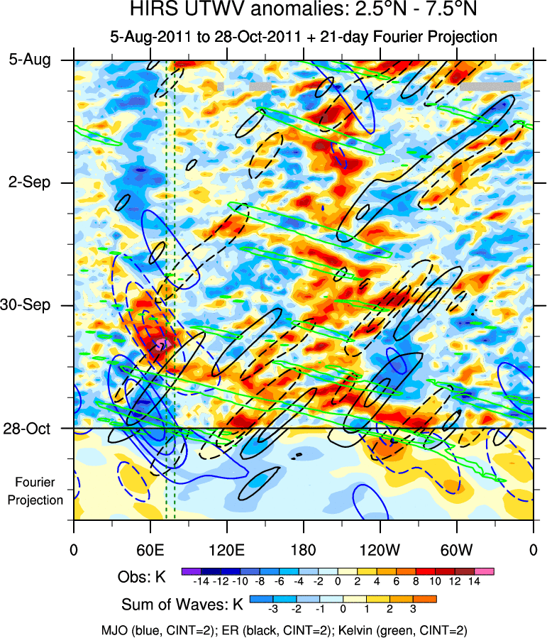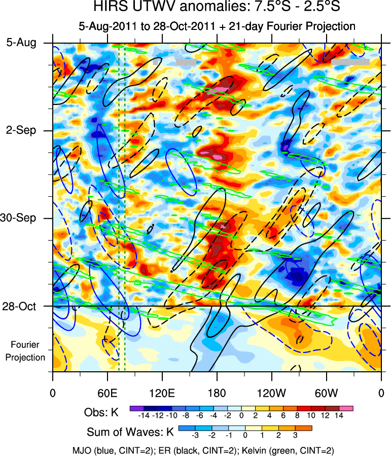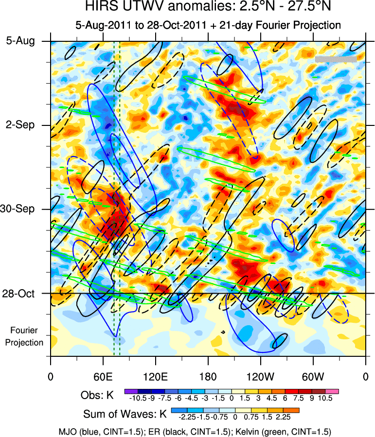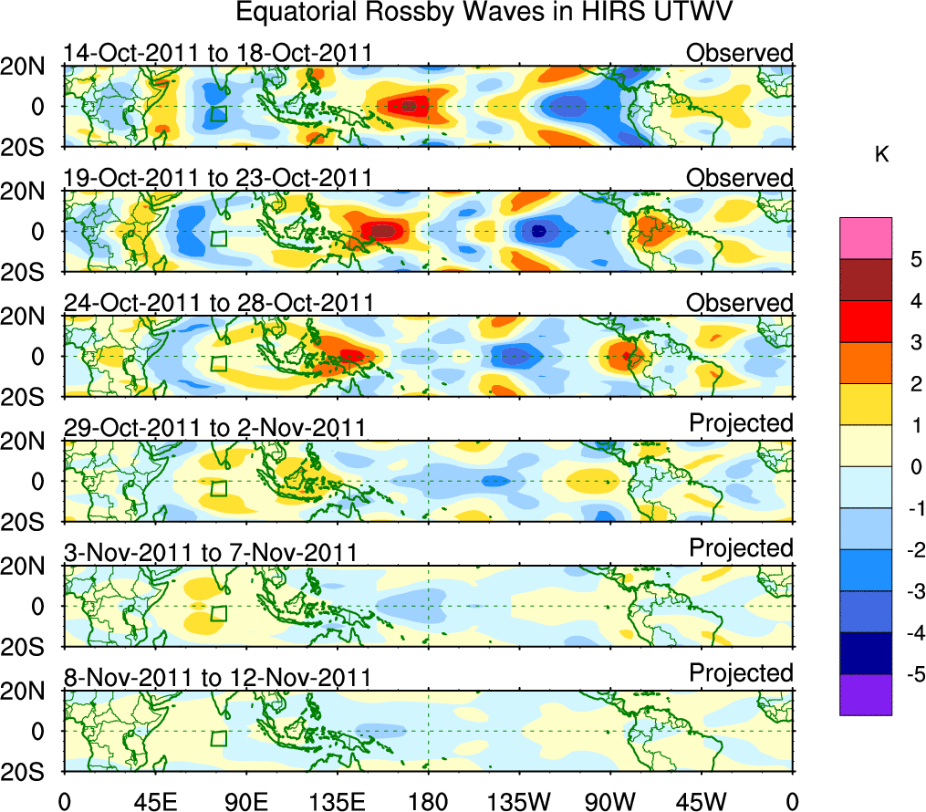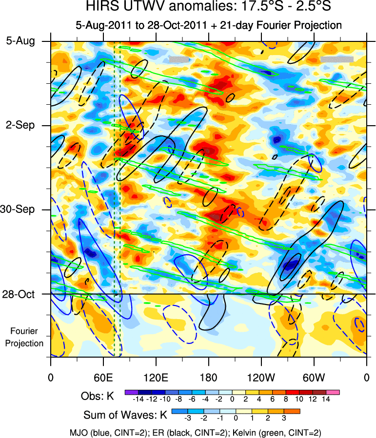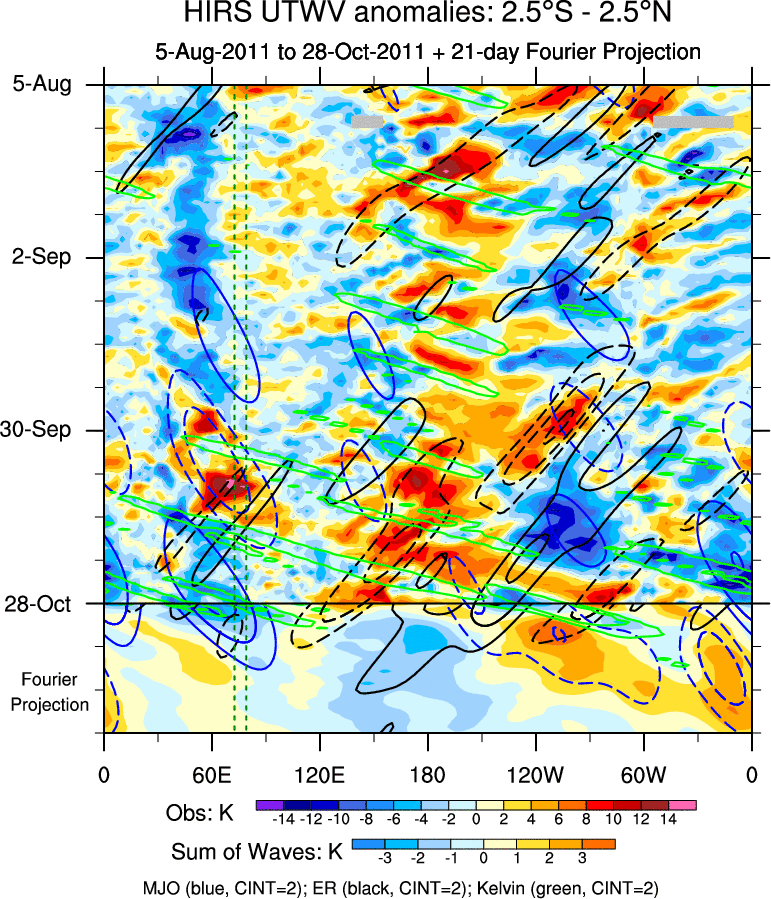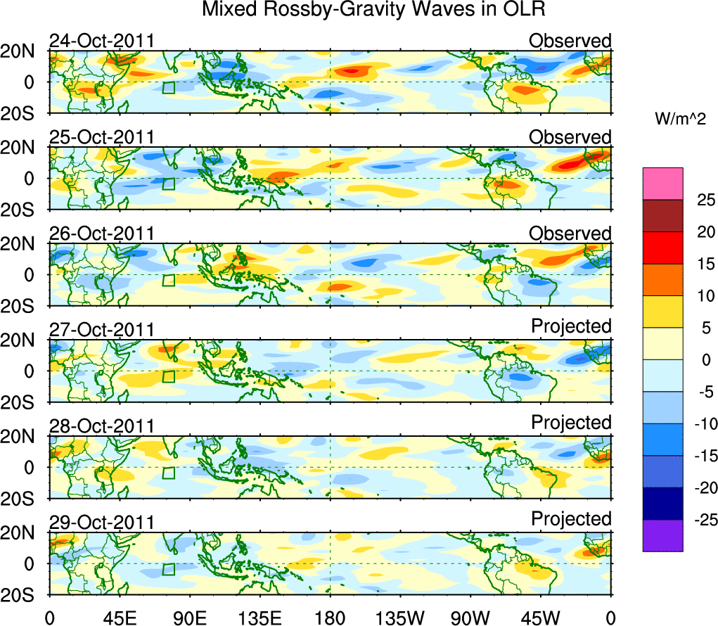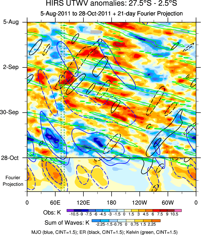 To identify tropical waves in near real-time, the OLR and UTWV data are filtered following Wheeler & Weickmann (2001 MWR). The daily anomalies are calculated using the first 3 harmonics of the seasonal cycle for 1979–2009. Missing values are then filled using linear interpolation in space and time. The most recent 365 days of anomalies are padded with 659 days of zeroes, and the result is filtered for each wave type.