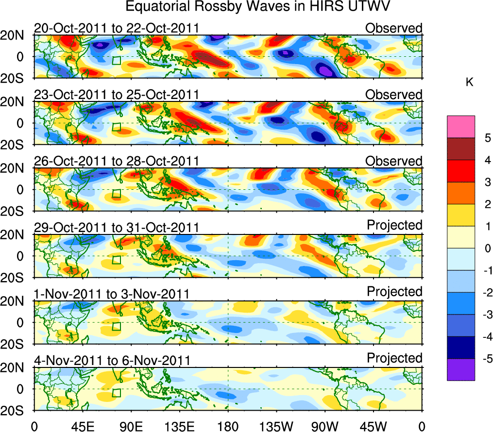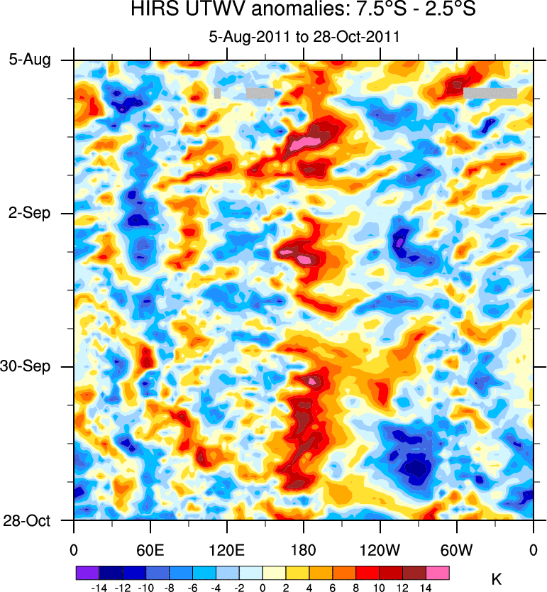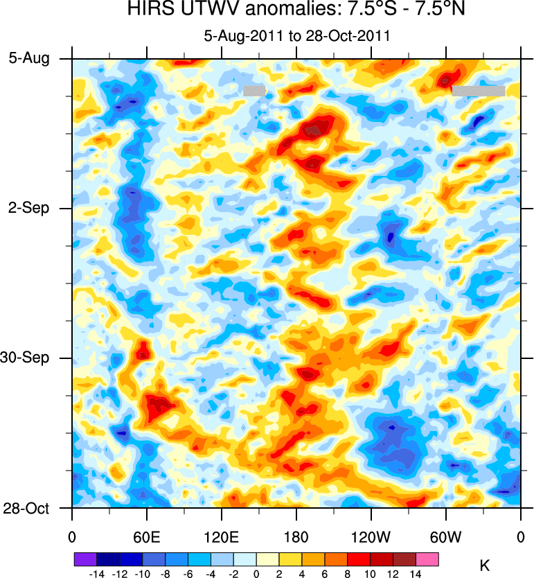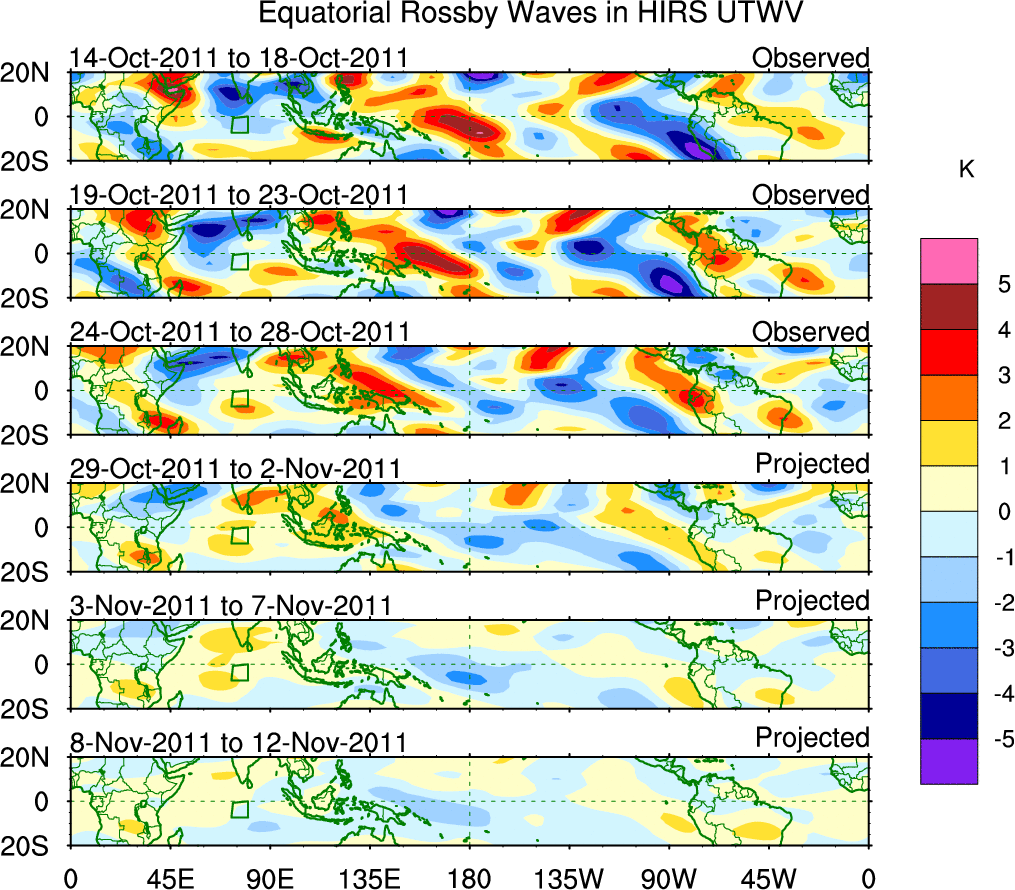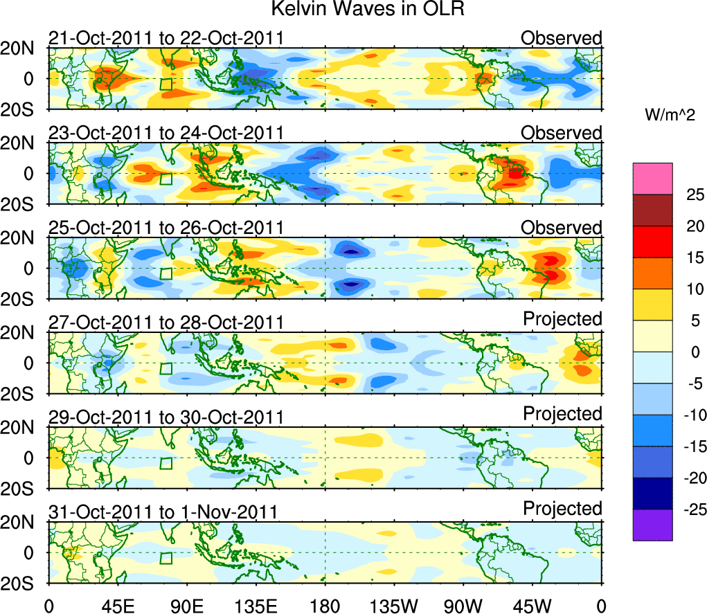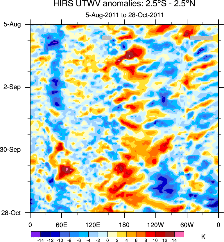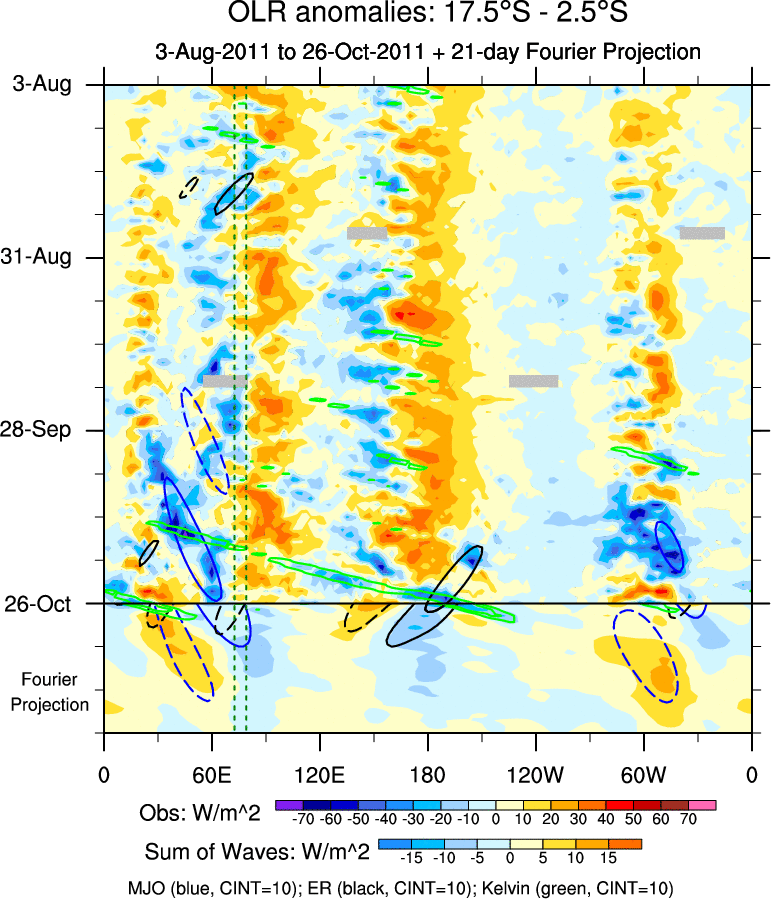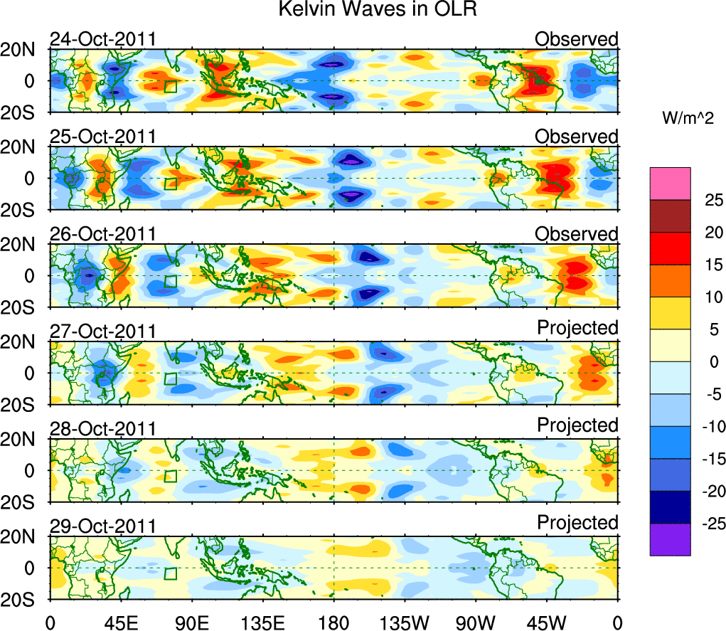 To identify tropical waves in near real-time, the OLR and UTWV data are filtered following Wheeler & Weickmann (2001 MWR). The daily anomalies are calculated using the first 3 harmonics of the seasonal cycle for 1979–2009. Missing values are then filled using linear interpolation in space and time. The most recent 365 days of anomalies are padded with 659 days of zeroes, and the result is filtered for each wave type.