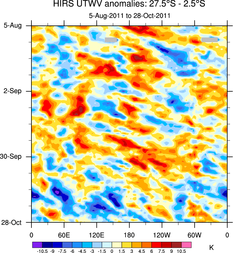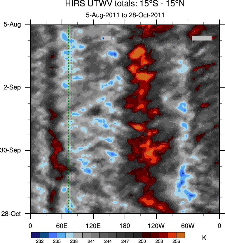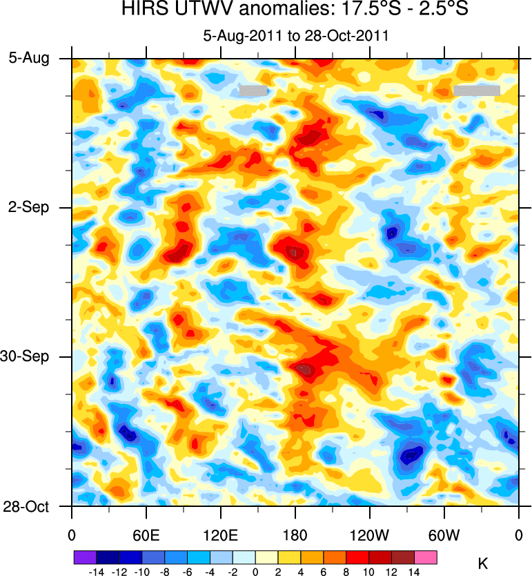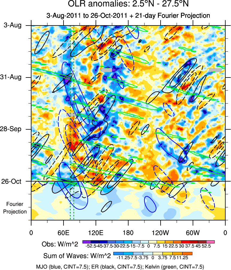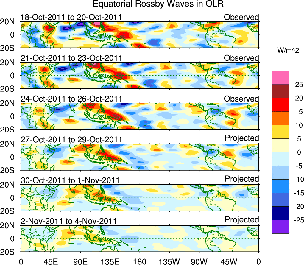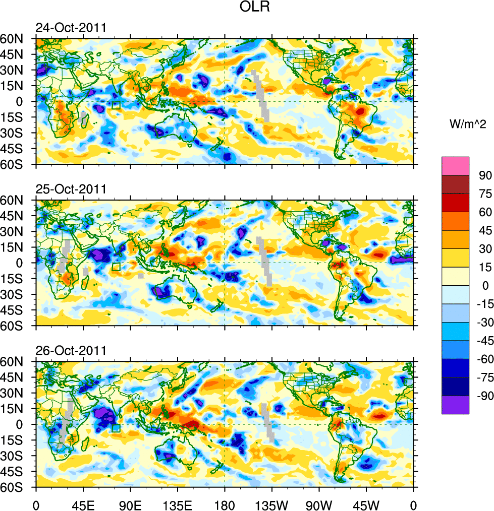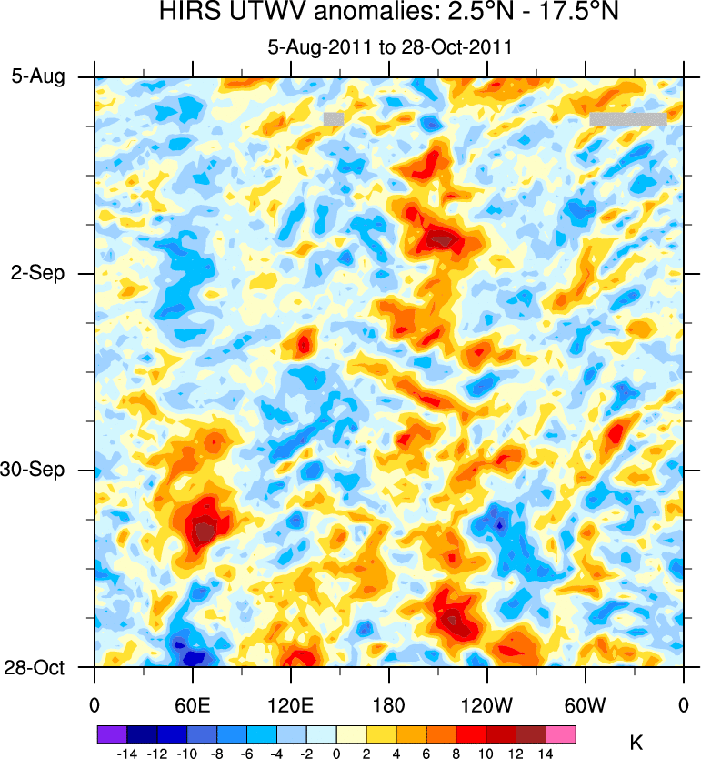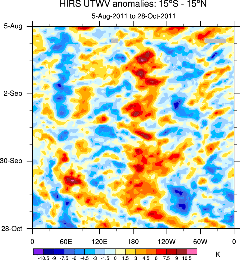 To identify tropical waves in near real-time, the OLR and UTWV data are filtered following Wheeler & Weickmann (2001 MWR). The daily anomalies are calculated using the first 3 harmonics of the seasonal cycle for 1979–2009. Missing values are then filled using linear interpolation in space and time. The most recent 365 days of anomalies are padded with 659 days of zeroes, and the result is filtered for each wave type.