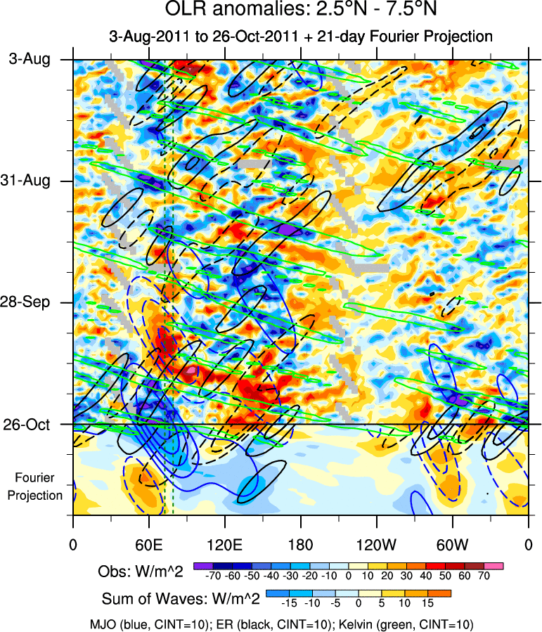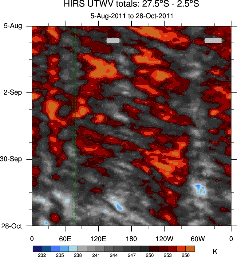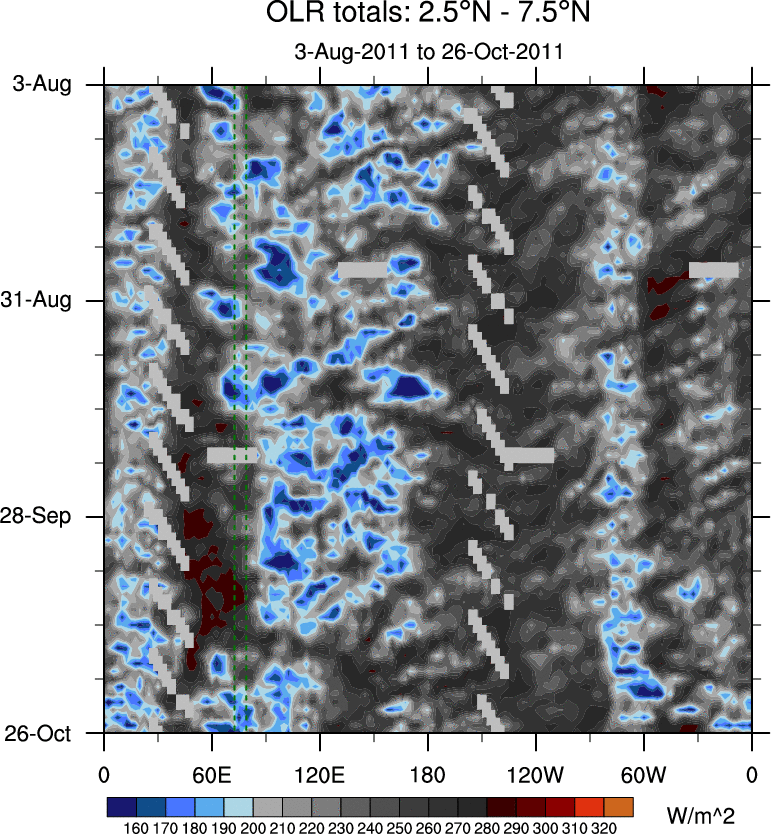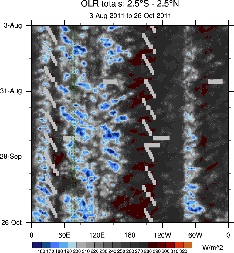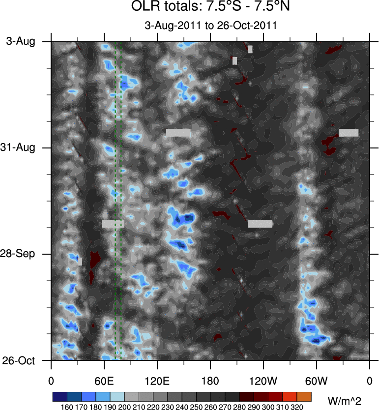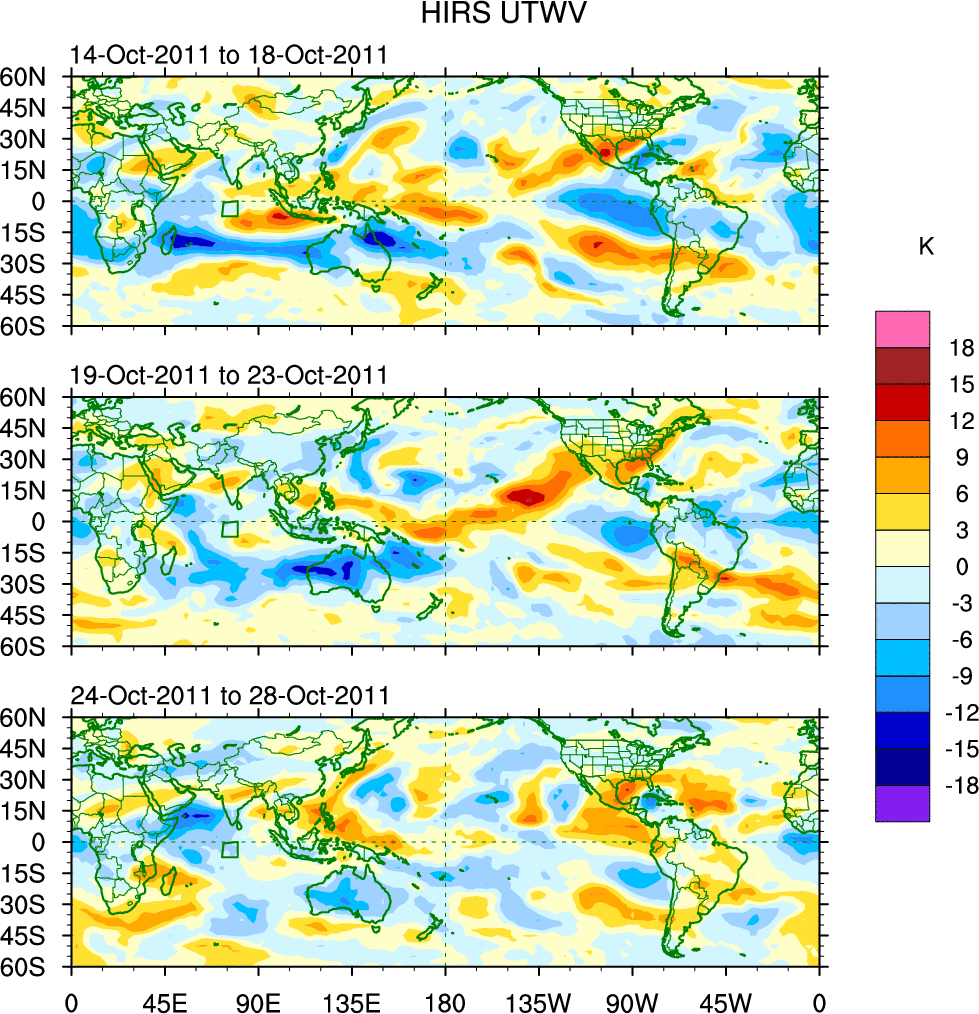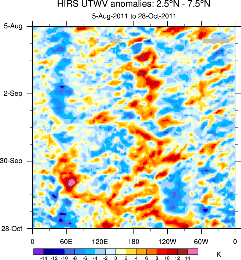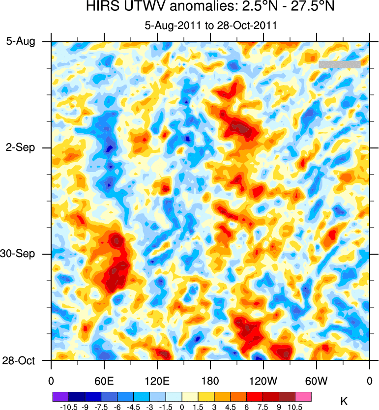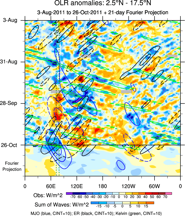 To identify tropical waves in near real-time, the OLR and UTWV data are filtered following Wheeler & Weickmann (2001 MWR). The daily anomalies are calculated using the first 3 harmonics of the seasonal cycle for 1979–2009. Missing values are then filled using linear interpolation in space and time. The most recent 365 days of anomalies are padded with 659 days of zeroes, and the result is filtered for each wave type.