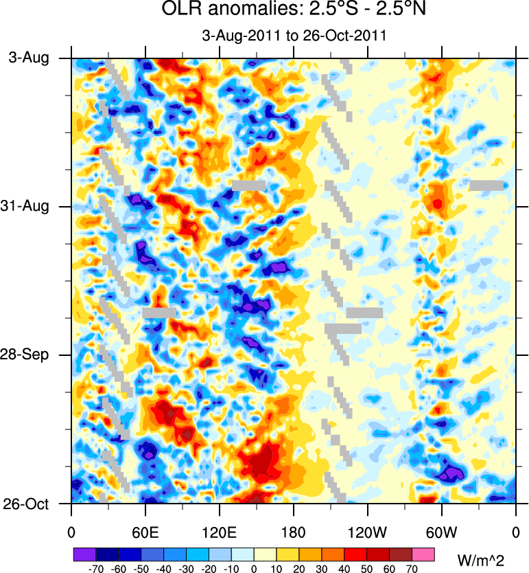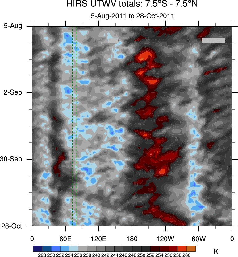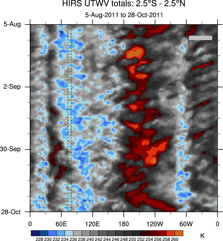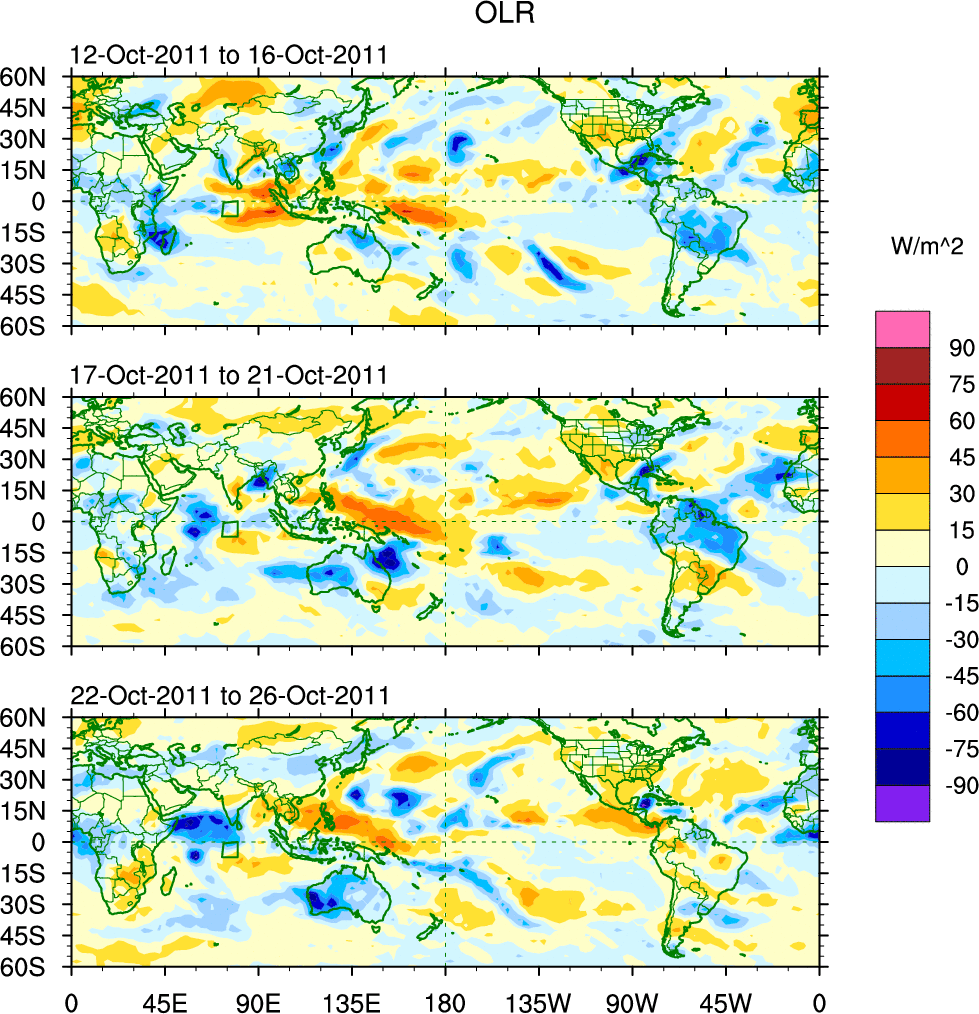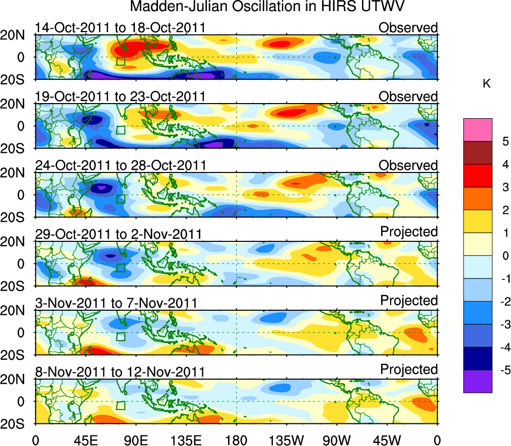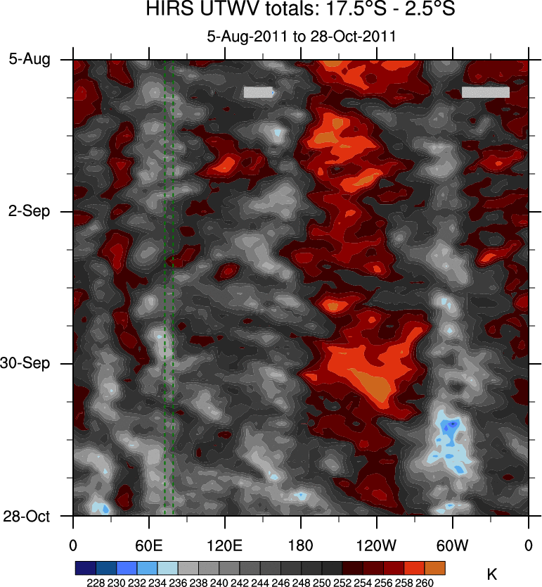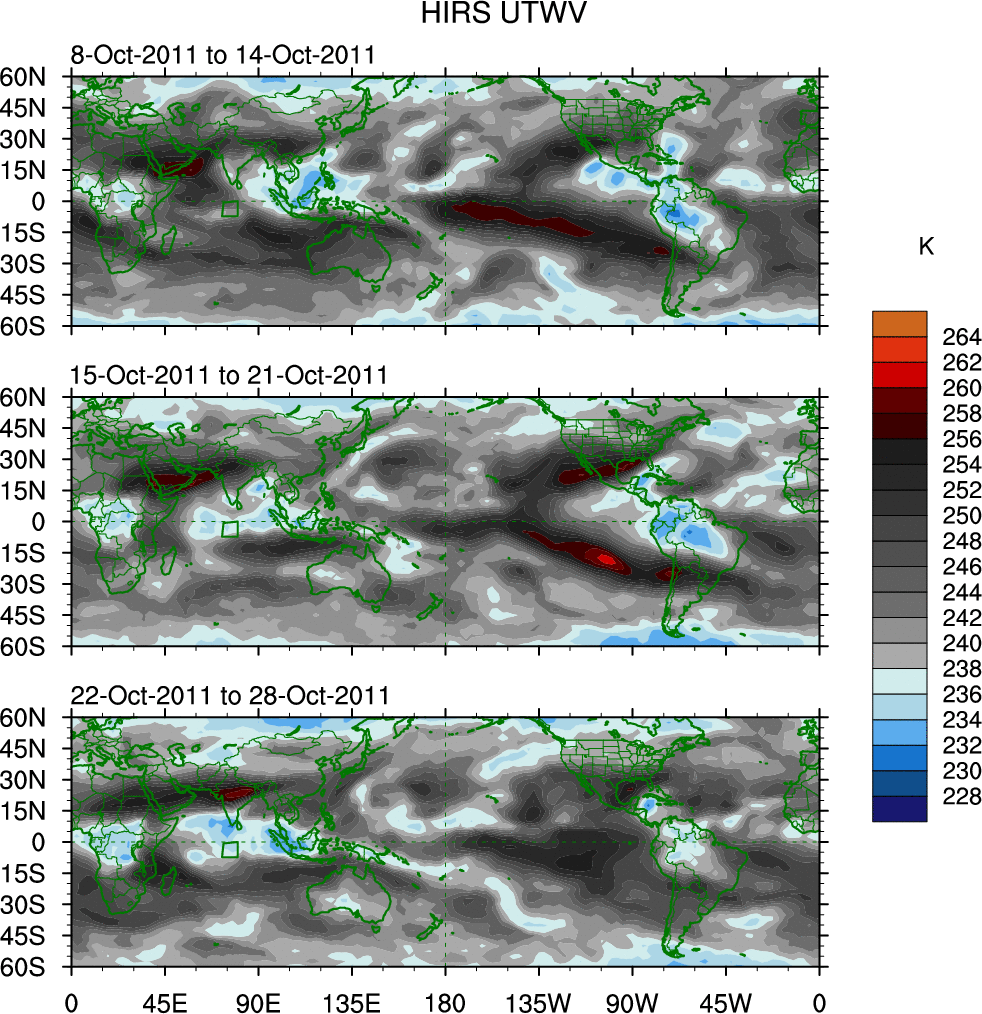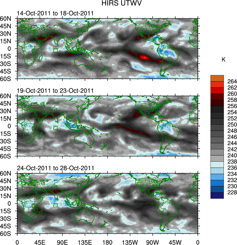To identify tropical waves in near real-time, the OLR and UTWV data are filtered following Wheeler & Weickmann (2001 MWR). The daily anomalies are calculated using the first 3 harmonics of the seasonal cycle for 1979–2009. Missing values are then filled using linear interpolation in space and time. The most recent 365 days of anomalies are padded with 659 days of zeroes, and the result is filtered for each wave type.